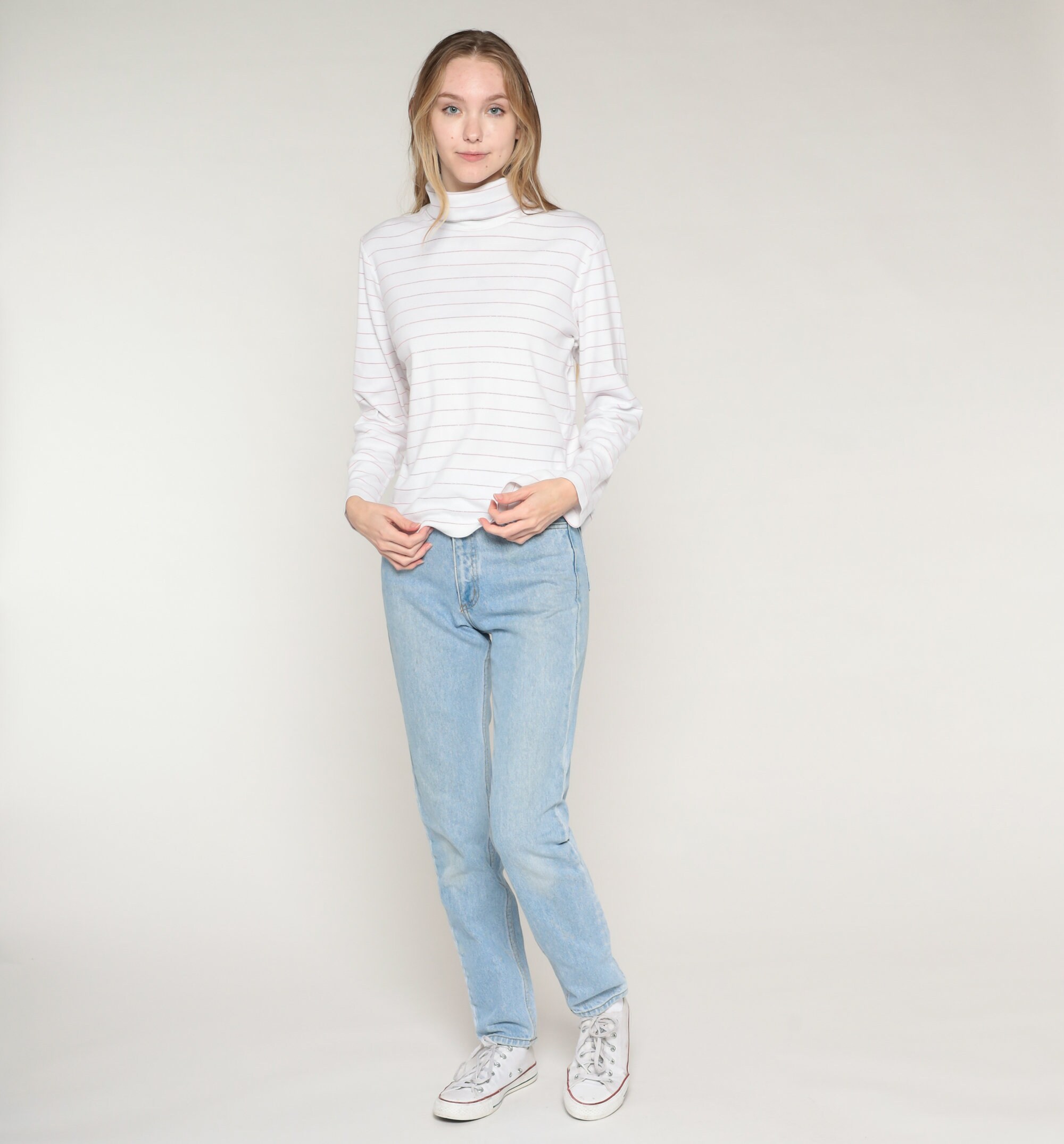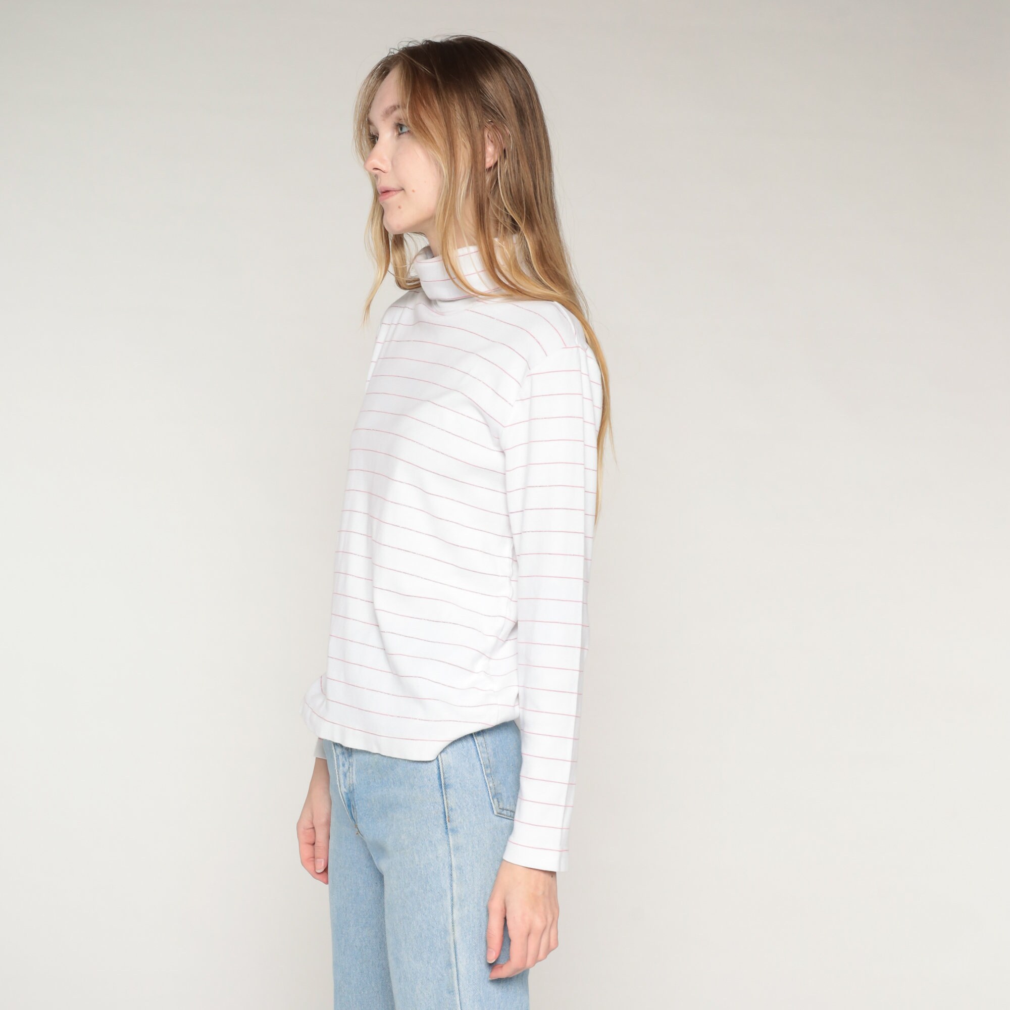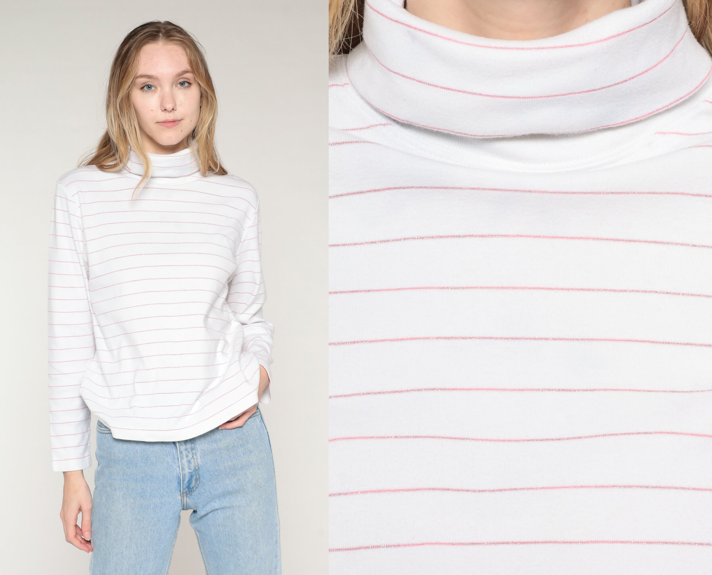 Vintage 90s shirt in white with sparkly pink stripes. It has a turtleneck and long sleeves.