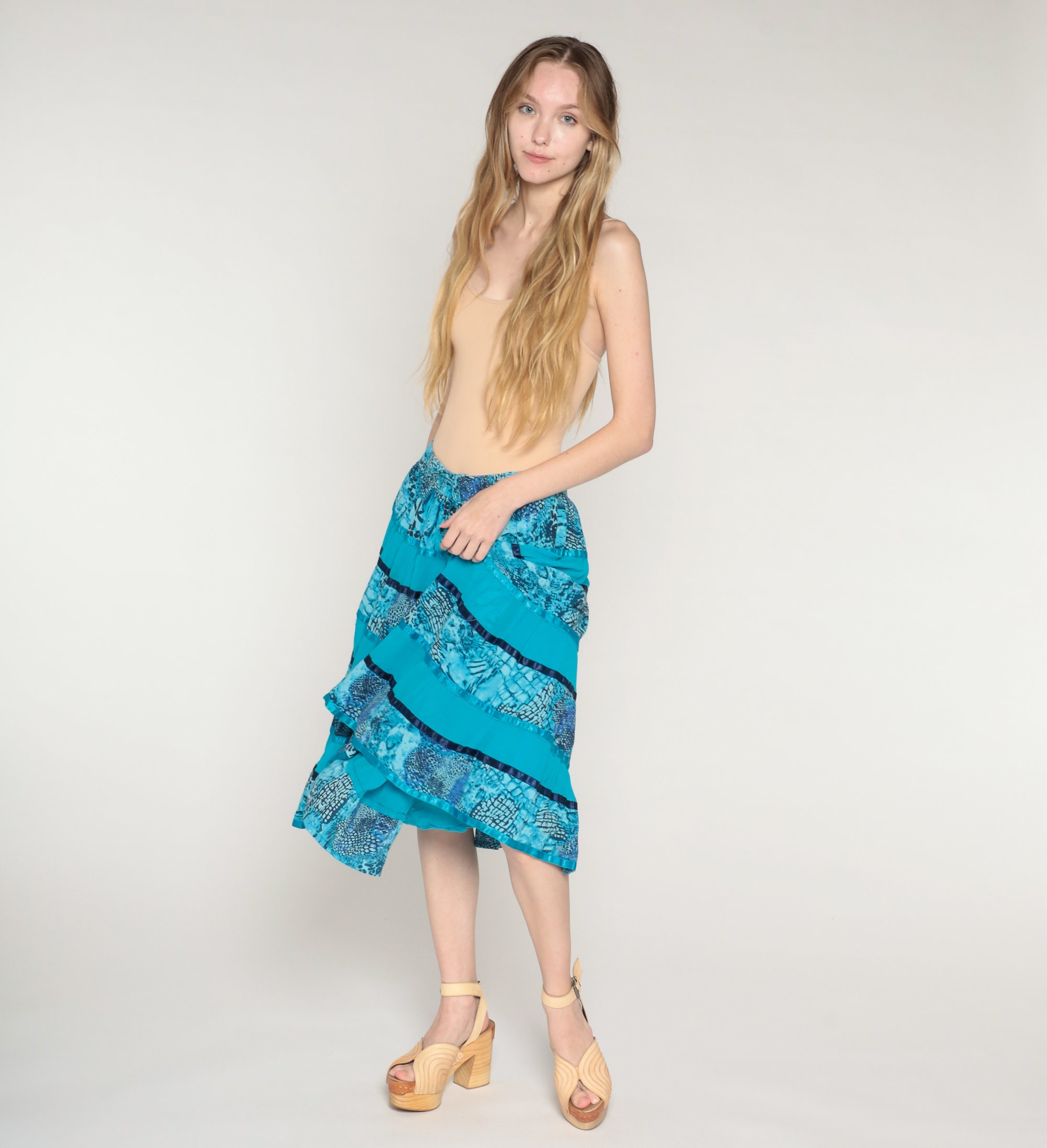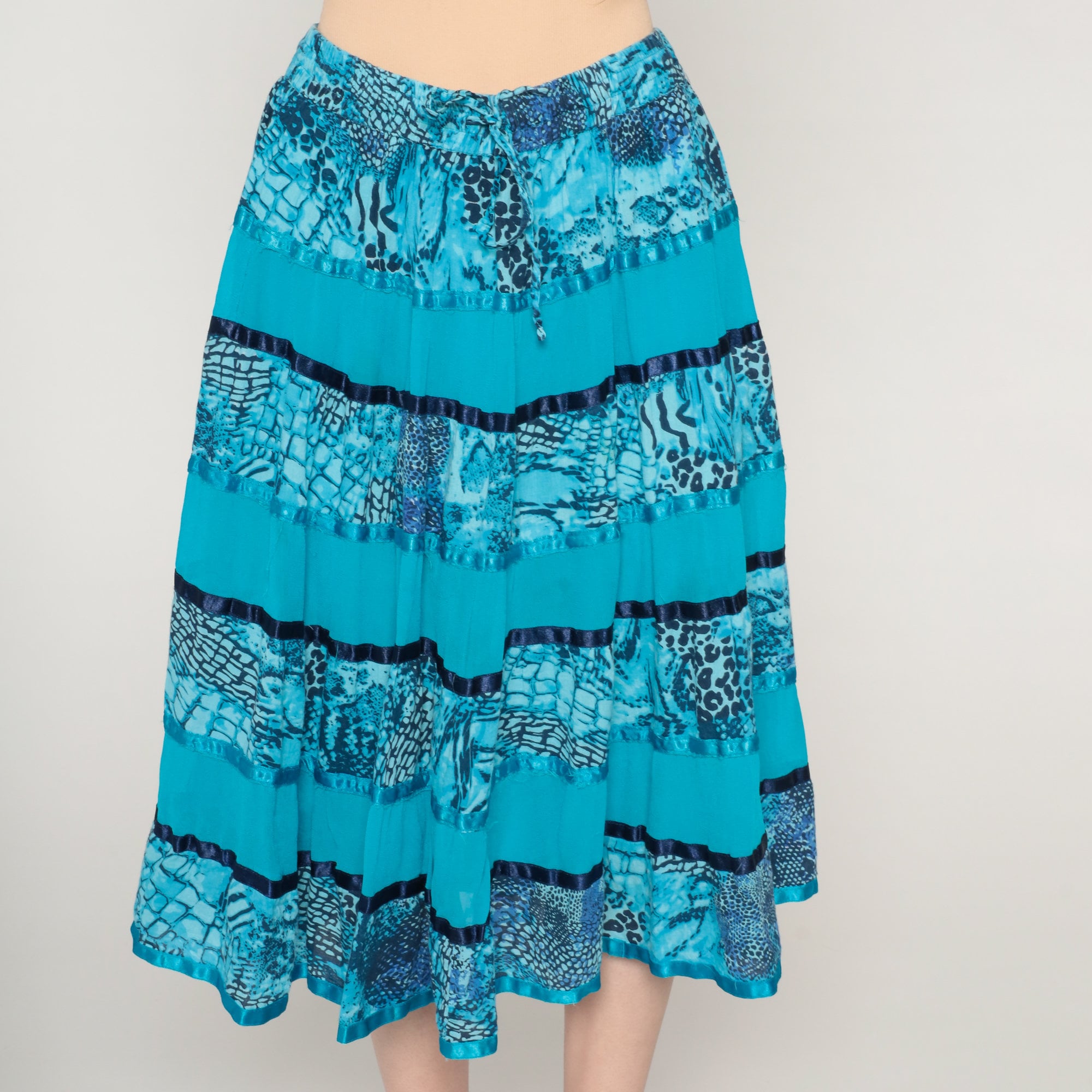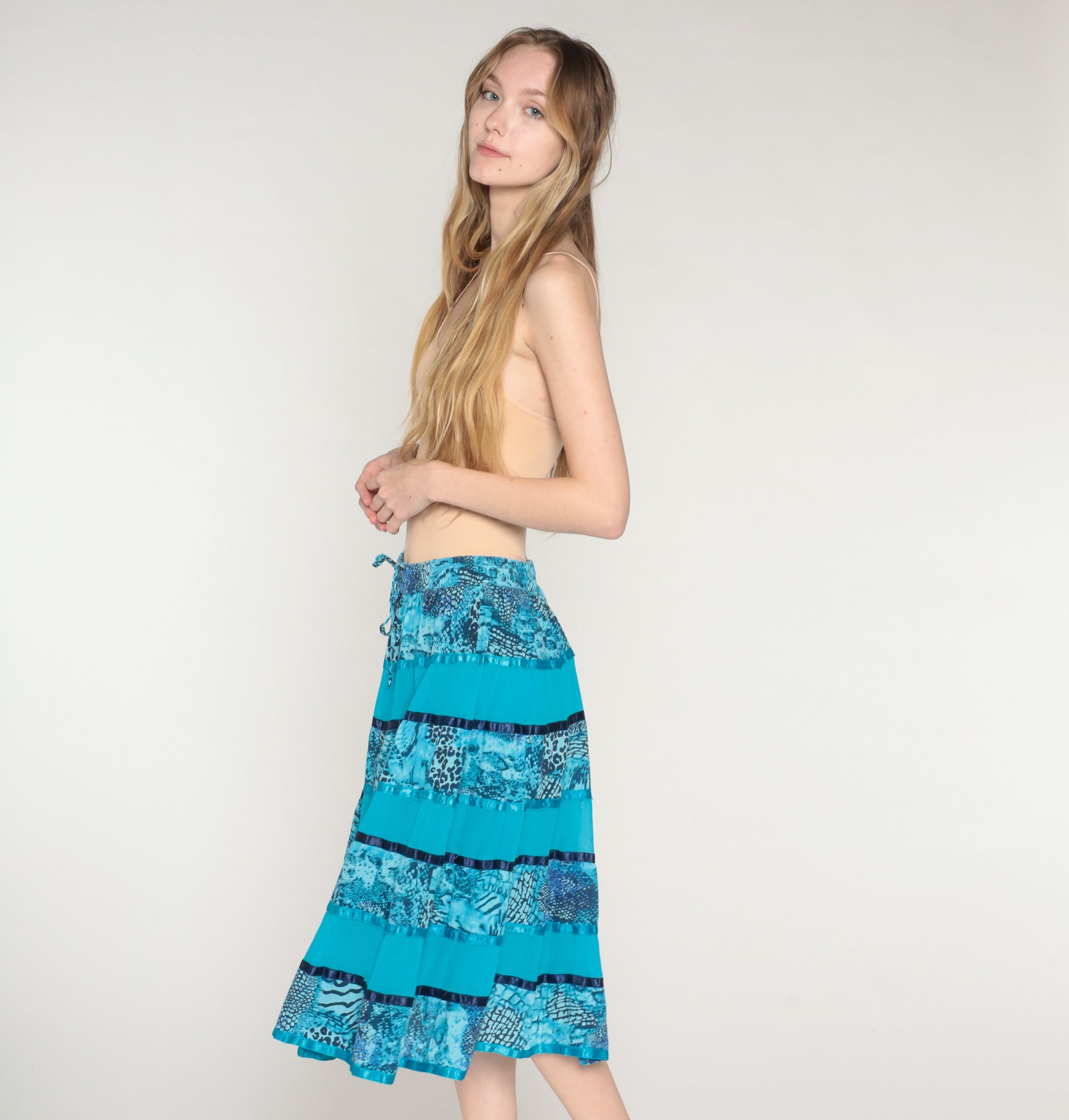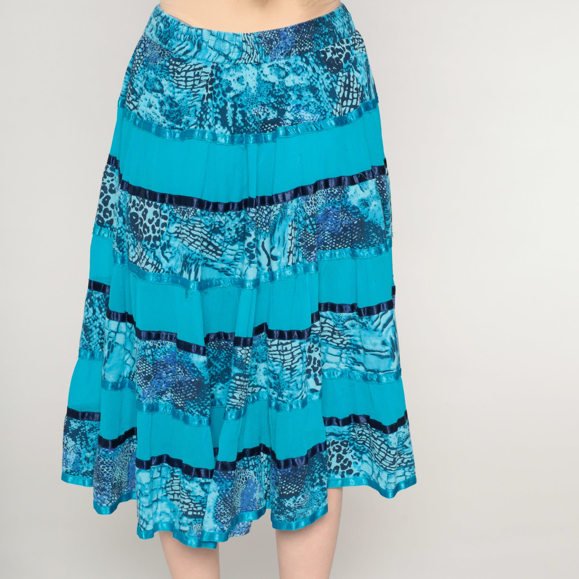 Vintage 00s skirt in blue with alternating tiers of solid blue and blue animal print with ribbon trim in between. Midi length with a high drawstring waist.