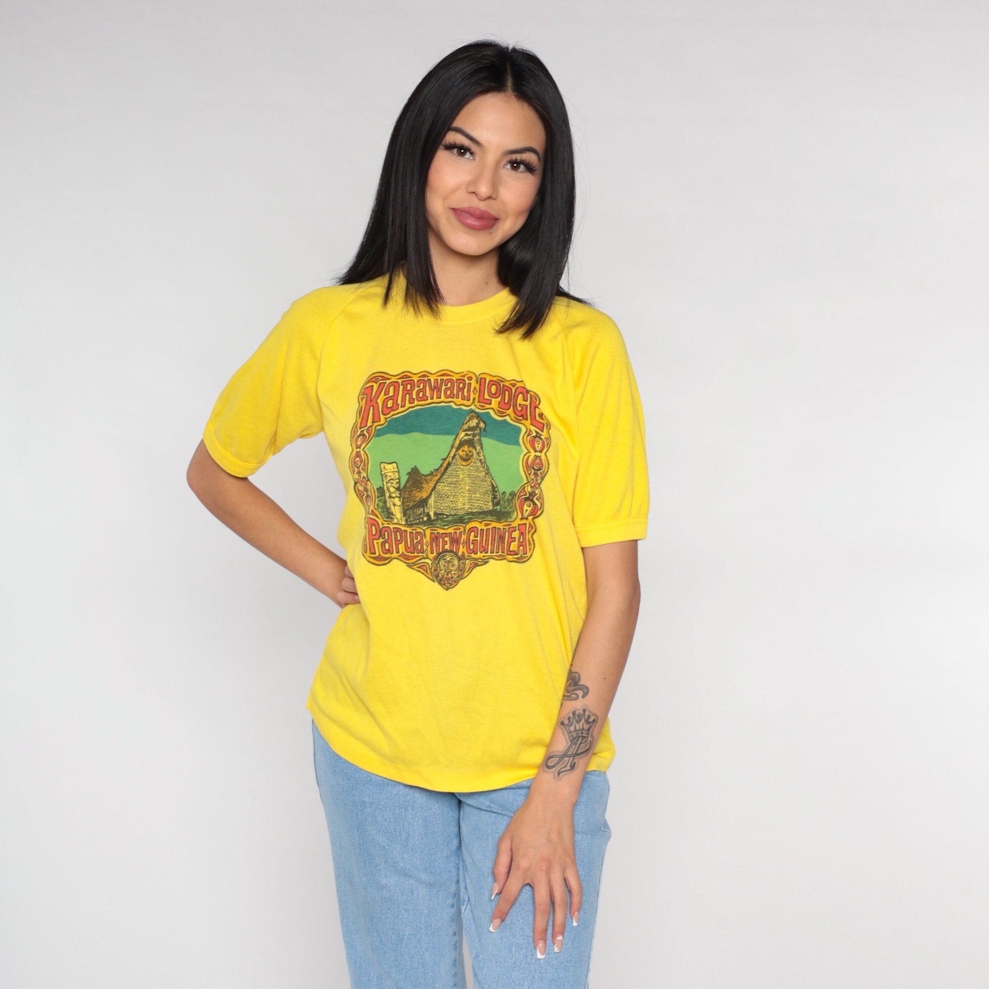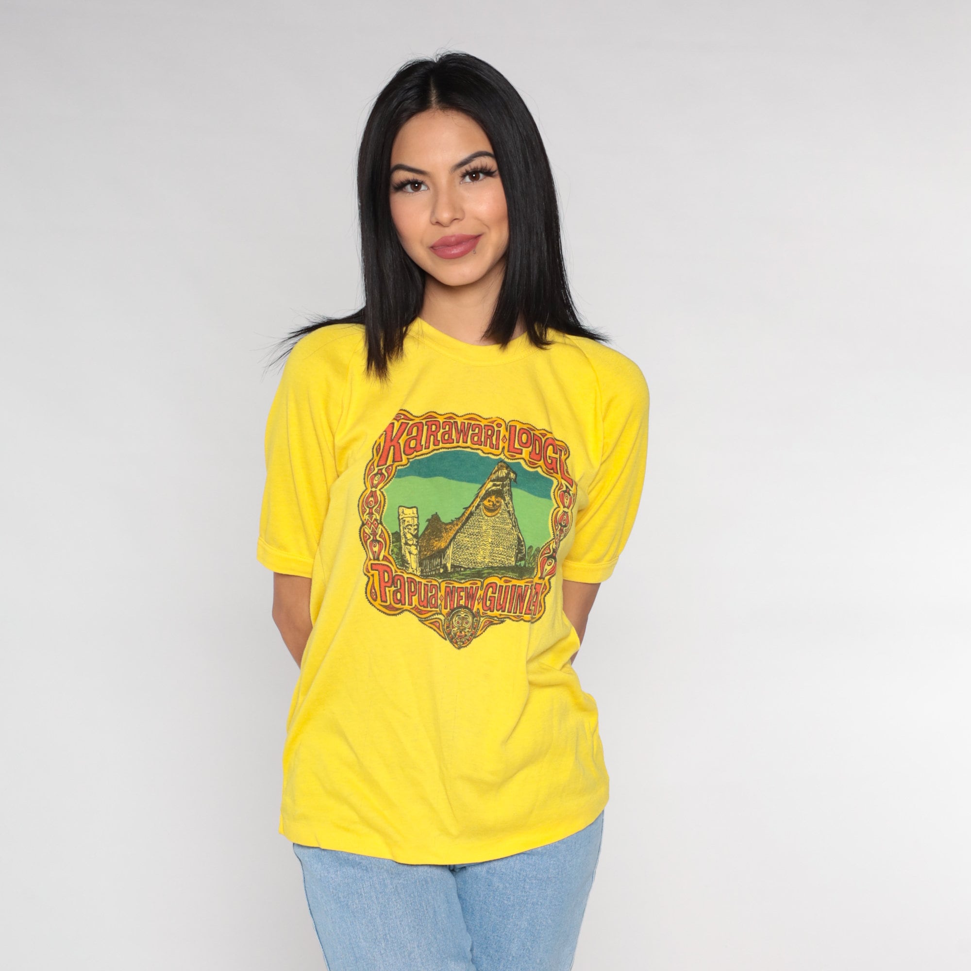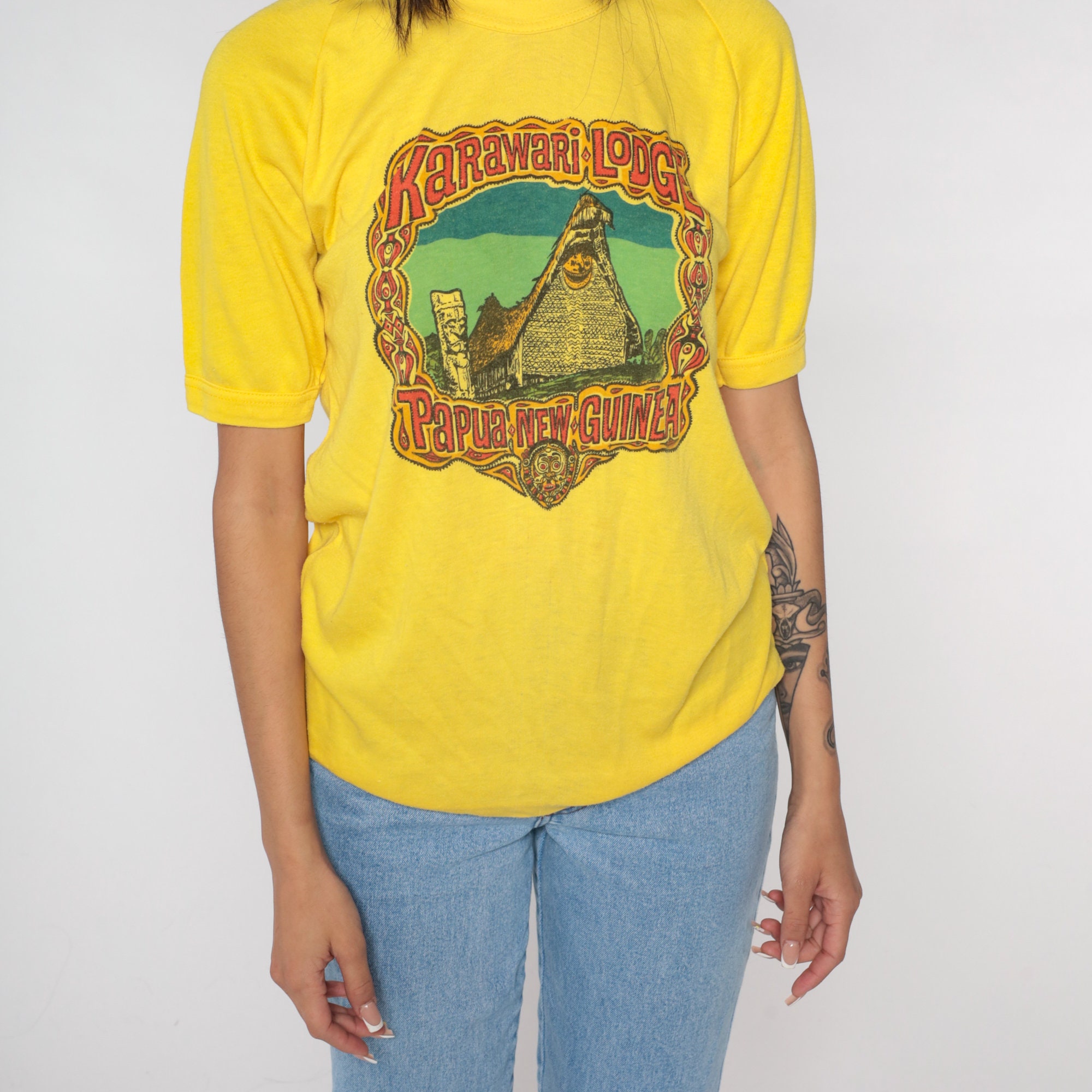 Vintage y2k t shirt in yellow from the Karawari Lodge in Papua New Guinea.