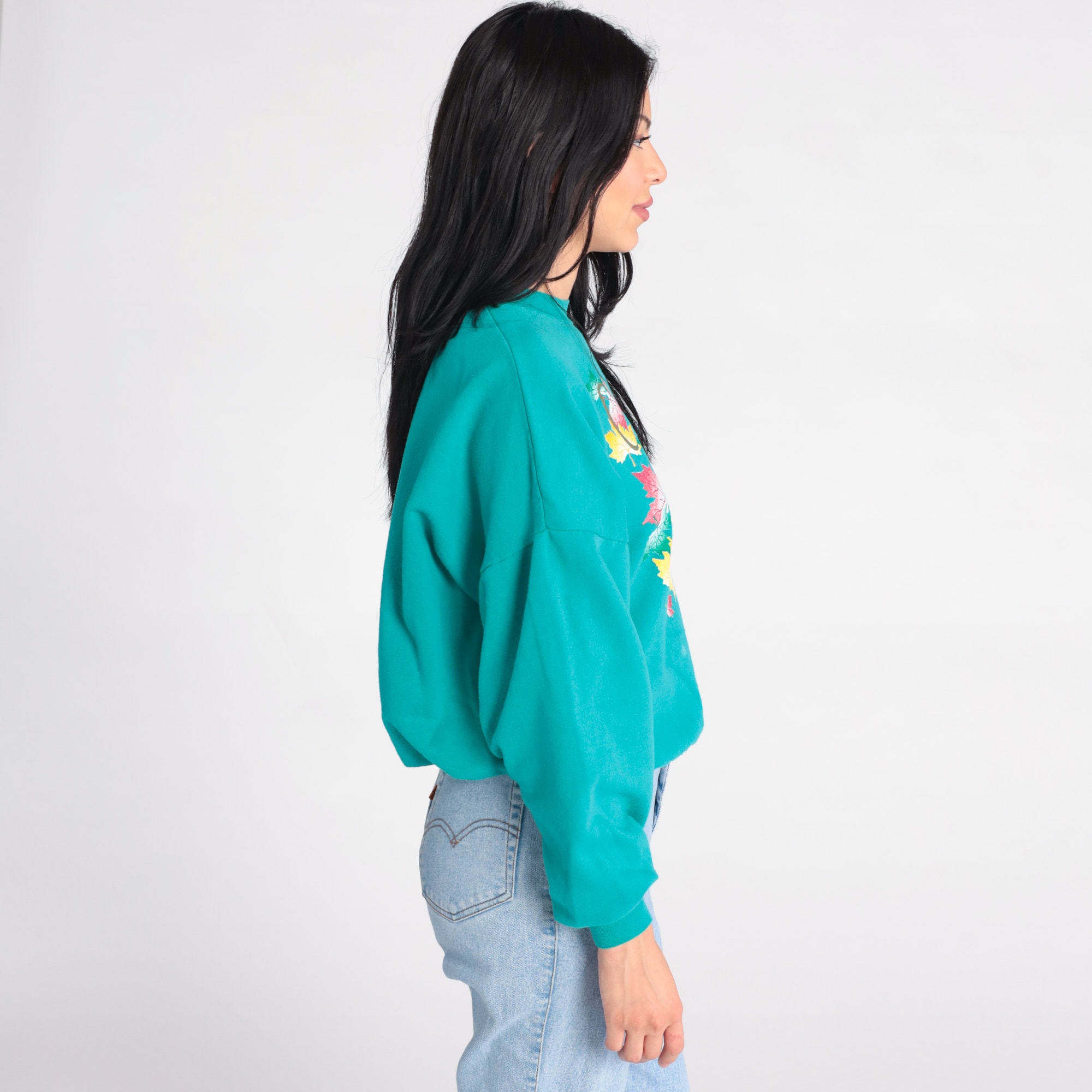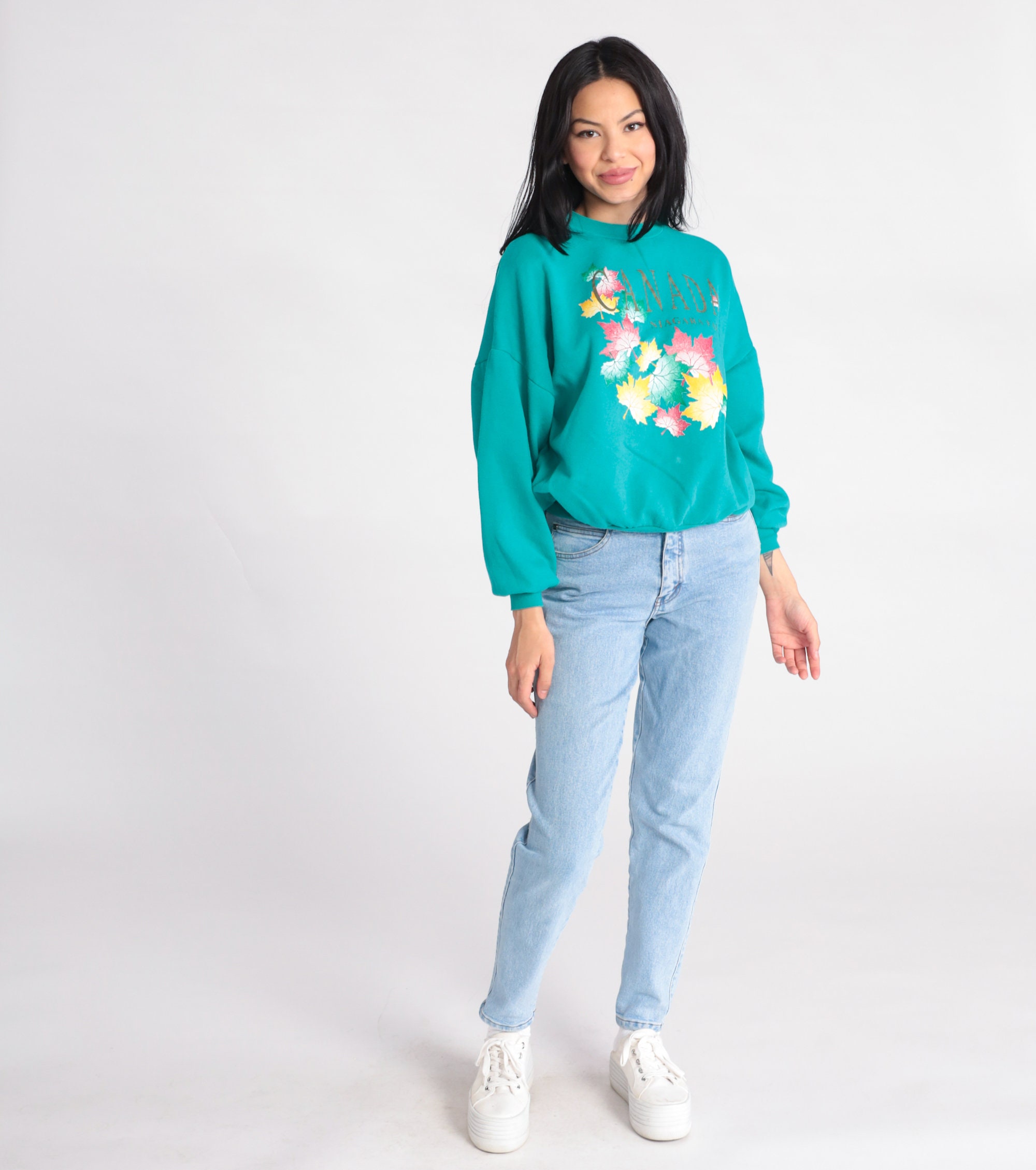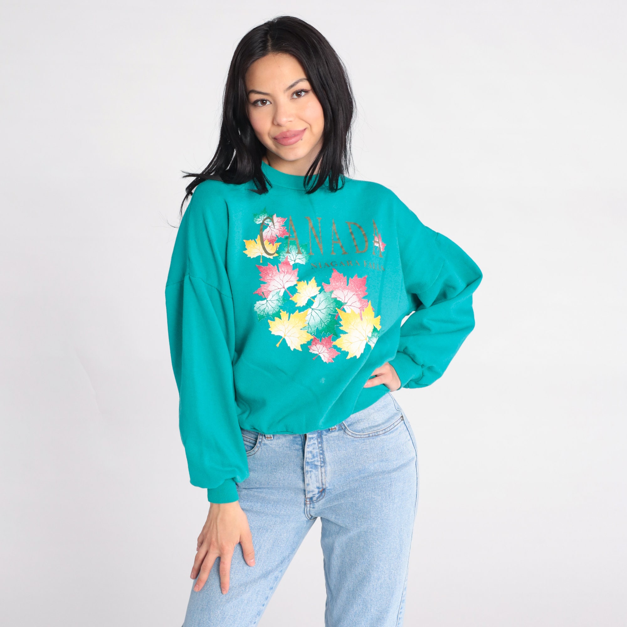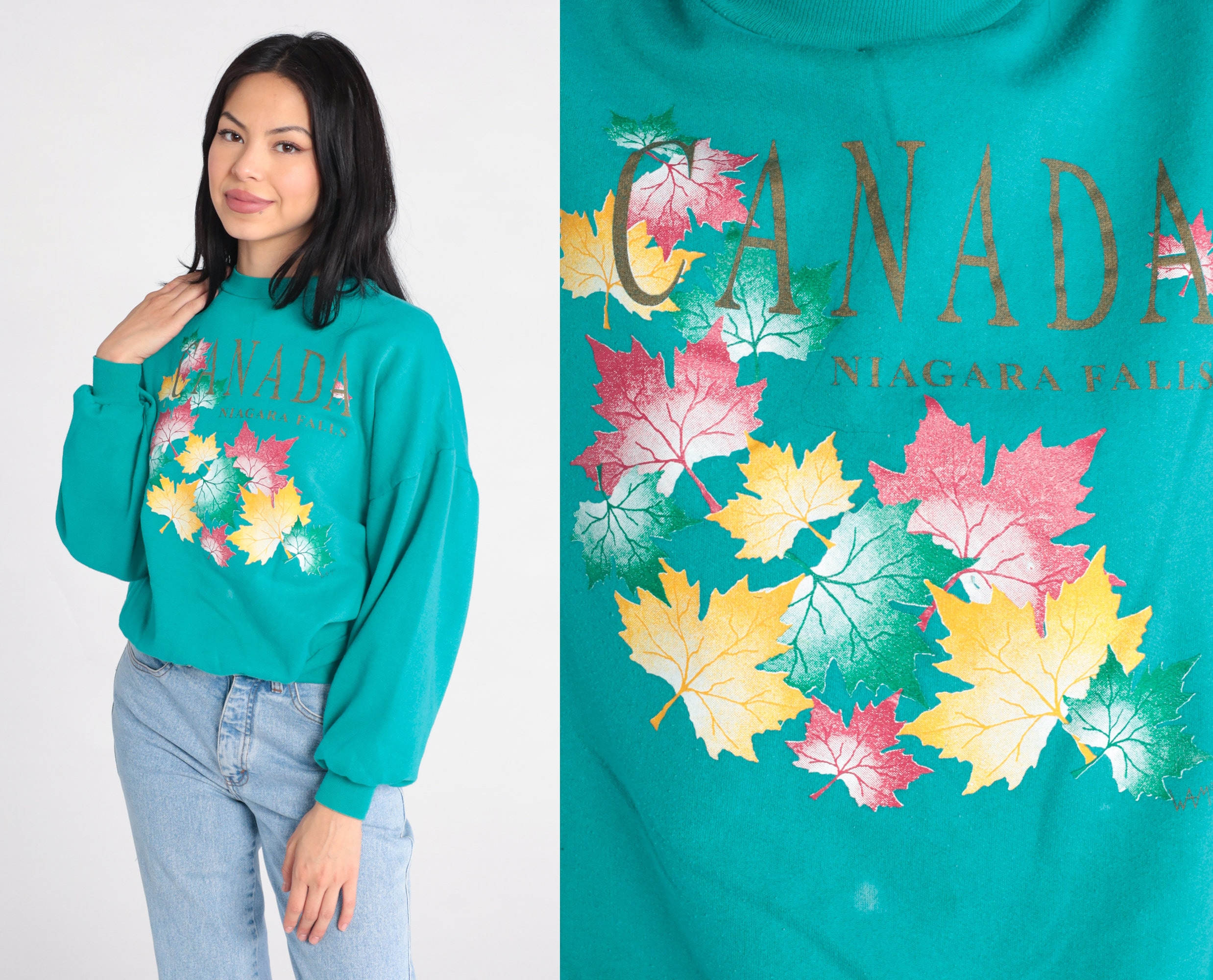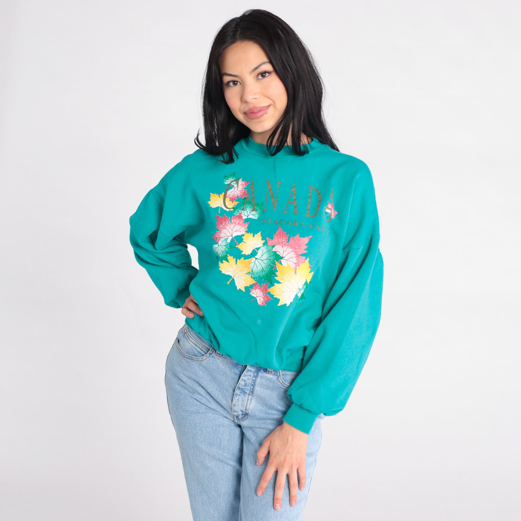Vintage 90s sweatshirt in green with Niagara Falls Canada and maple leafs on the front.