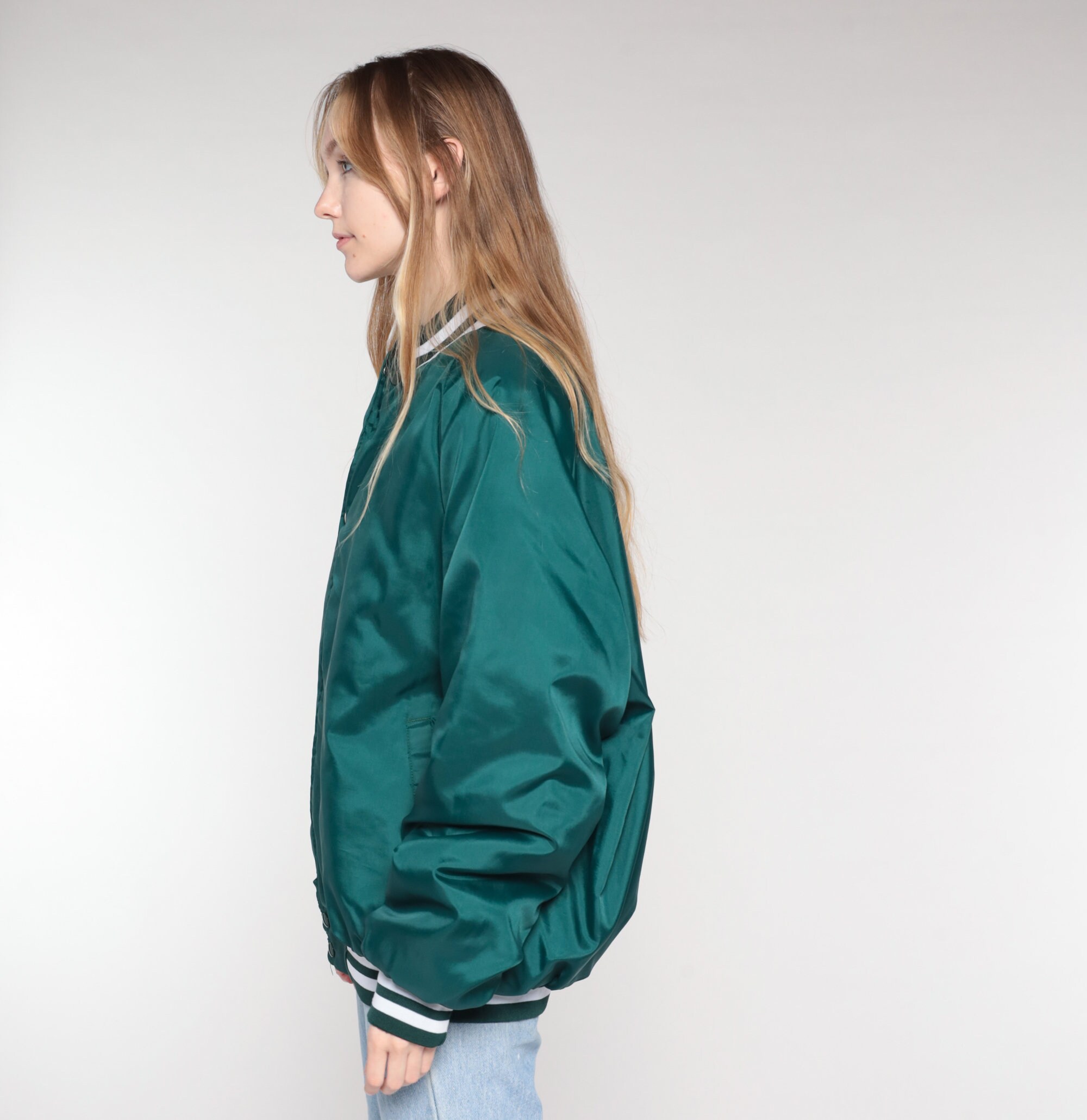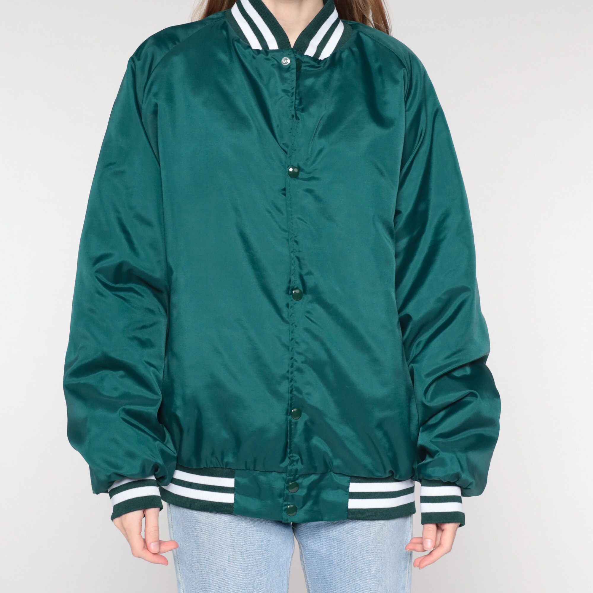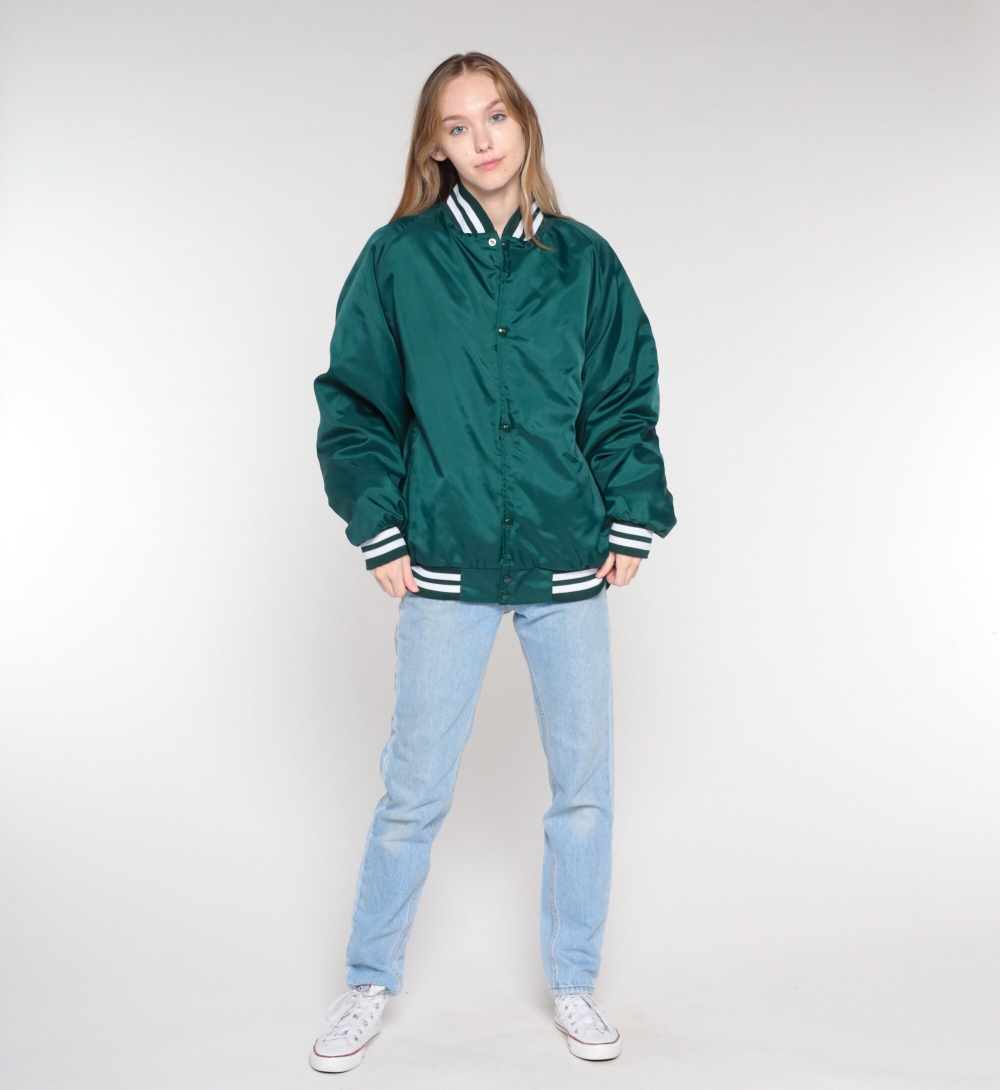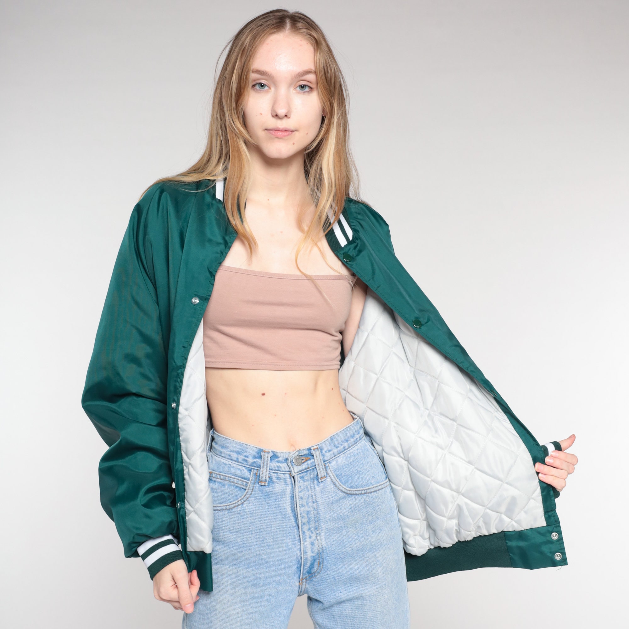 Vintage 80s baseball jacket in green with grey quilted lining. Snaps up the front and a Pinelle's Bowlero Lanes 700 club graphic on the back.