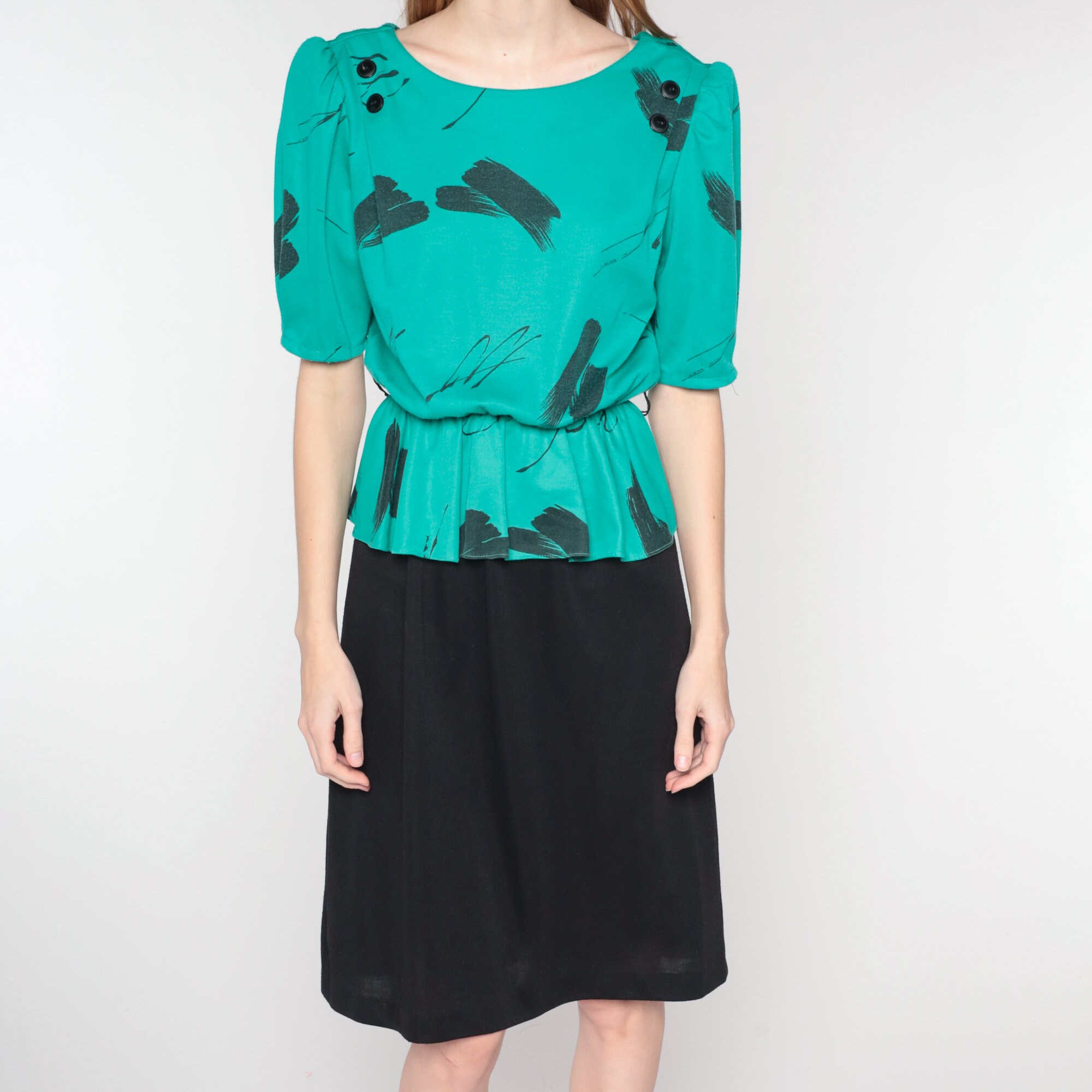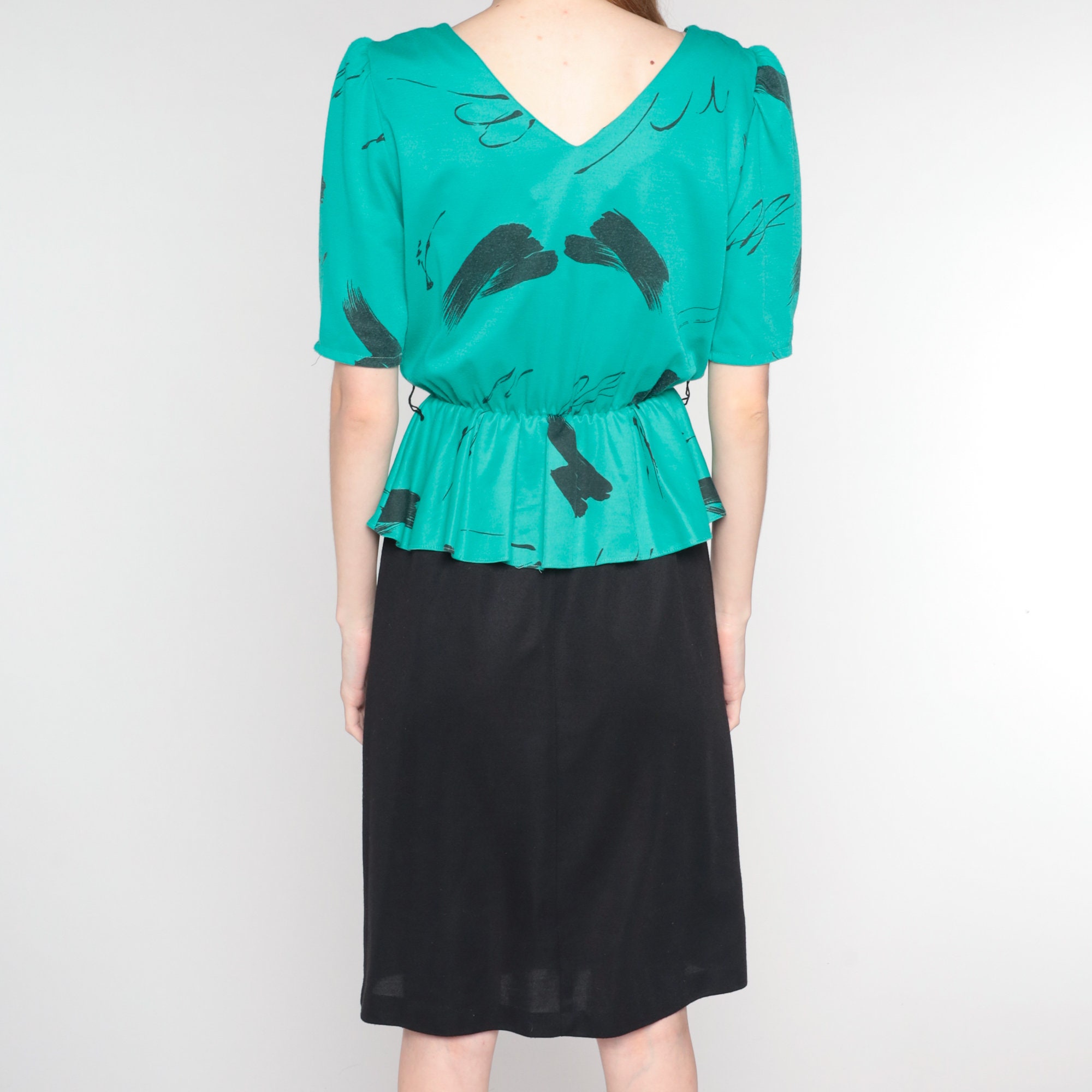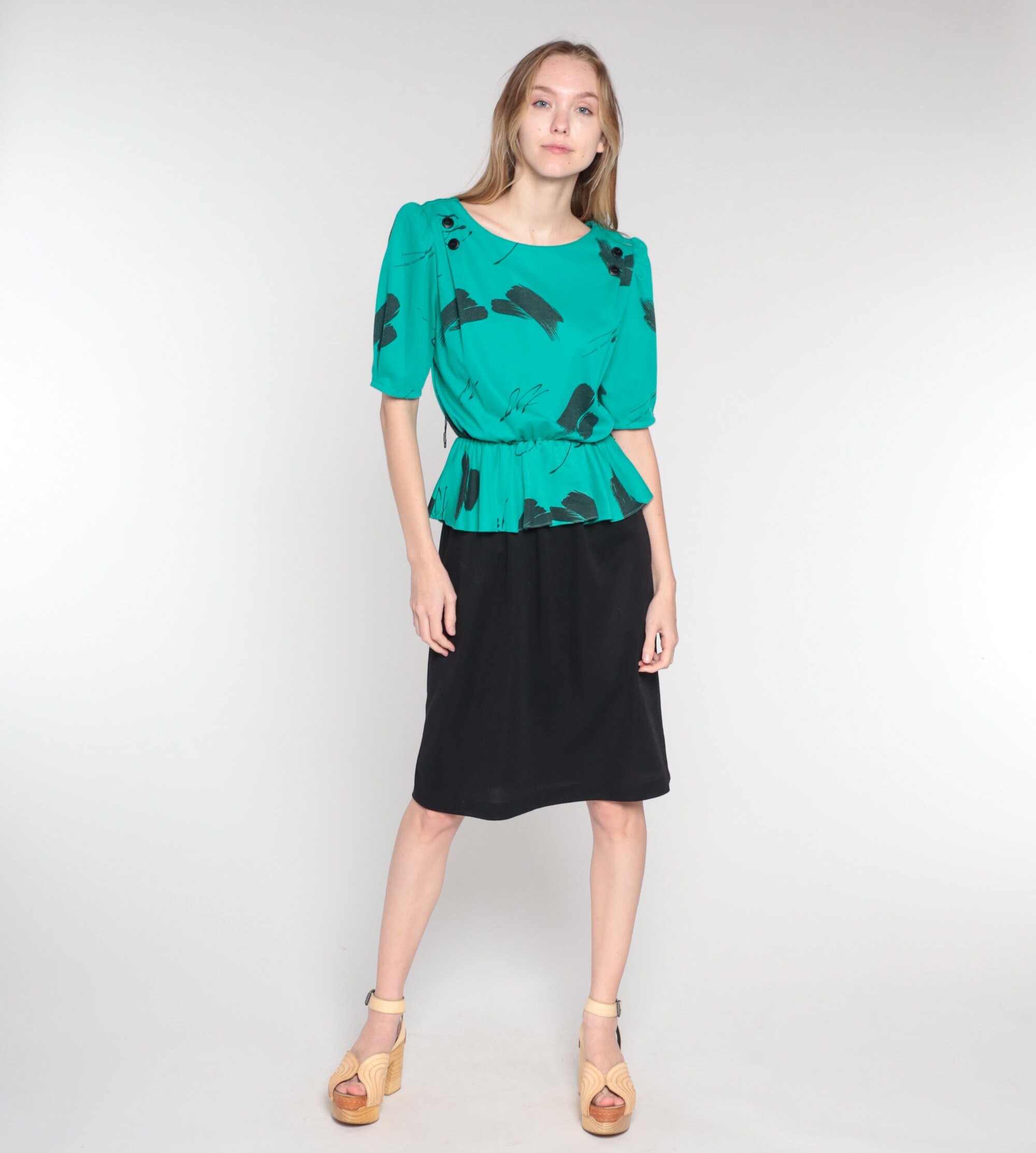 Vintage 80s dress with a green brushstroke print bodice and a black skirt. It has short puff sleeves and a high waist with a peplum. Midi length