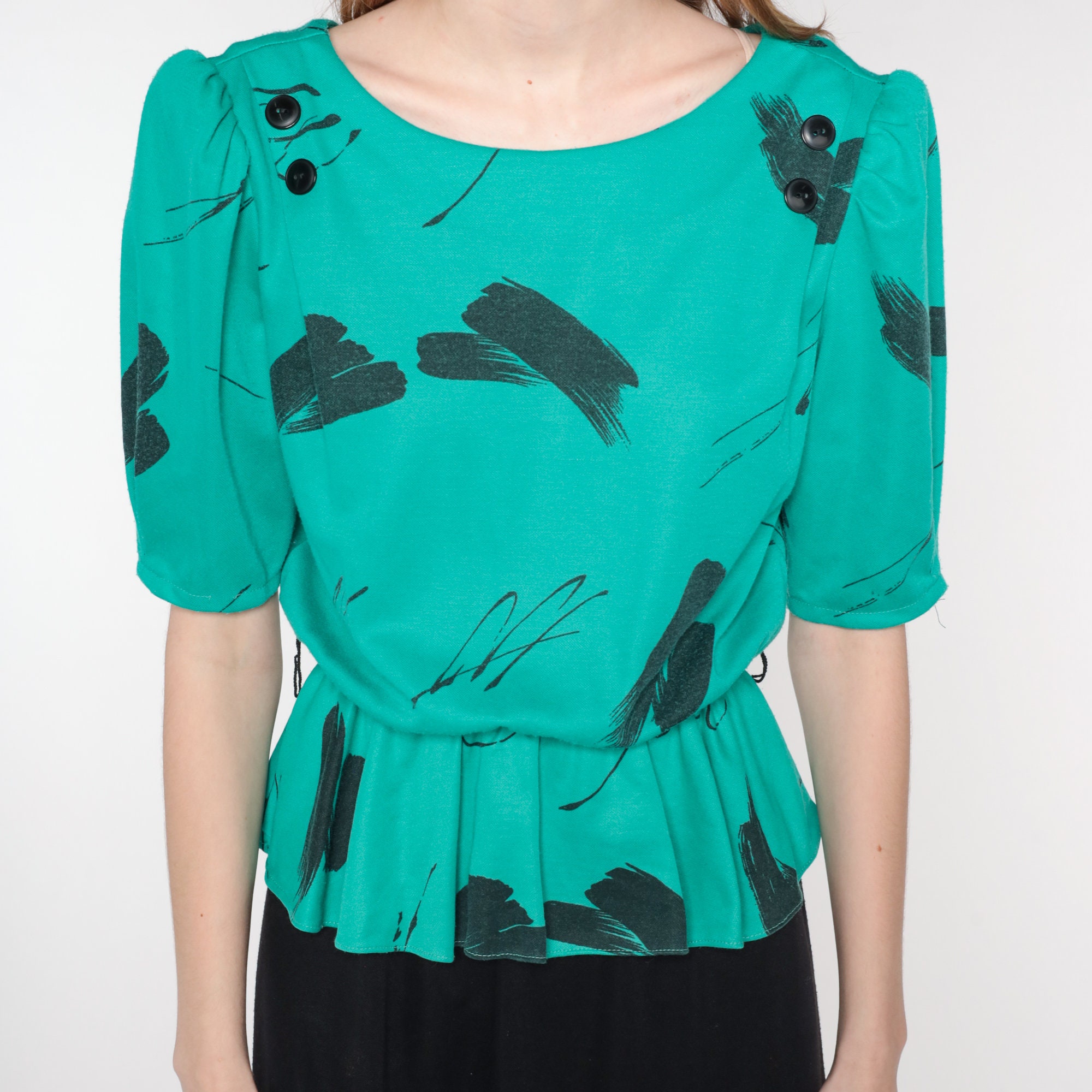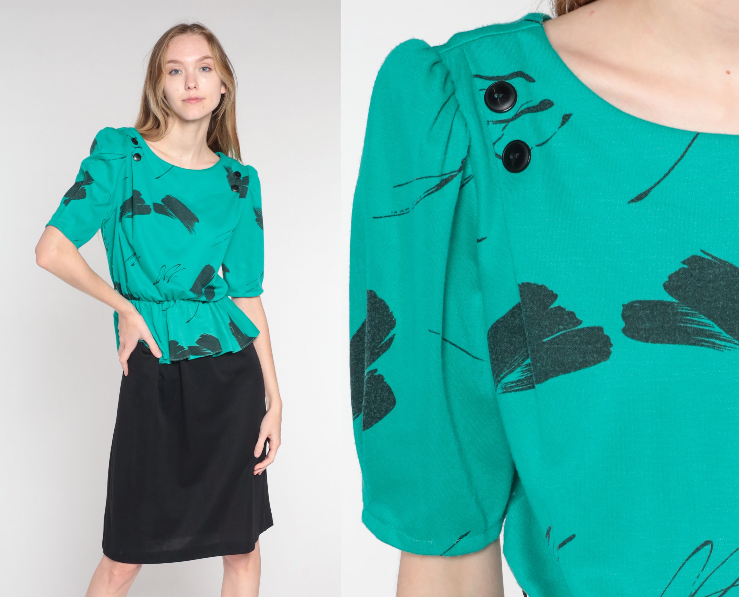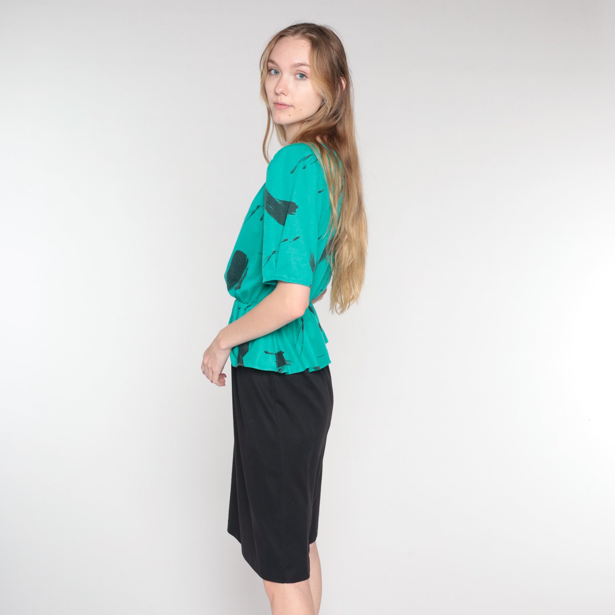 Vintage 80s dress with a green brushstroke print bodice and a black skirt. It has short puff sleeves and a high waist with a peplum. Midi length