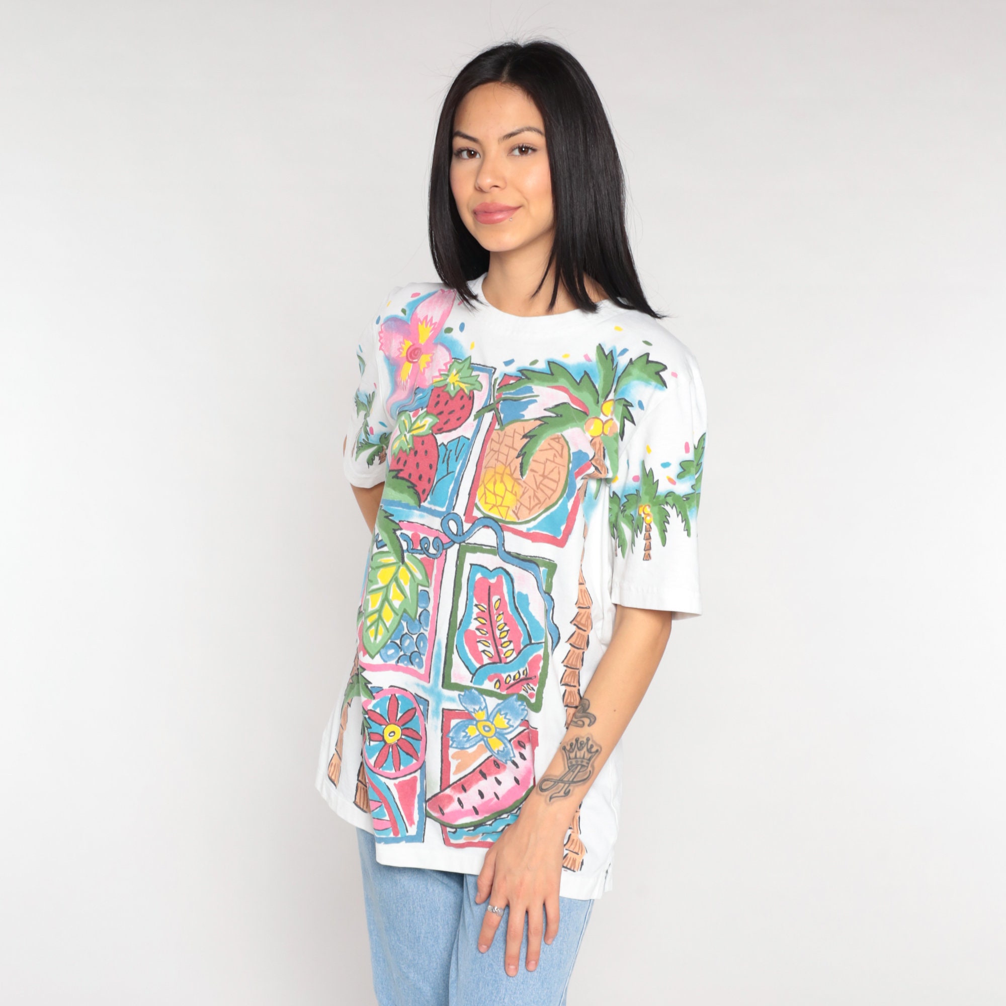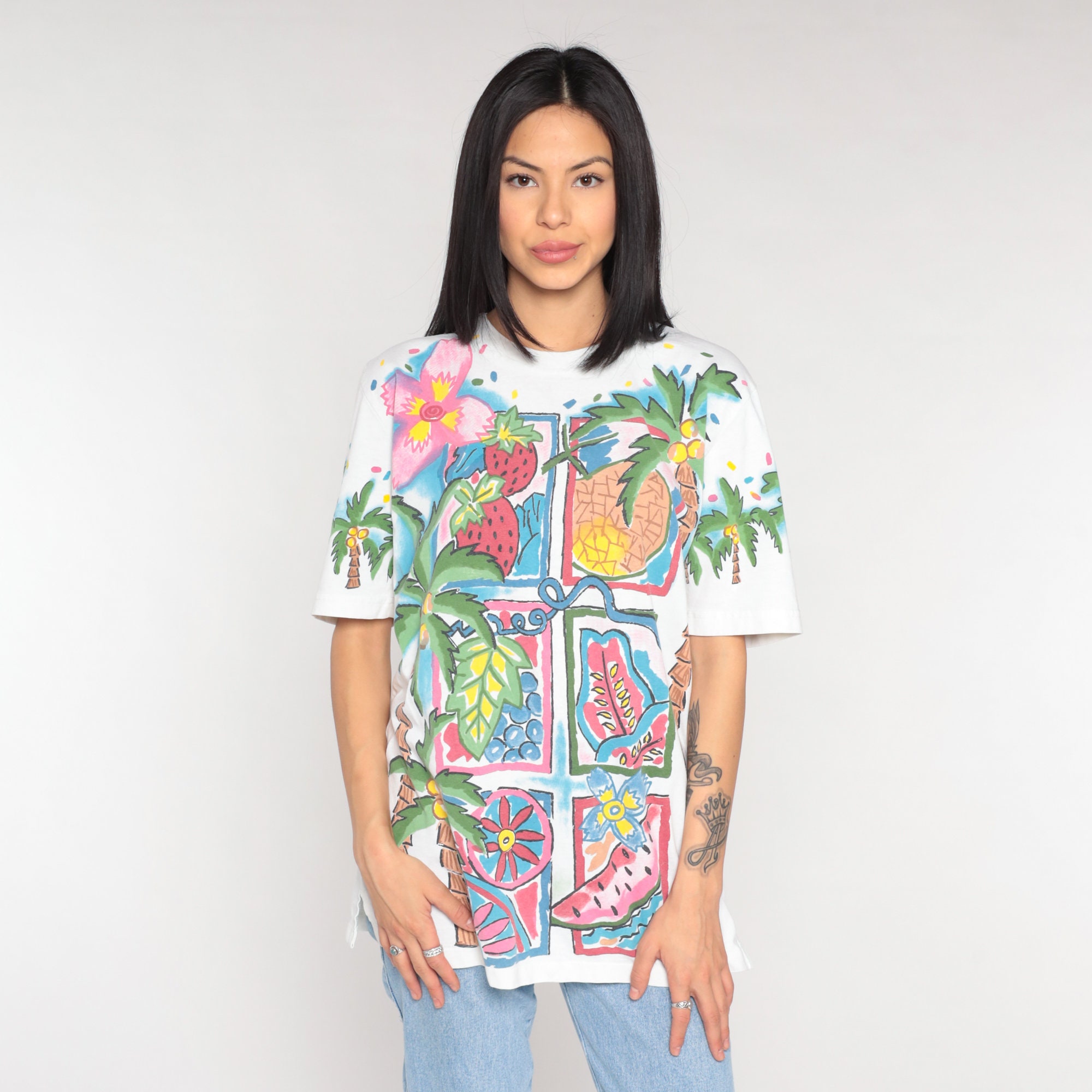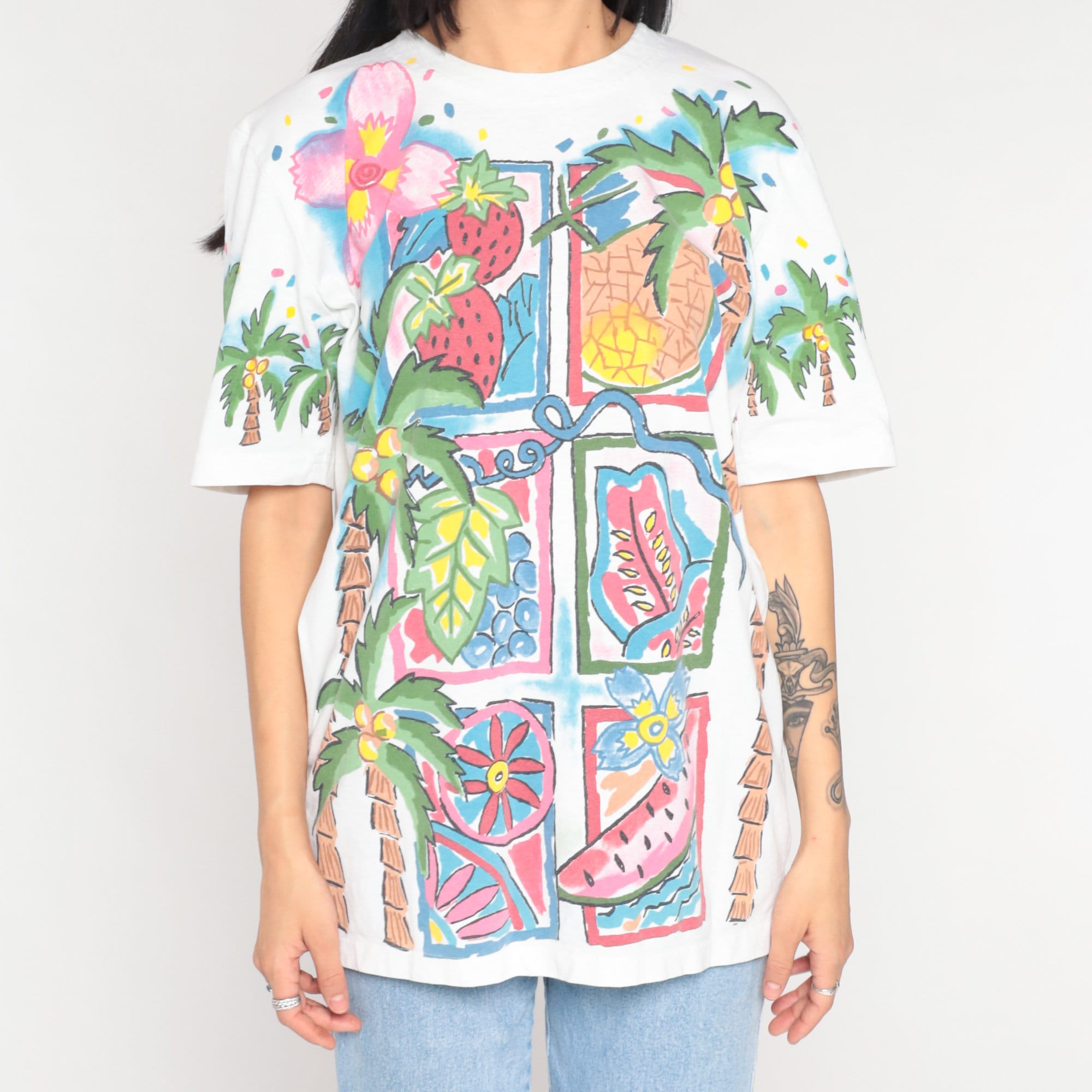 Vintage 90s t shirt with a Tropical fruit and palm tree print on the front and back.