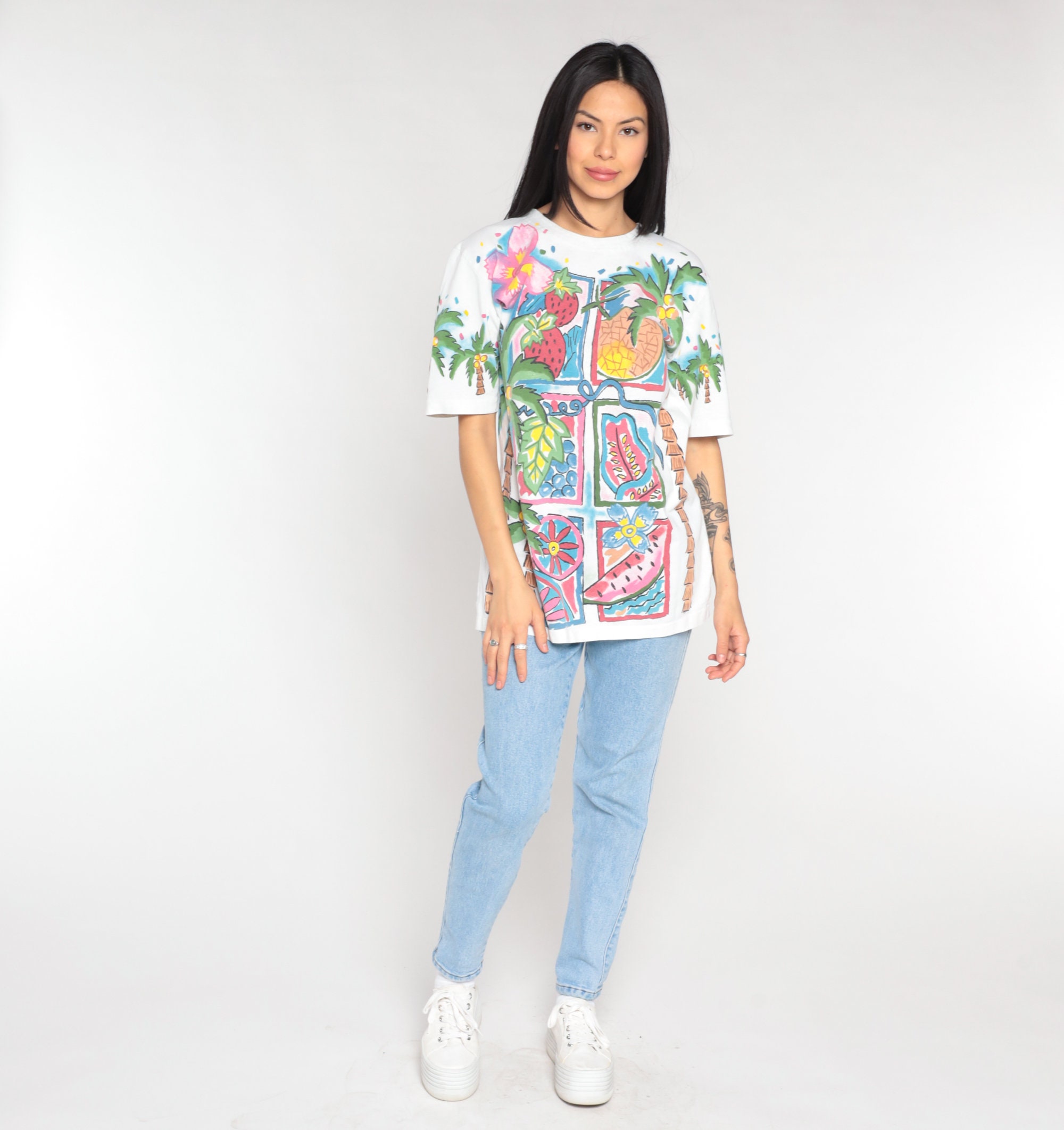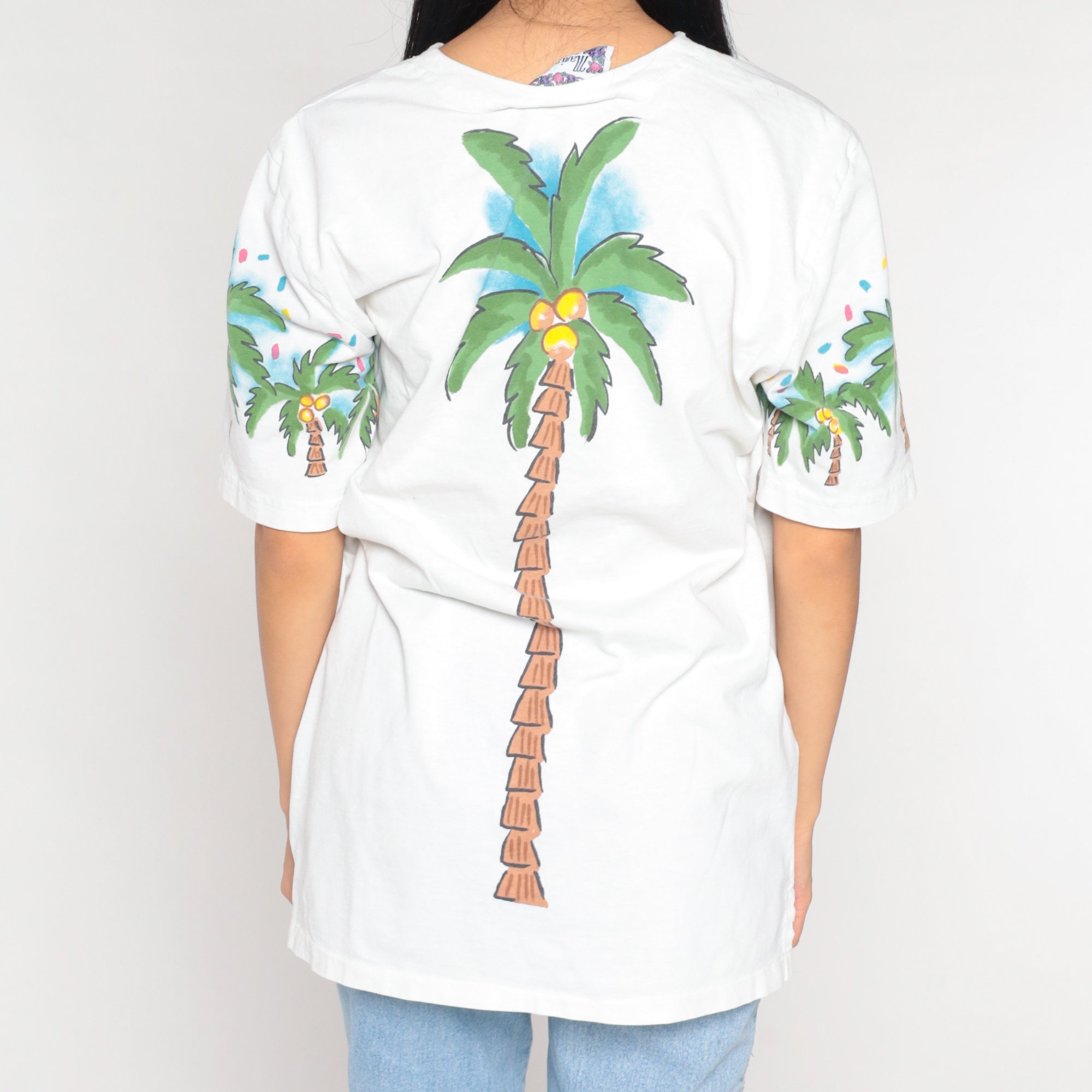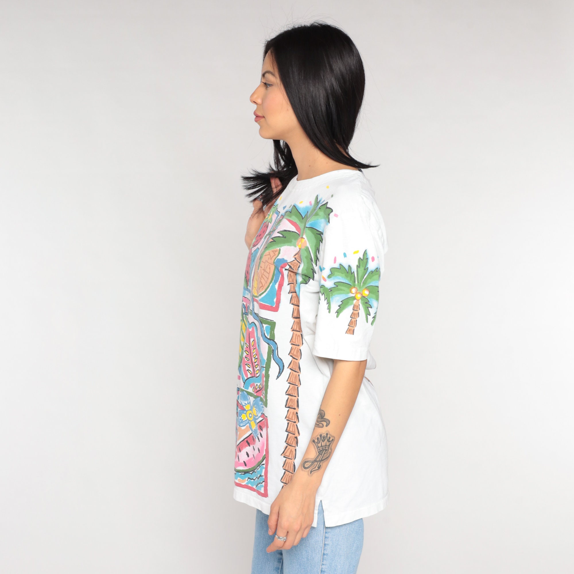 Vintage 90s t shirt with a Tropical fruit and palm tree print on the front and back.
