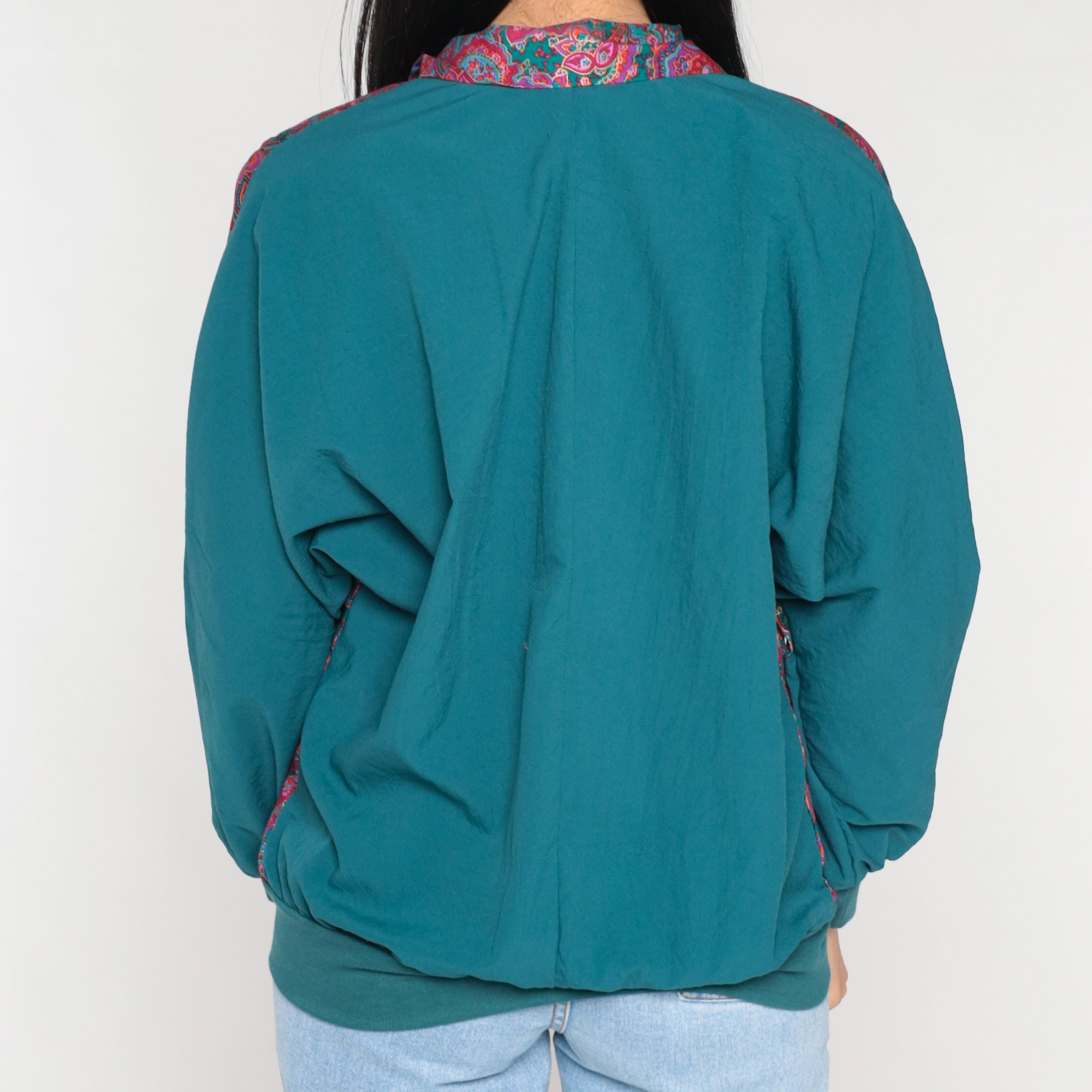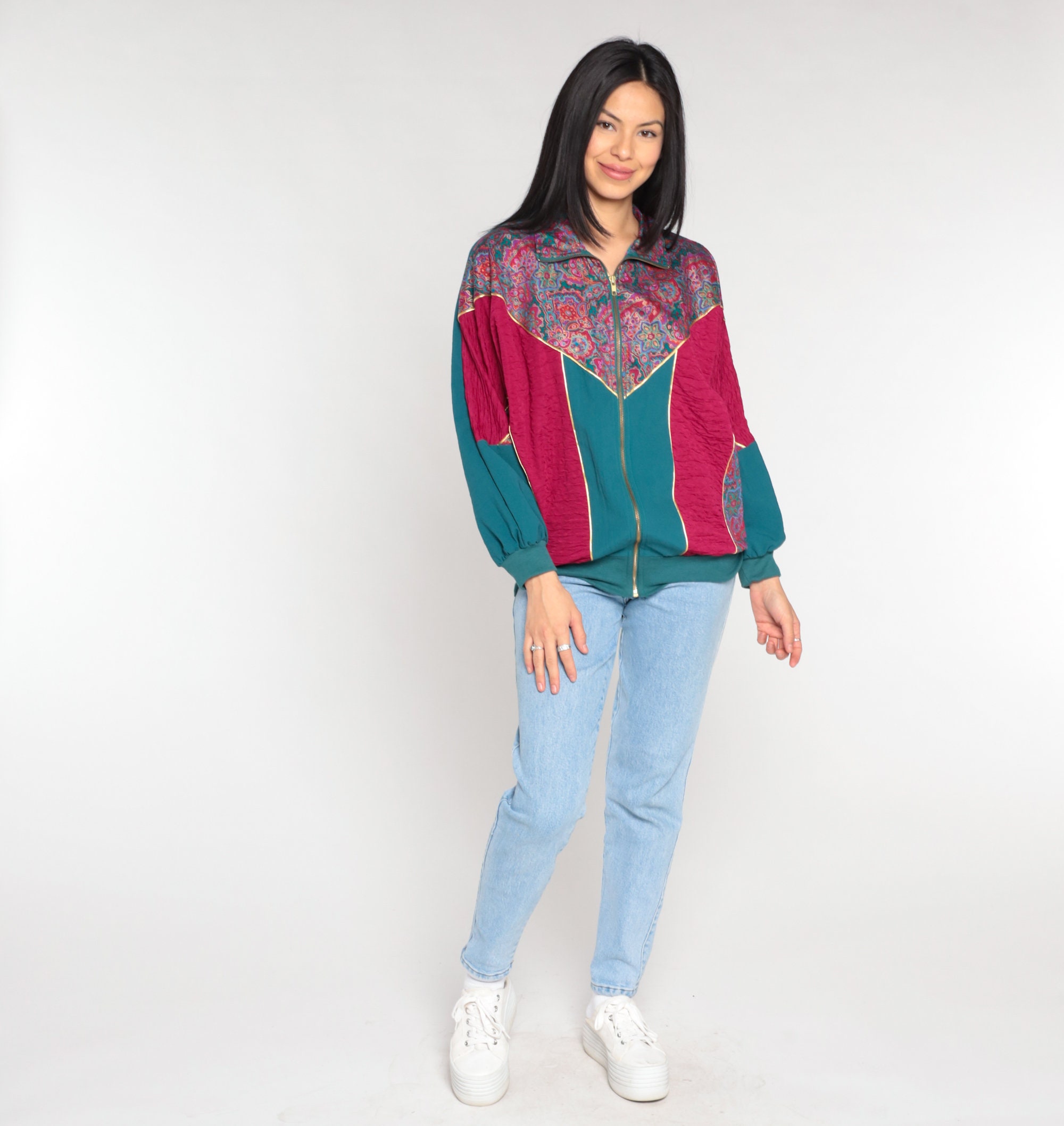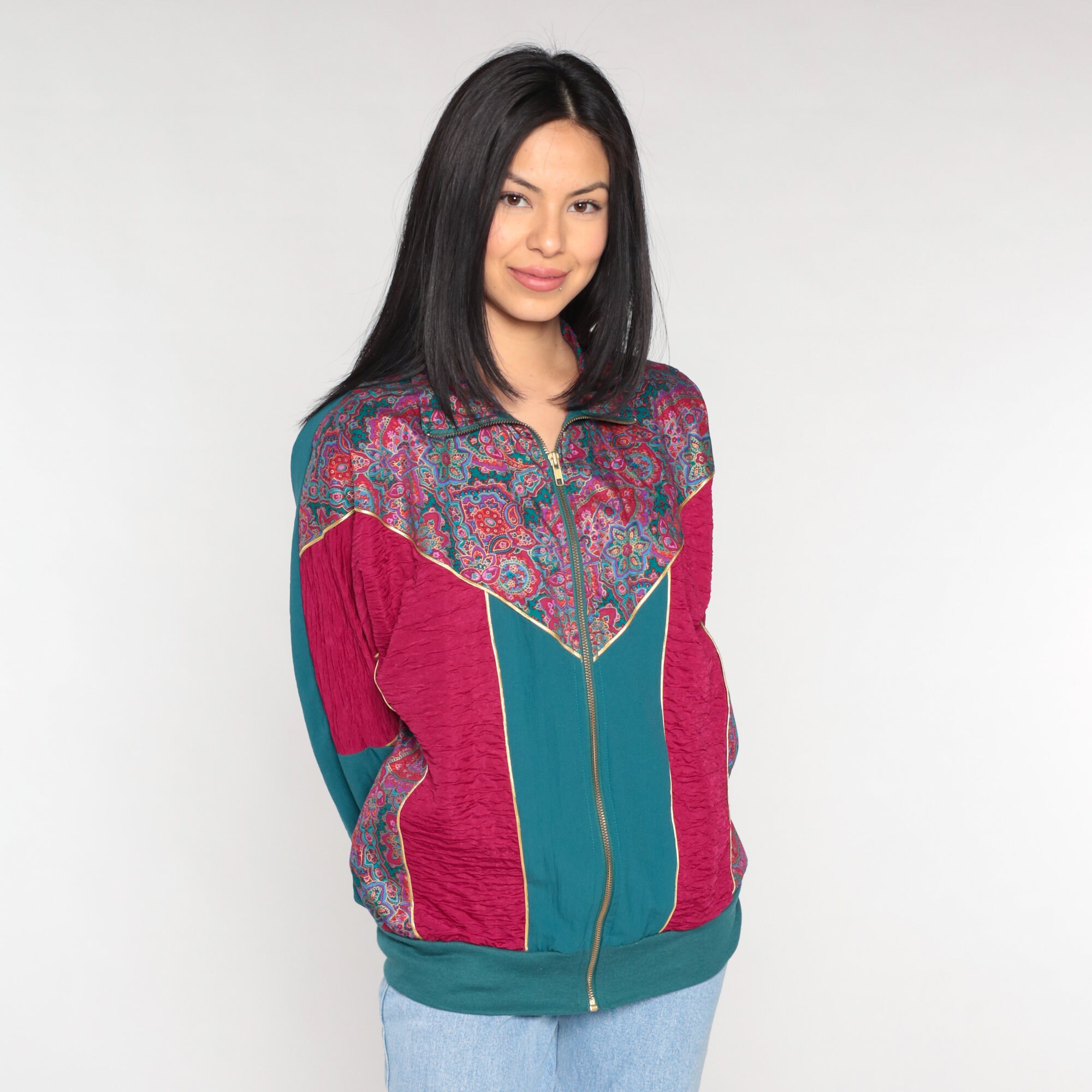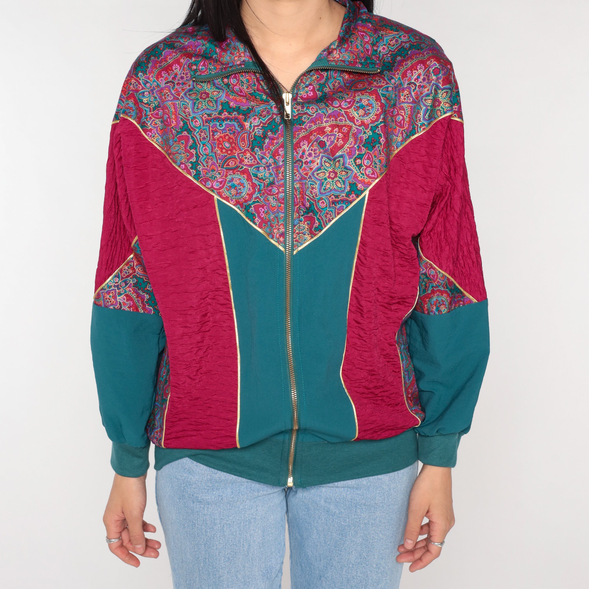 Vintage 90s windbreaker jacket in magenta and green color blocking with a floral print yoke. Zips up the front.