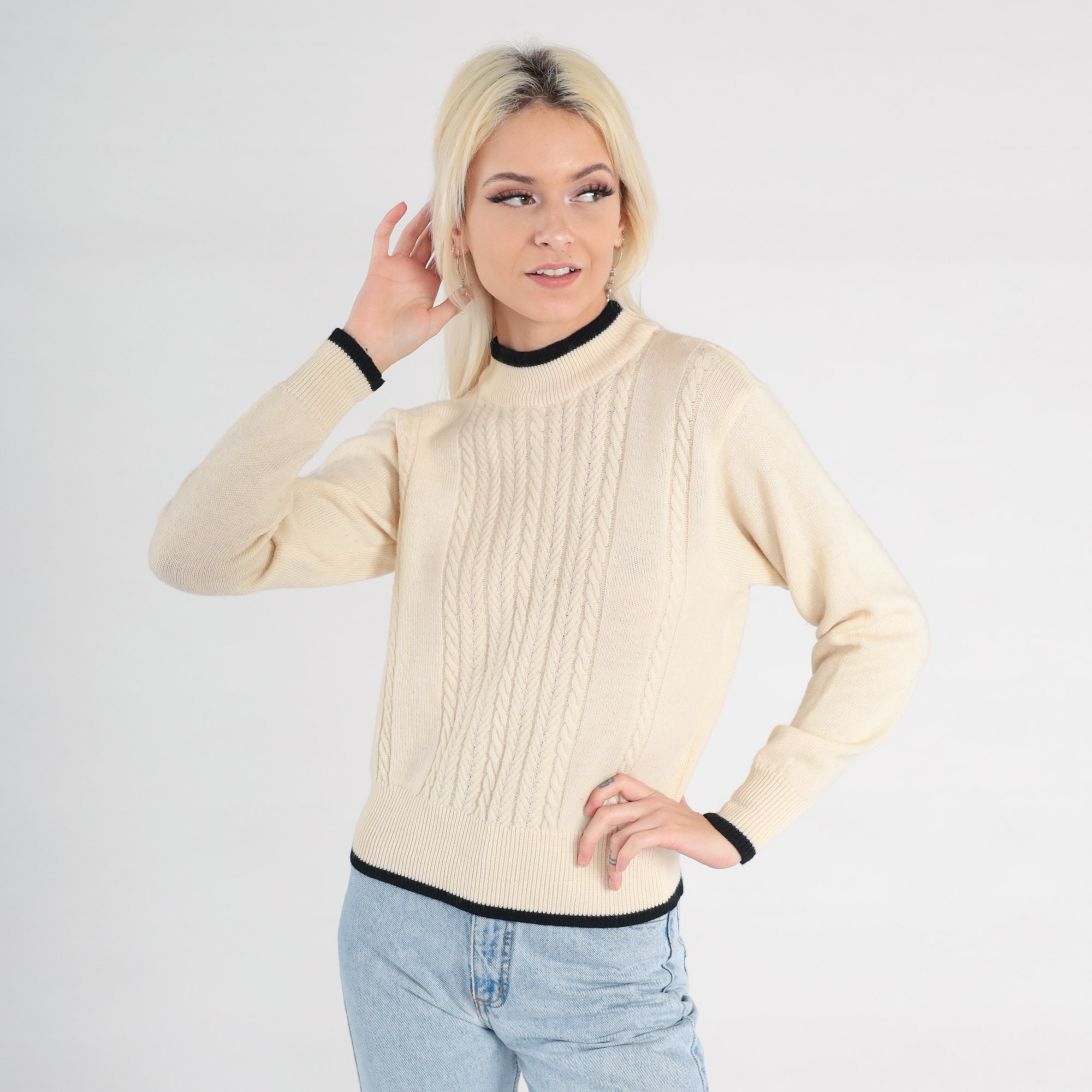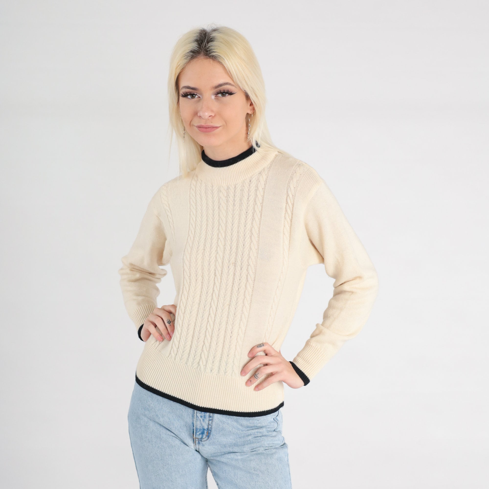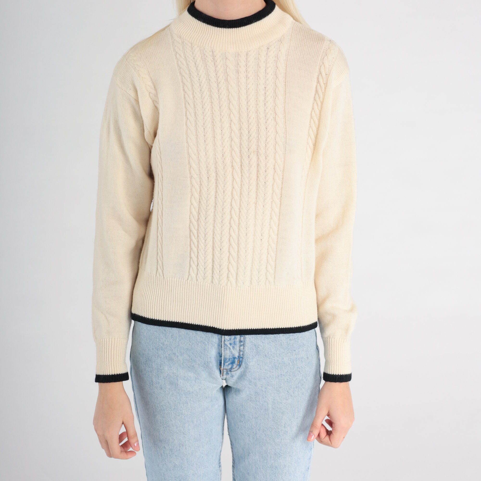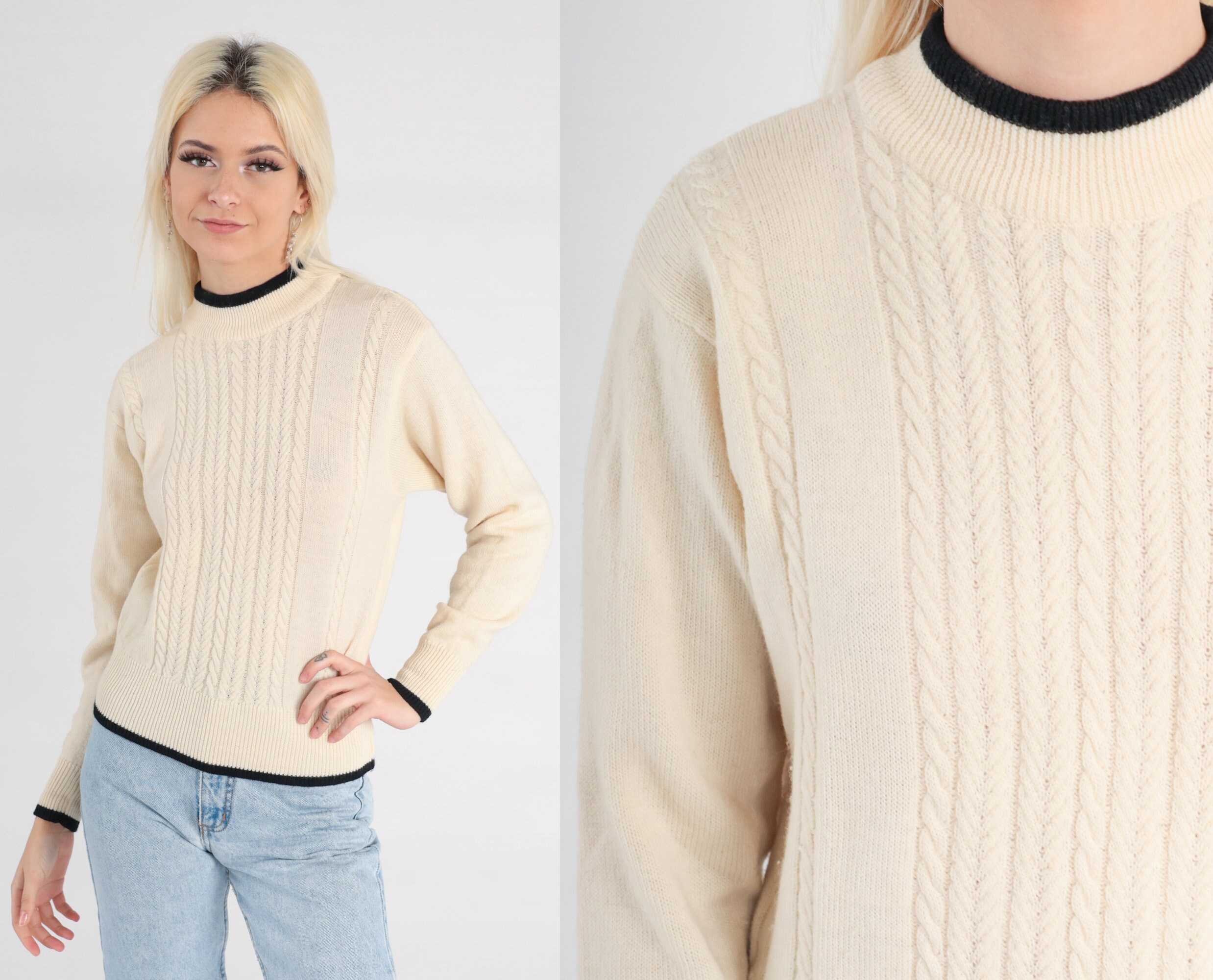 Vintage 90s sweater in cream wool cable knit with black ringer trim.