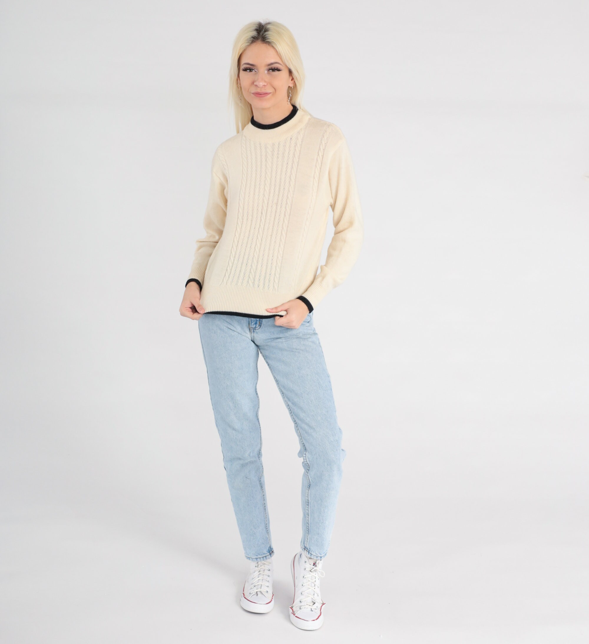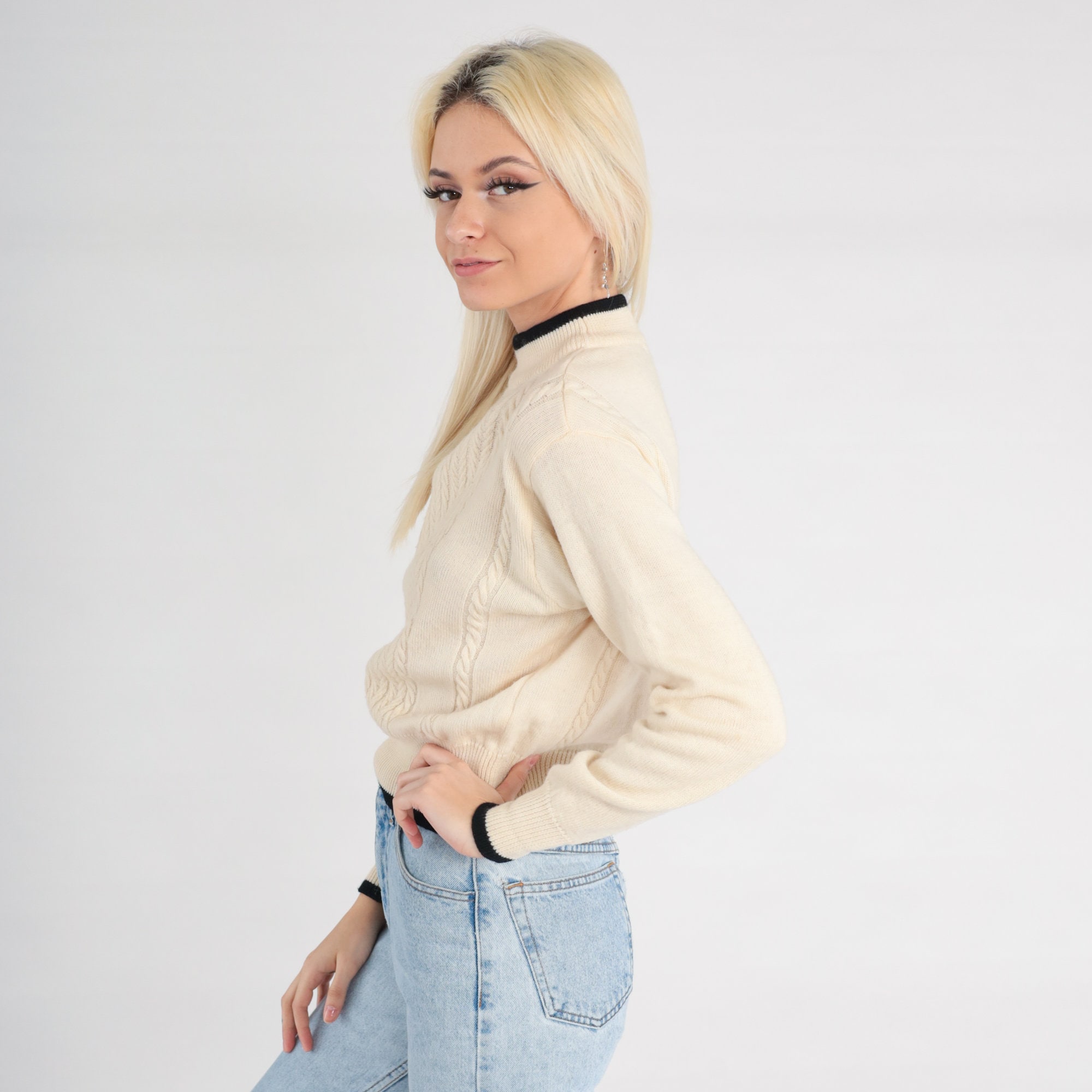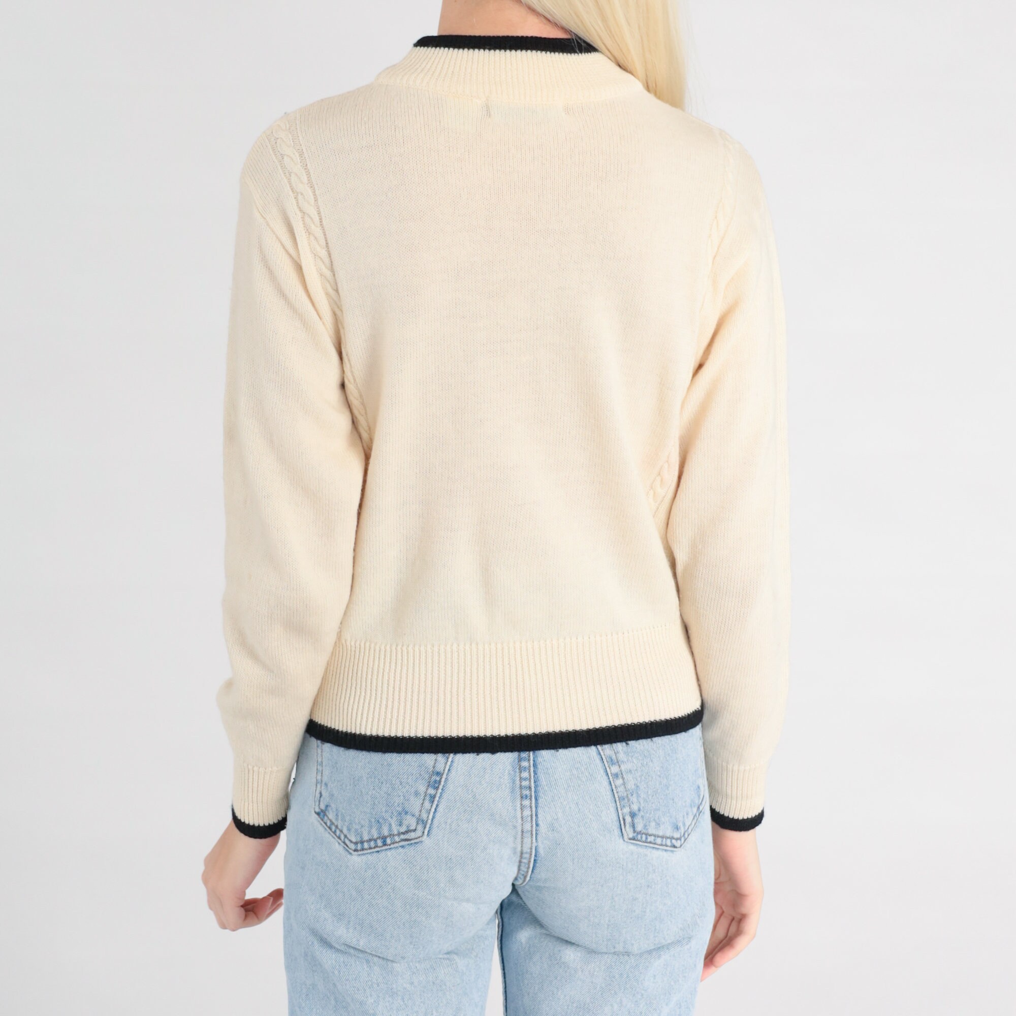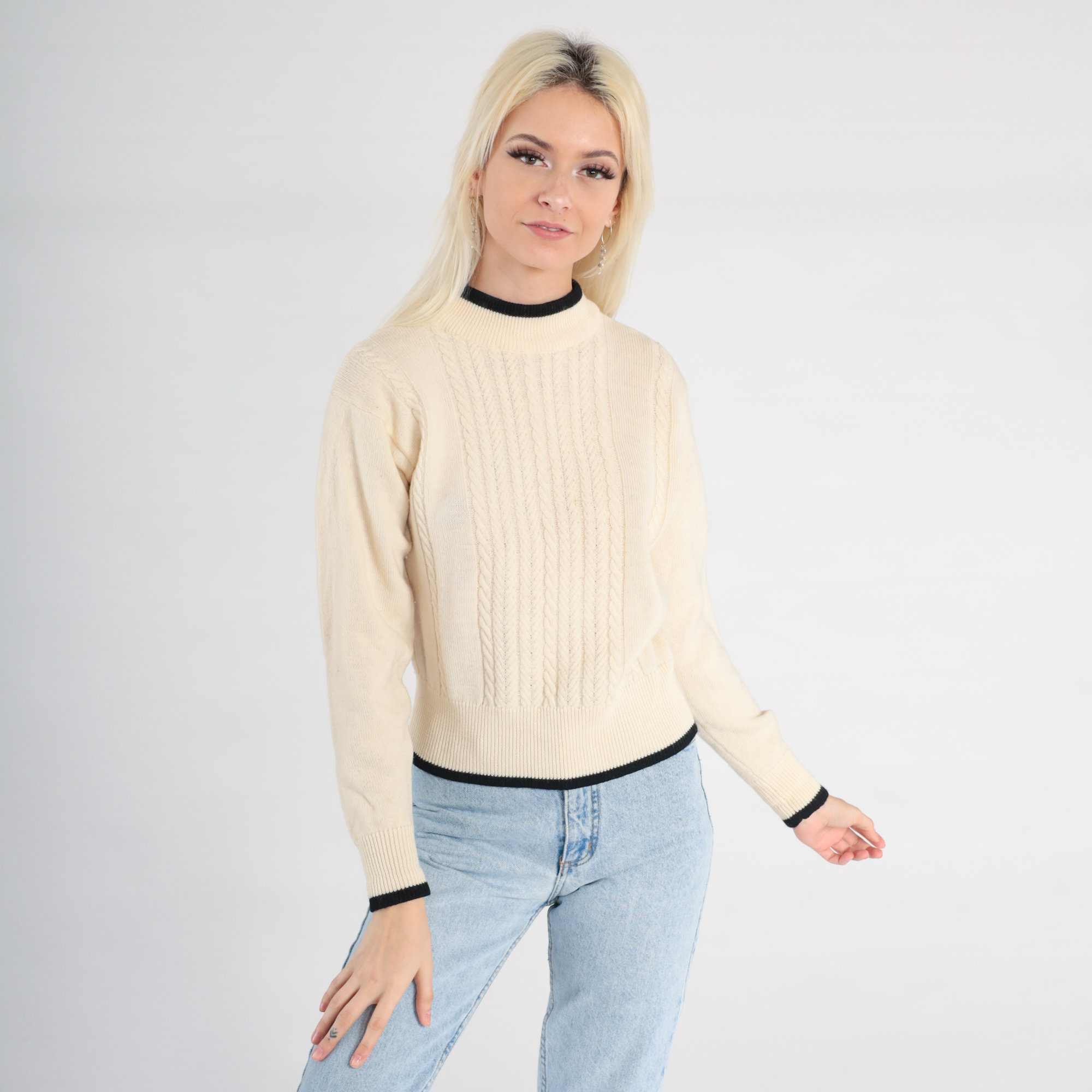 Vintage 90s sweater in cream wool cable knit with black ringer trim.