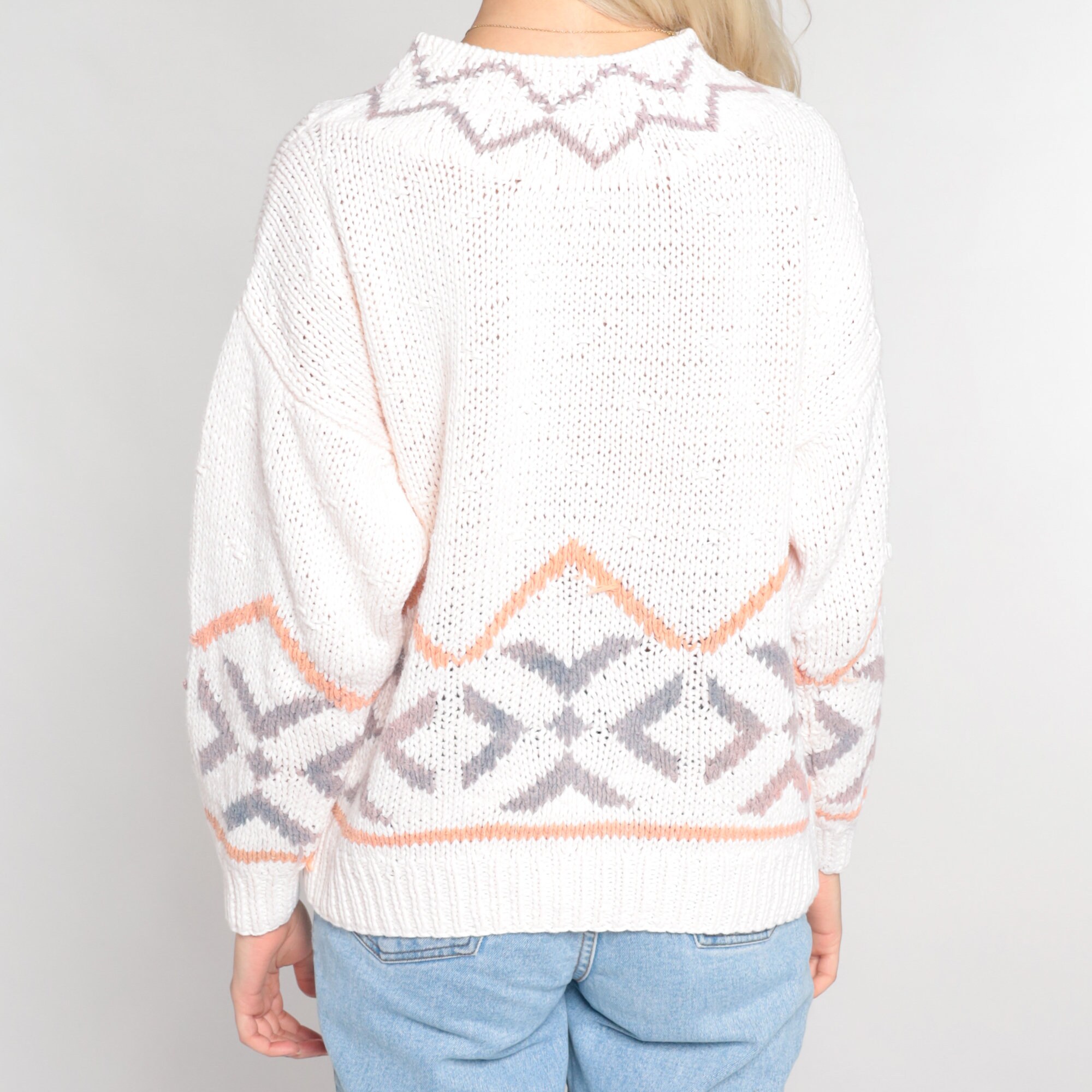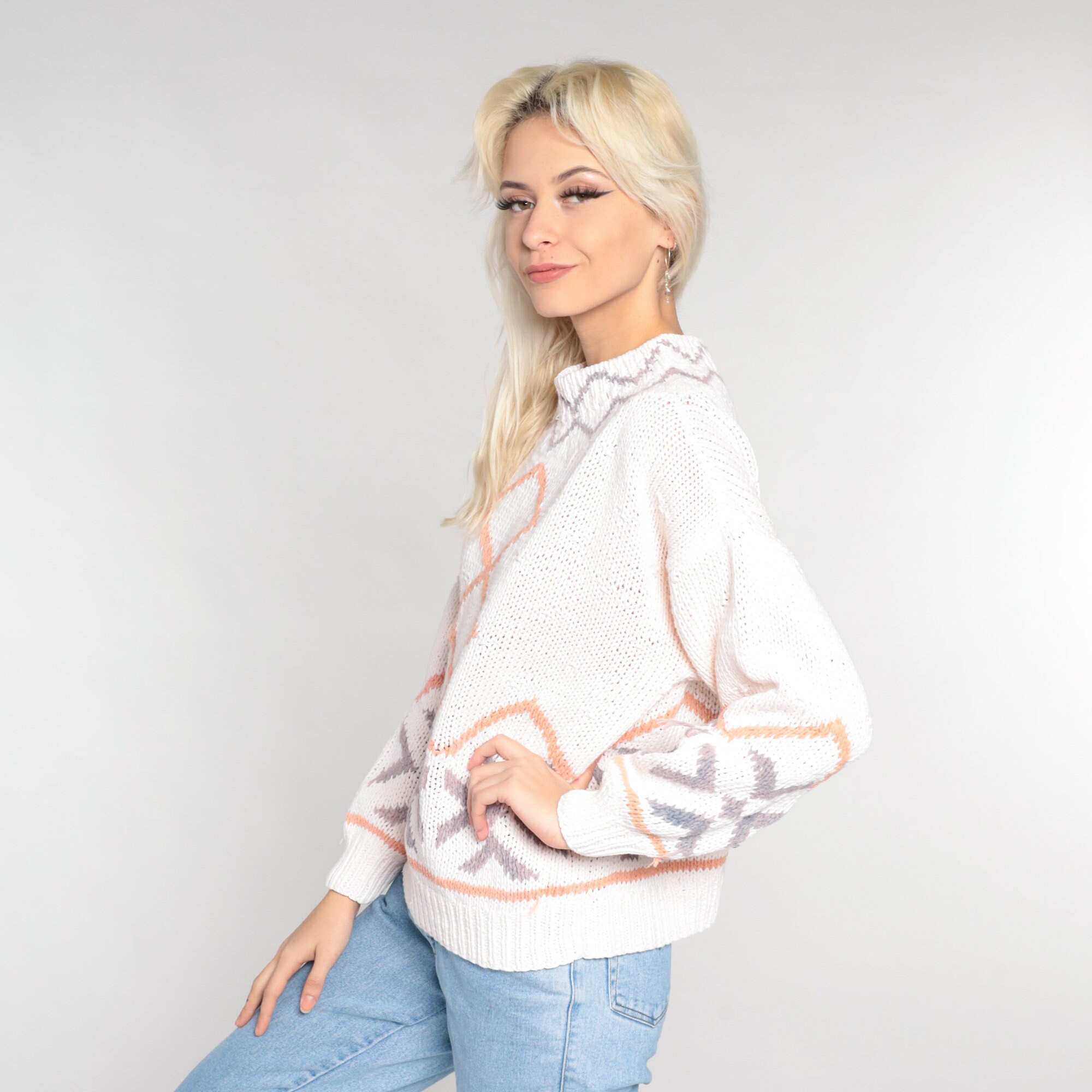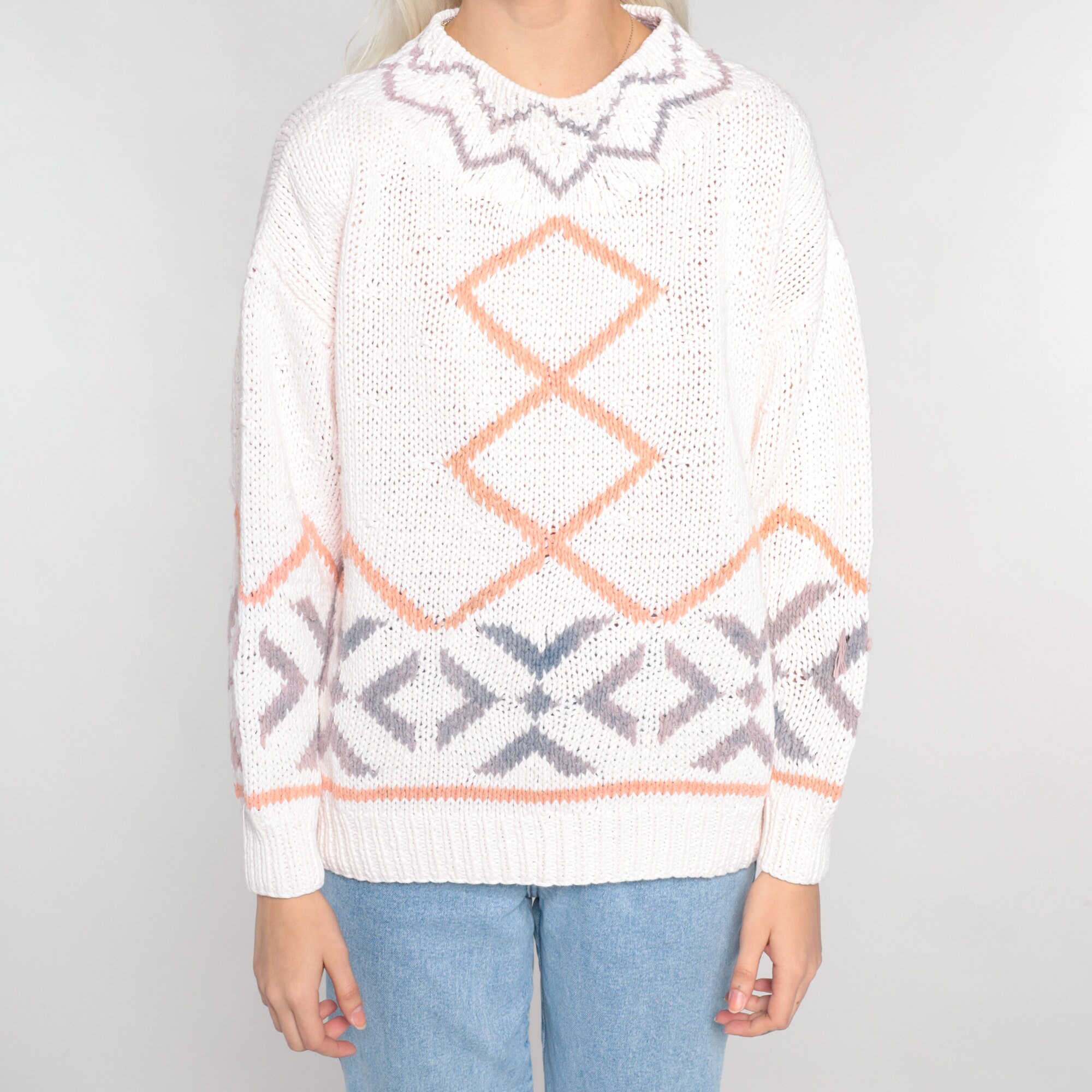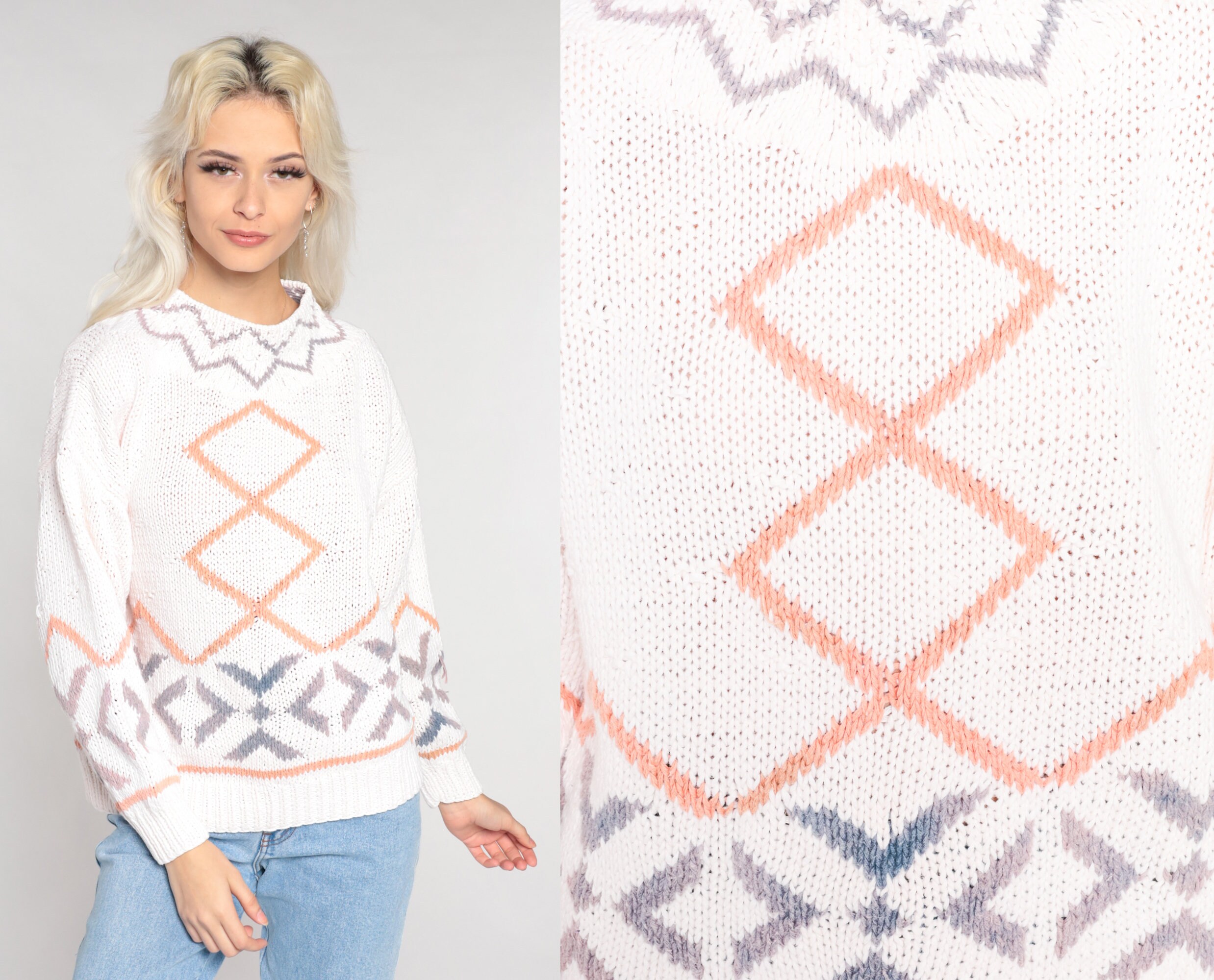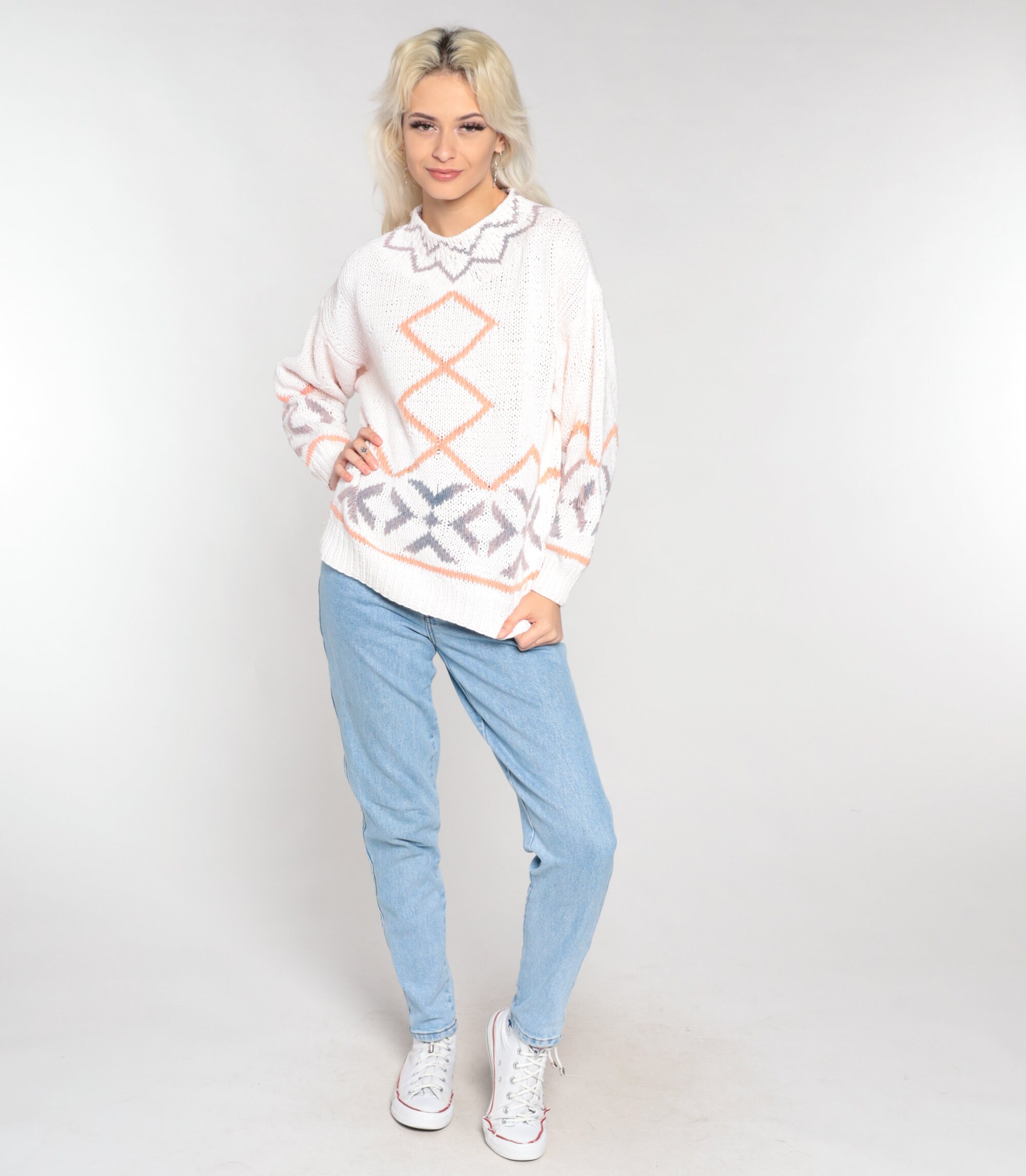 Vintage 90s sweater in white knit with a geometric diamond print.