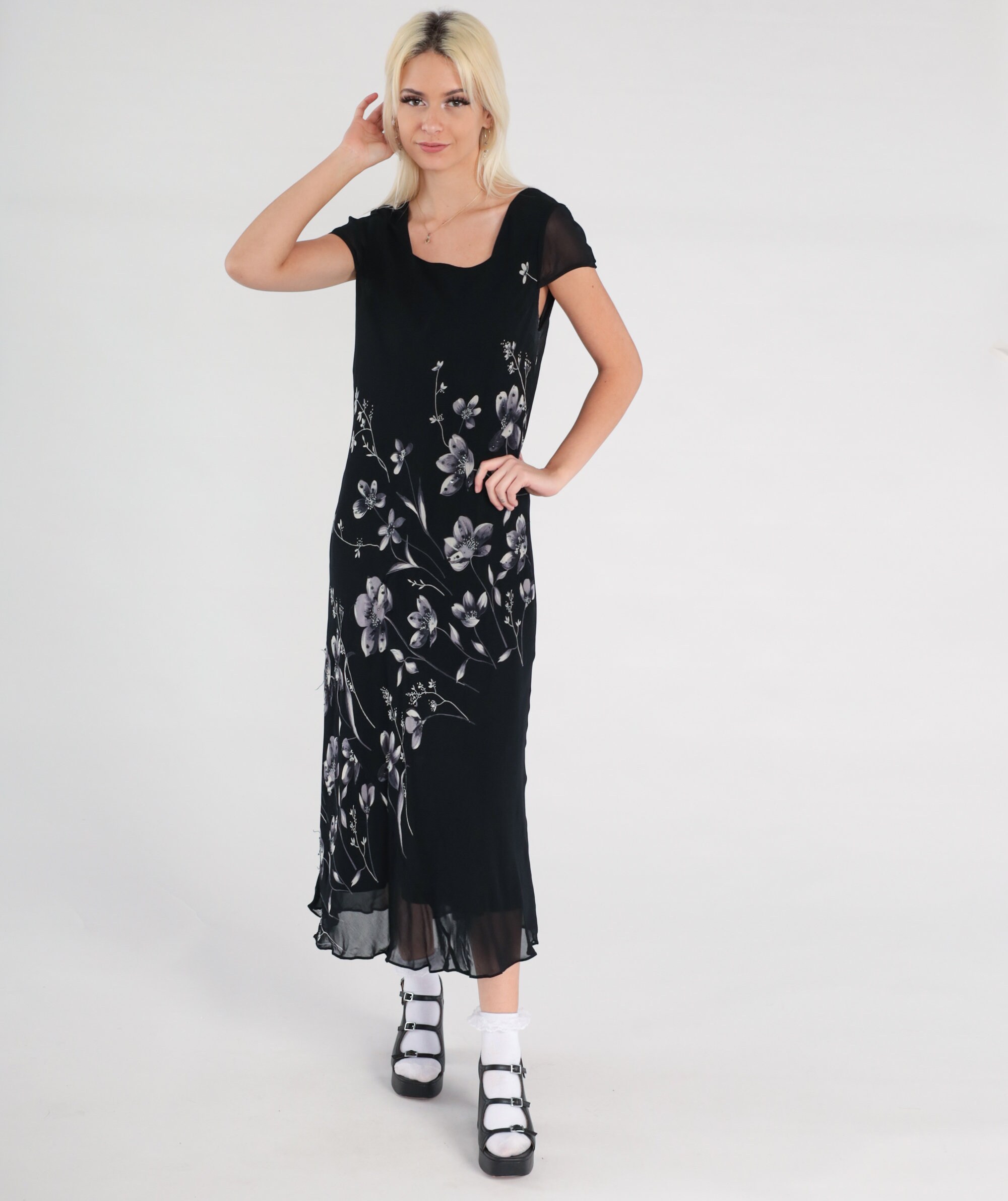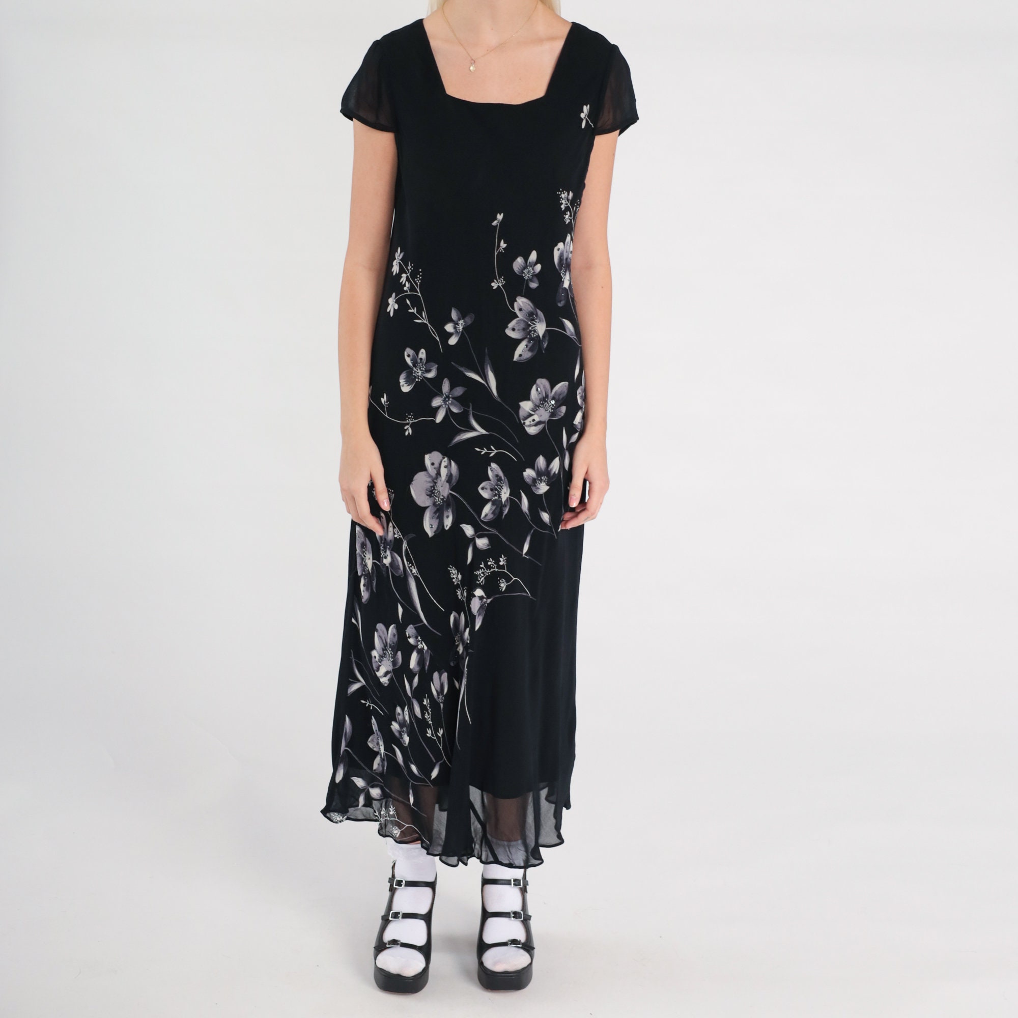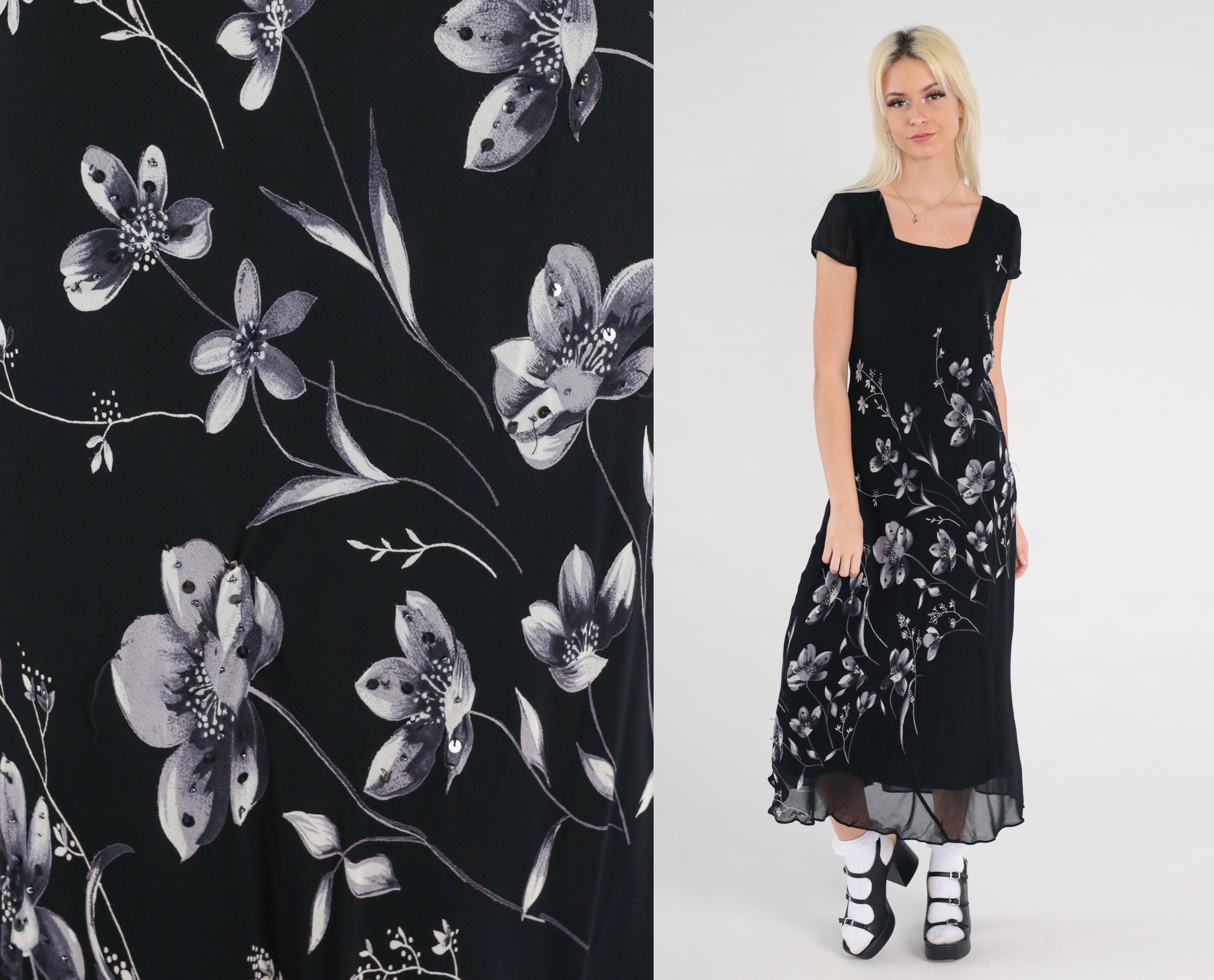 Vintage 00s dress in black chiffon with a floral print with beads and sequins. Midi length.