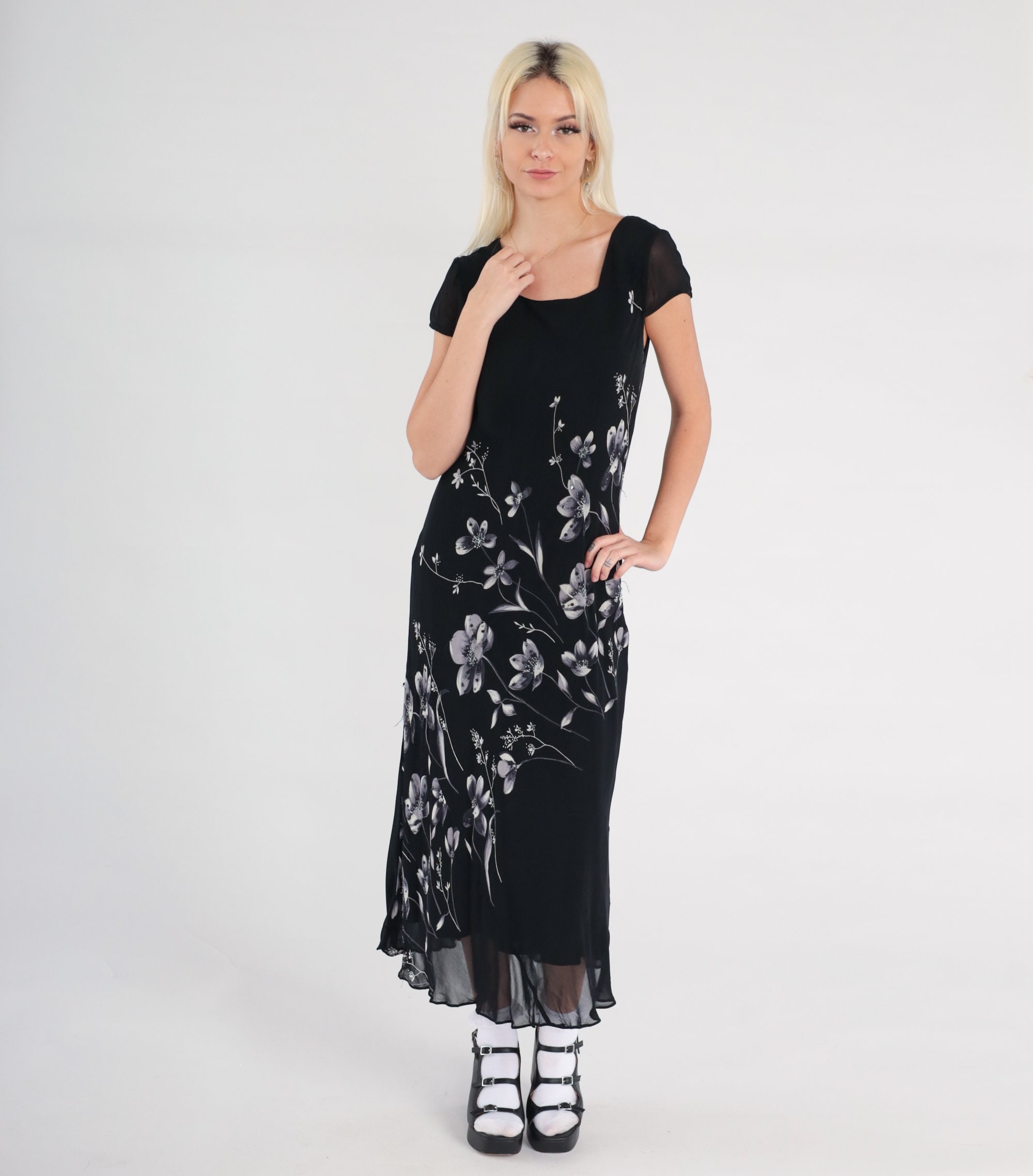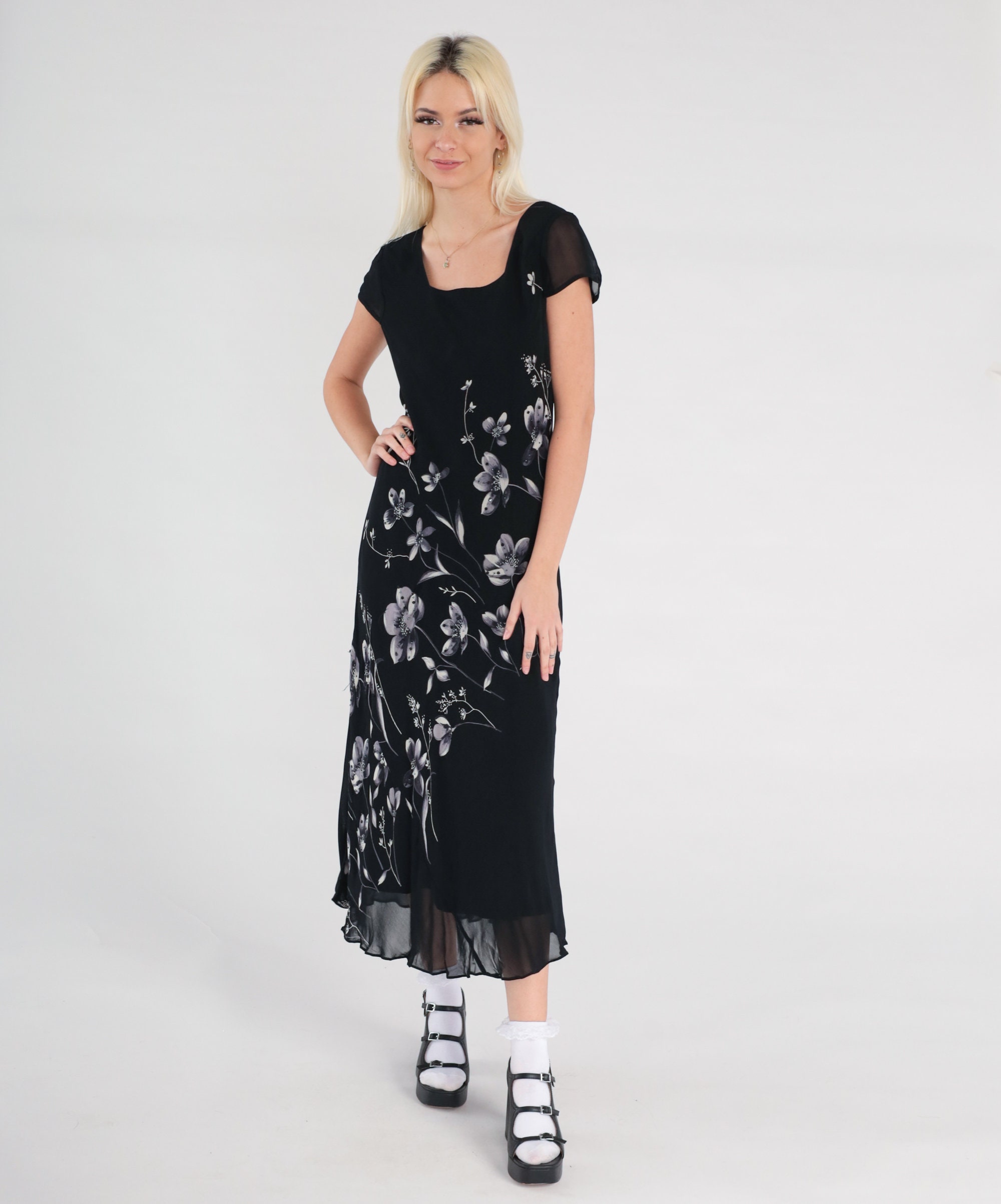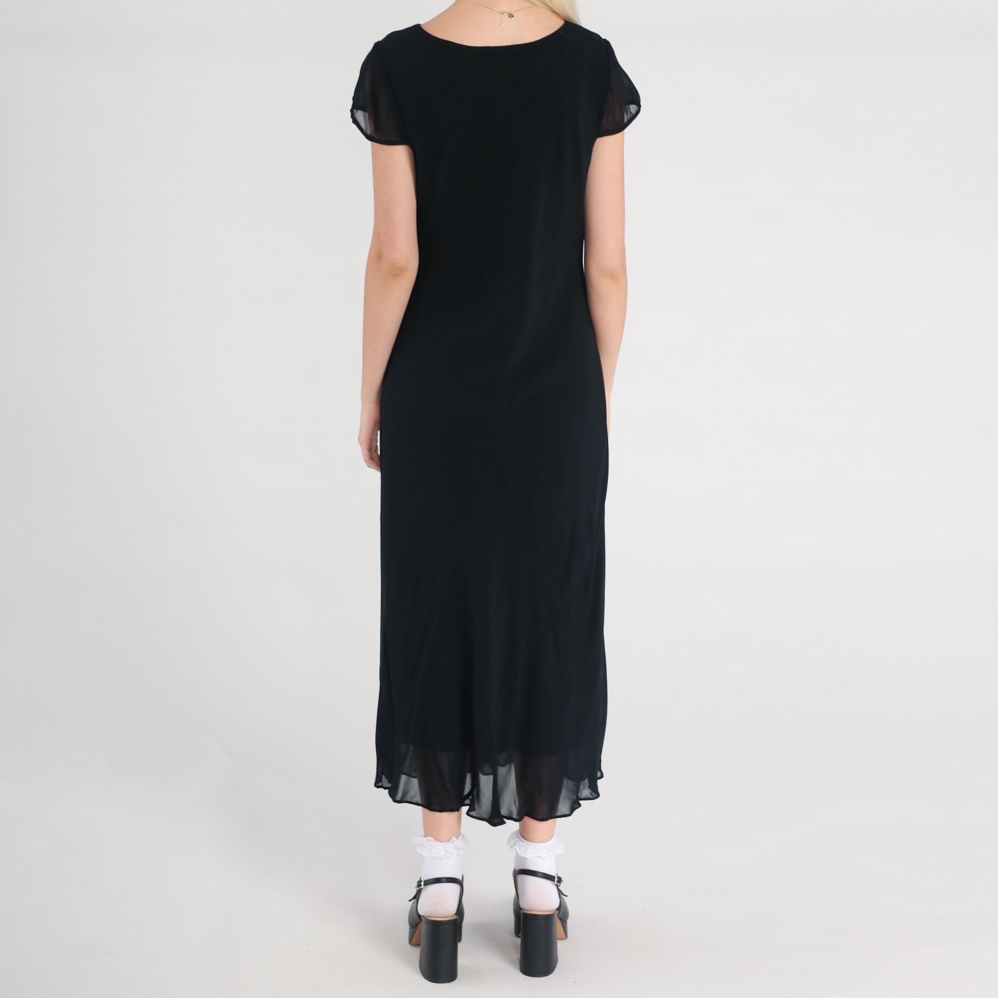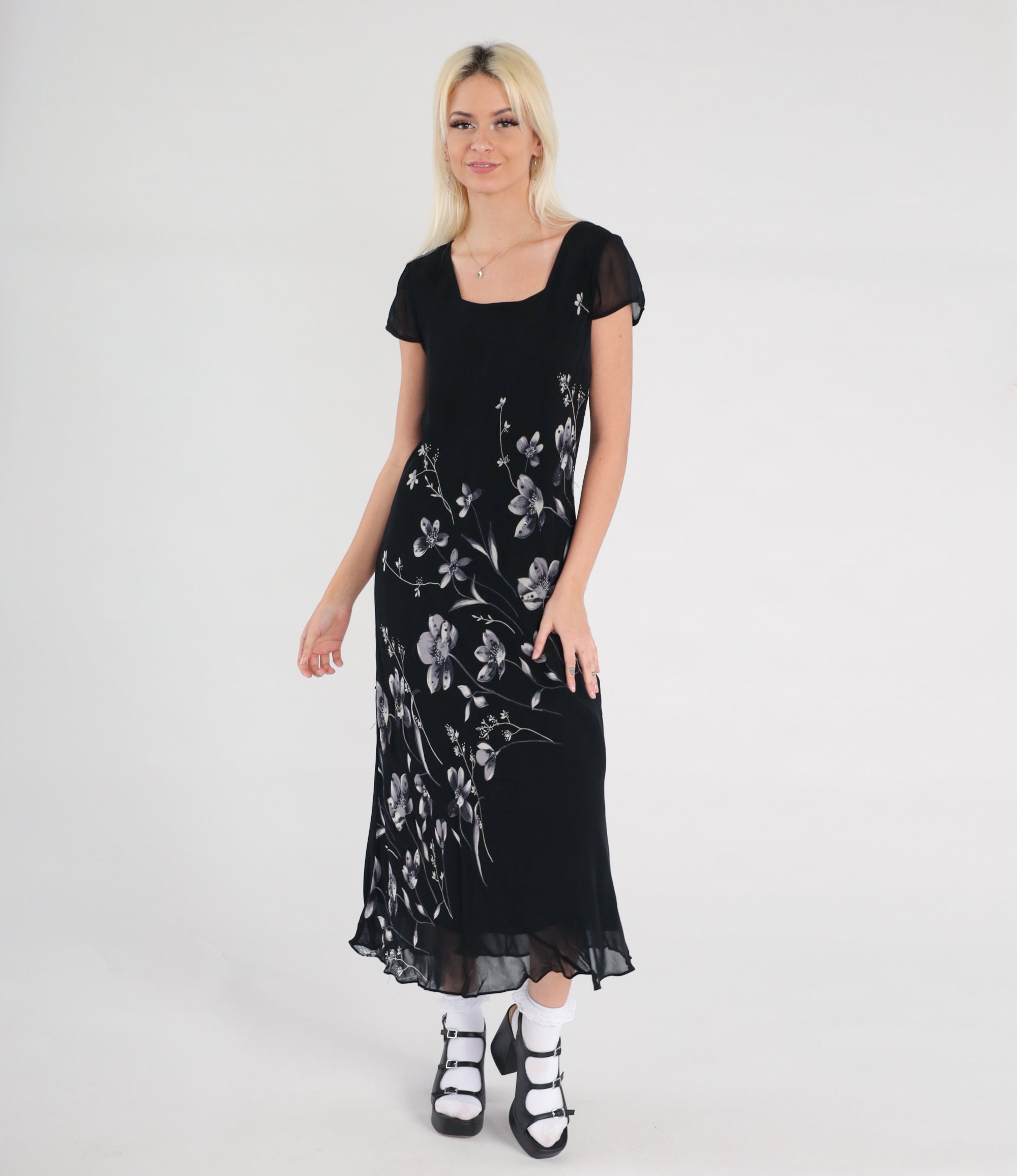 Vintage 00s dress in black chiffon with a floral print with beads and sequins. Midi length.