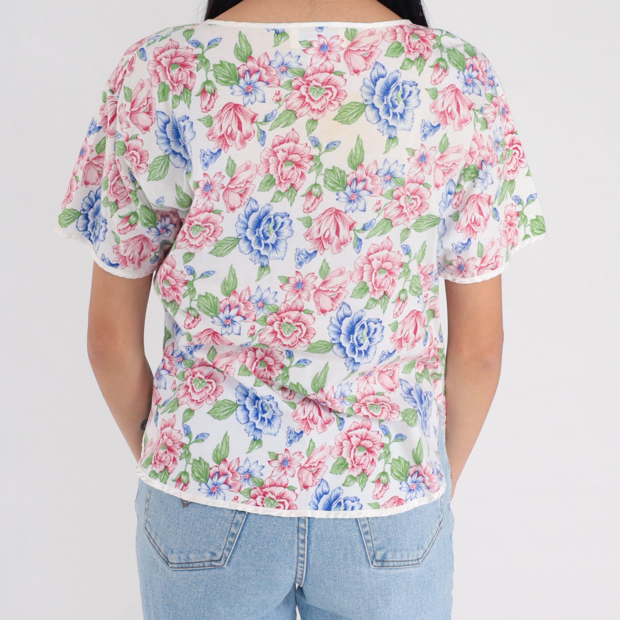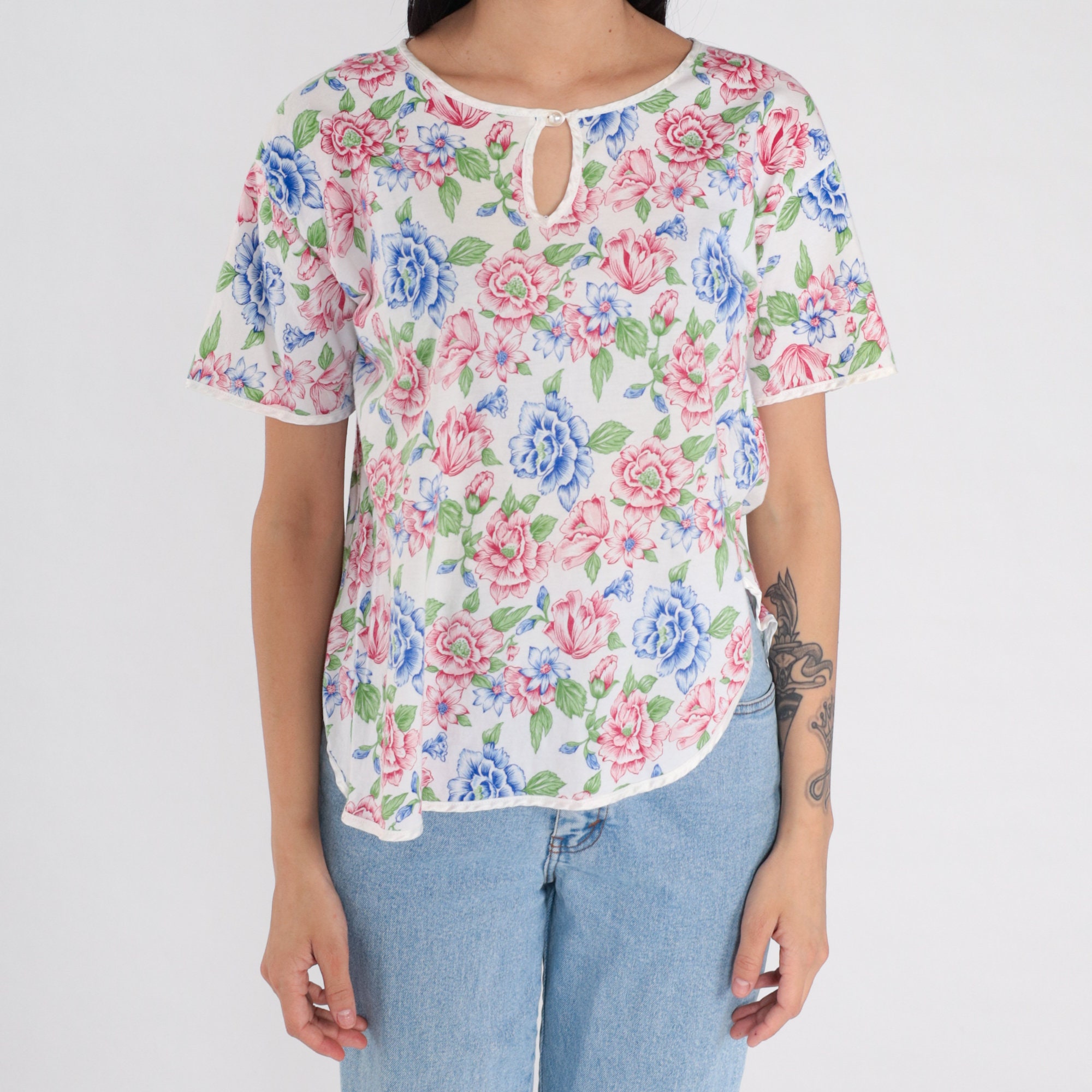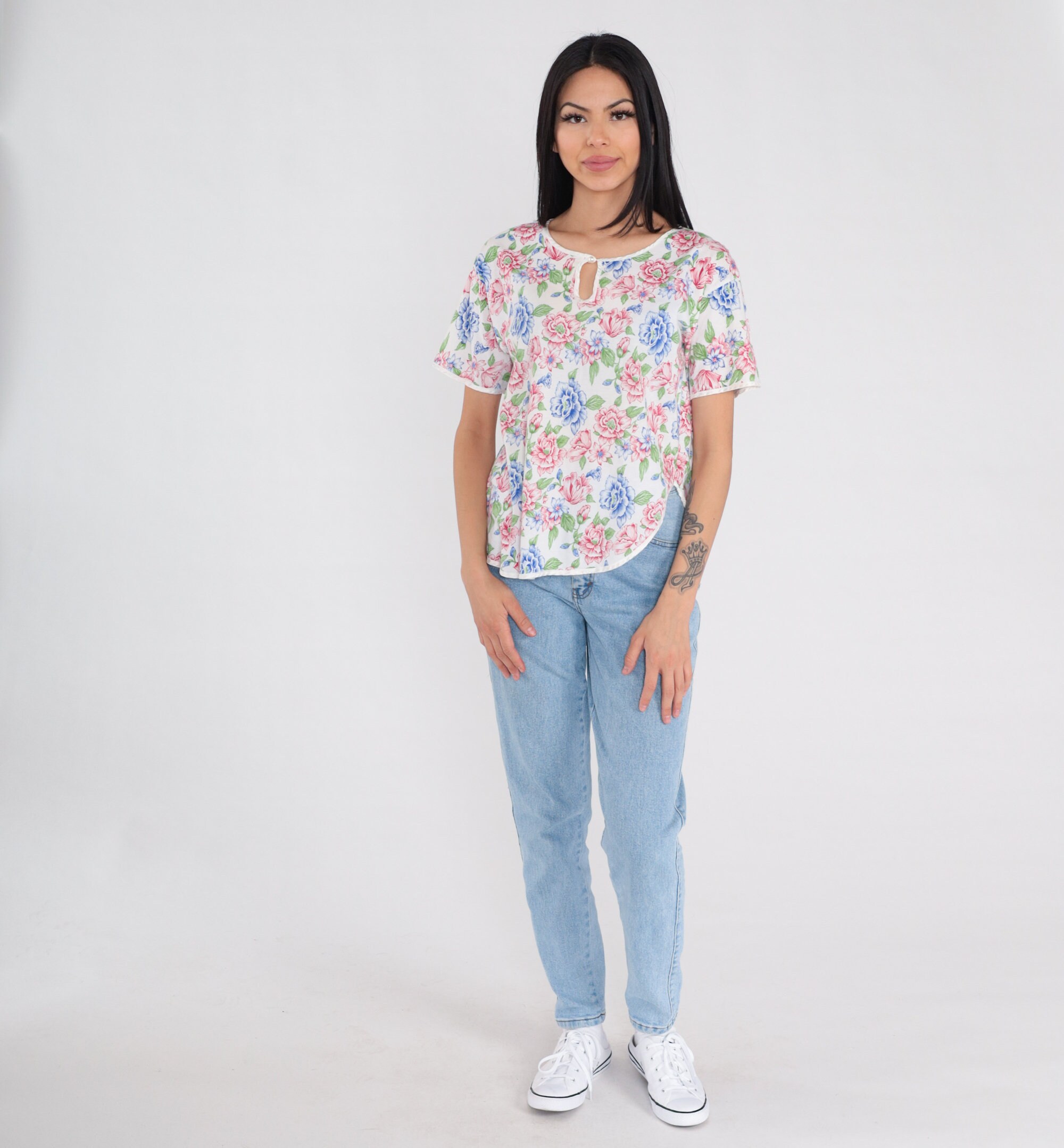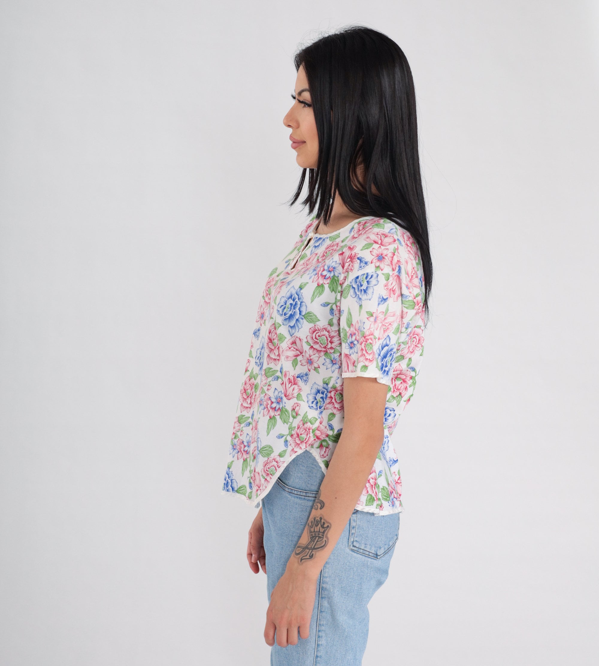 Vintage 90s shirt in white with a flora print. It has short sleeves and a keyhole that buttons at the neck.