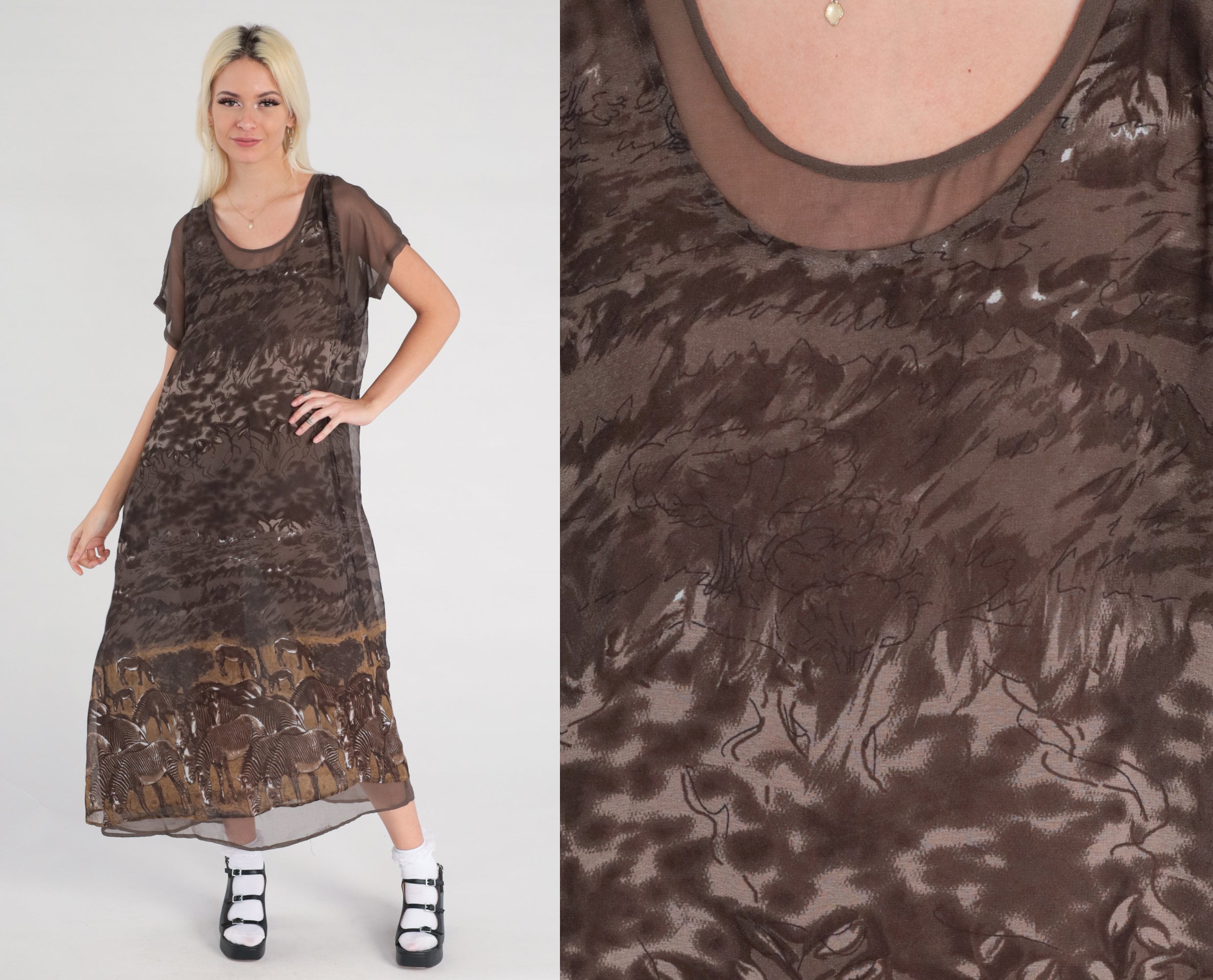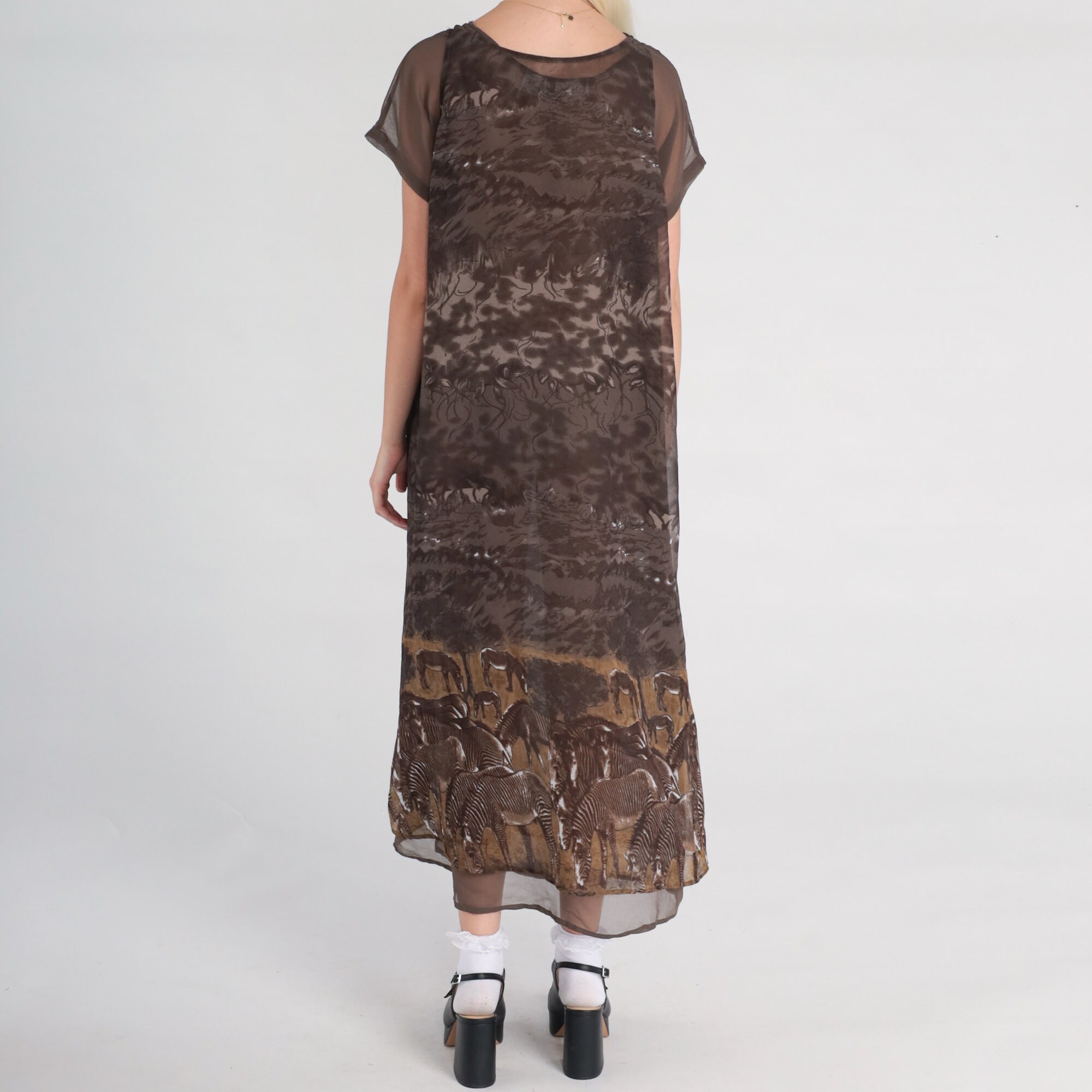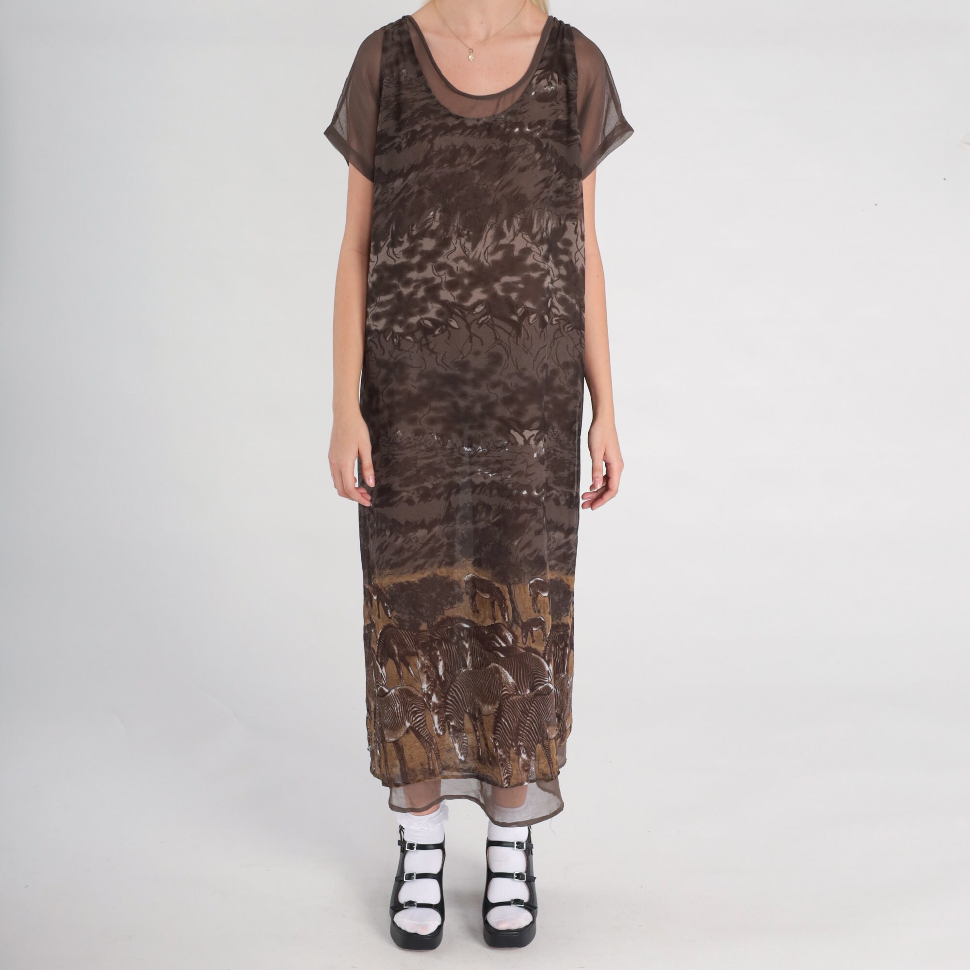 Vintage 90s dress with a zebra print on the bottom of the skirt. Column cut with short sleeves. Ankle length.
