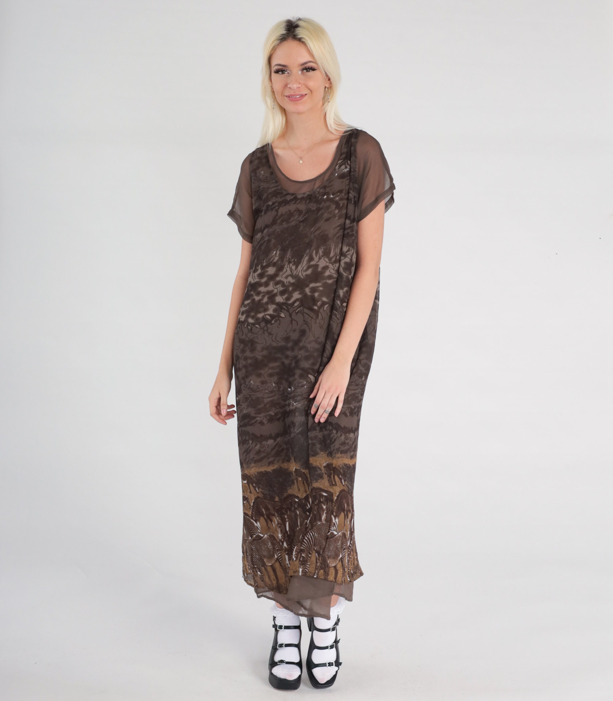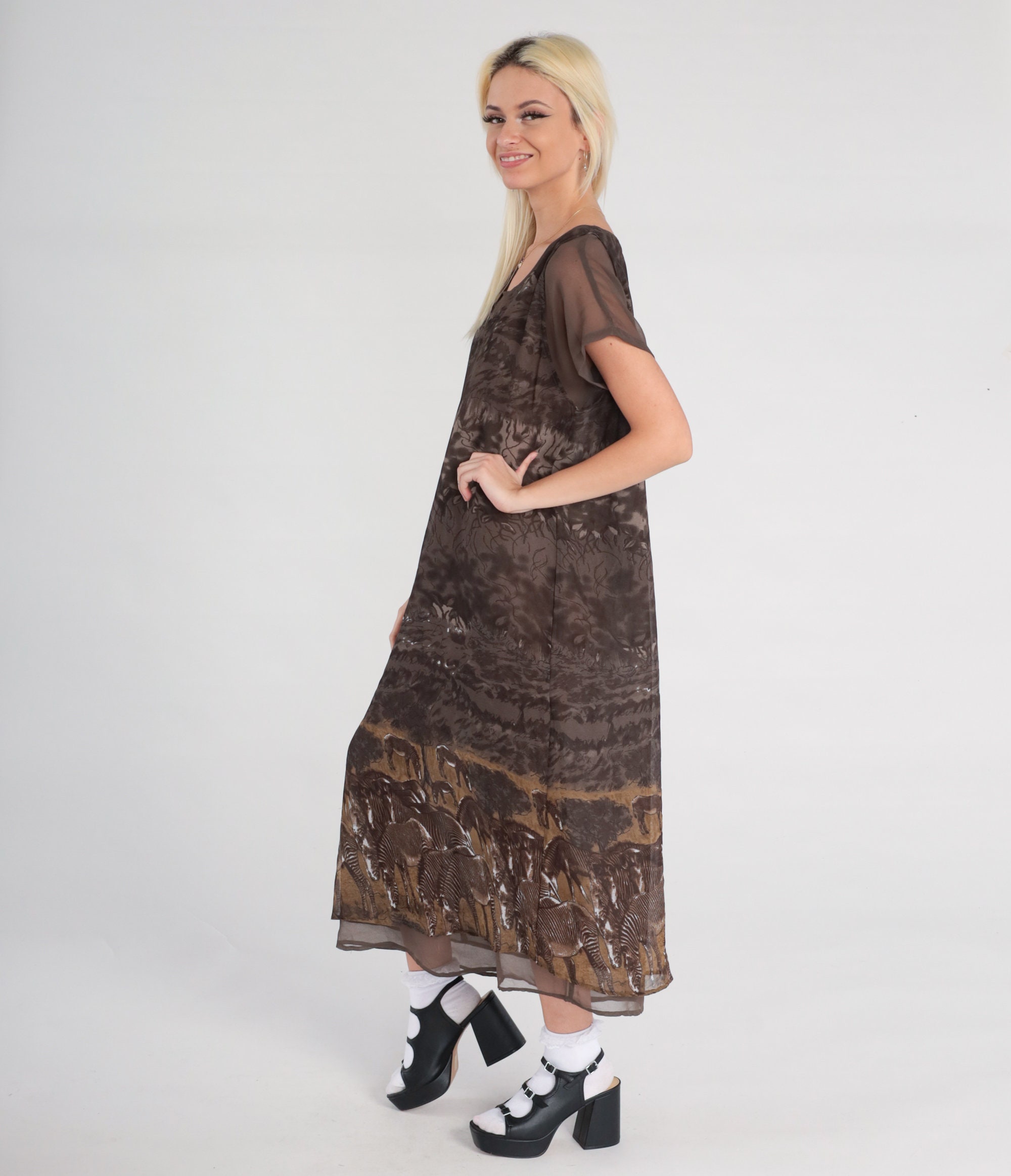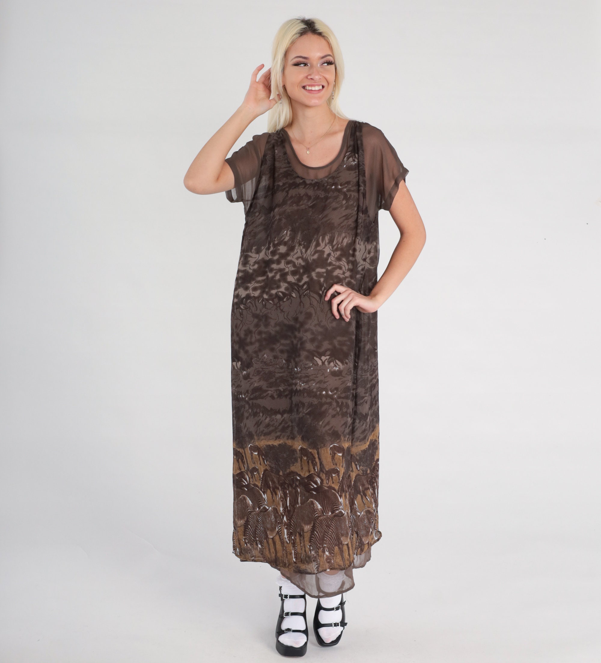 Vintage 90s dress with a zebra print on the bottom of the skirt. Column cut with short sleeves. Ankle length.