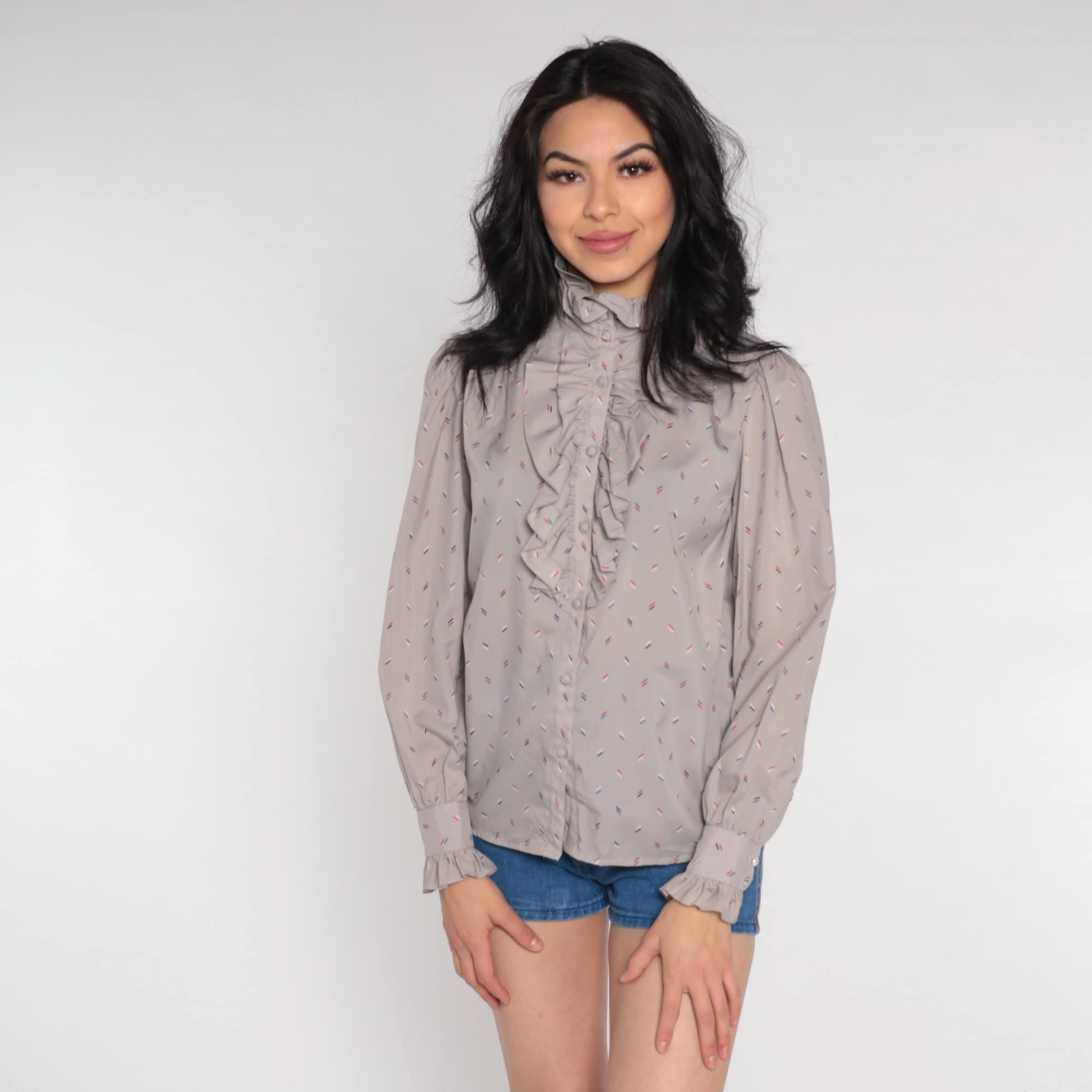 Vintage 80s blouse in grey with a tiny confetti stripe print and a ruffle neck. Button at the neck, long puff sleeves.