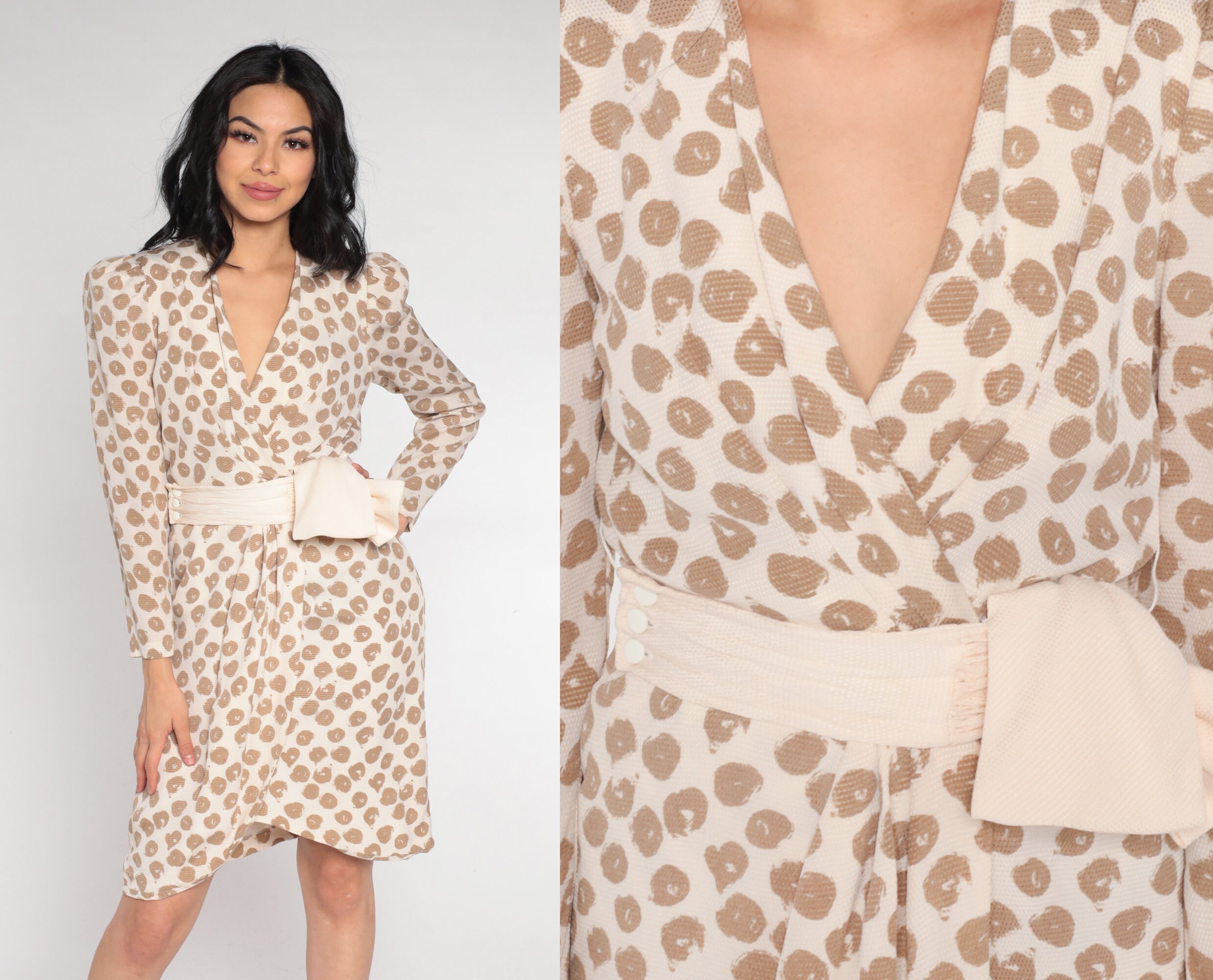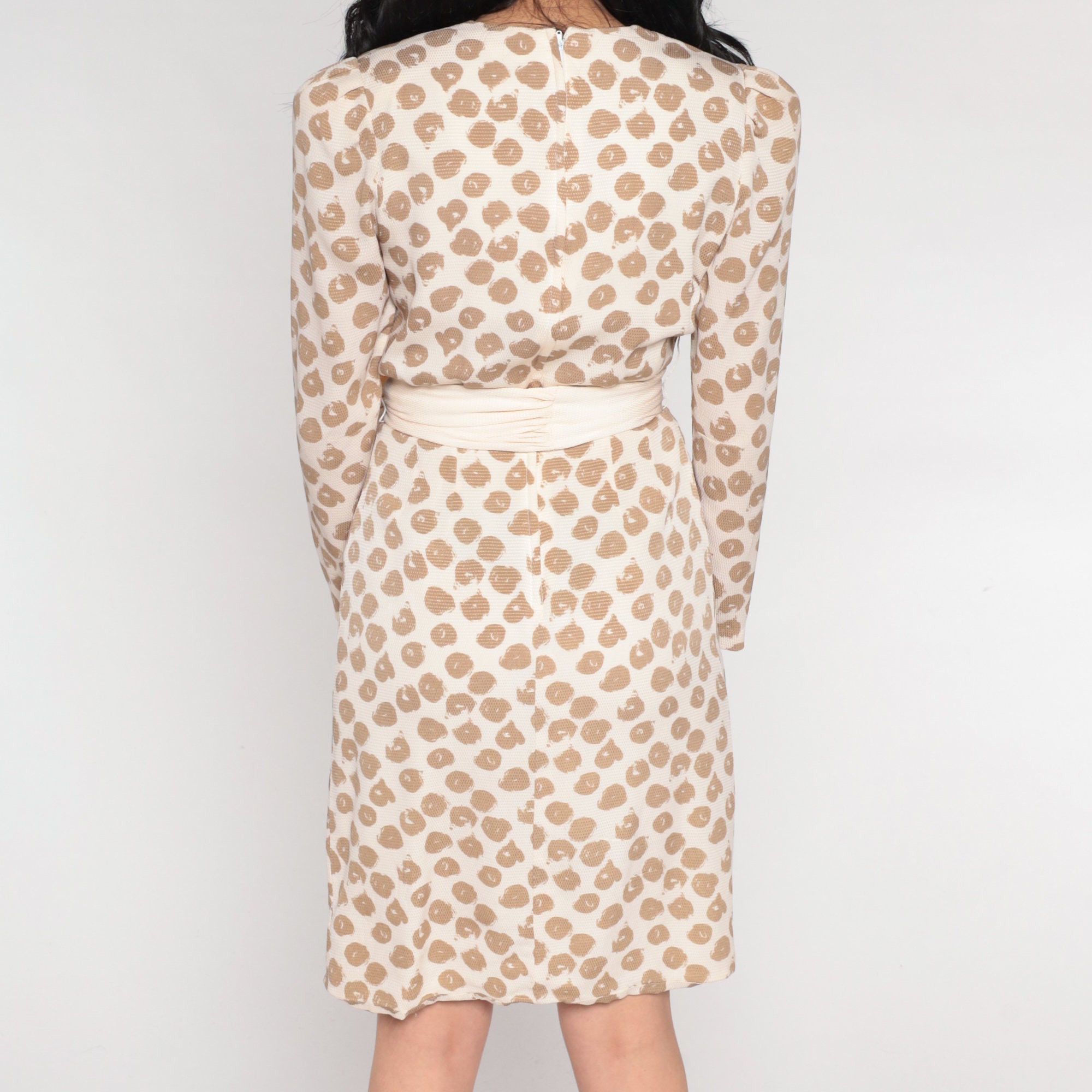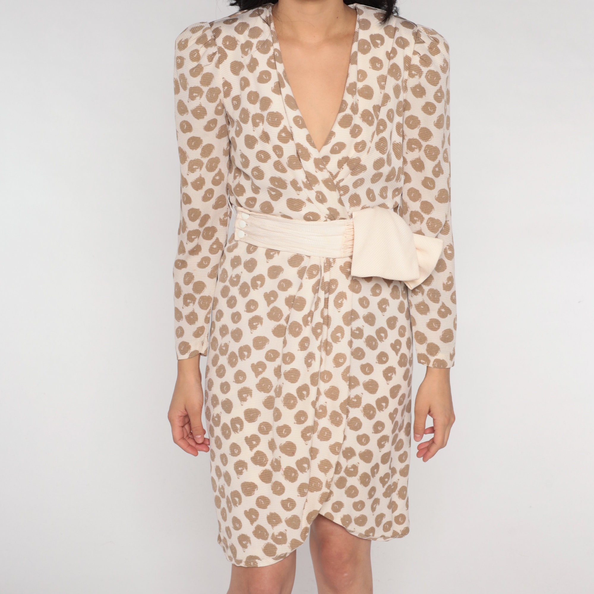 Vintage 80s dress in tan and off-white silk with an abstract dot print. It has long sleeves, a v neck, and a wrap cut with an attached belt. Mini length.