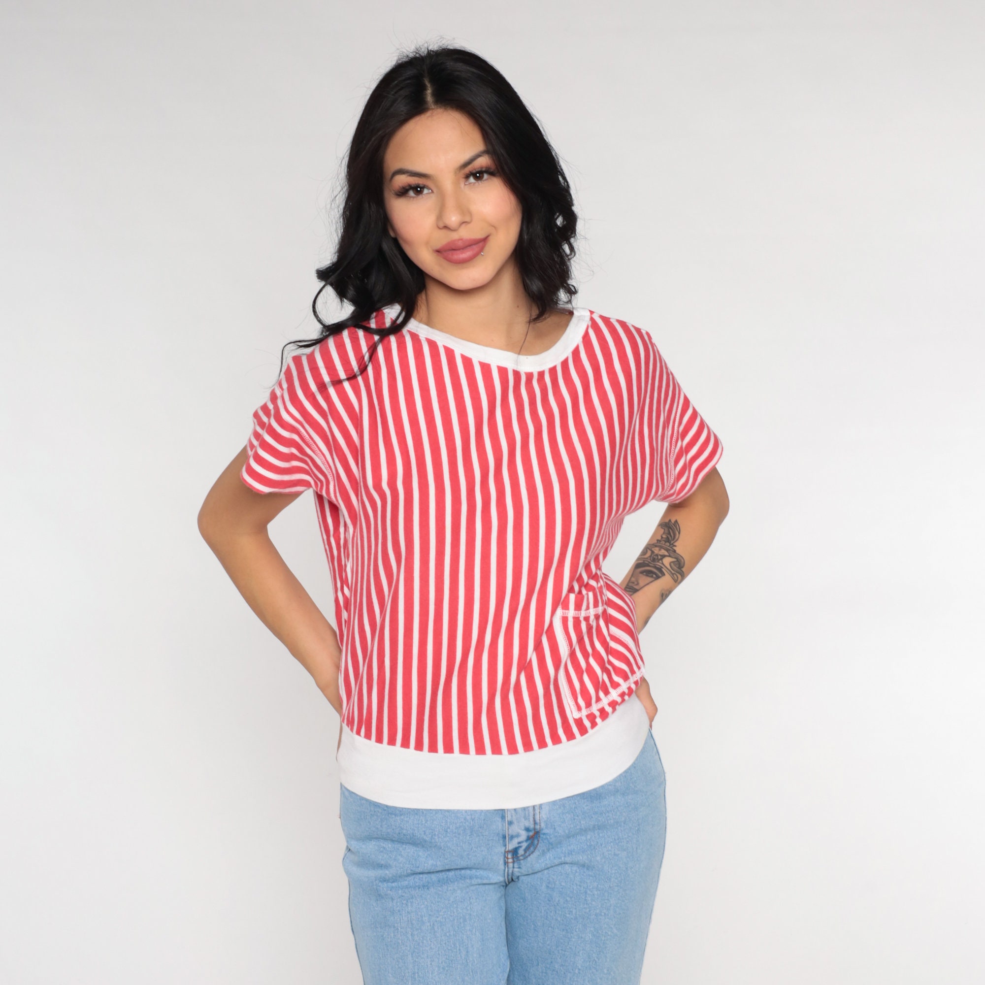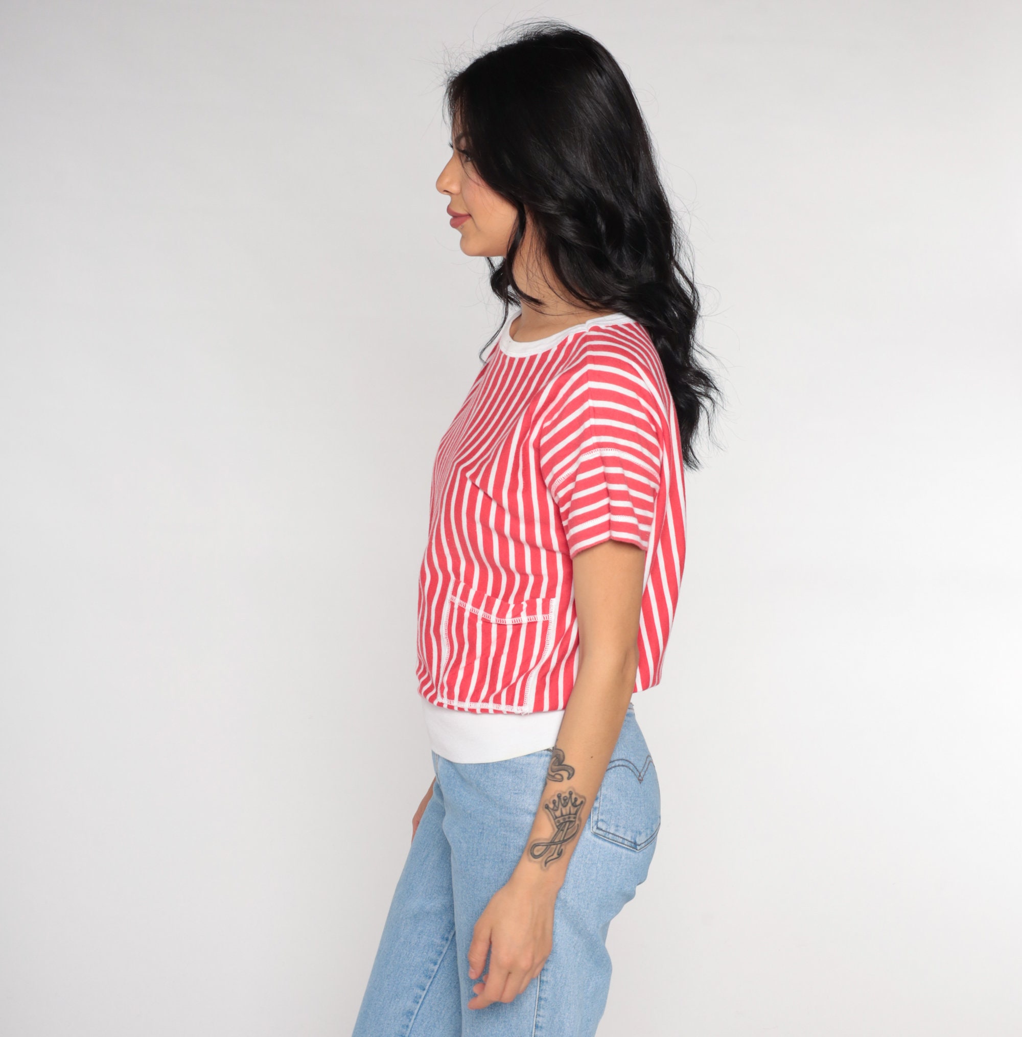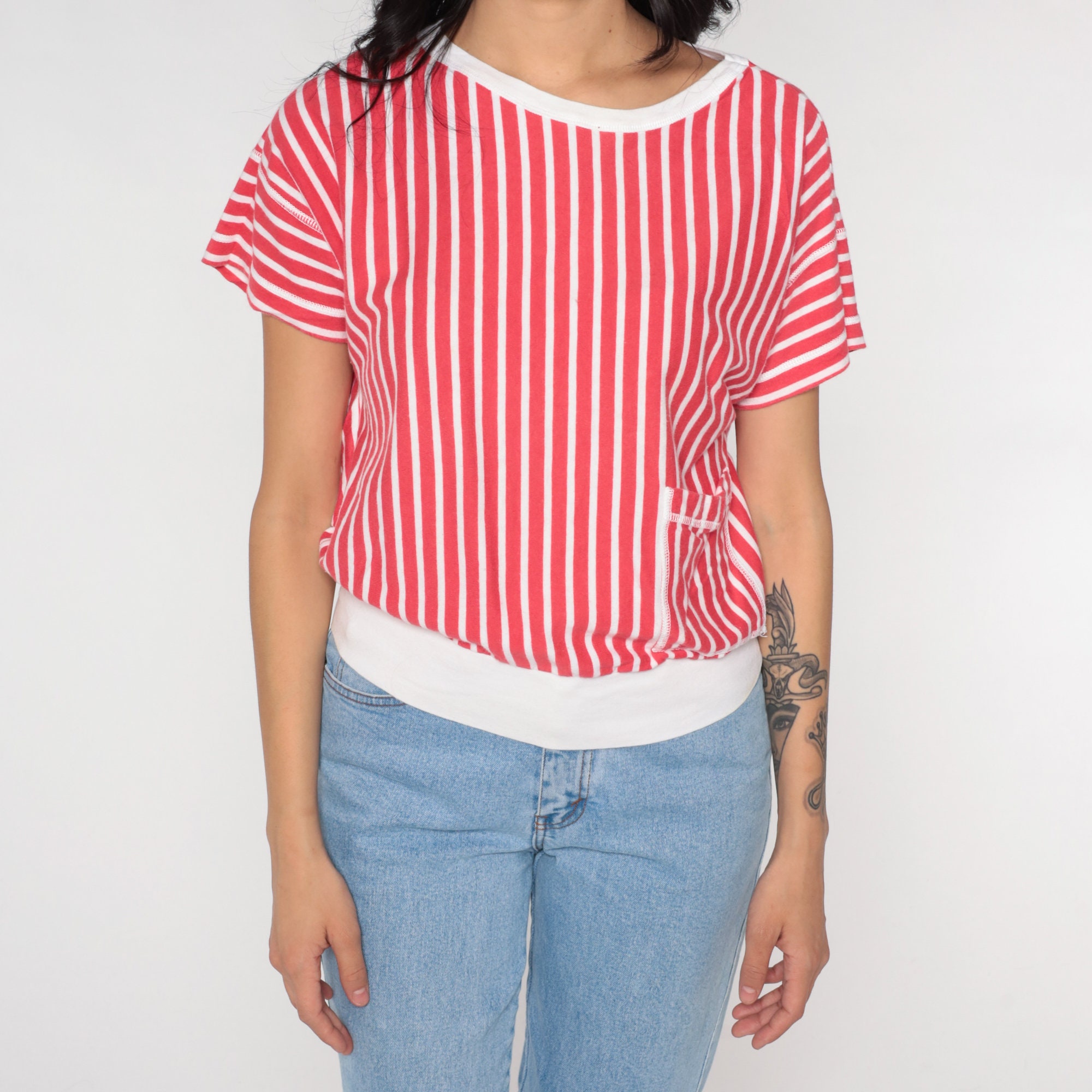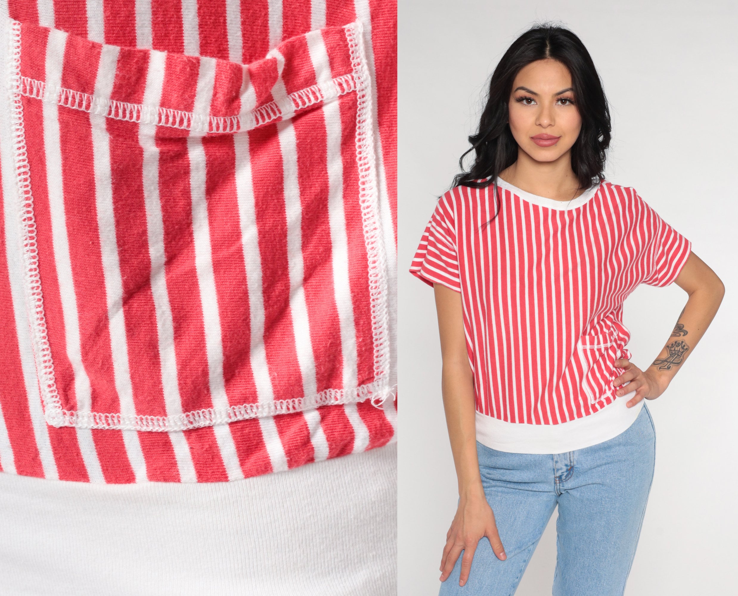 Vintage 90s top in red and white stripes with a pocket and a slouchy fit.