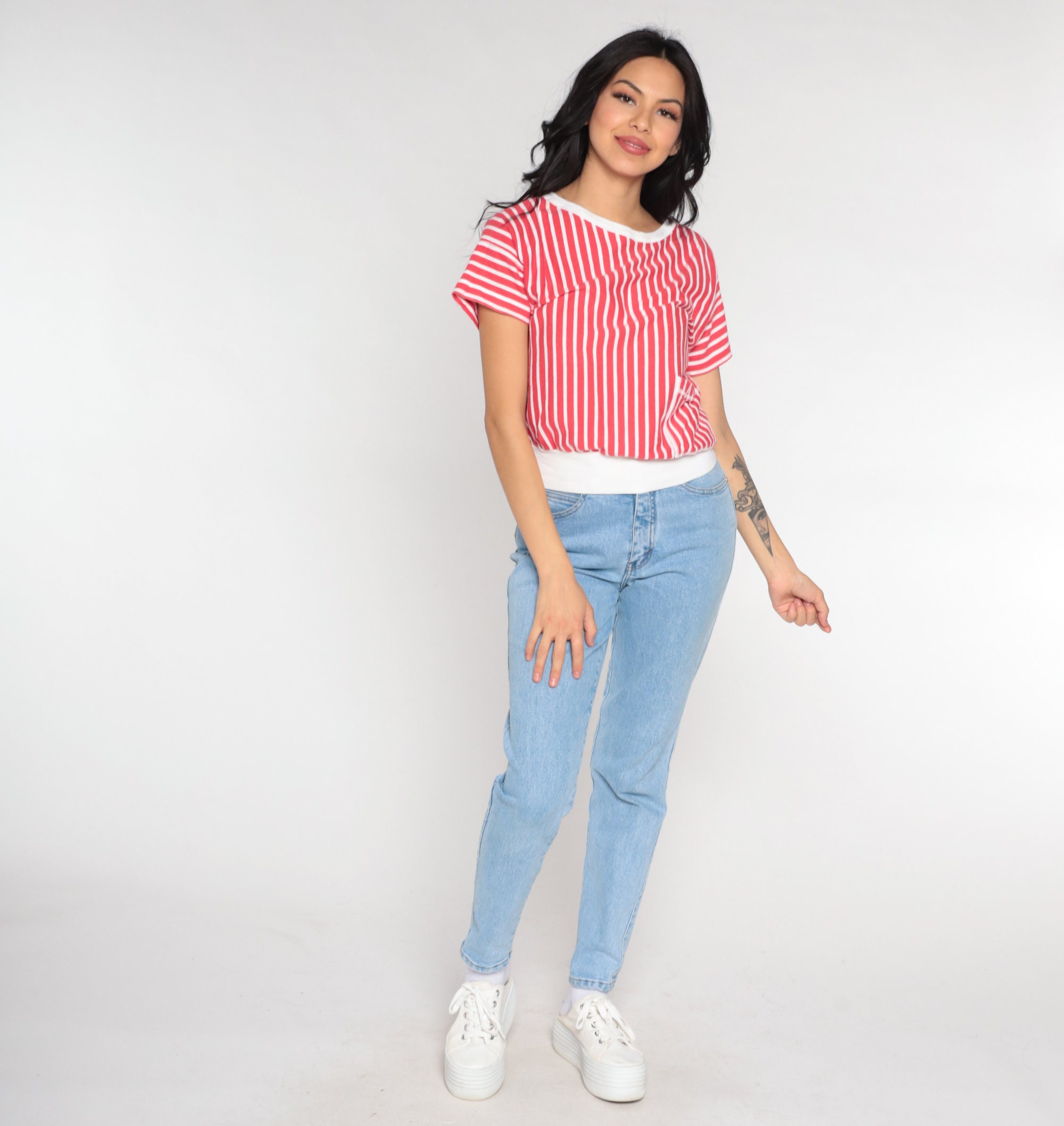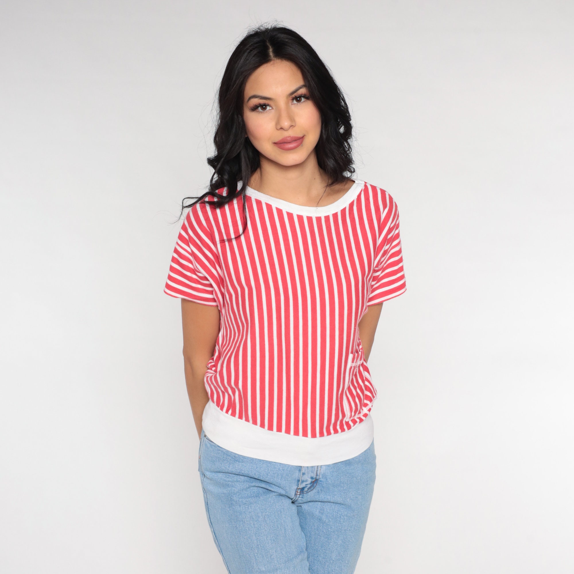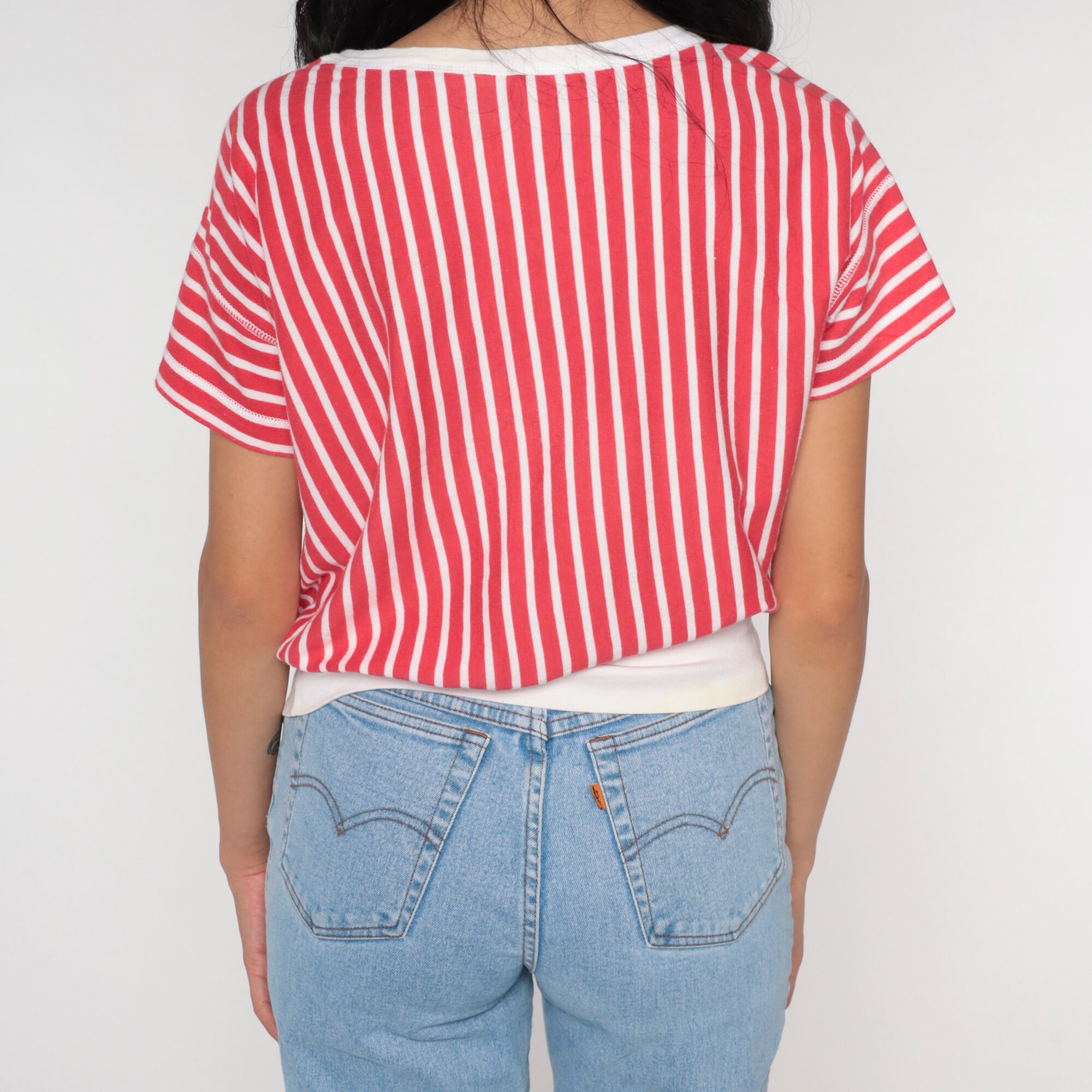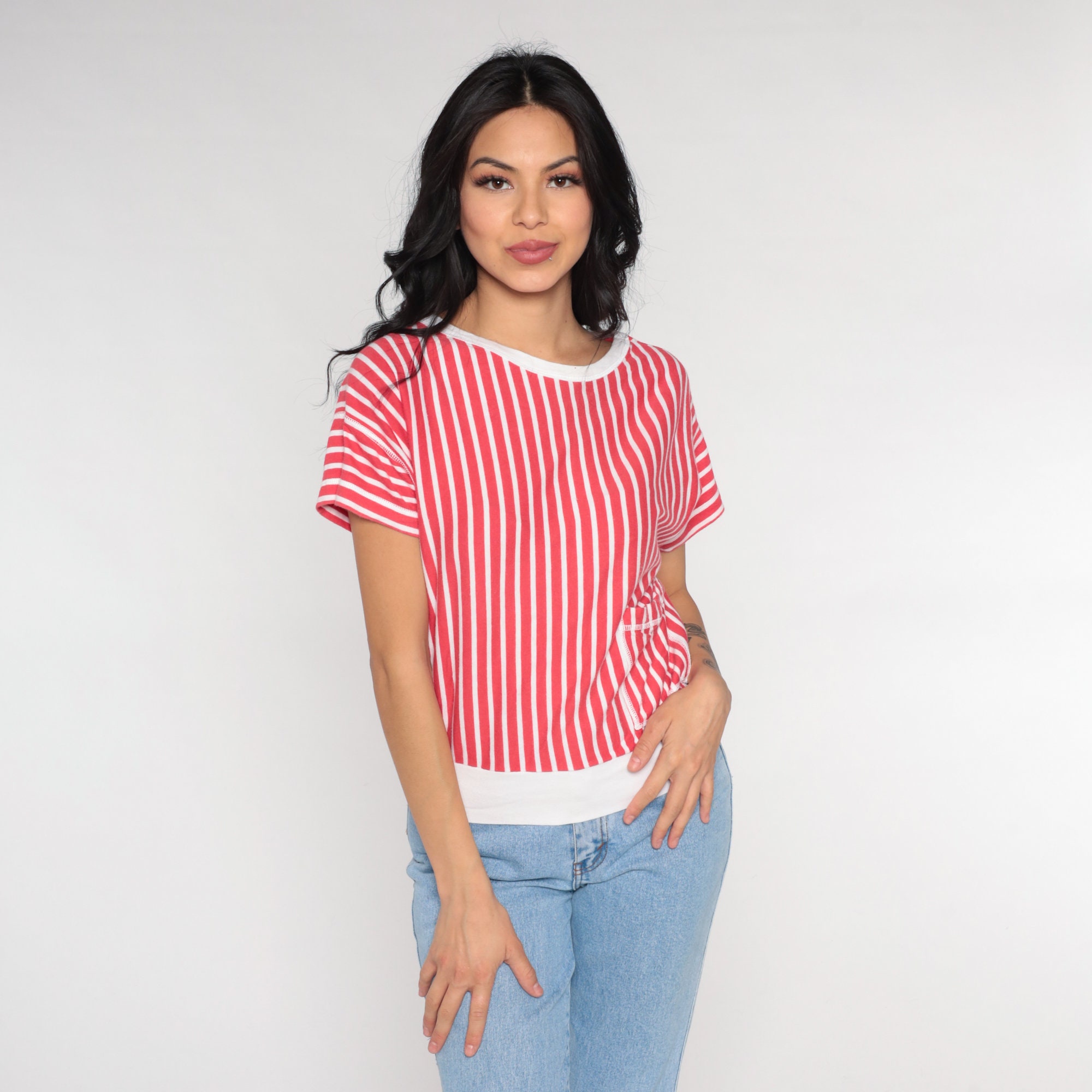 Vintage 90s top in red and white stripes with a pocket and a slouchy fit.