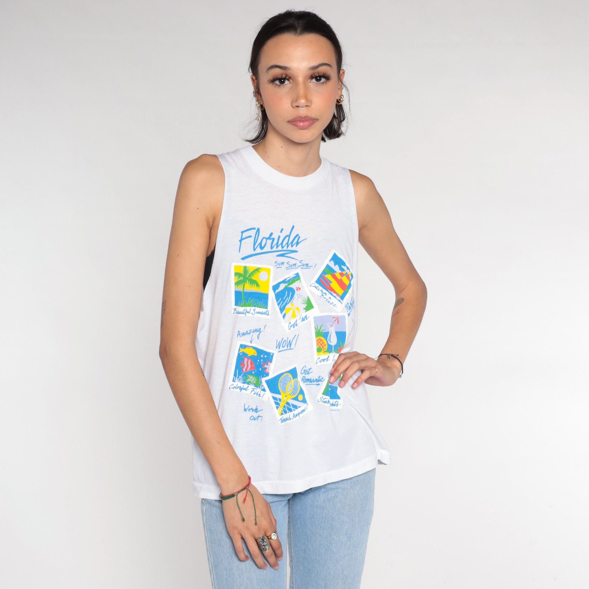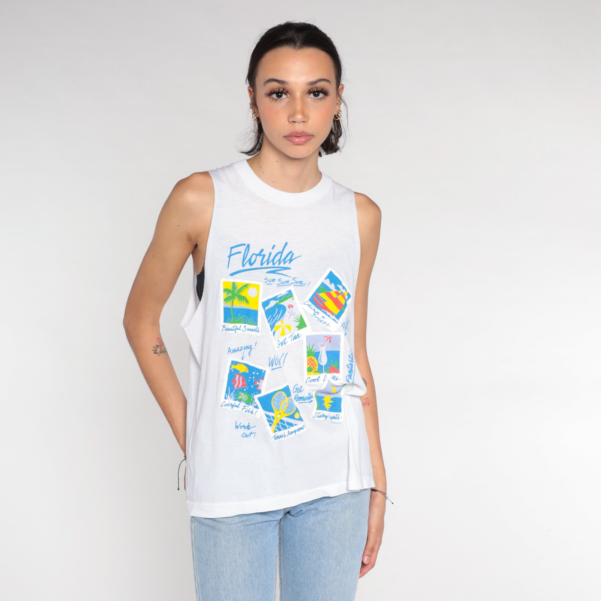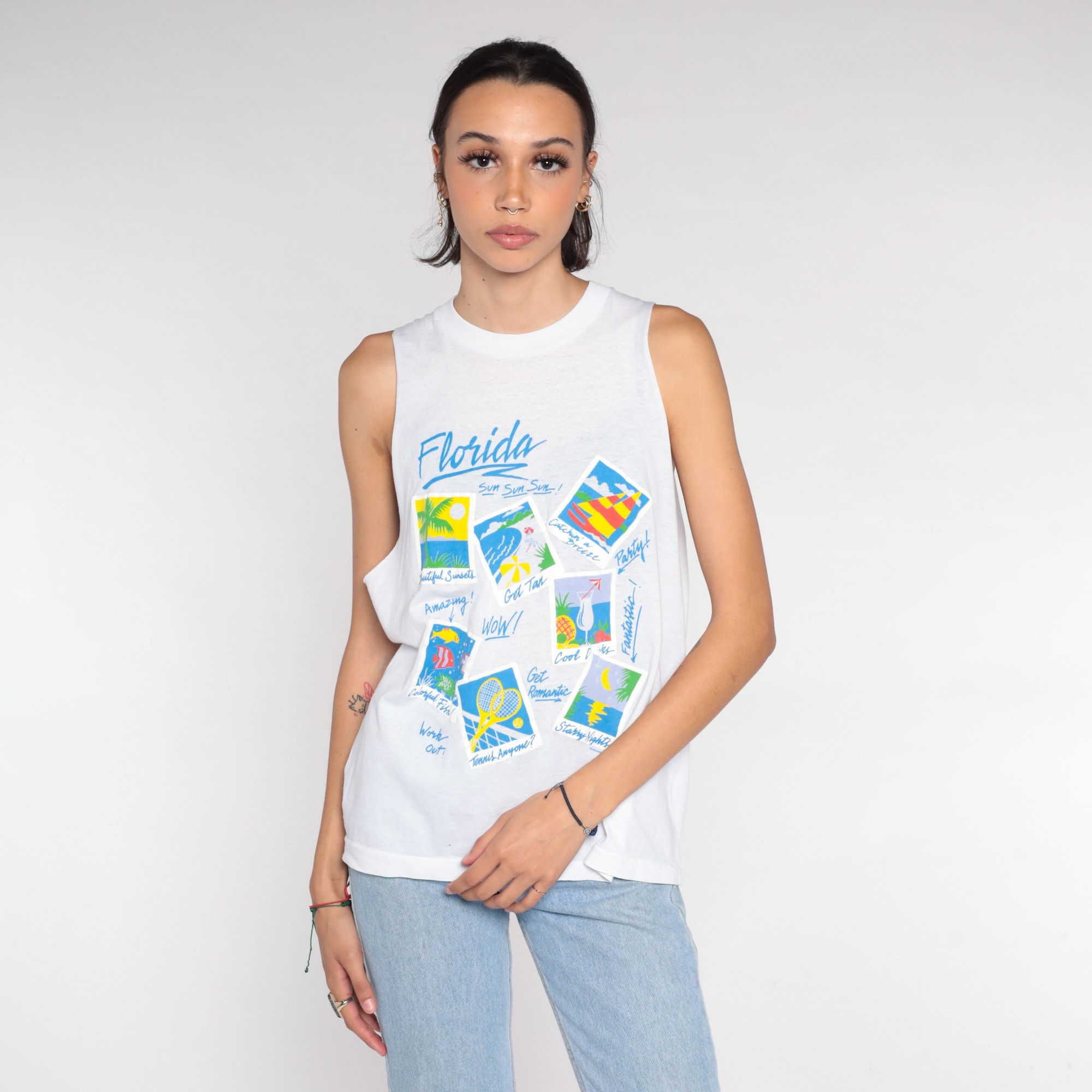 Vintage 90s tank top in white with a Florida vacation print on the front. Muscle tank cut, raw armholes.