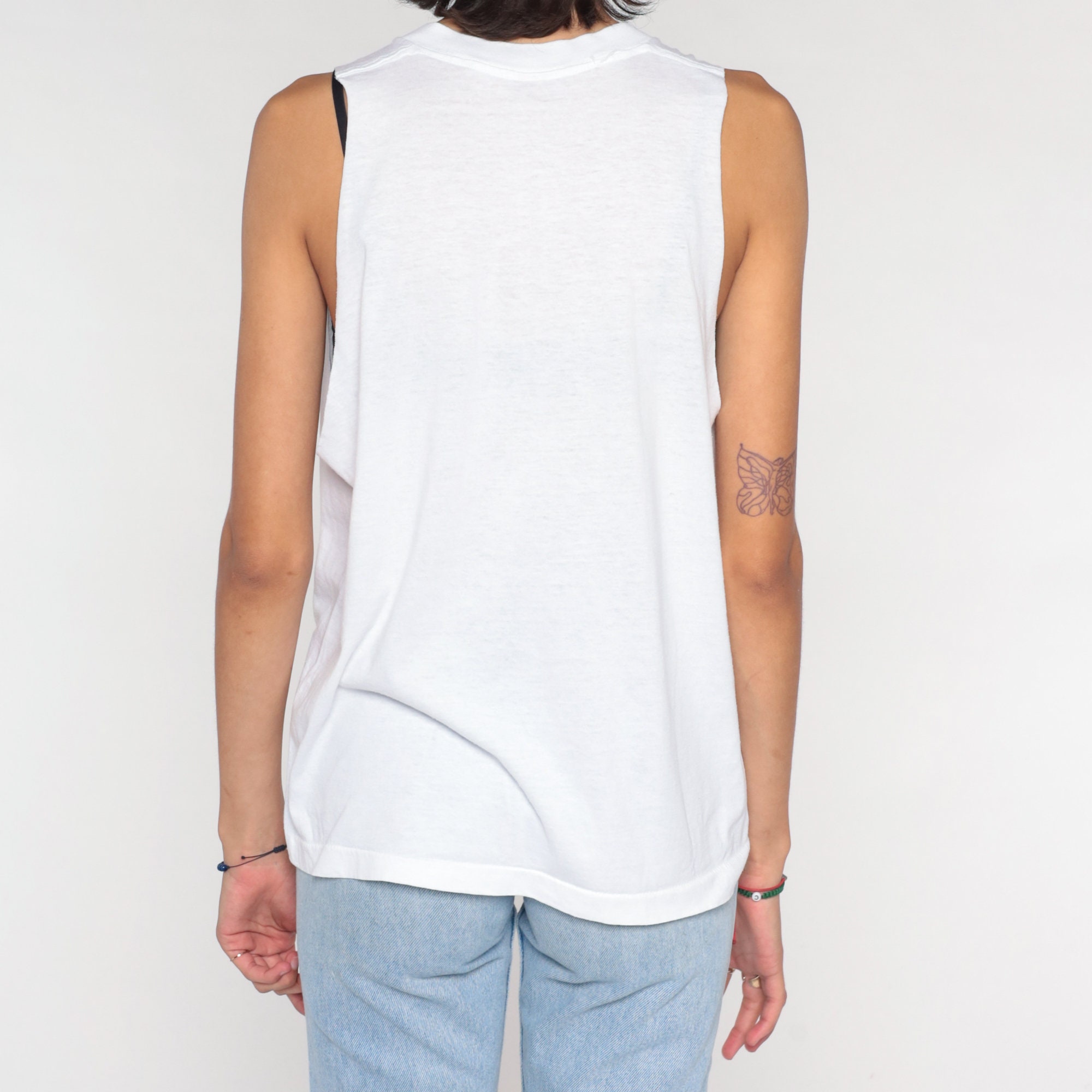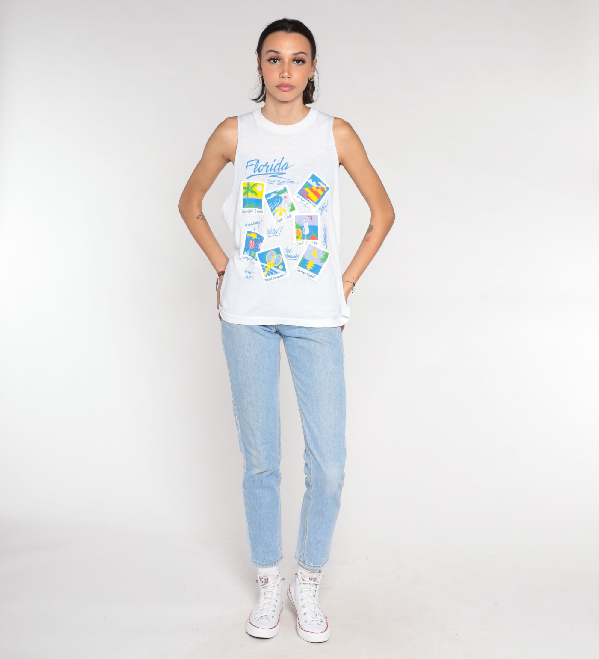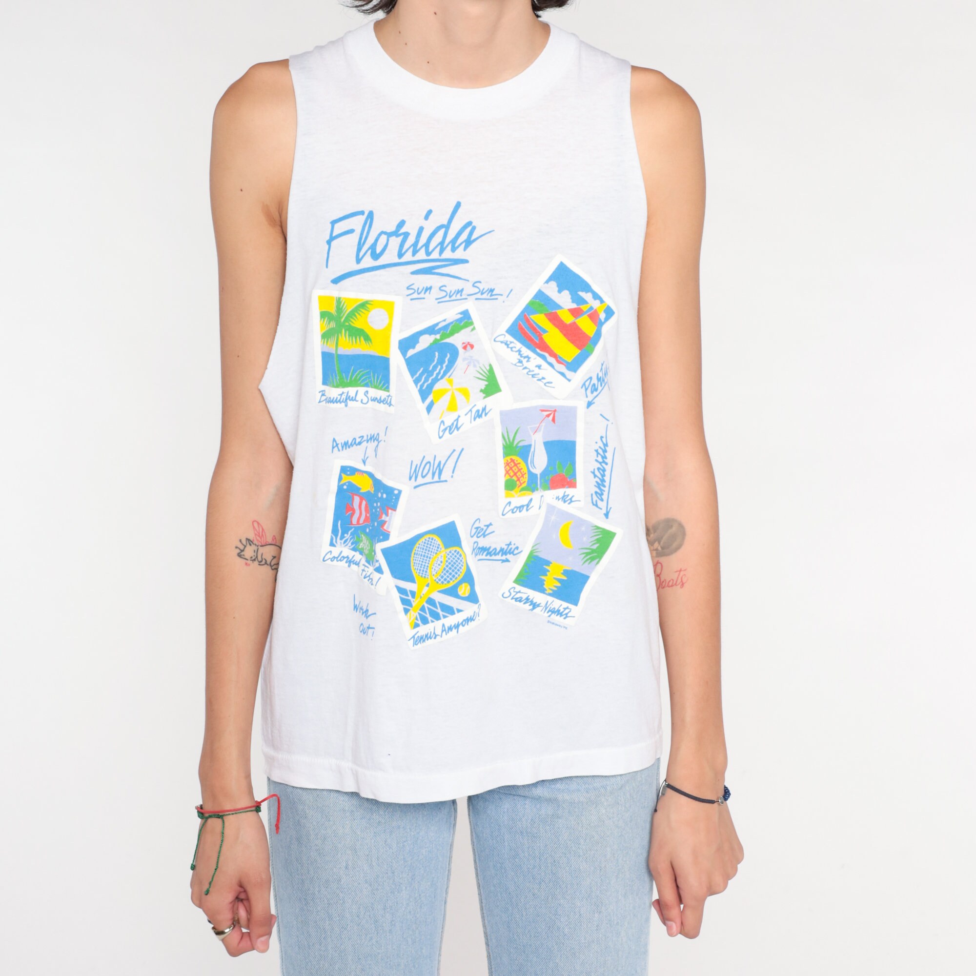 Vintage 90s tank top in white with a Florida vacation print on the front. Muscle tank cut, raw armholes.