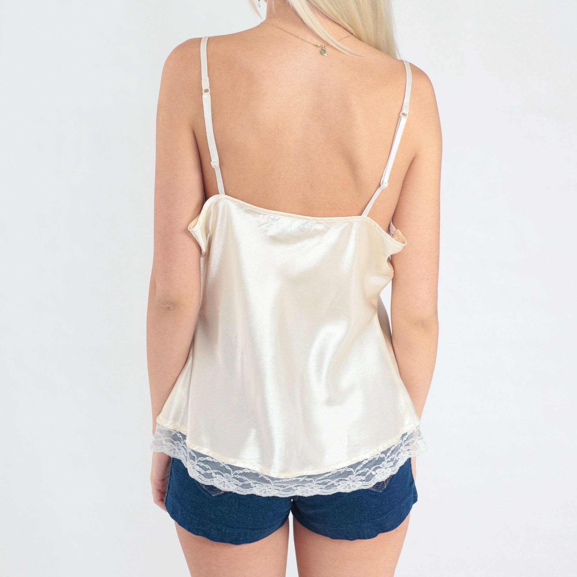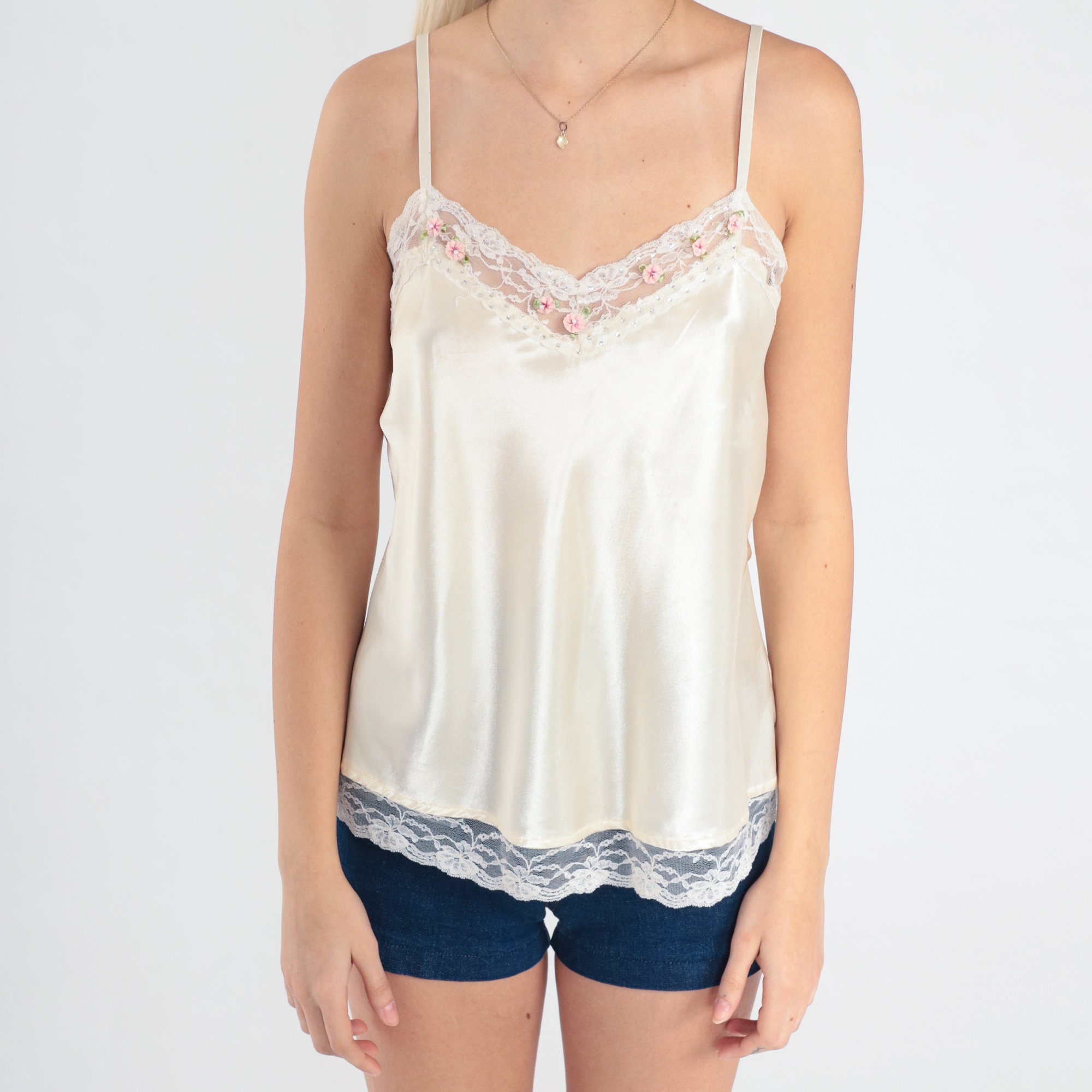 Vintage 00s camisole tank top in white satin with flowers, rhinestones and lace trim.