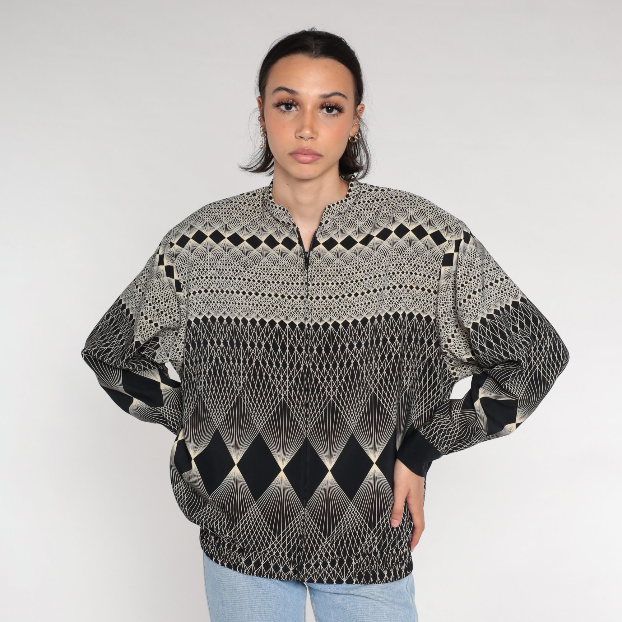 Vintage 80s jacket in a black and white Geometric print. Zips up the front.