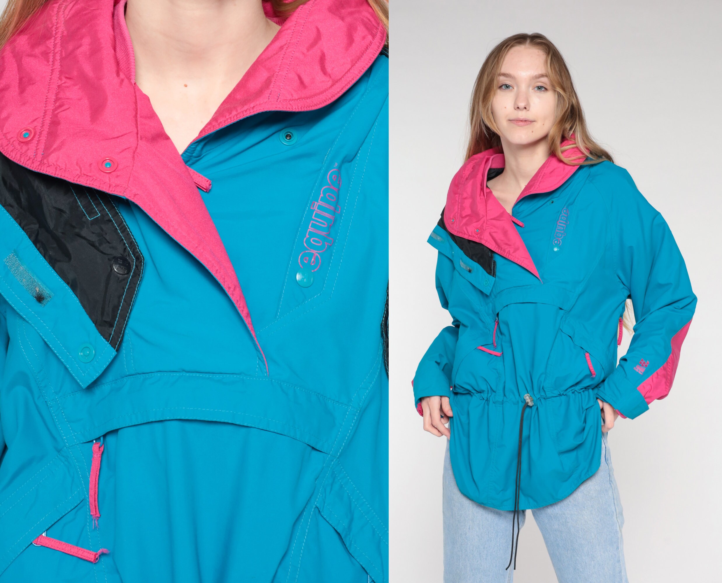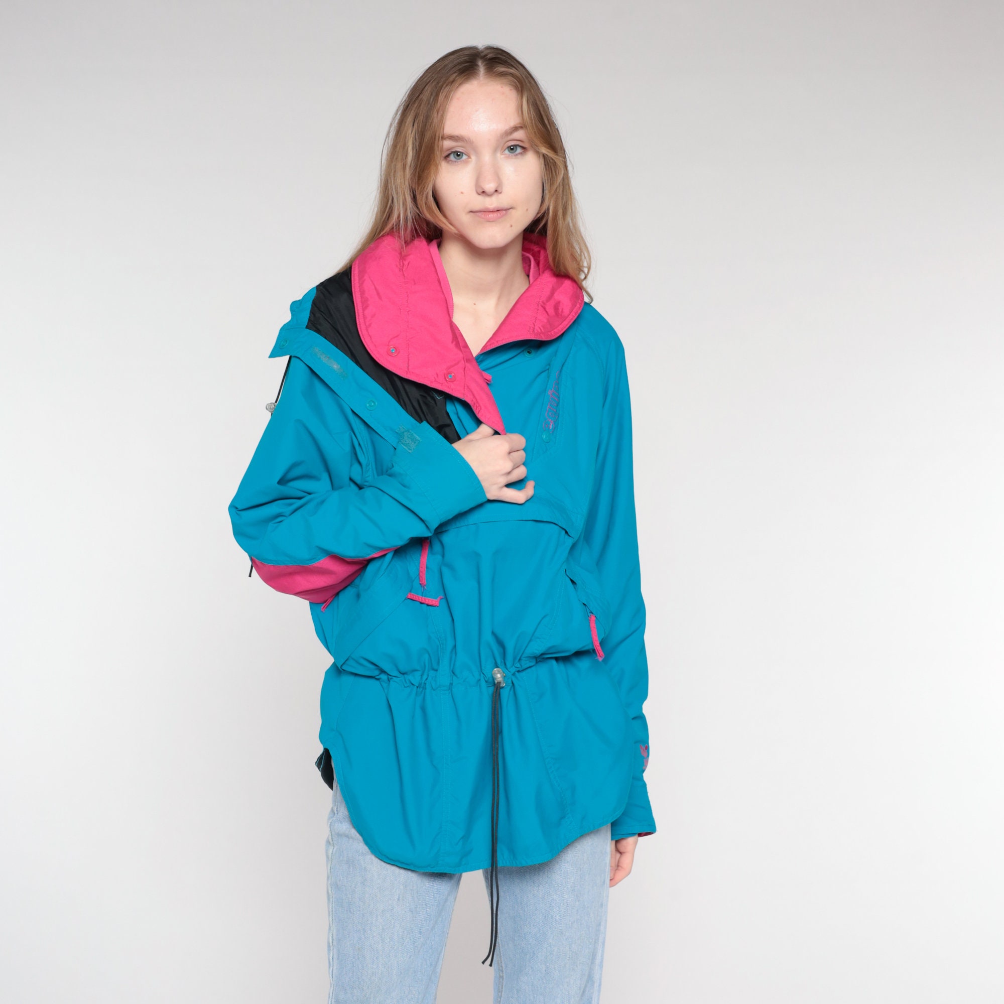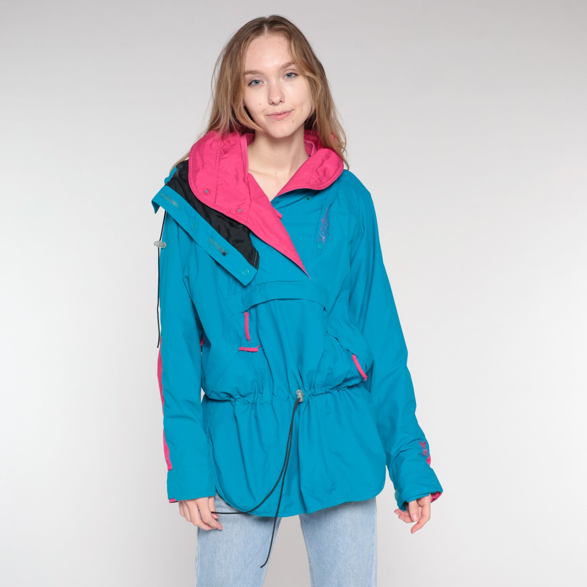 Vintage 80s hooded jacket in blue with pink trim. Pullover style with snaps at the chest, a drawstring waist, and a hood.