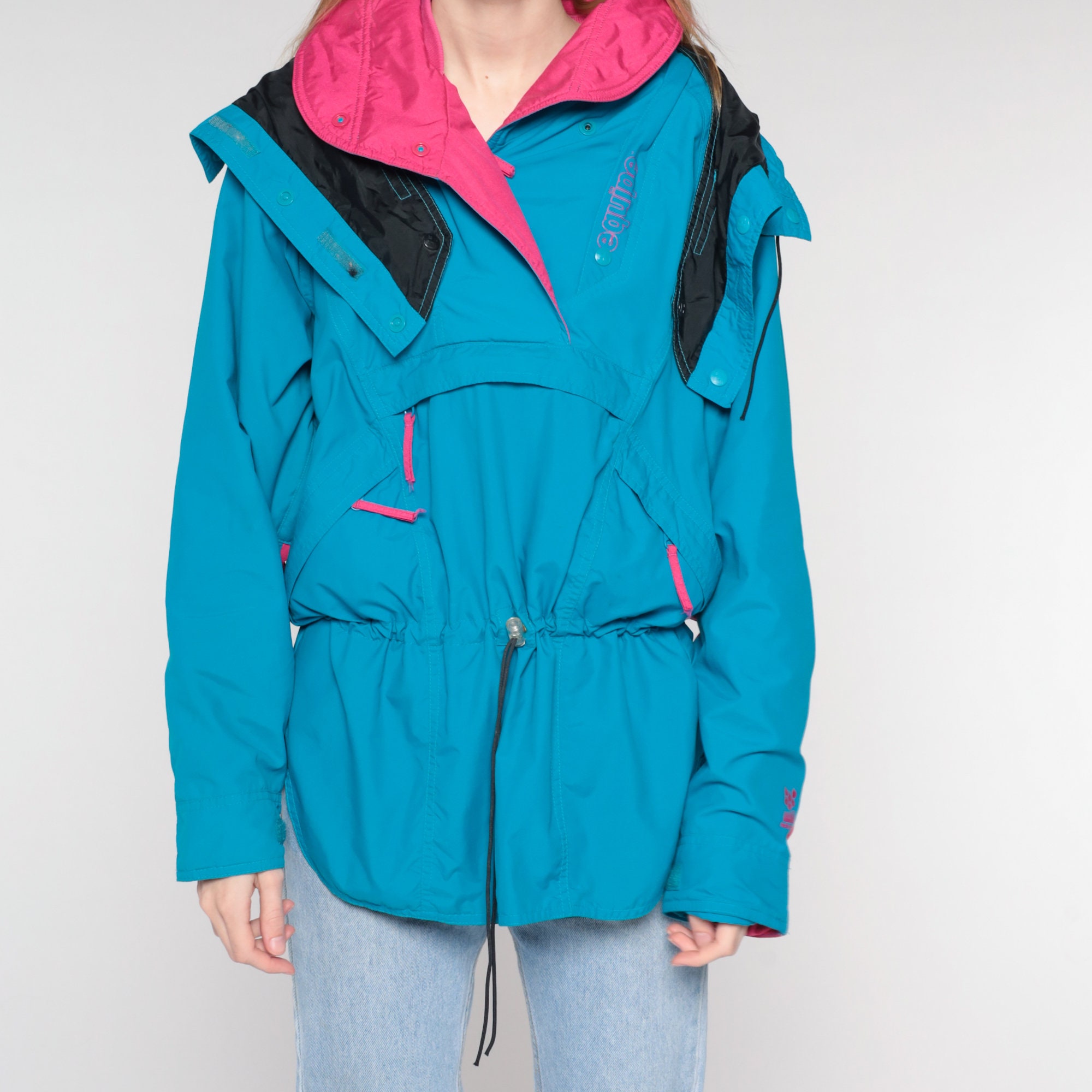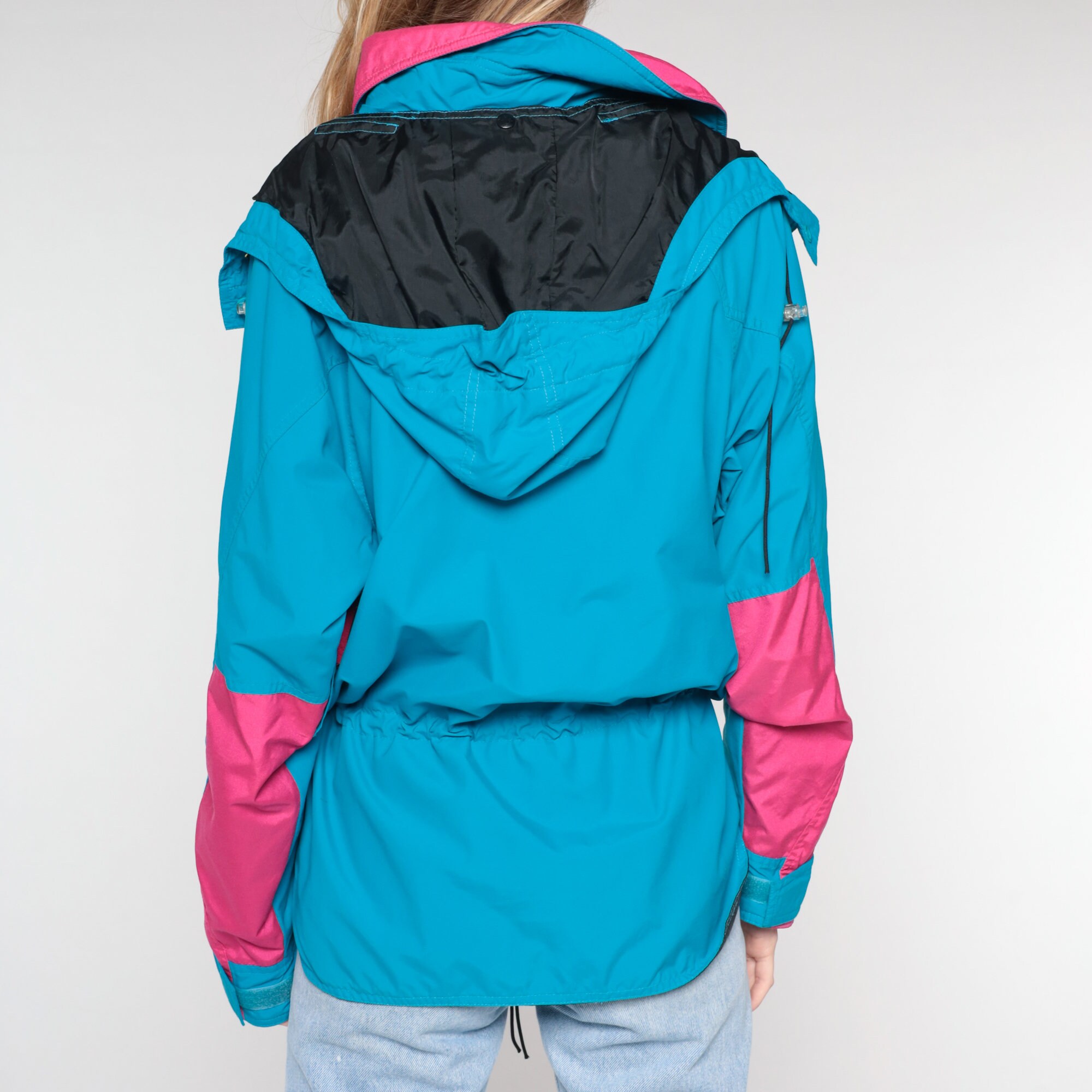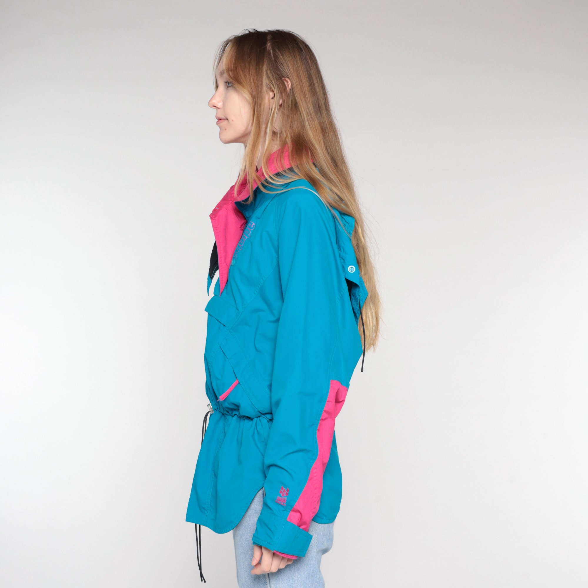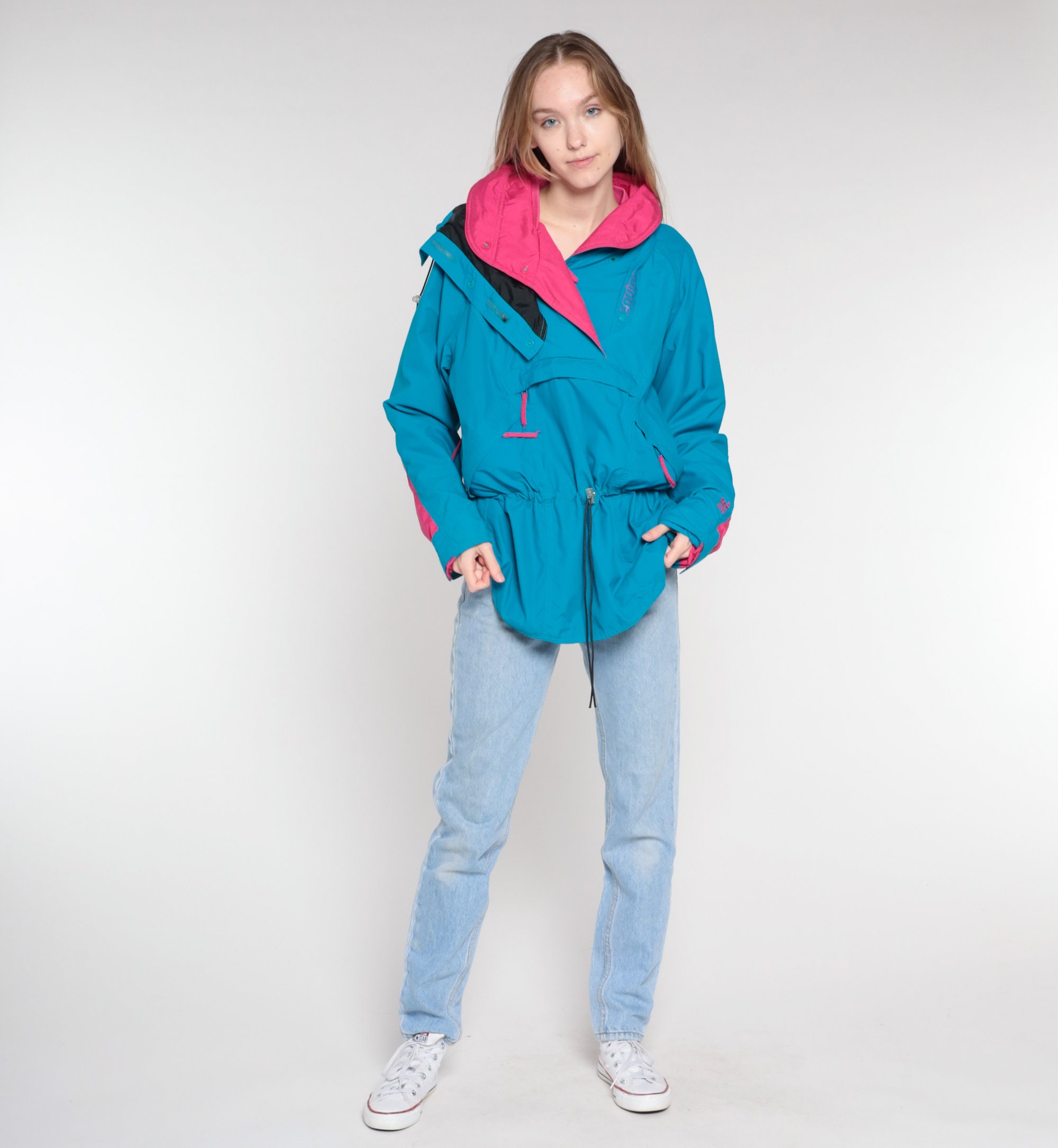 Vintage 80s hooded jacket in blue with pink trim. Pullover style with snaps at the chest, a drawstring waist, and a hood.
