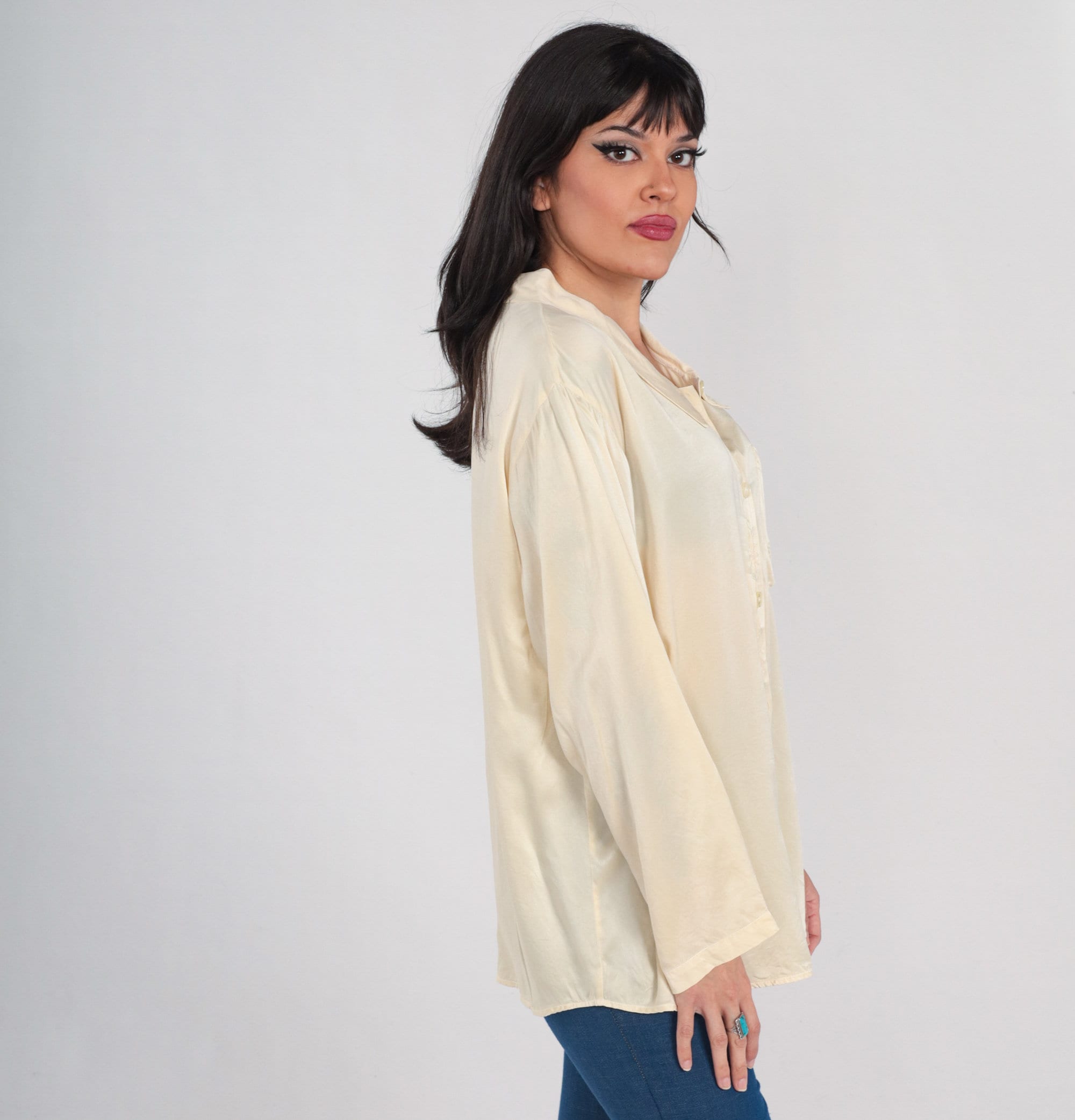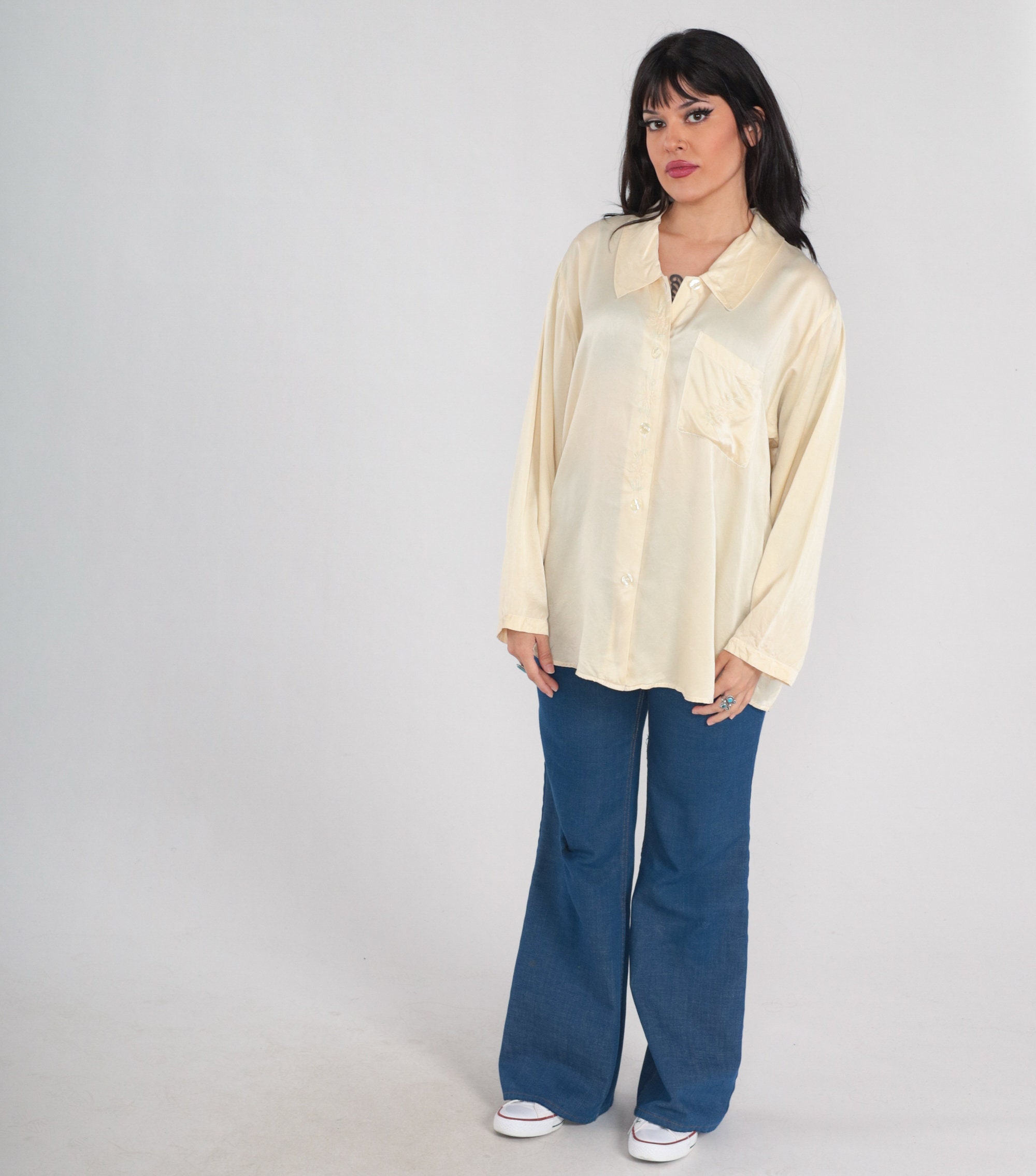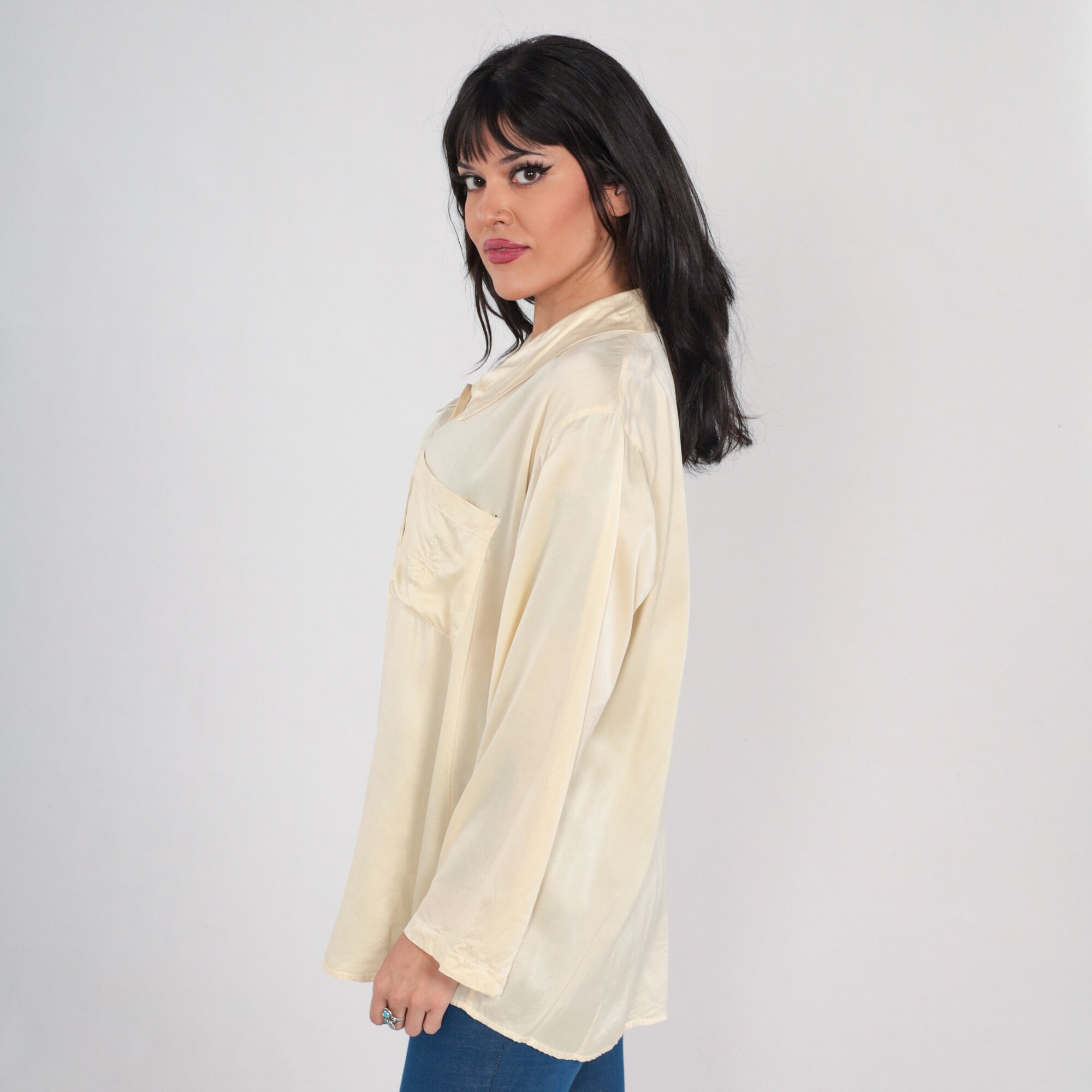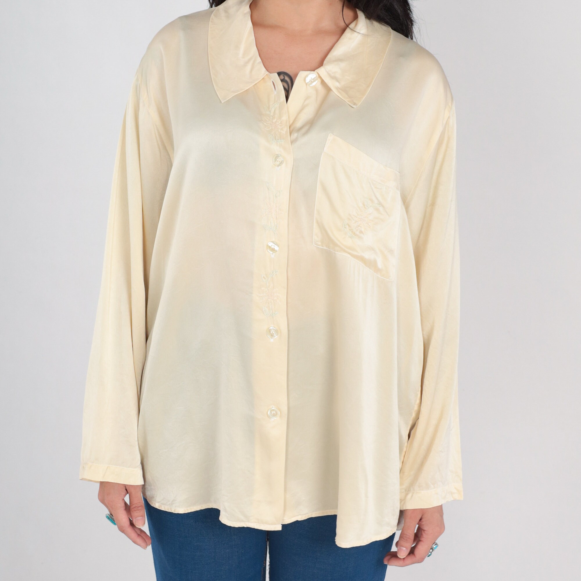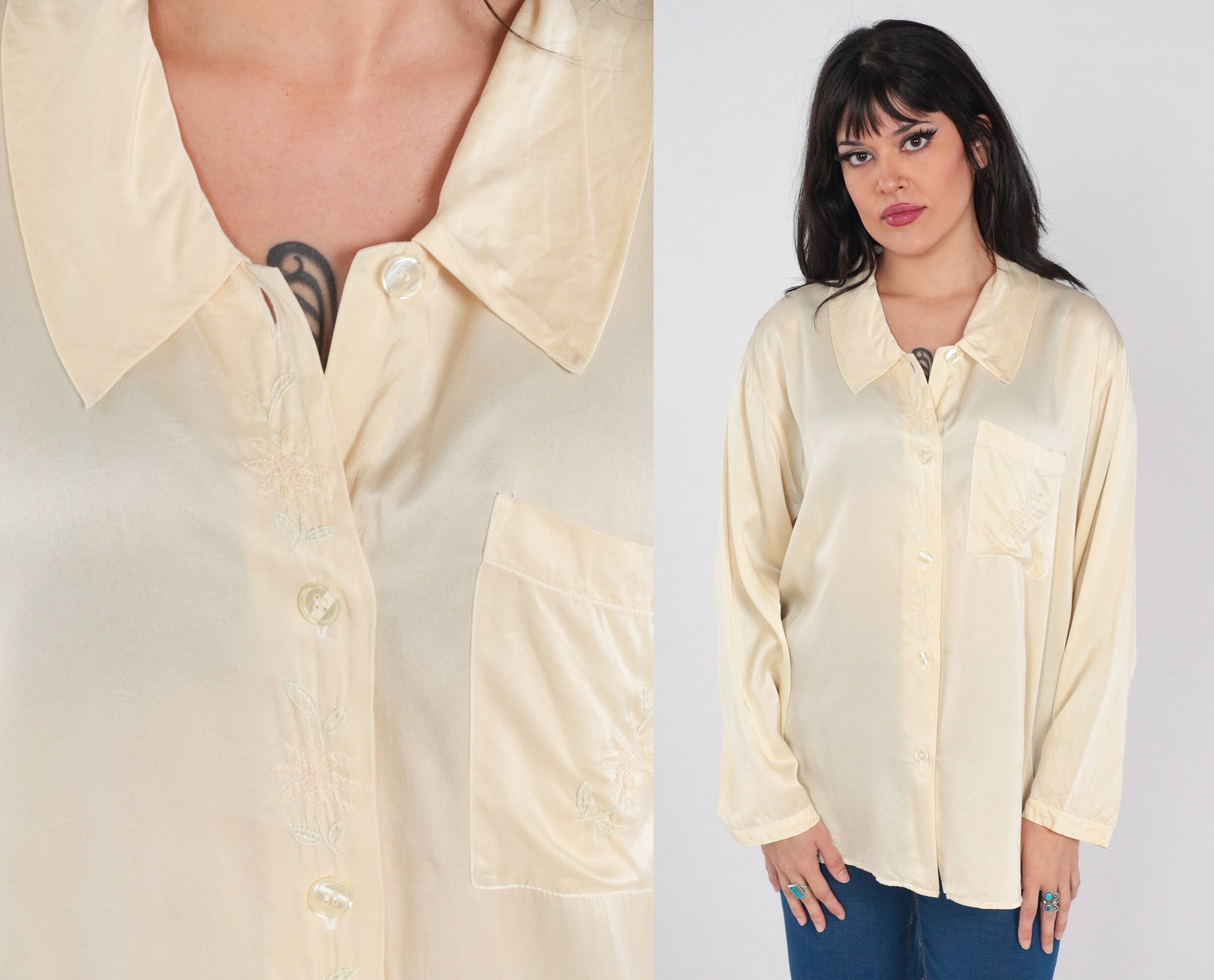 Vintage 90s blouse in cream silk with floral embroidery. It has long sleeves, a chest pocket, and buttons up the front.