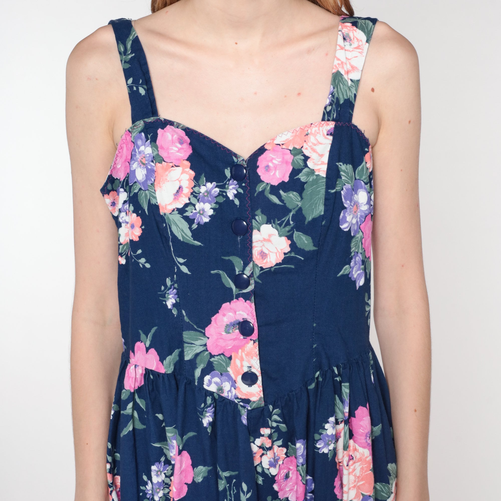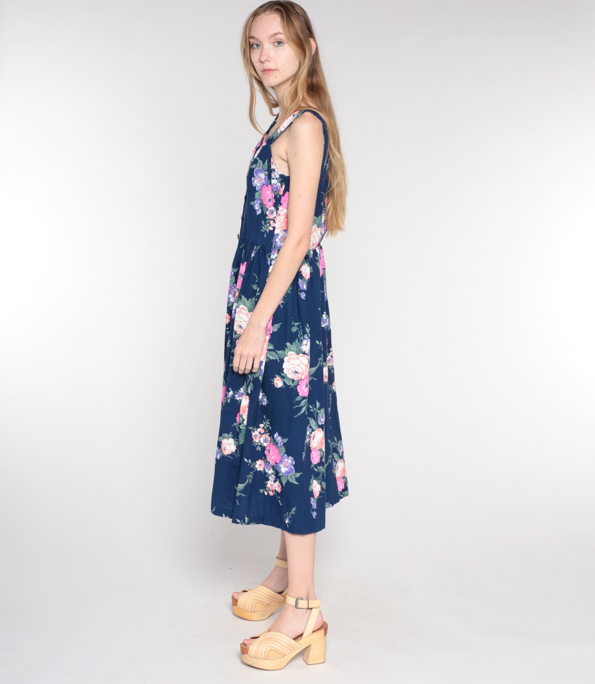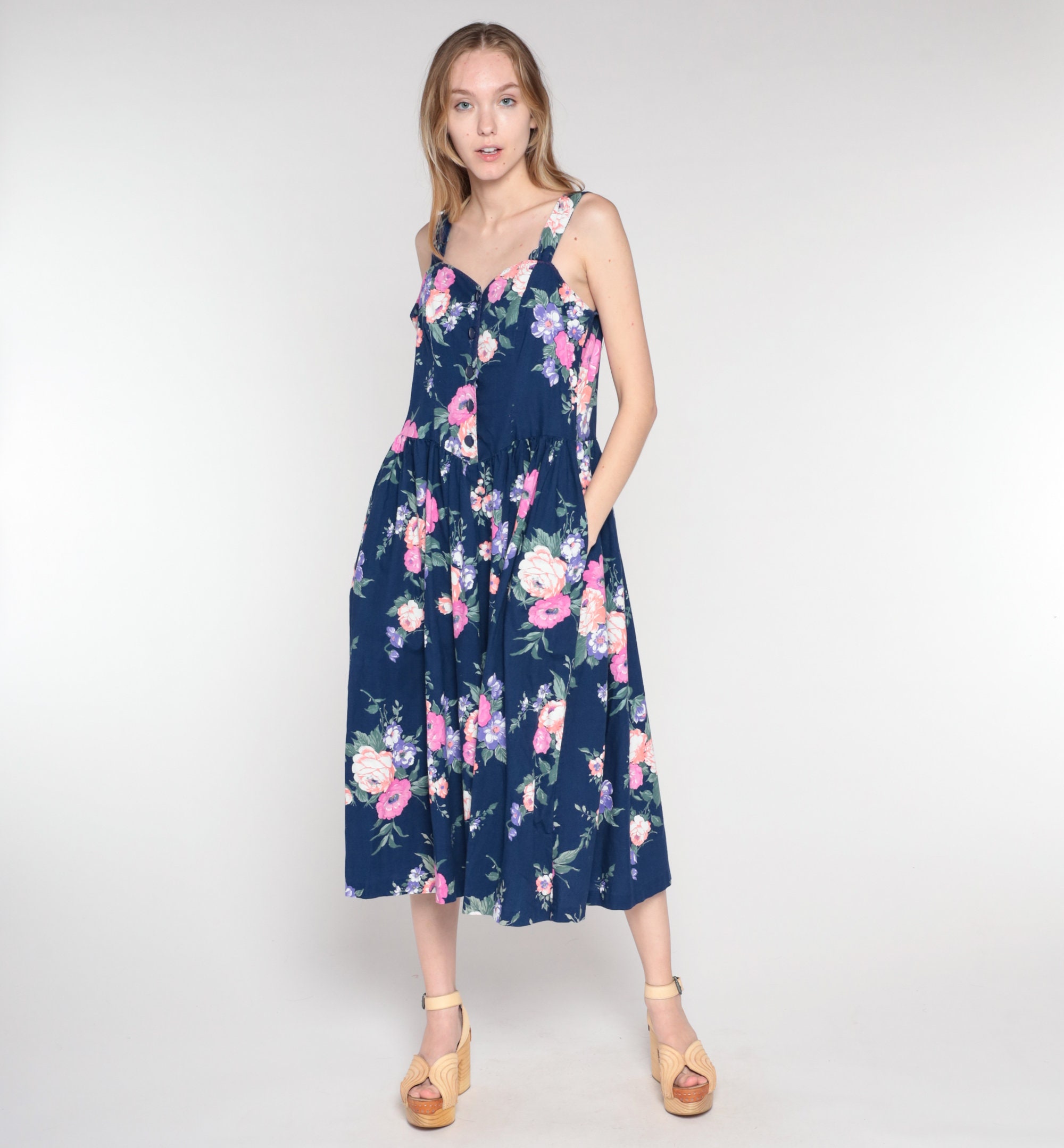 Vintage 80s dress in navy blue with a floral print. Sleeveless with a sweetheart neckline and buttons up the chest. Midi length.