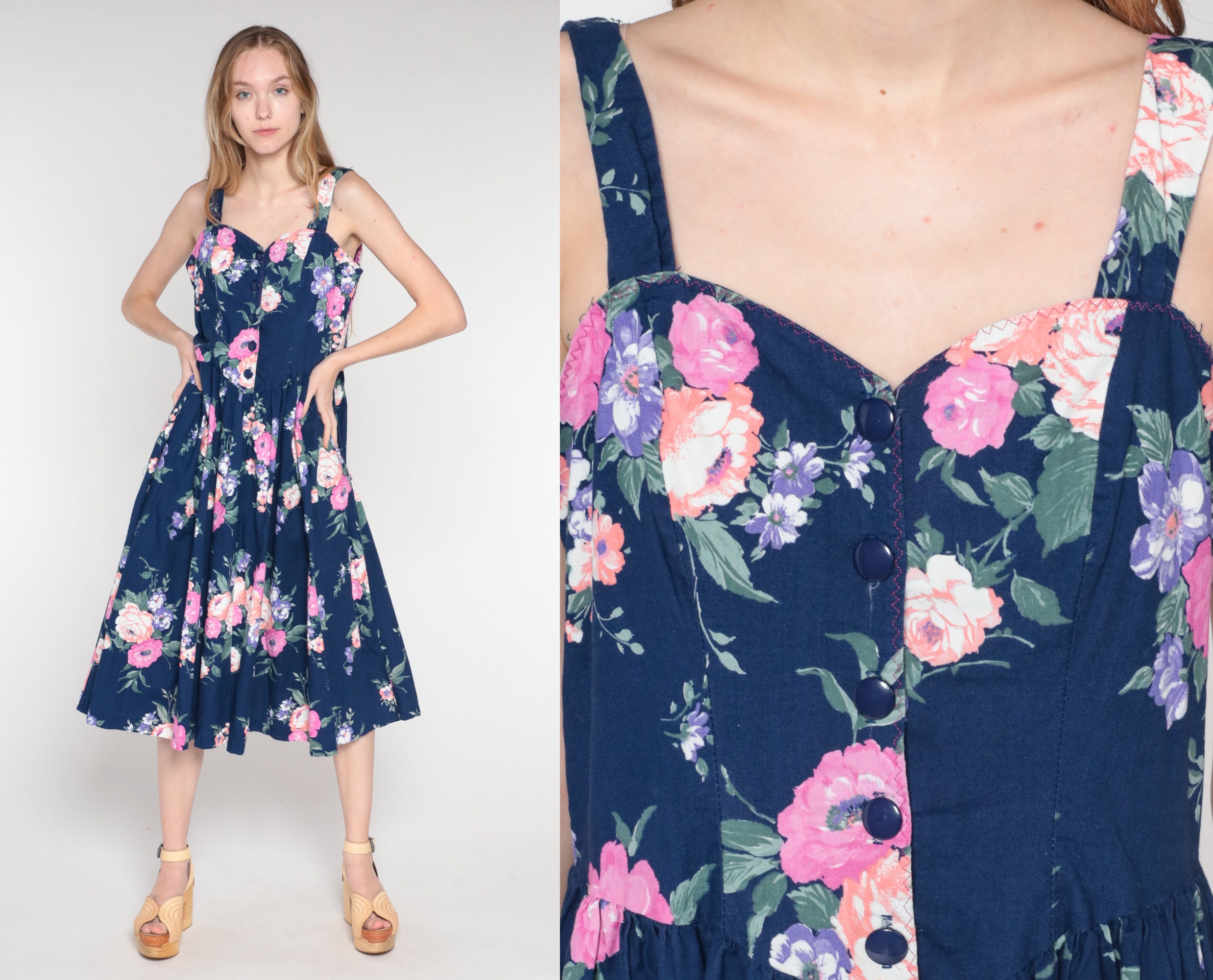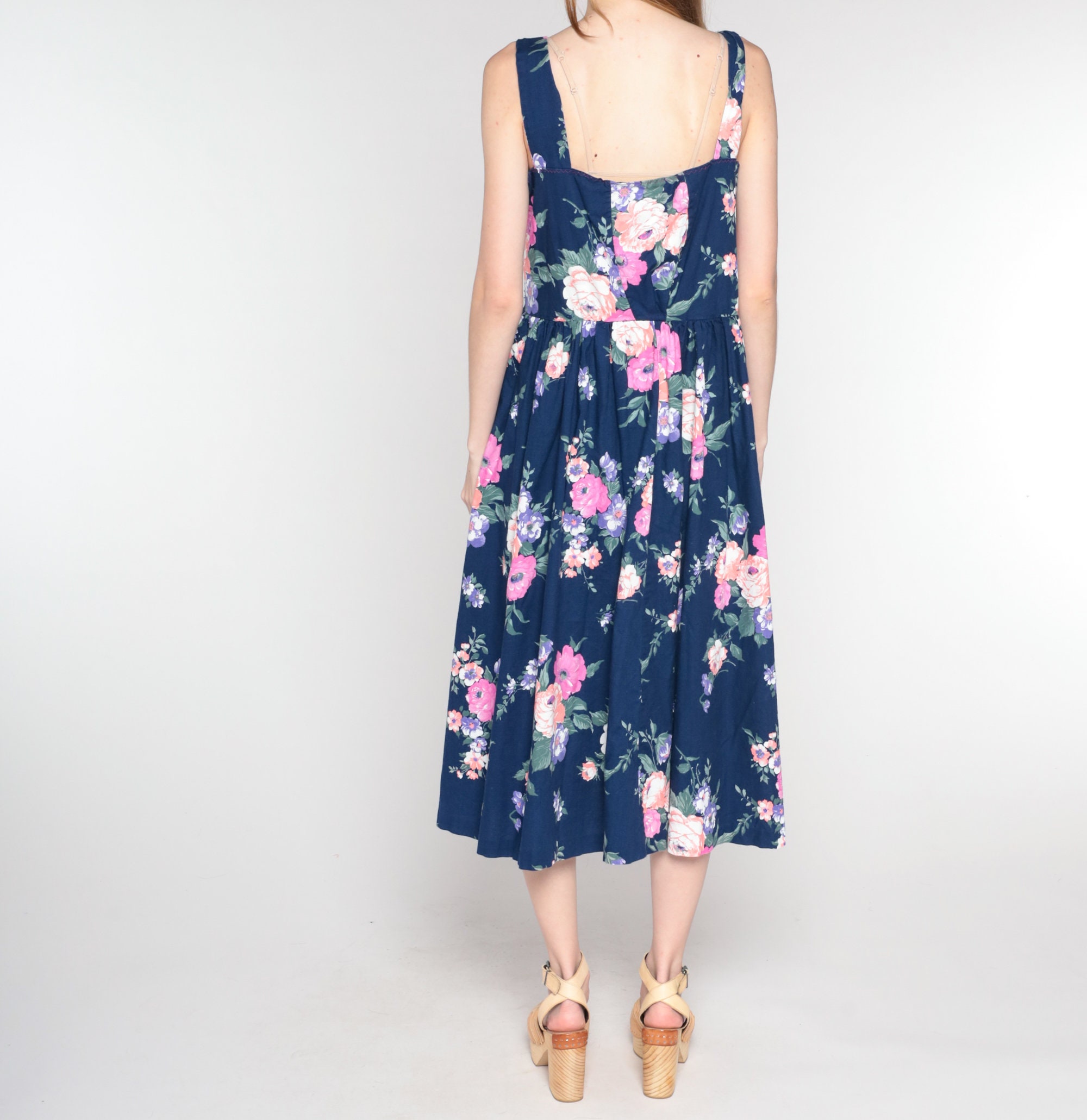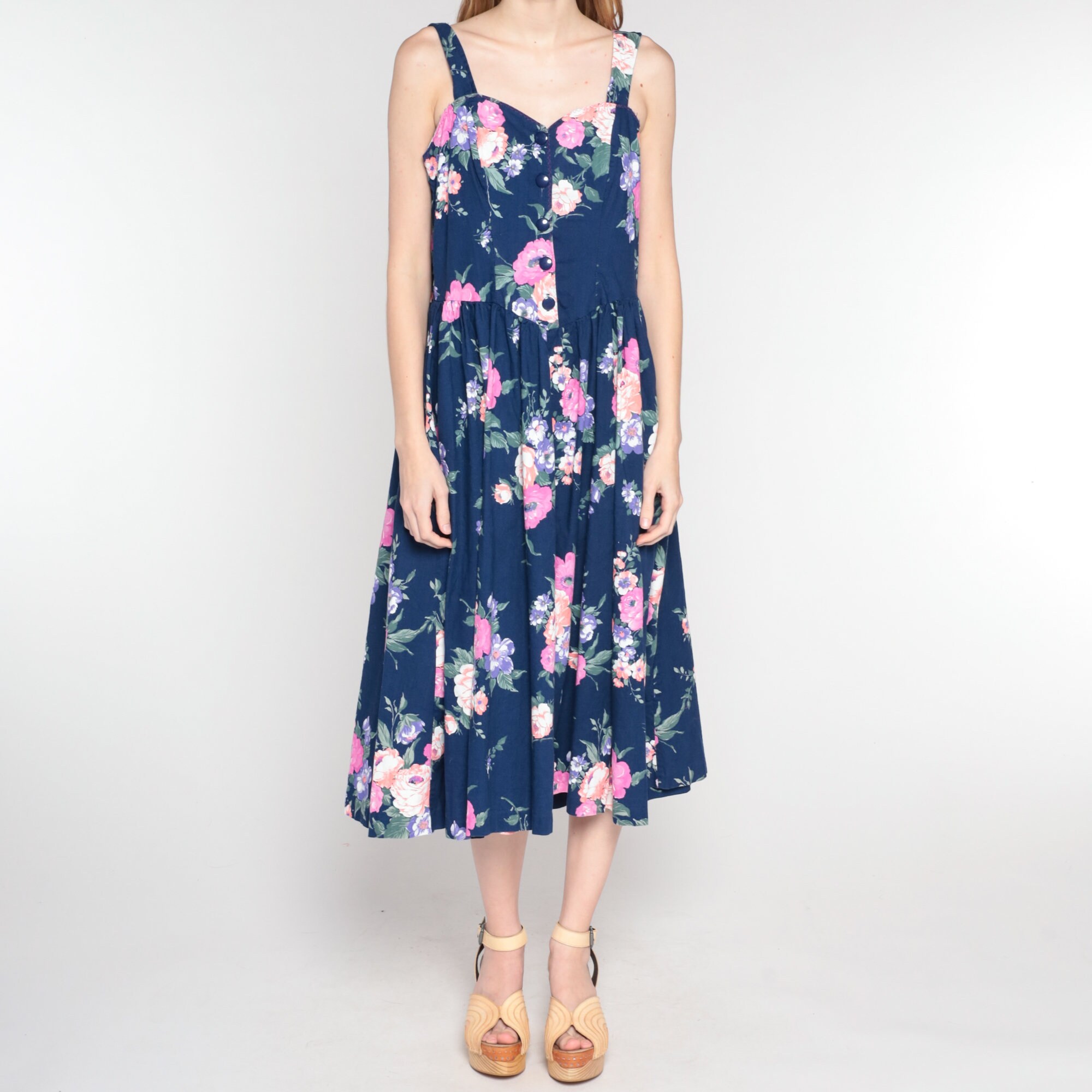 Vintage 80s dress in navy blue with a floral print. Sleeveless with a sweetheart neckline and buttons up the chest. Midi length.