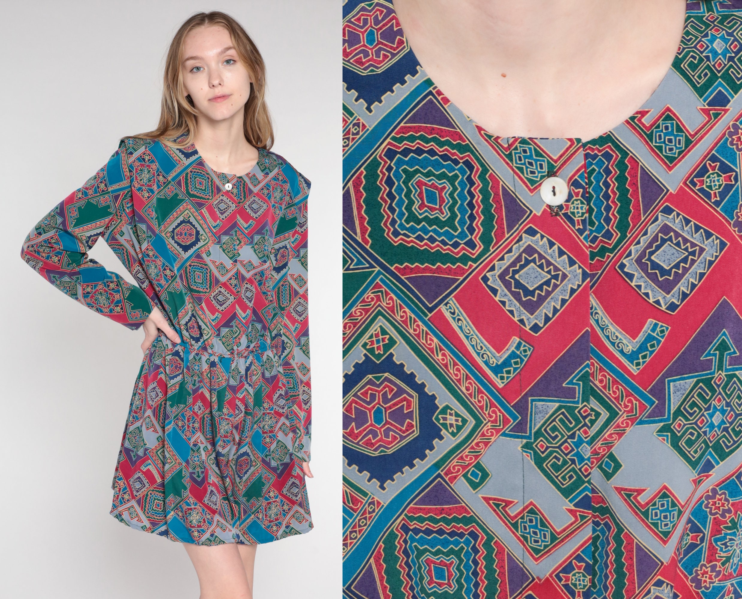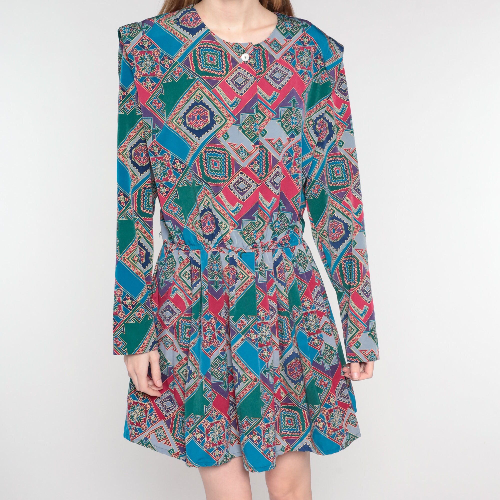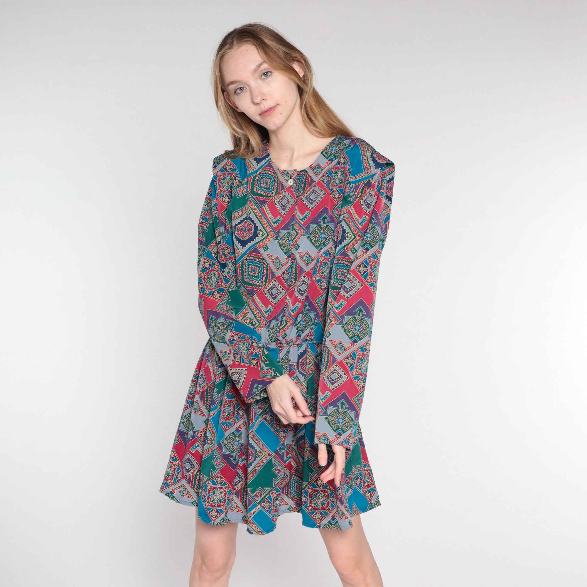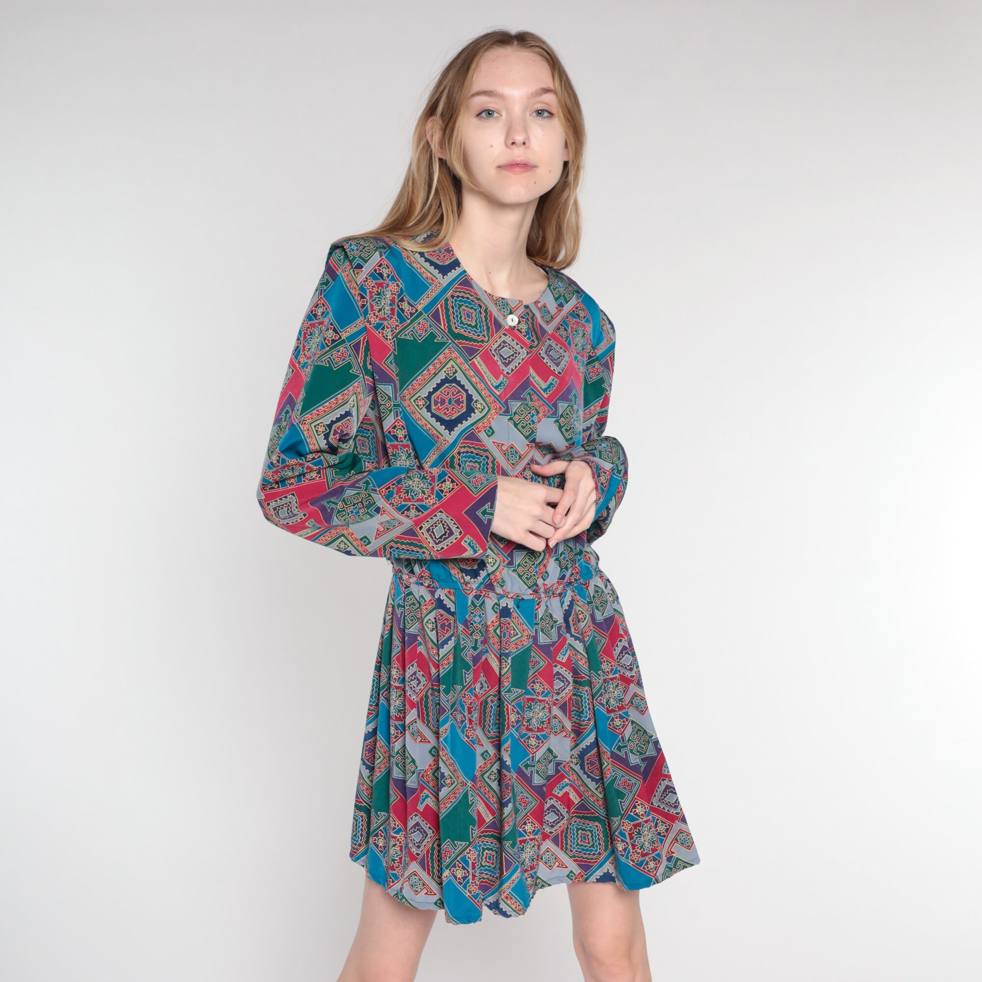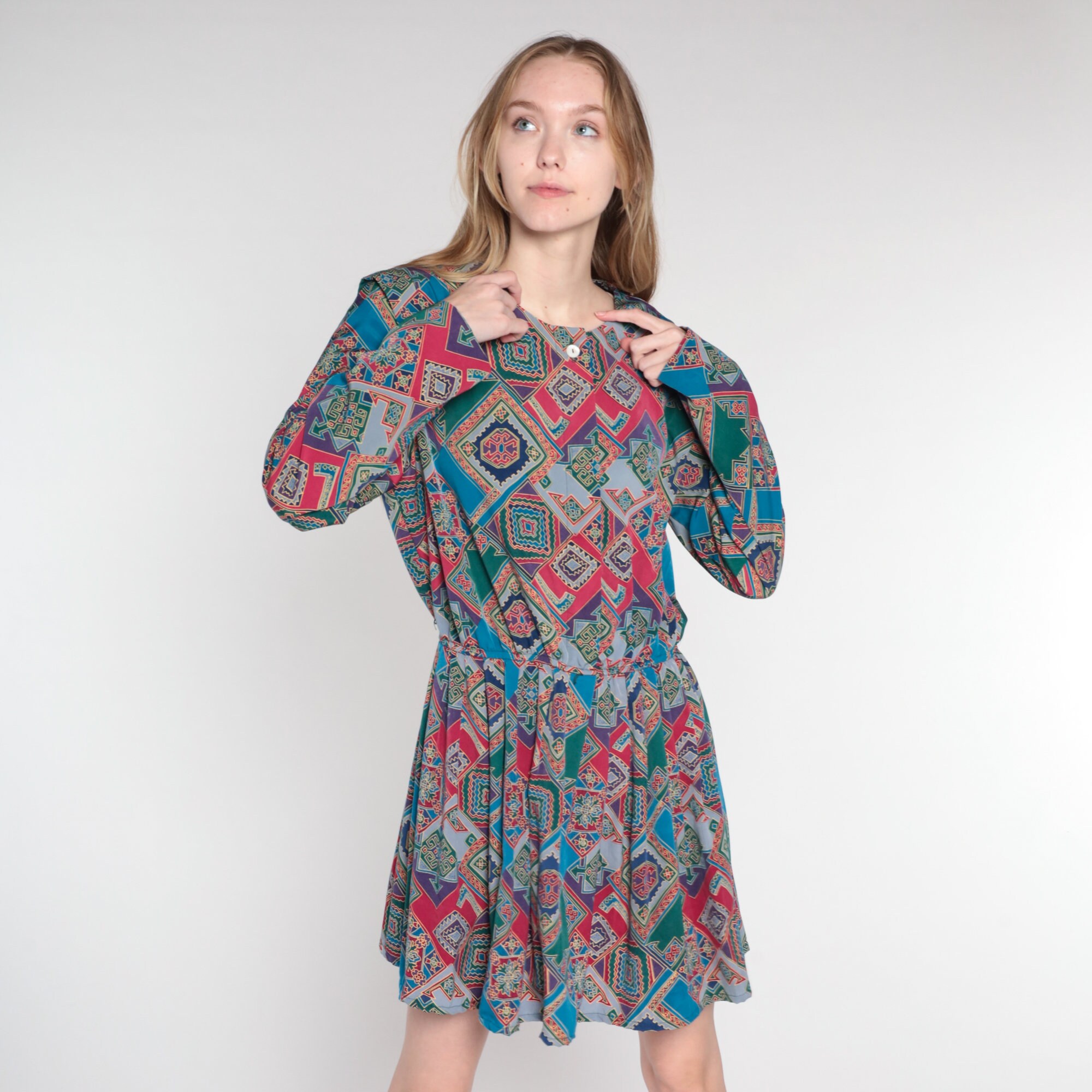 Vintage 80s dress with a colorful geometric print. It has long sleeves and a high waist with a button at the neckline. Mini length with a pleated skirt.