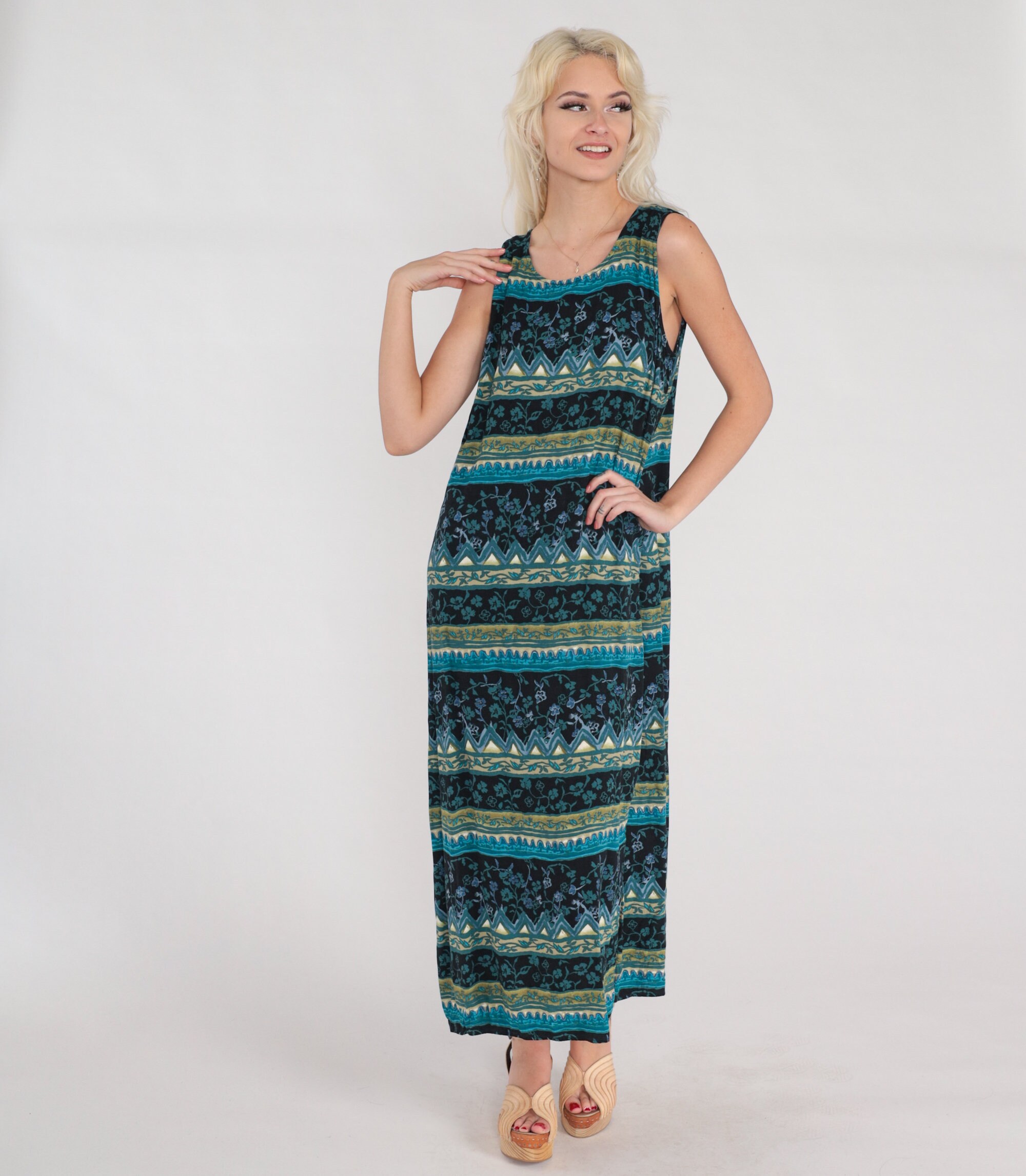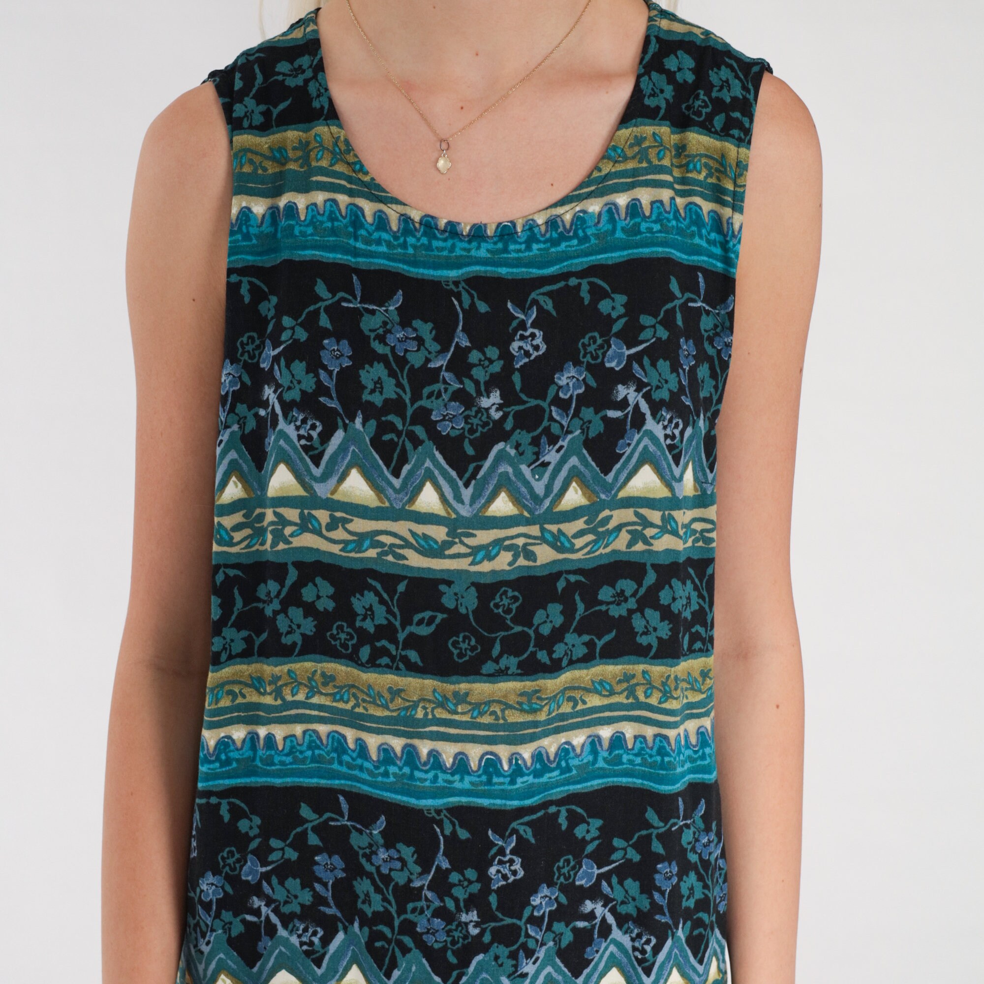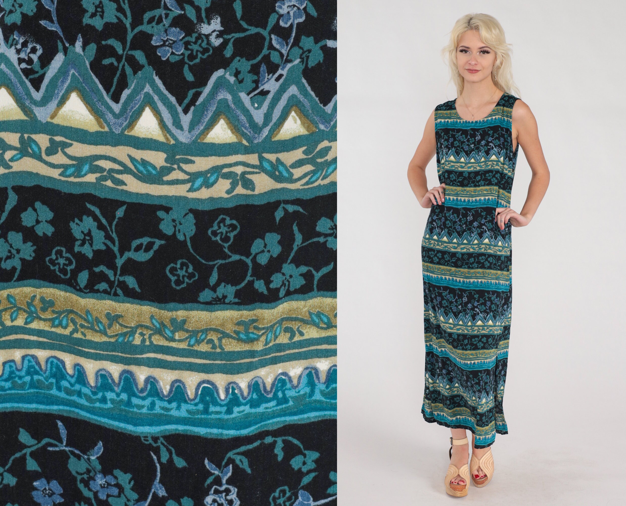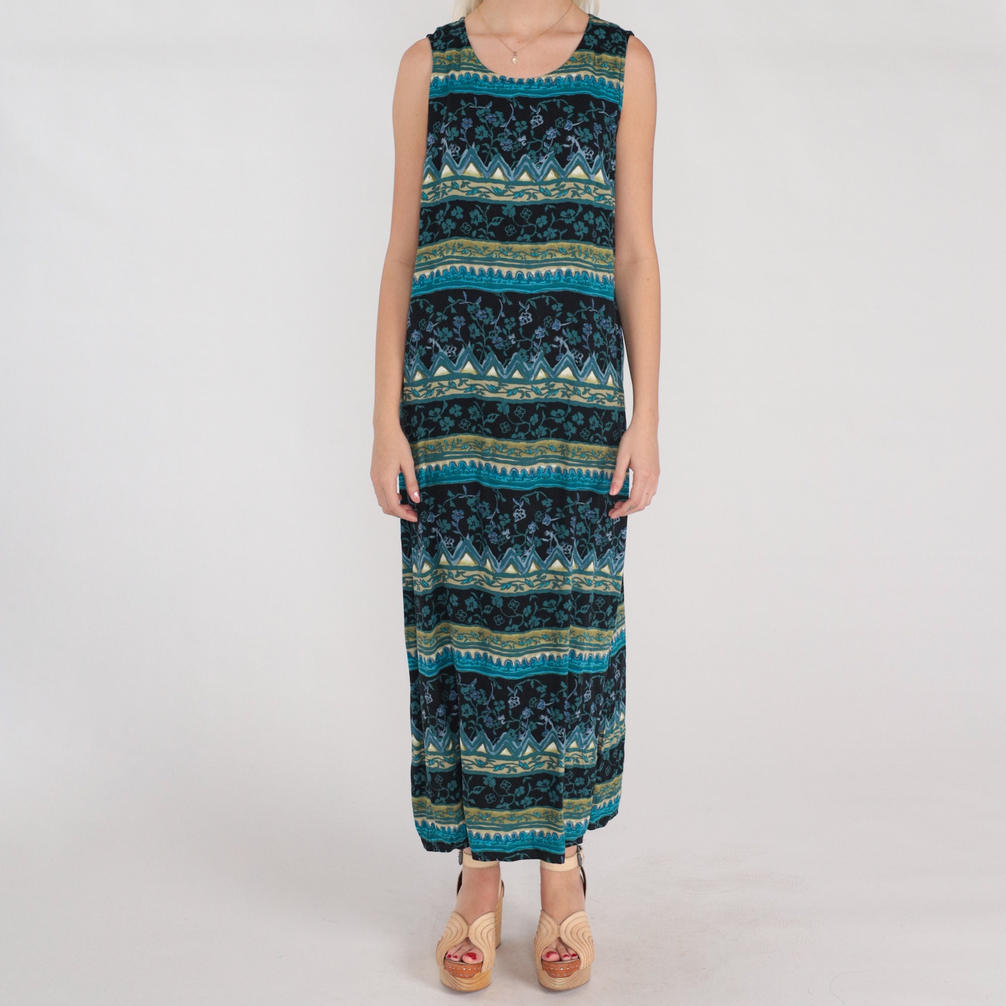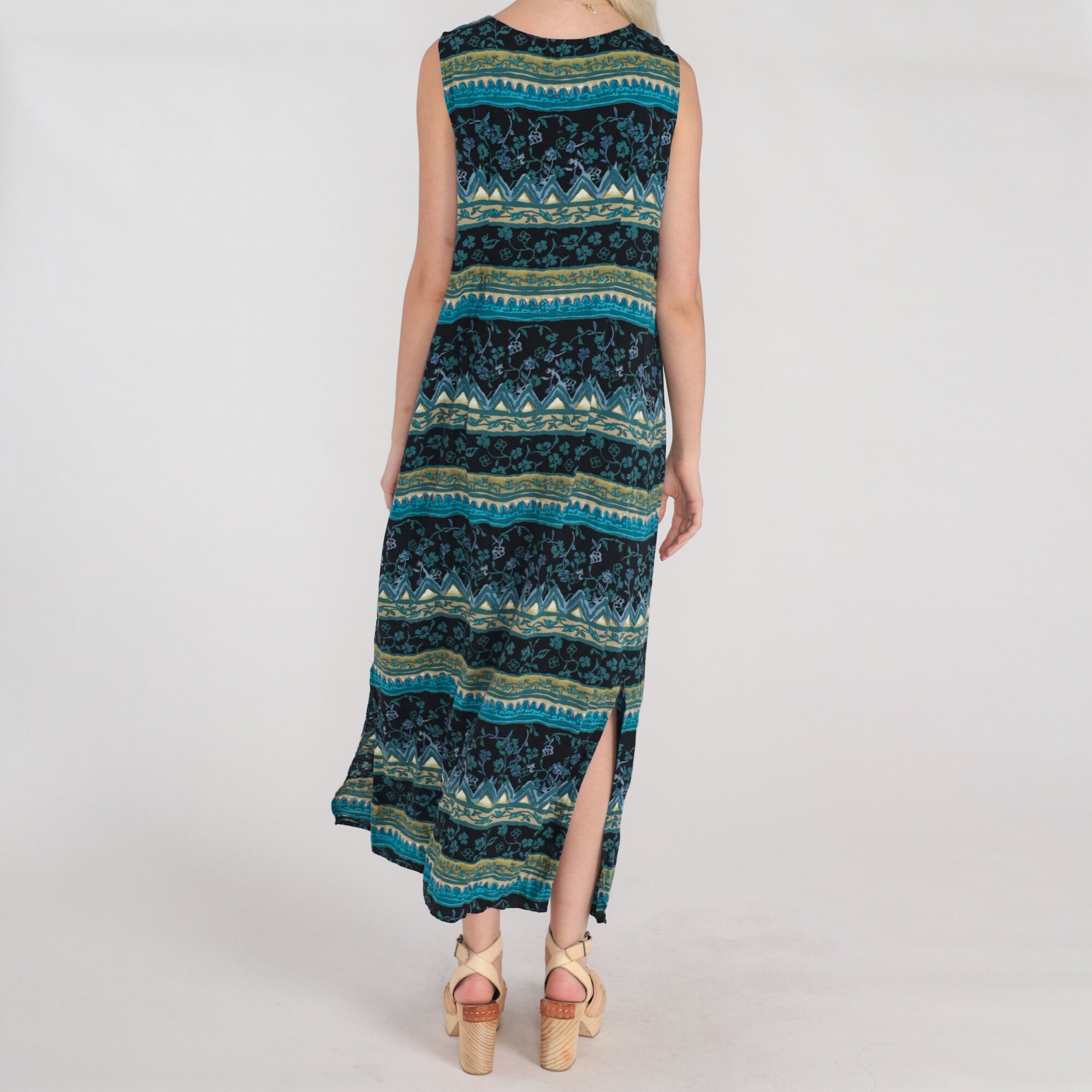 Vintage y2k dress in a striped floral print. Sleeveless with a shift cut and a side slit. Maxi length.