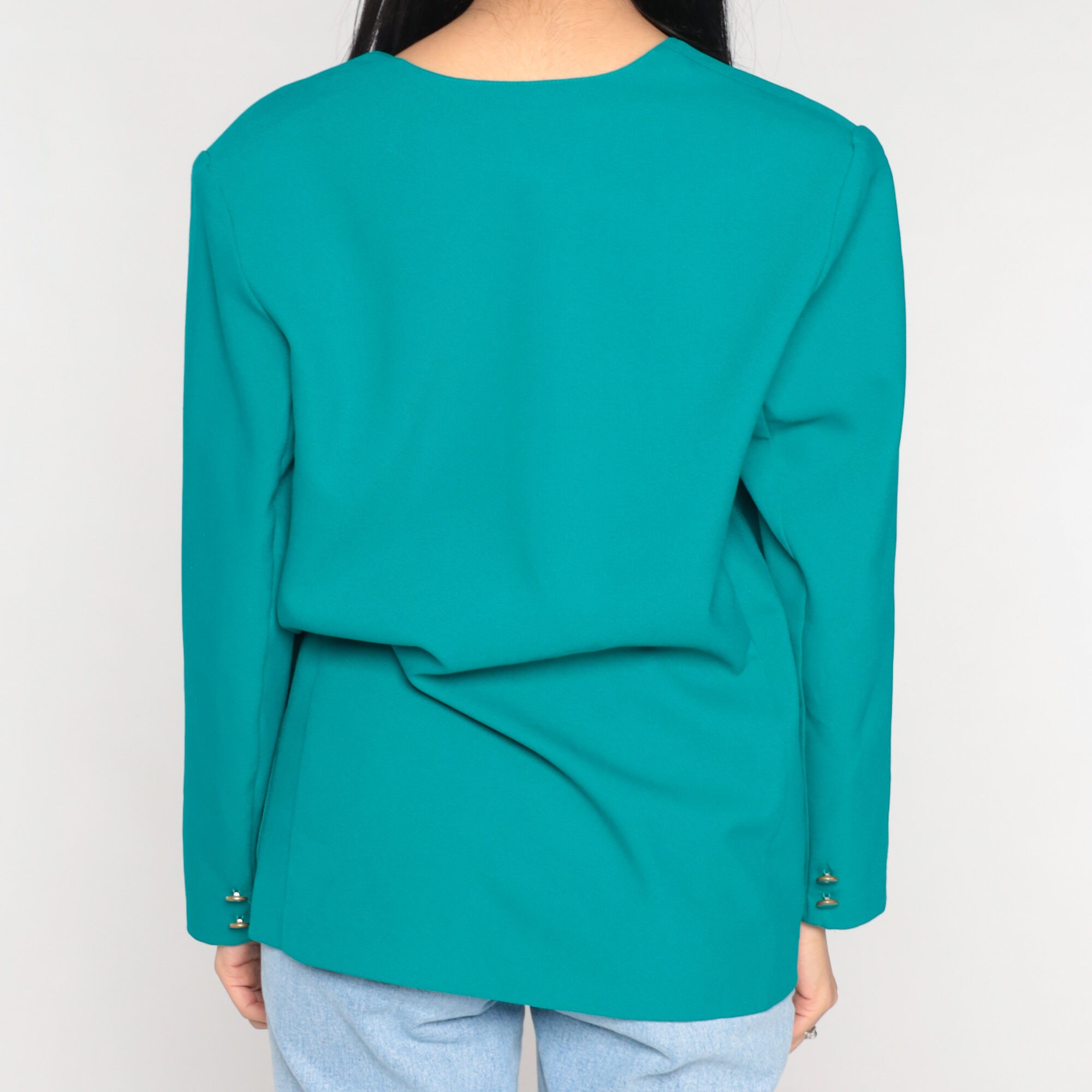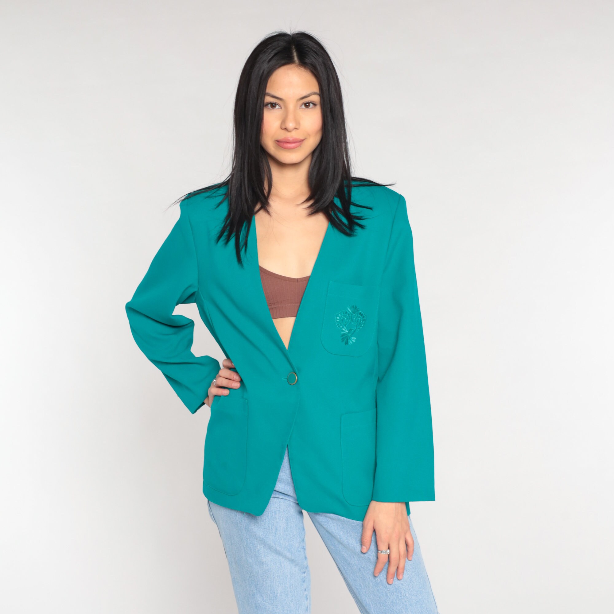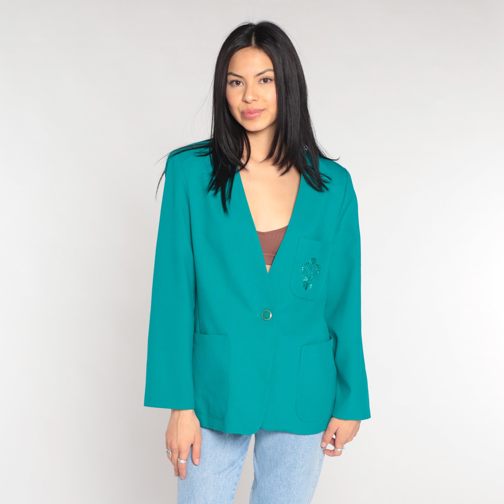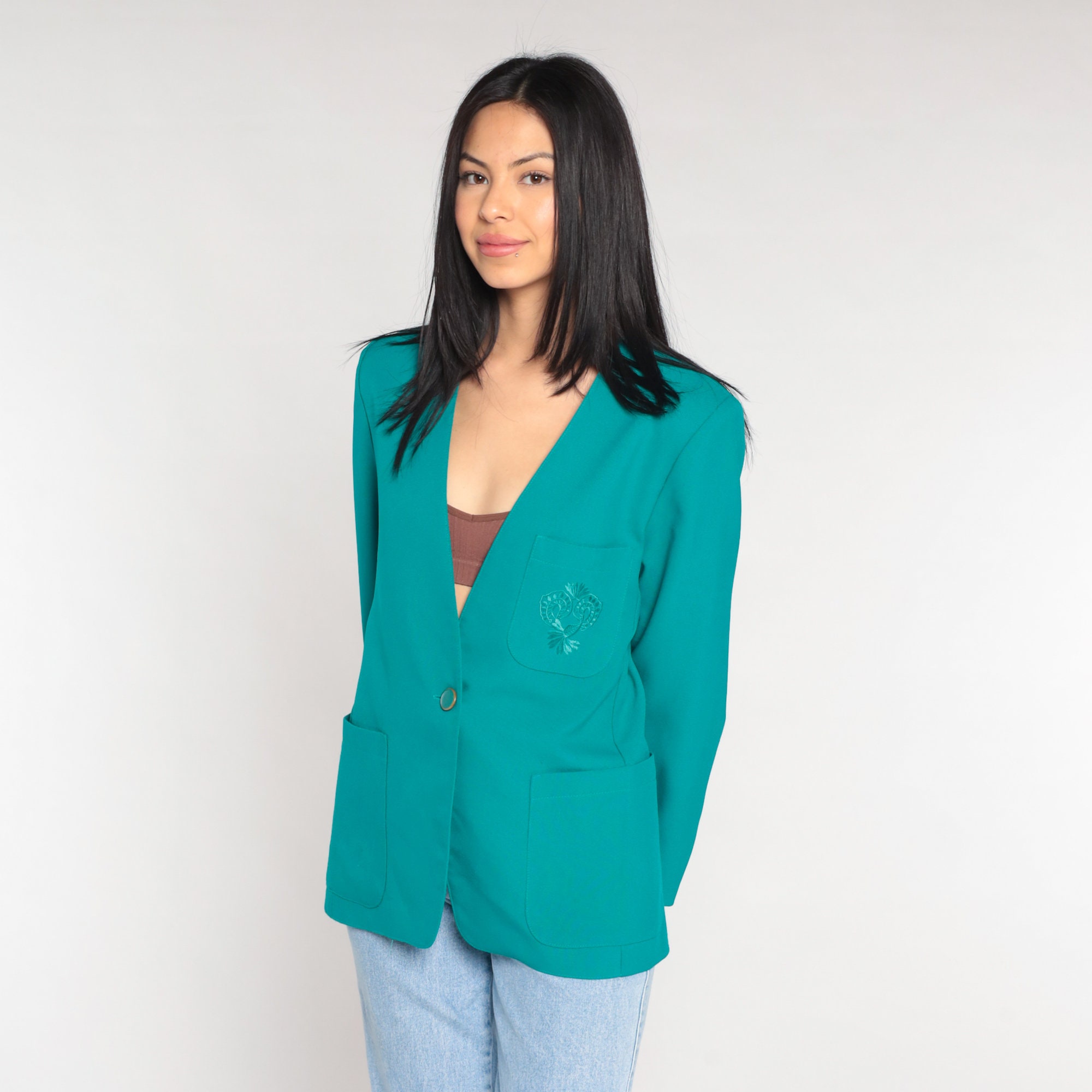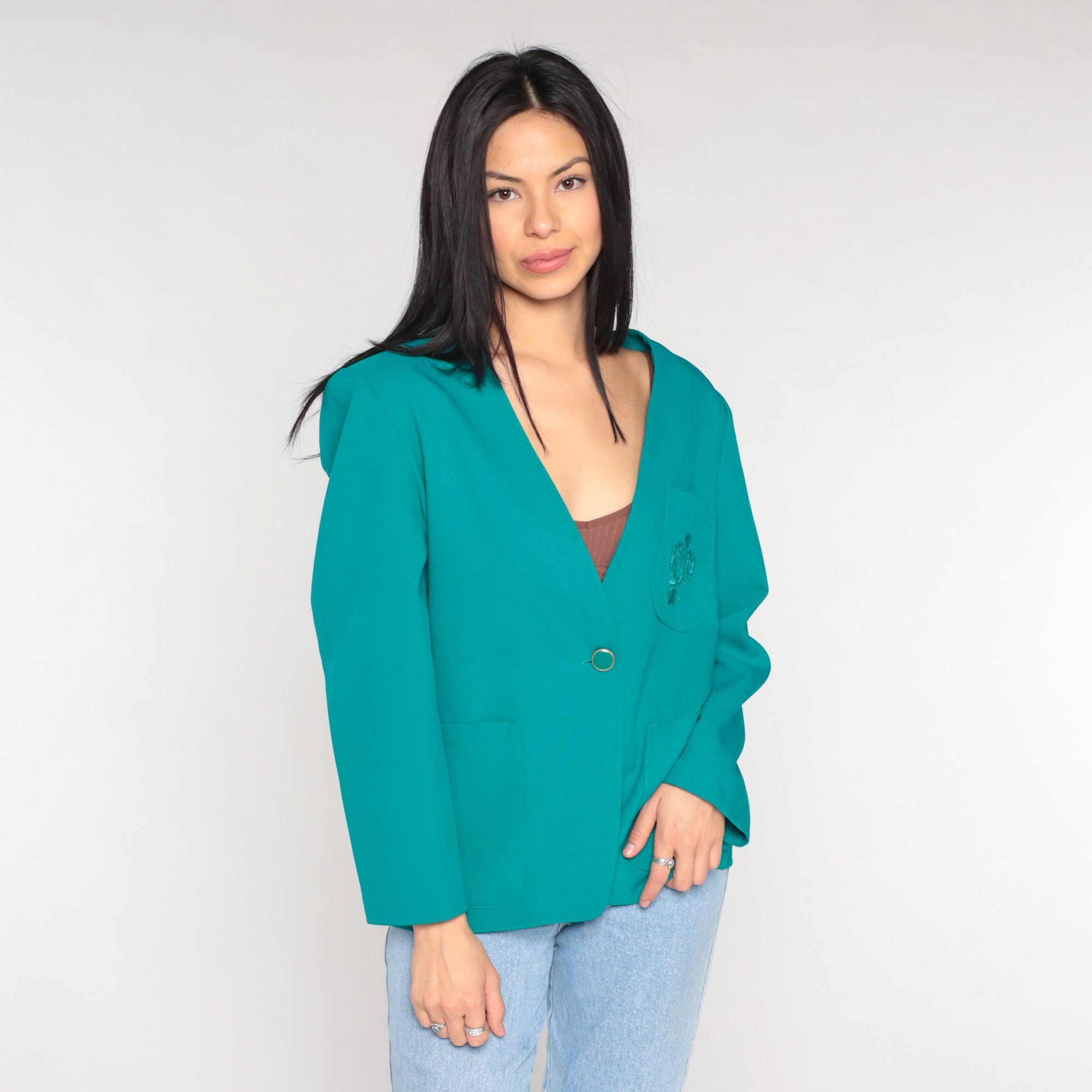 Vintage 80s blazer jacket in teal with floral embroidery on the chest pocket and a single button closure.