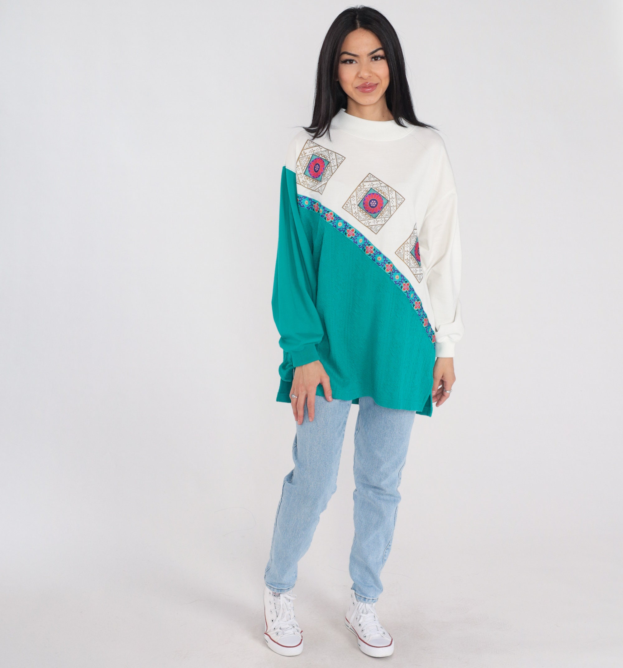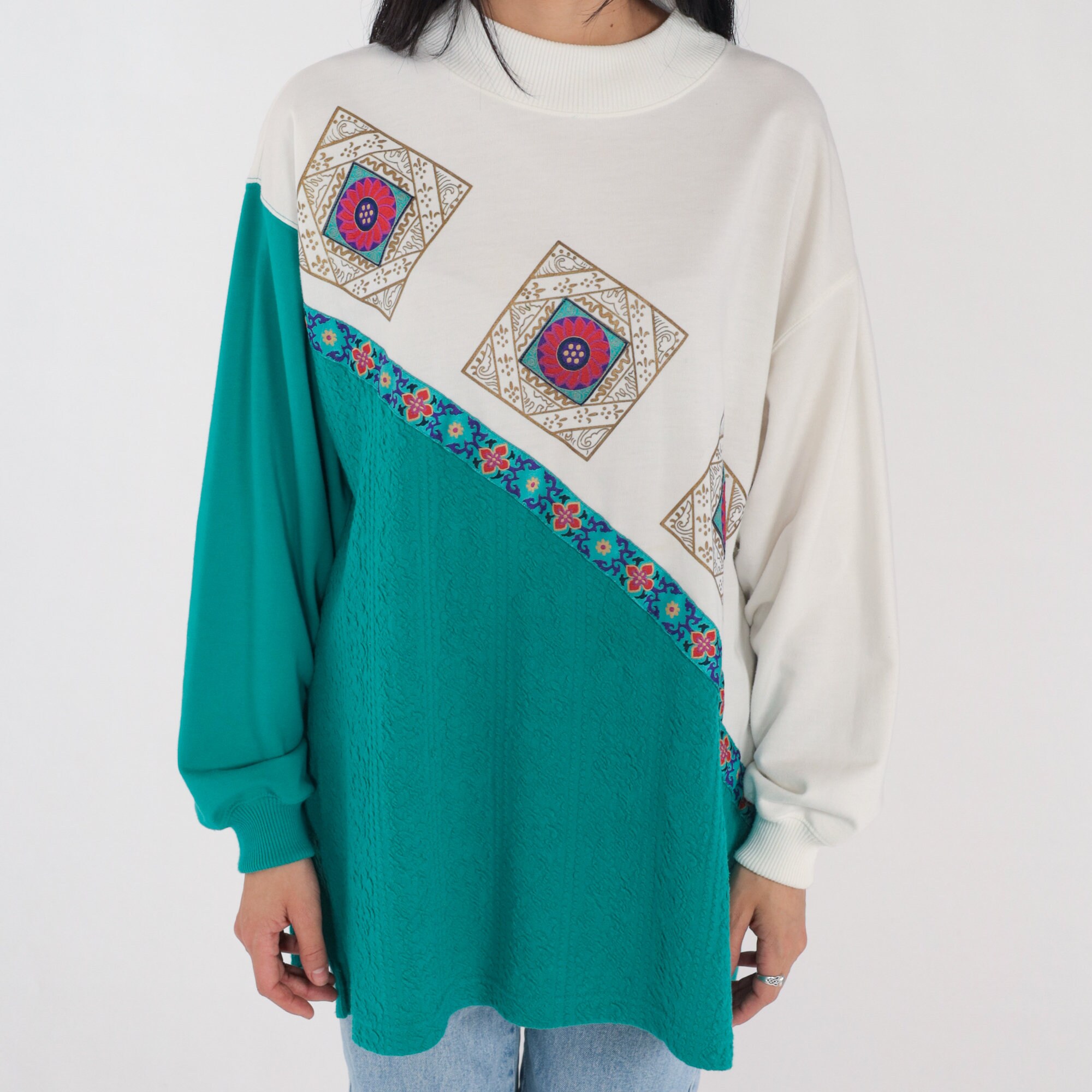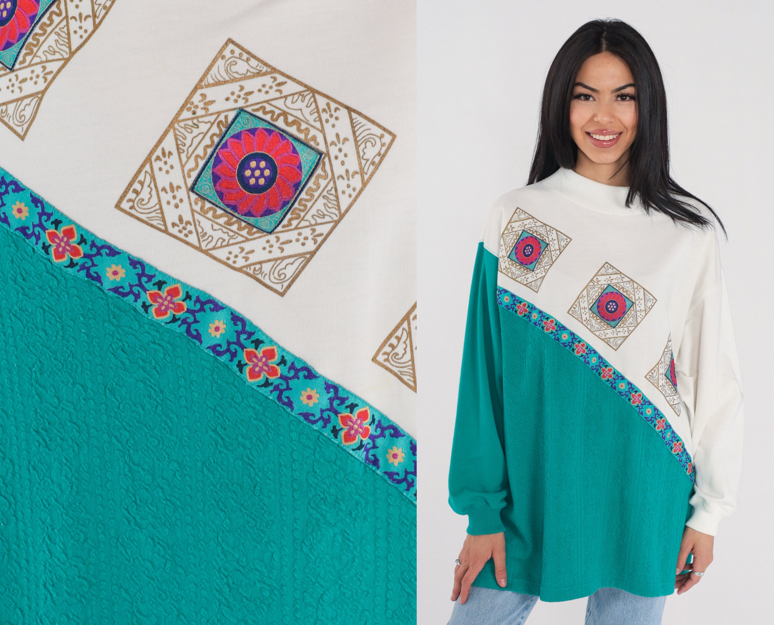 Vintage 90s shirt in white and green color blocking with a floral texture and a floral tile print.