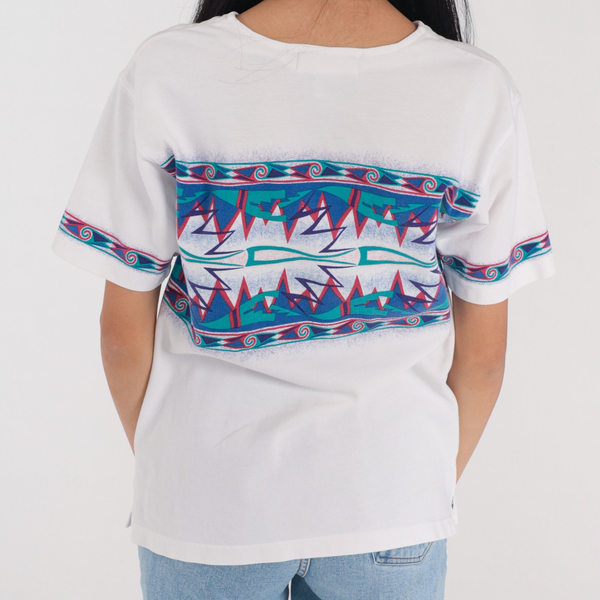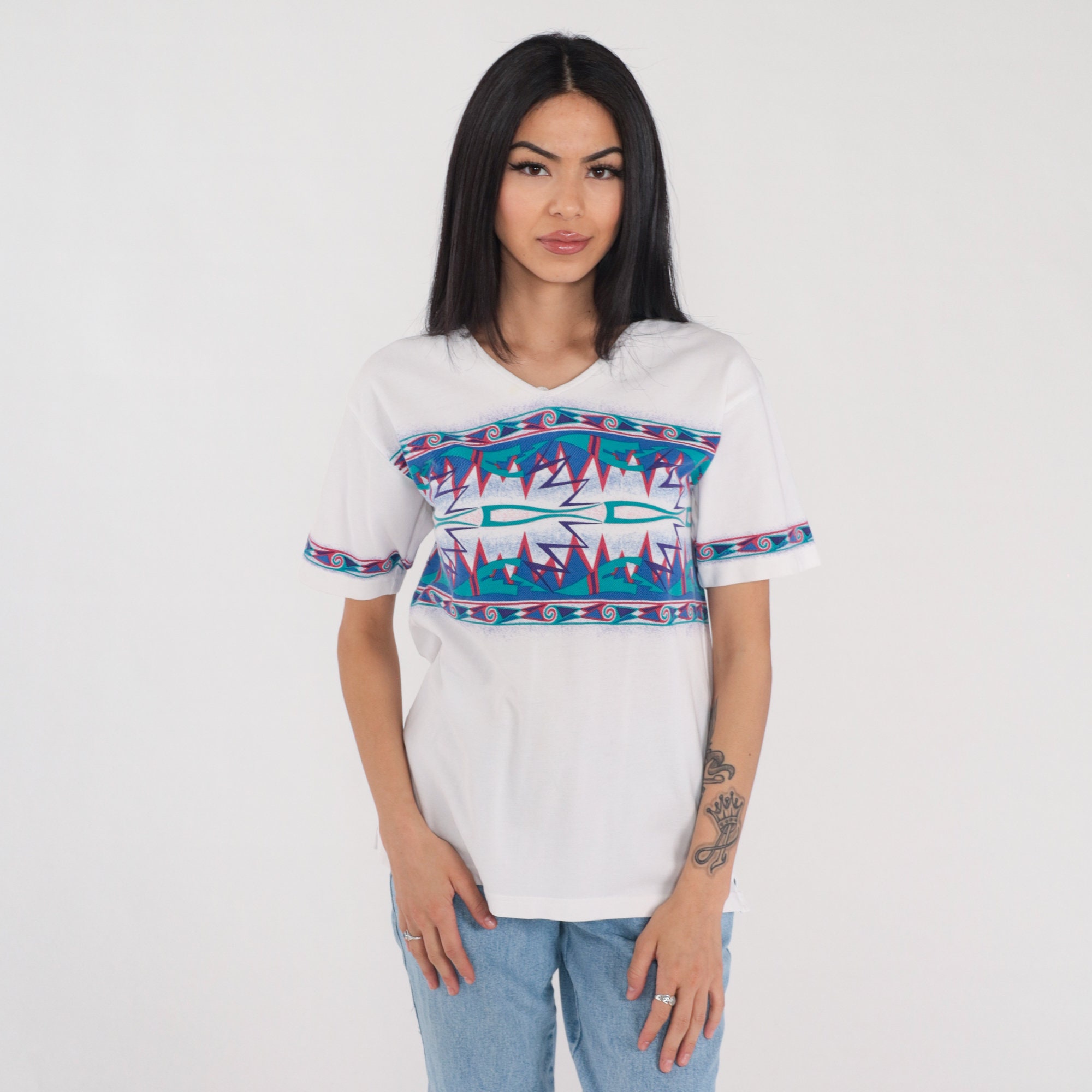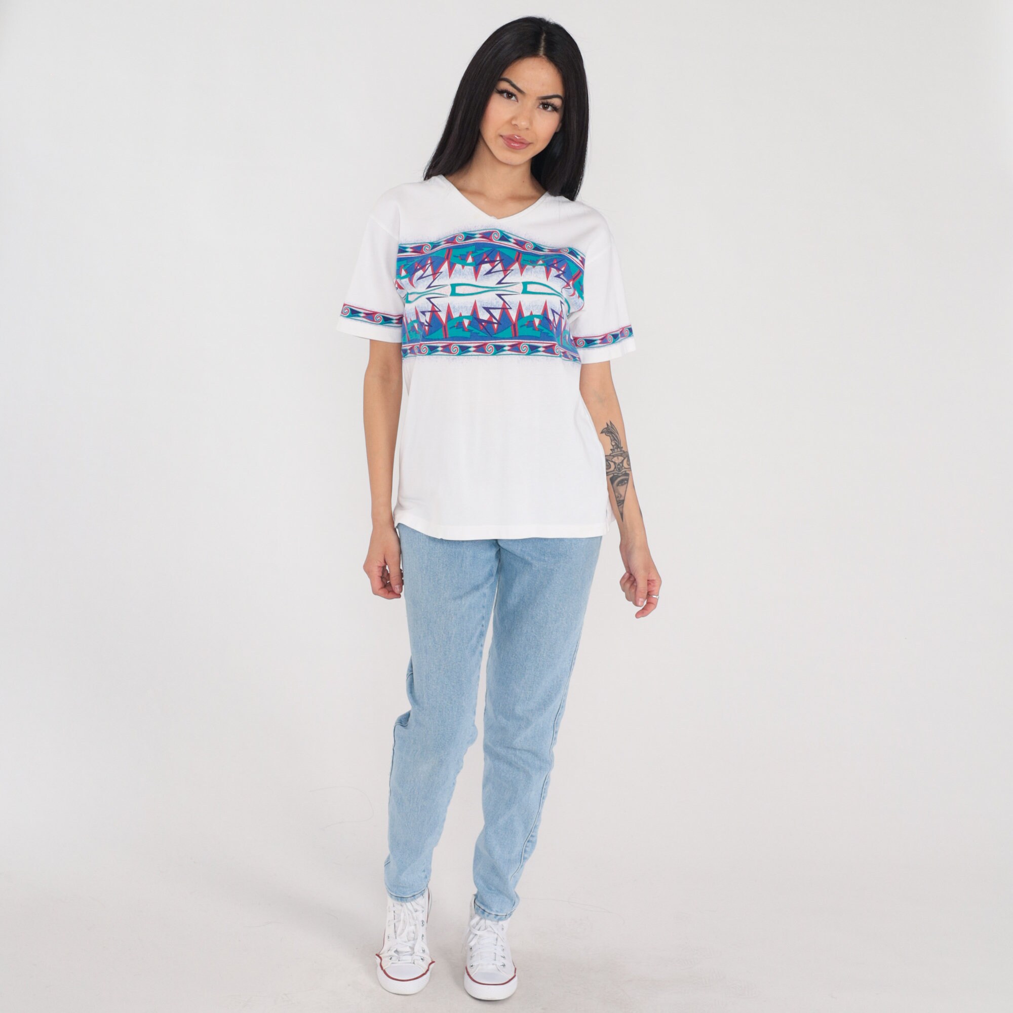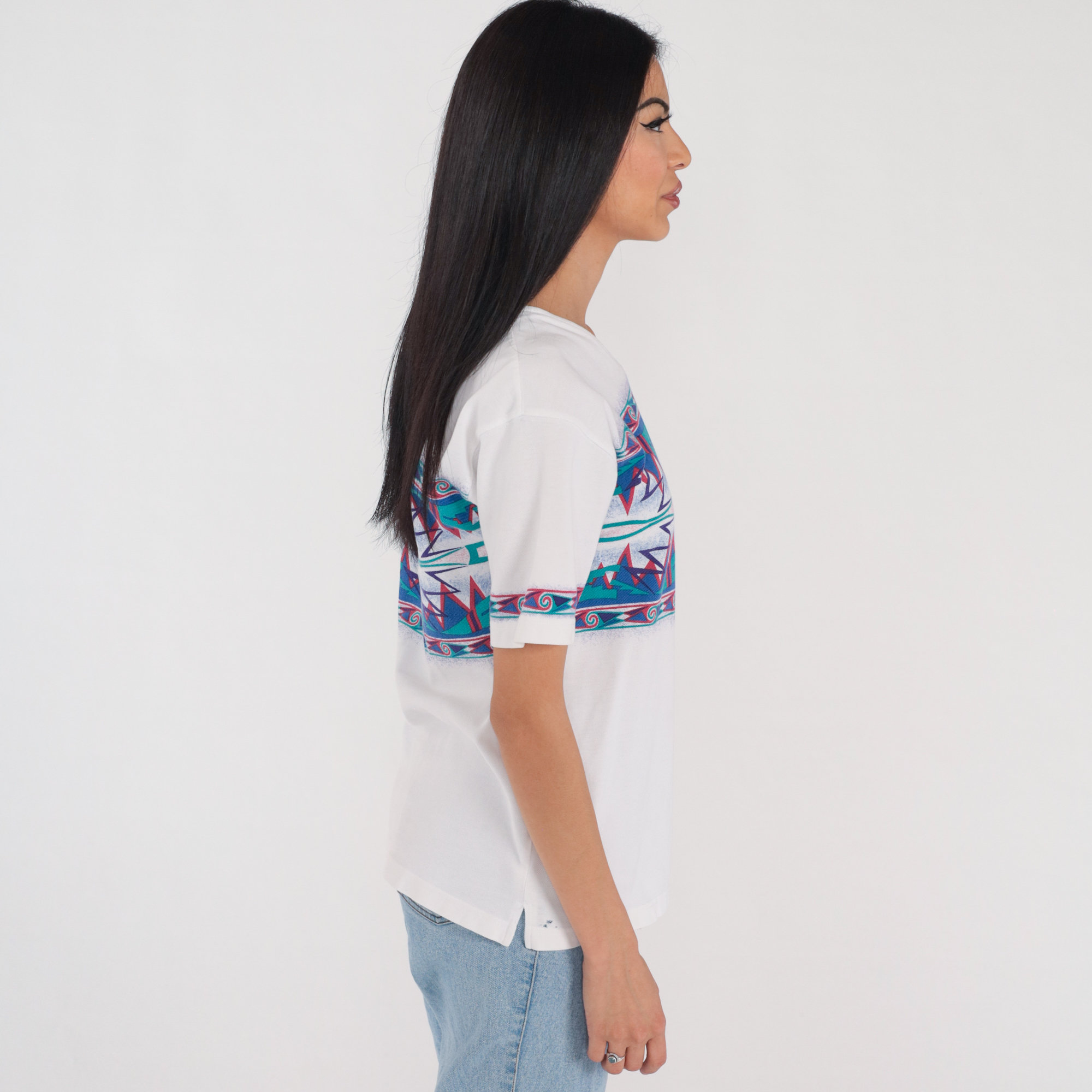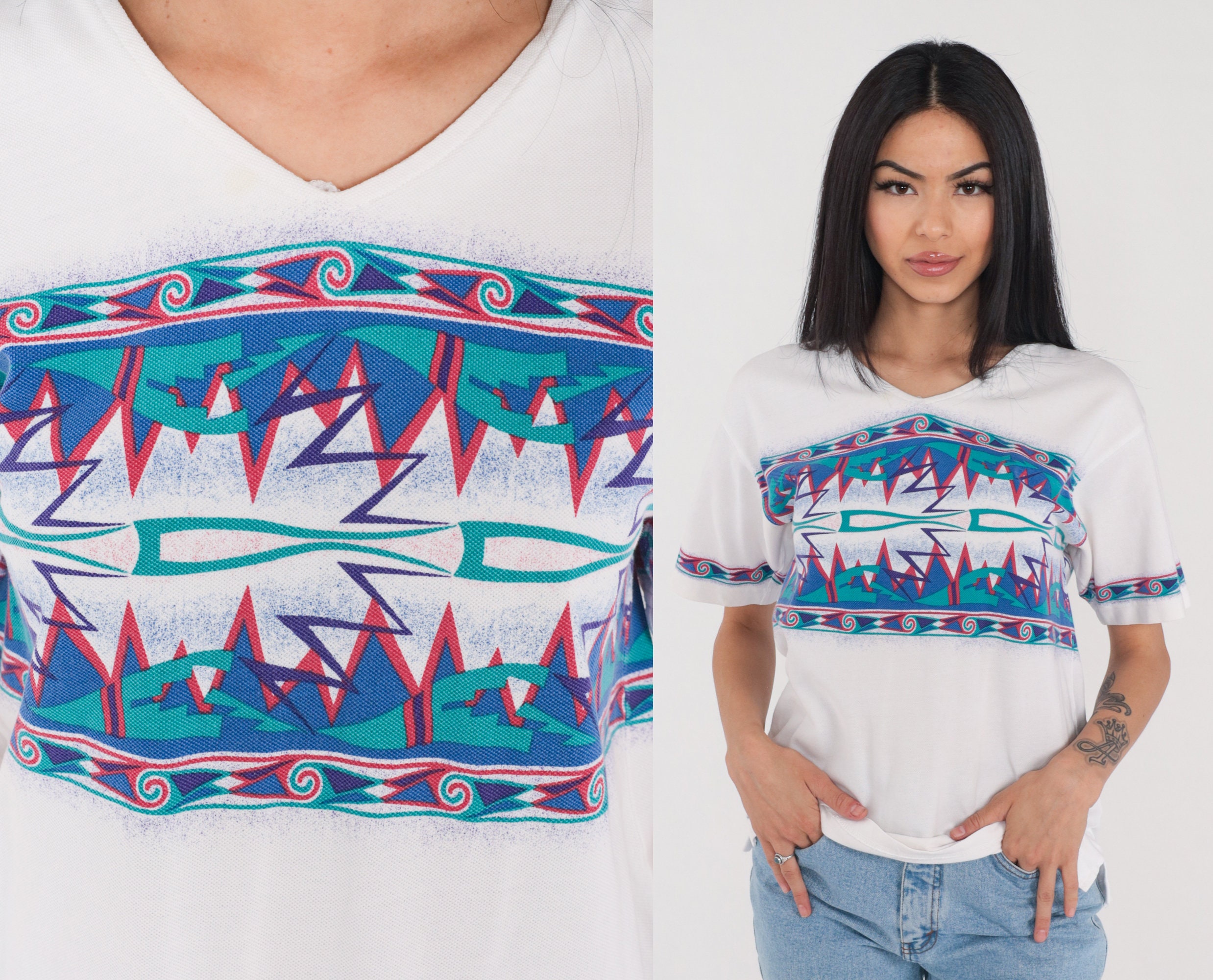Vintage 90s t shirt in white with a blue, red, and green abstract geometric print and a v neck..