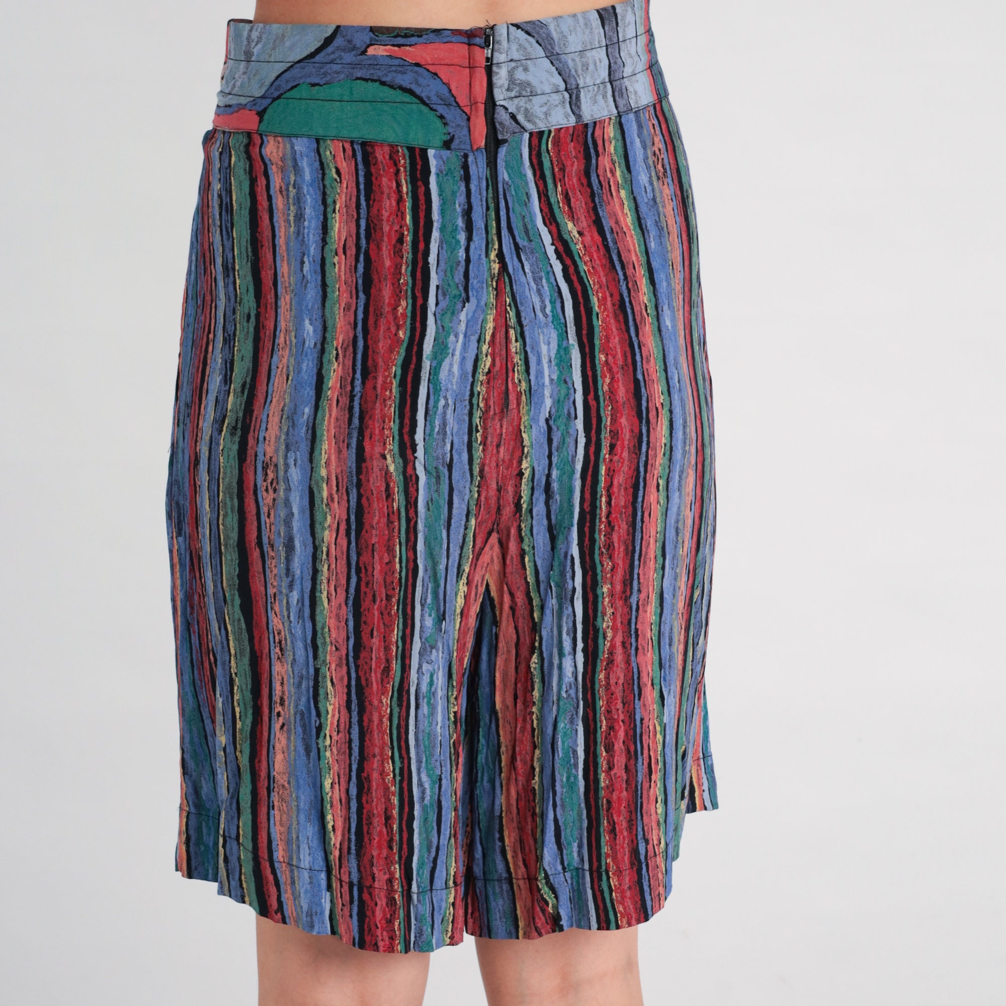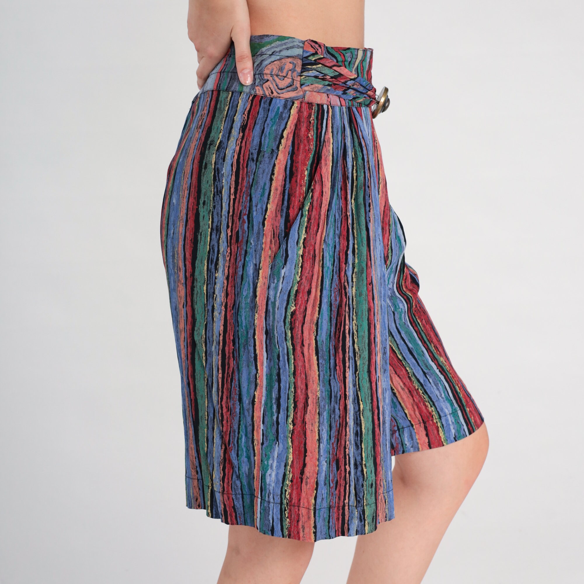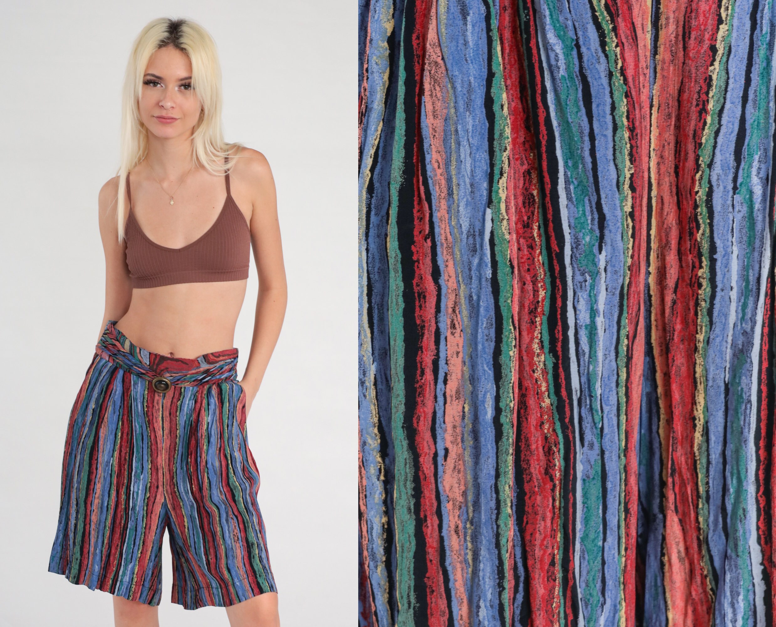 Vintage 90s shorts with a striped print. High waisted with wide legs and an attached belt.