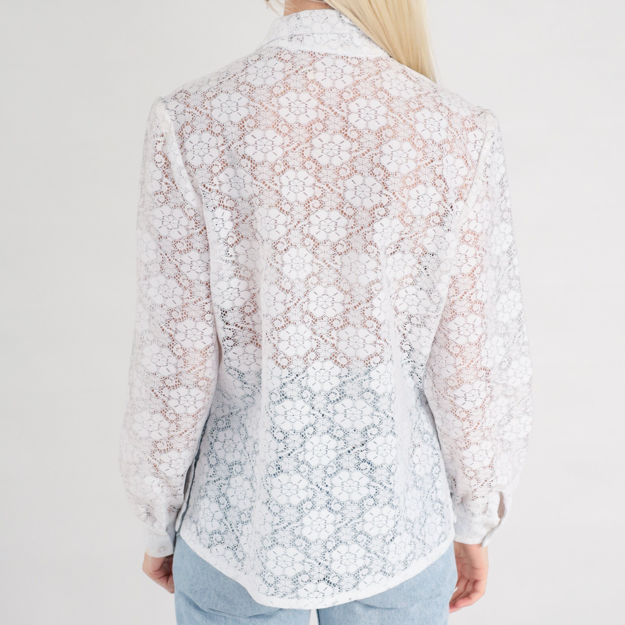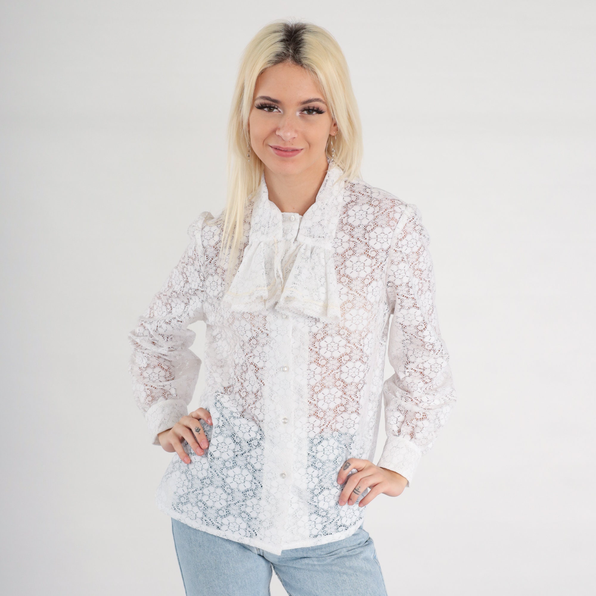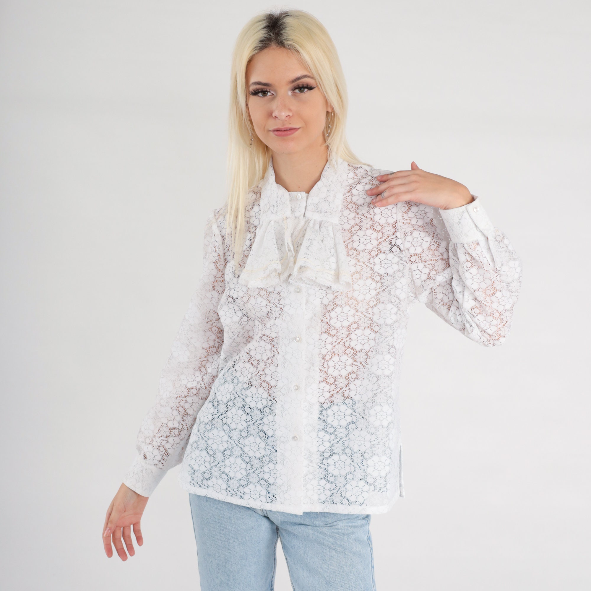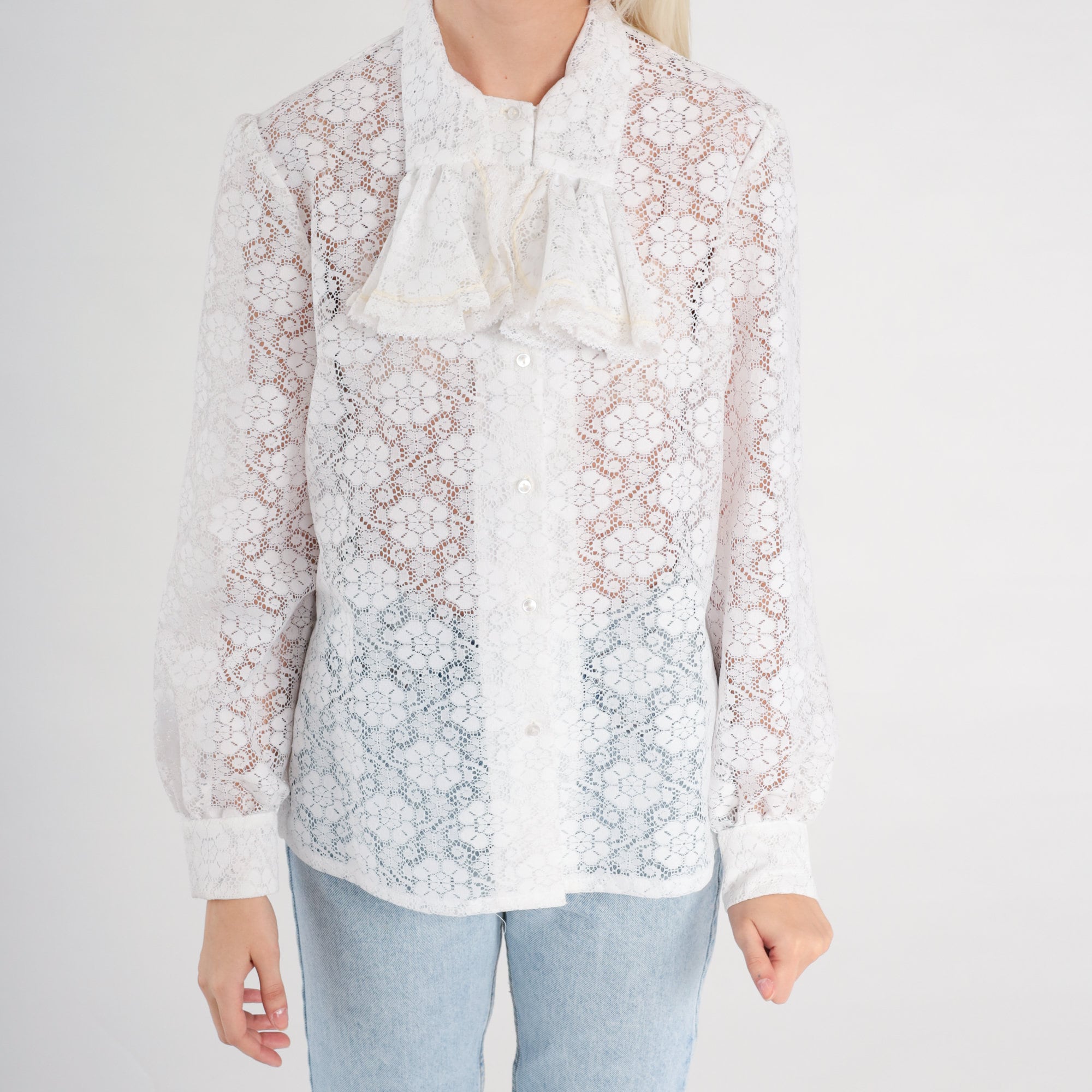Vintage 70s blouse in white with a jabot neckline. Long sleeves, buttons up the front.