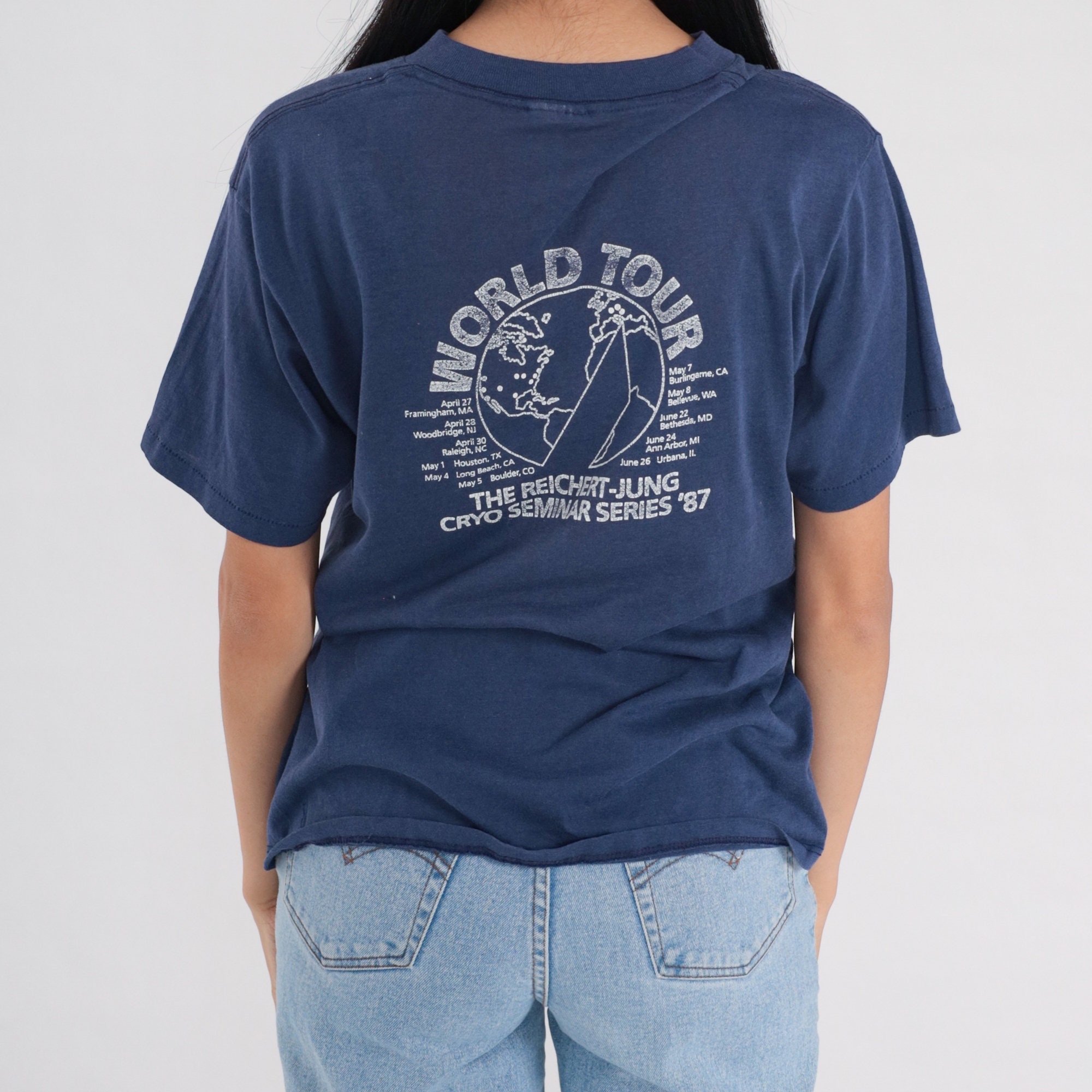 Vintage 80s t shirt in navy blue with a blank front and a Reichert Yung 1987 Cryo Seminar print on the back.