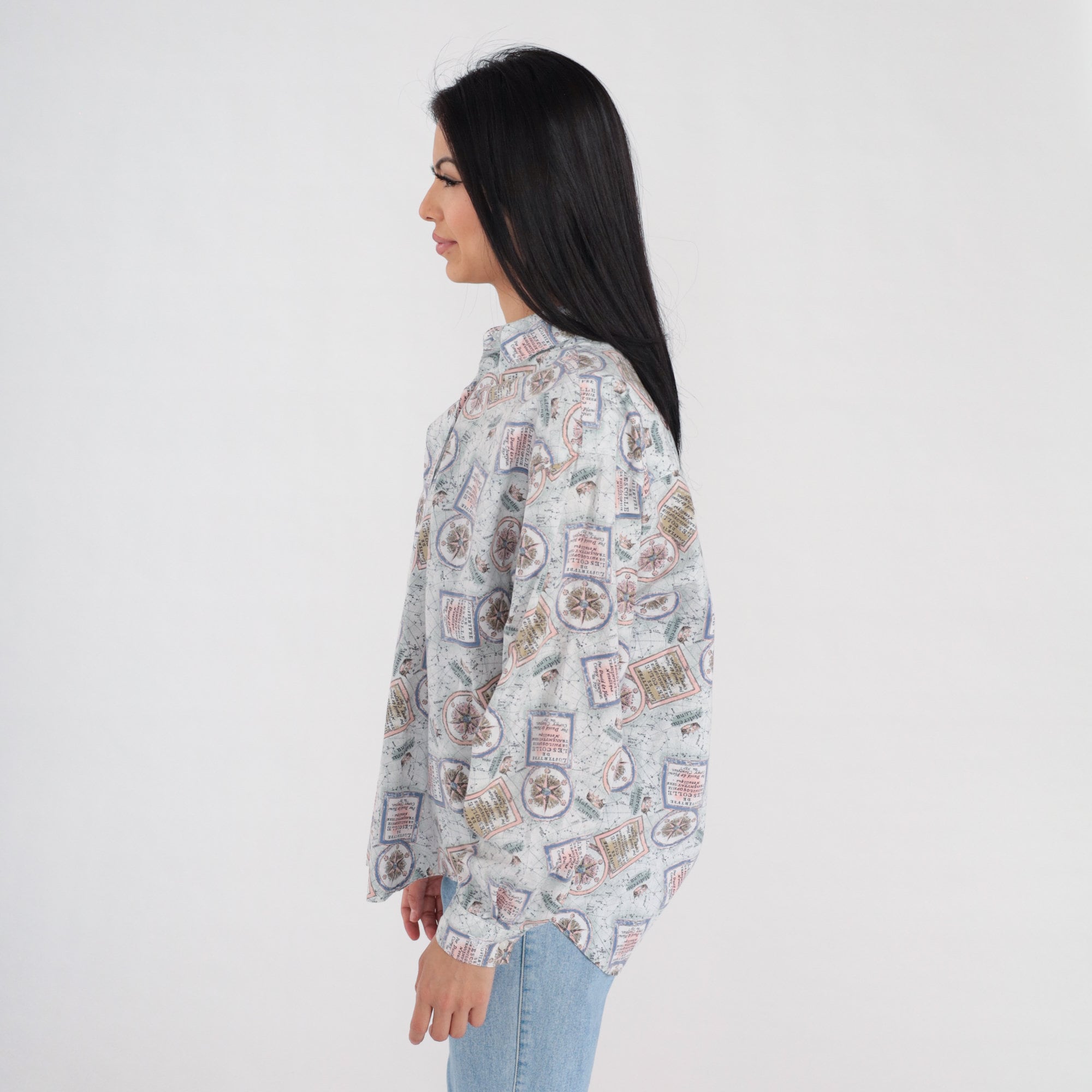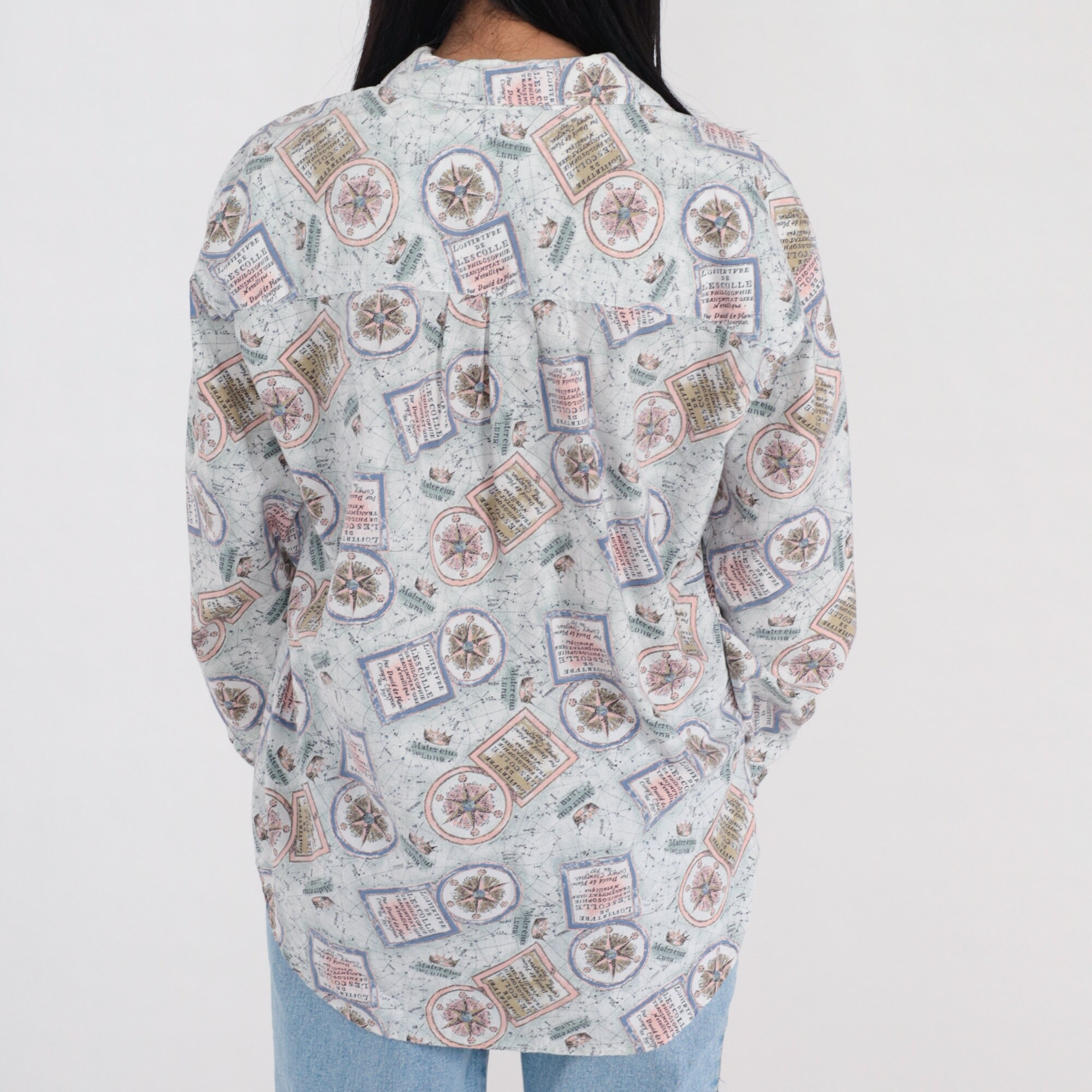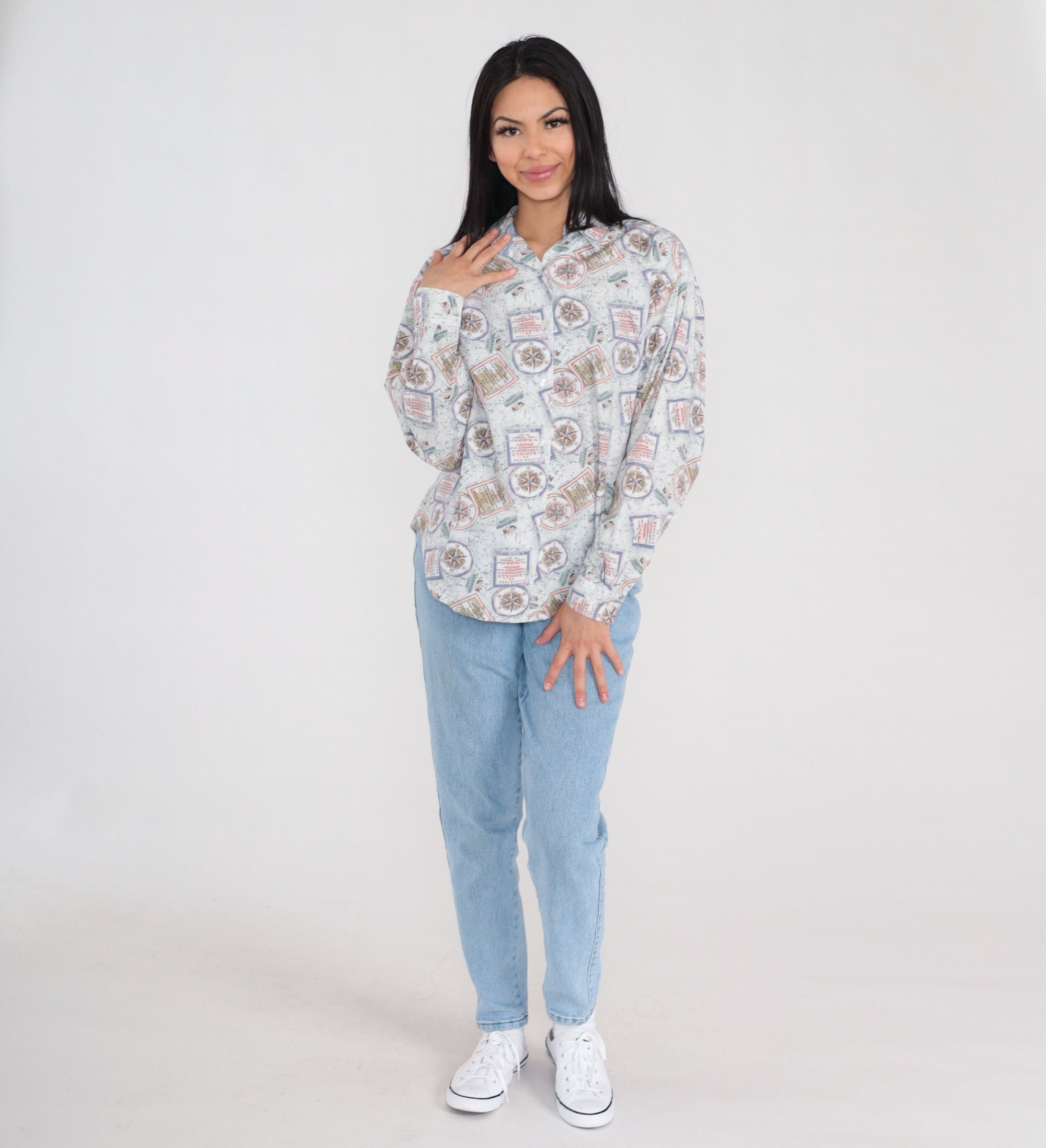 Vintage 90s shirt in yellow with a butterfly and flower print. Buttons up the front with long sleeves.