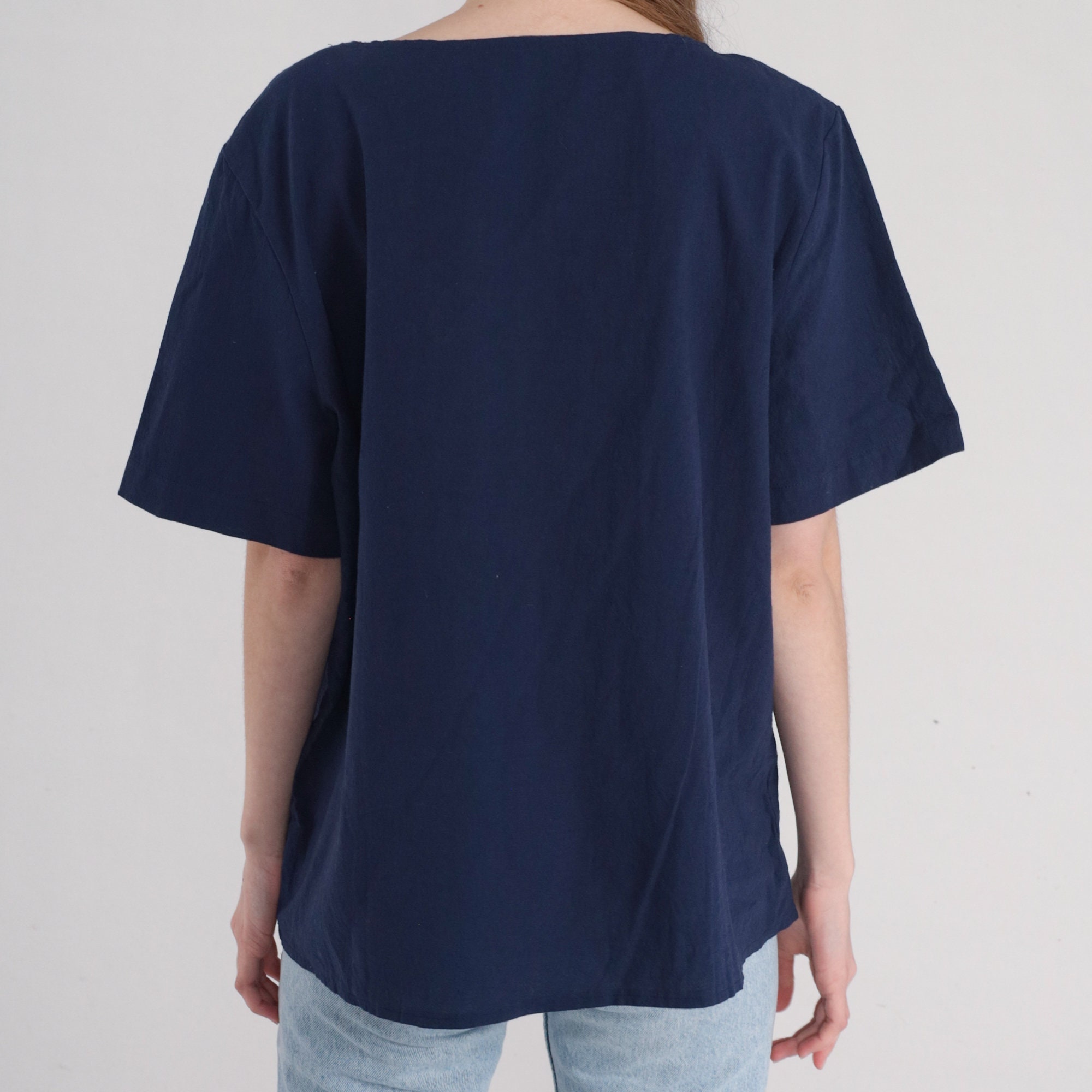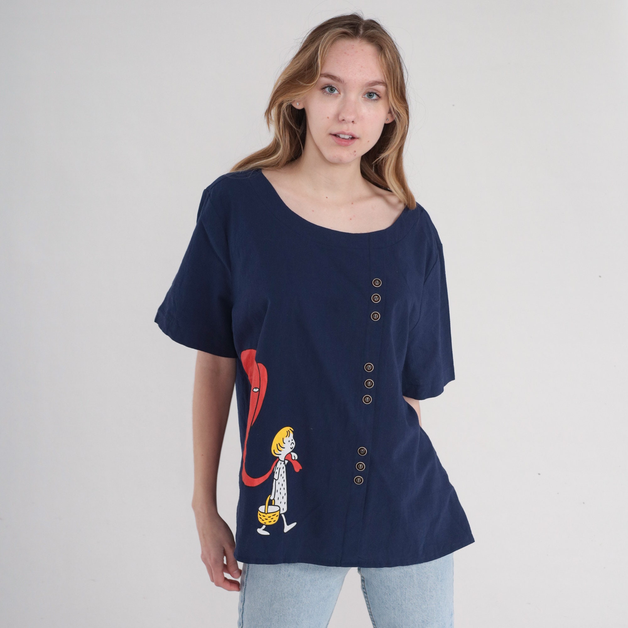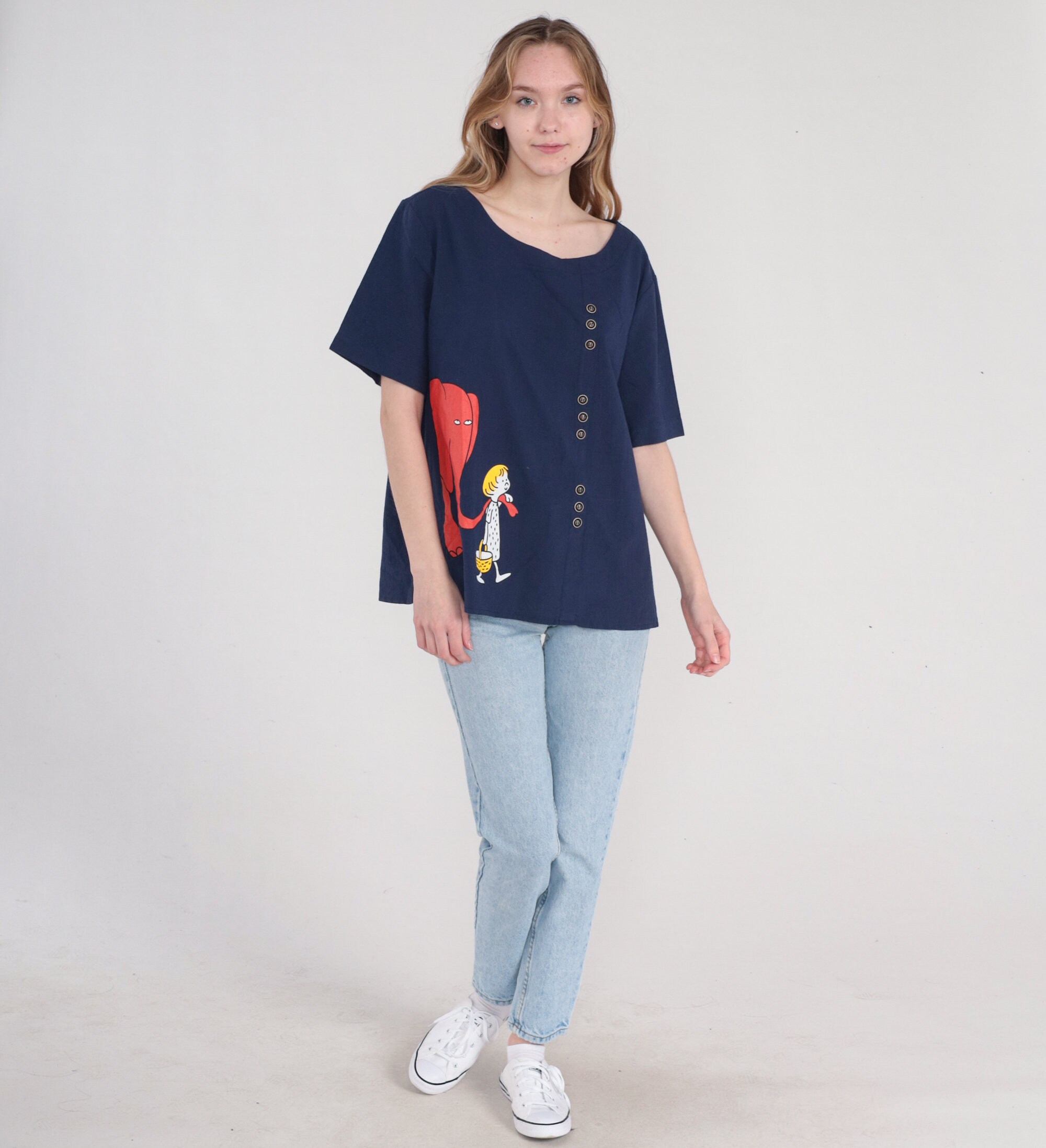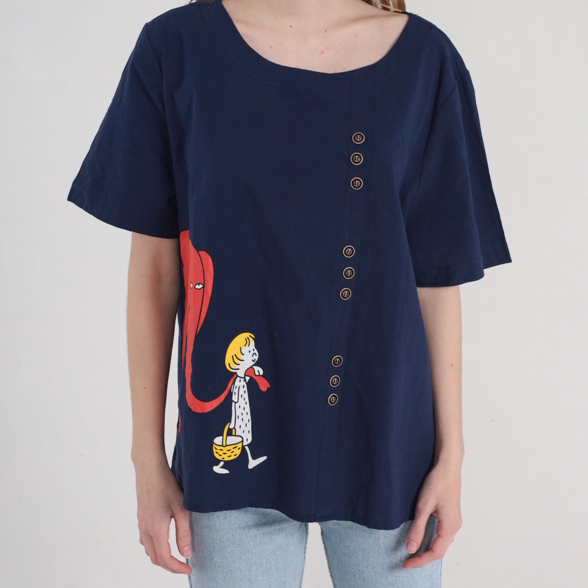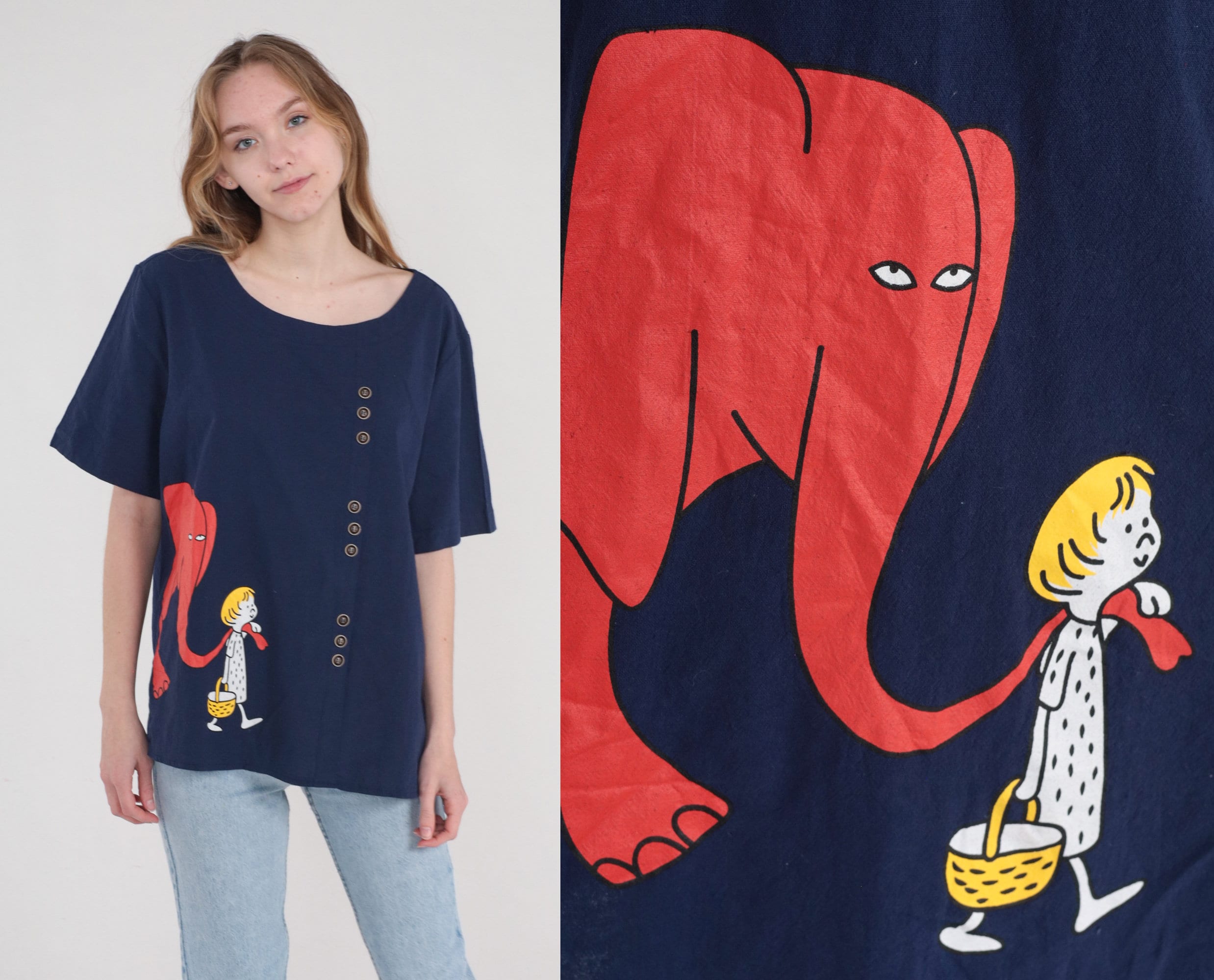 Vintage 00s t shirt in navy blue with a cartoon boy leading his pet elephant by the trunk and decorative buttons on the front.