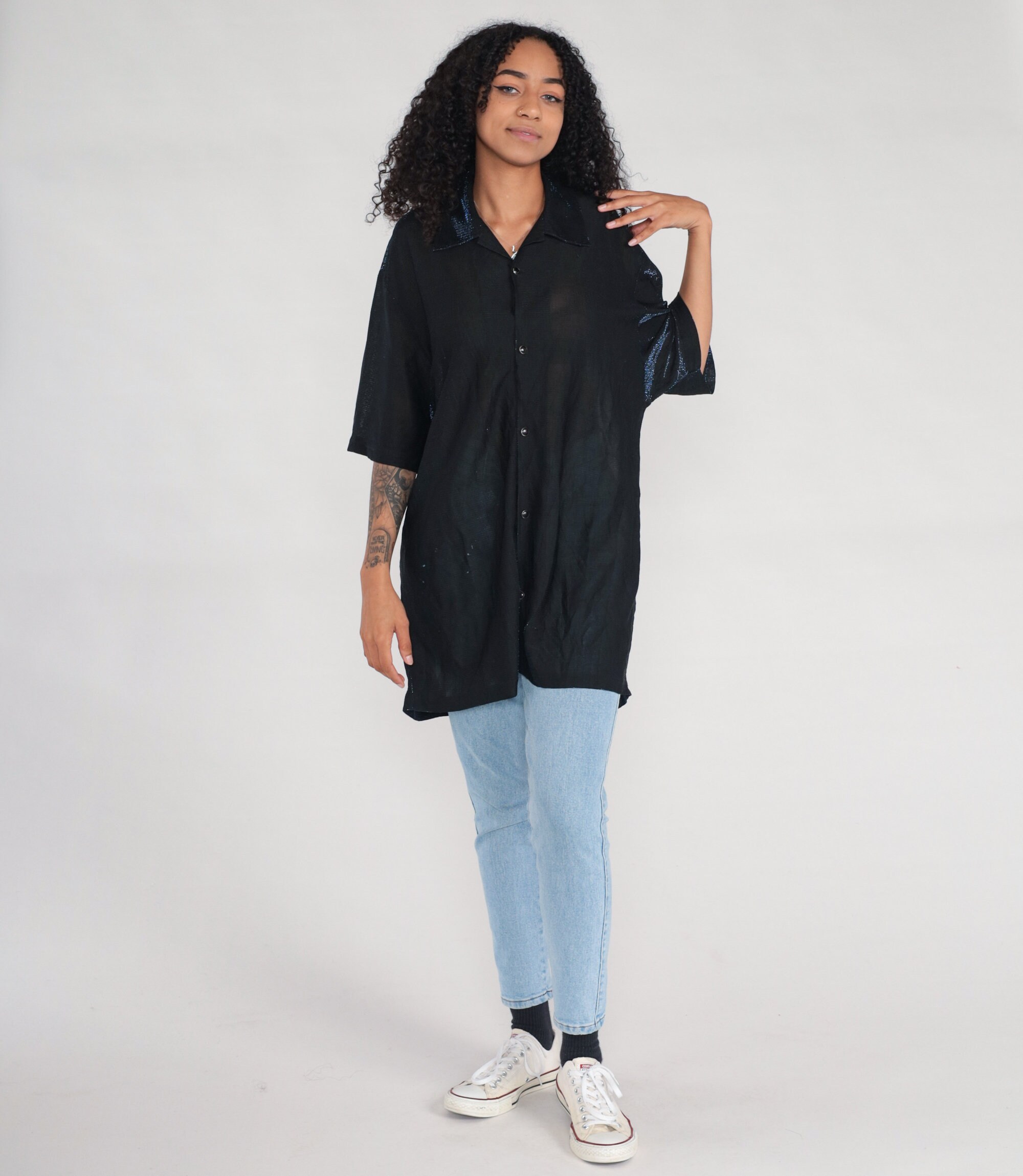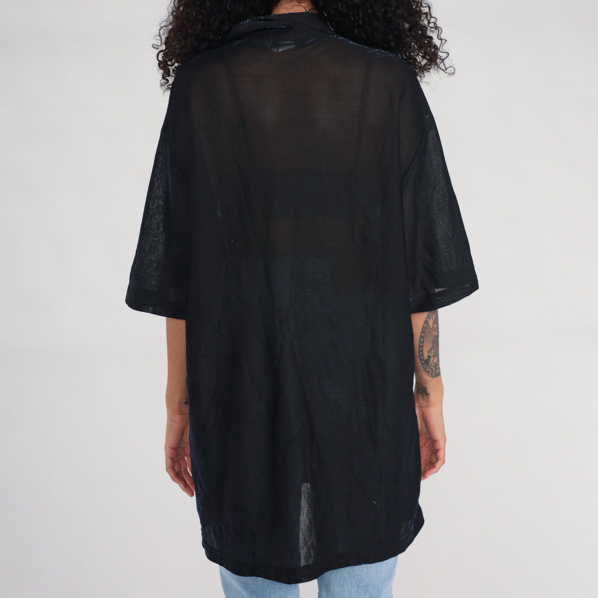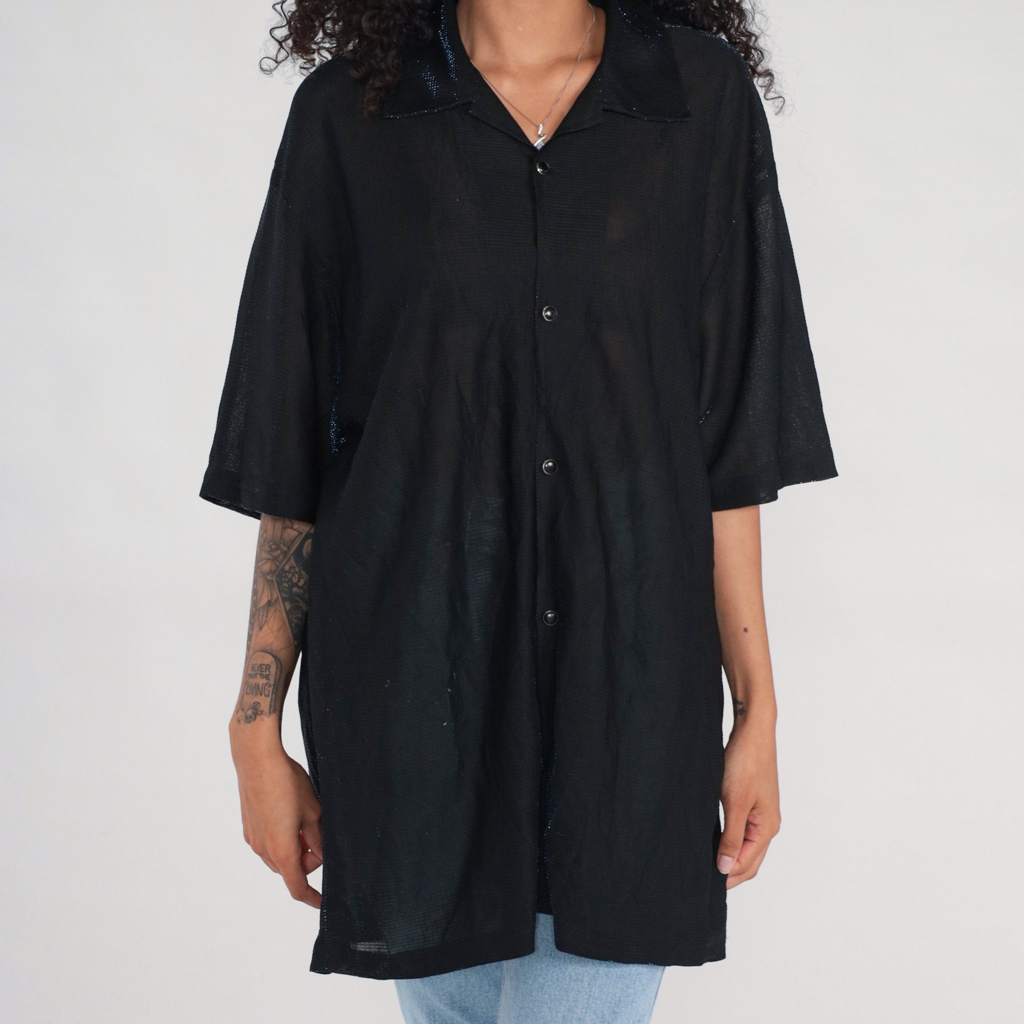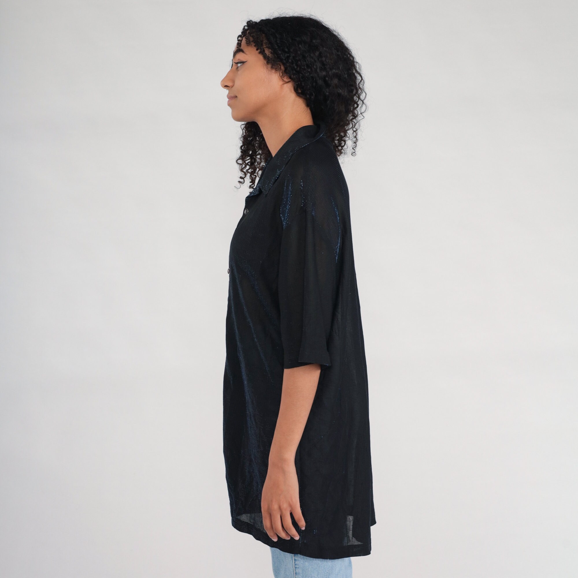 Vintage 90s 00s shirt in sheer black with metallic blue sparkles. It has buttons down the front and short sleeves. Blue metallic is more visible in person.