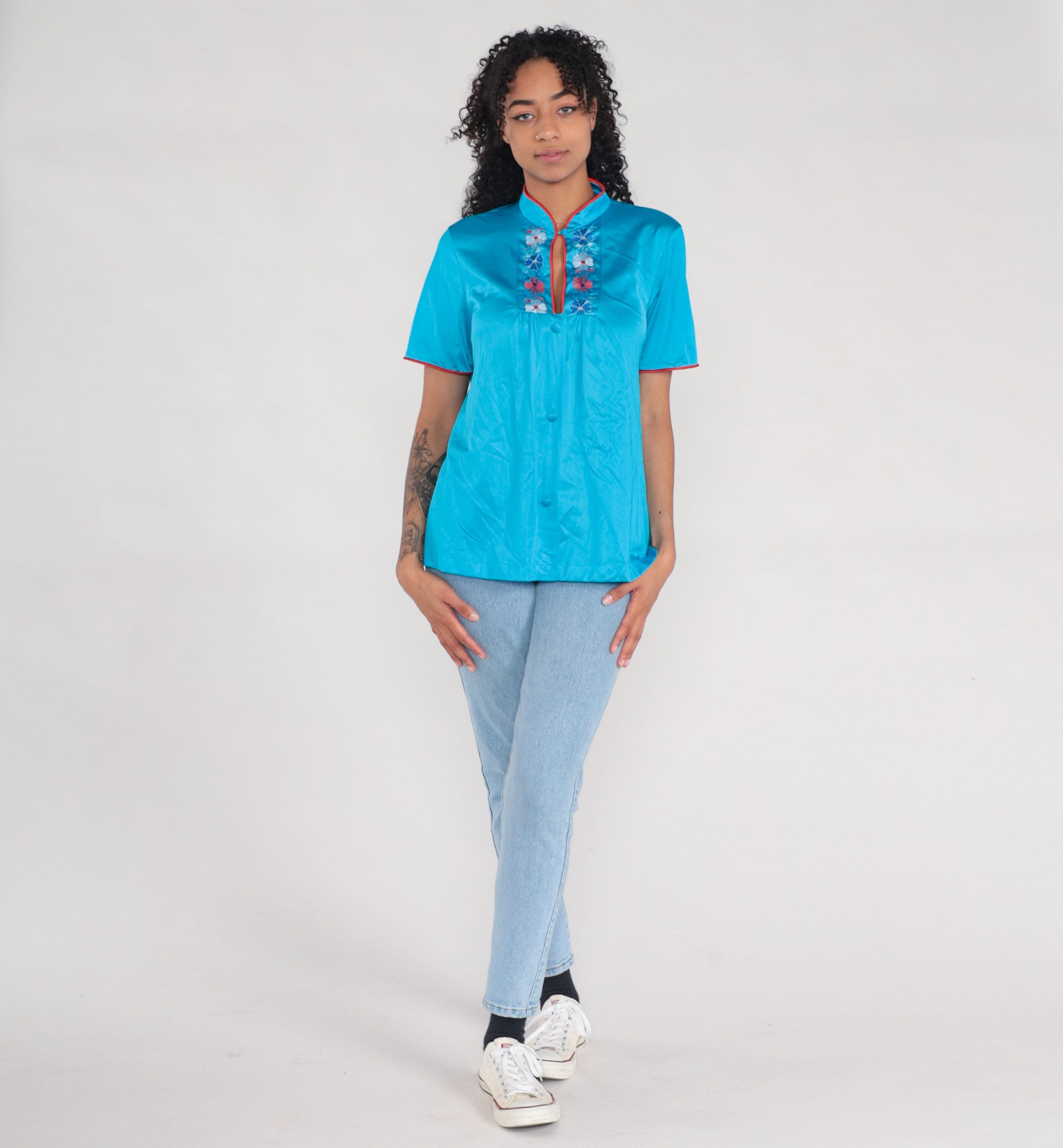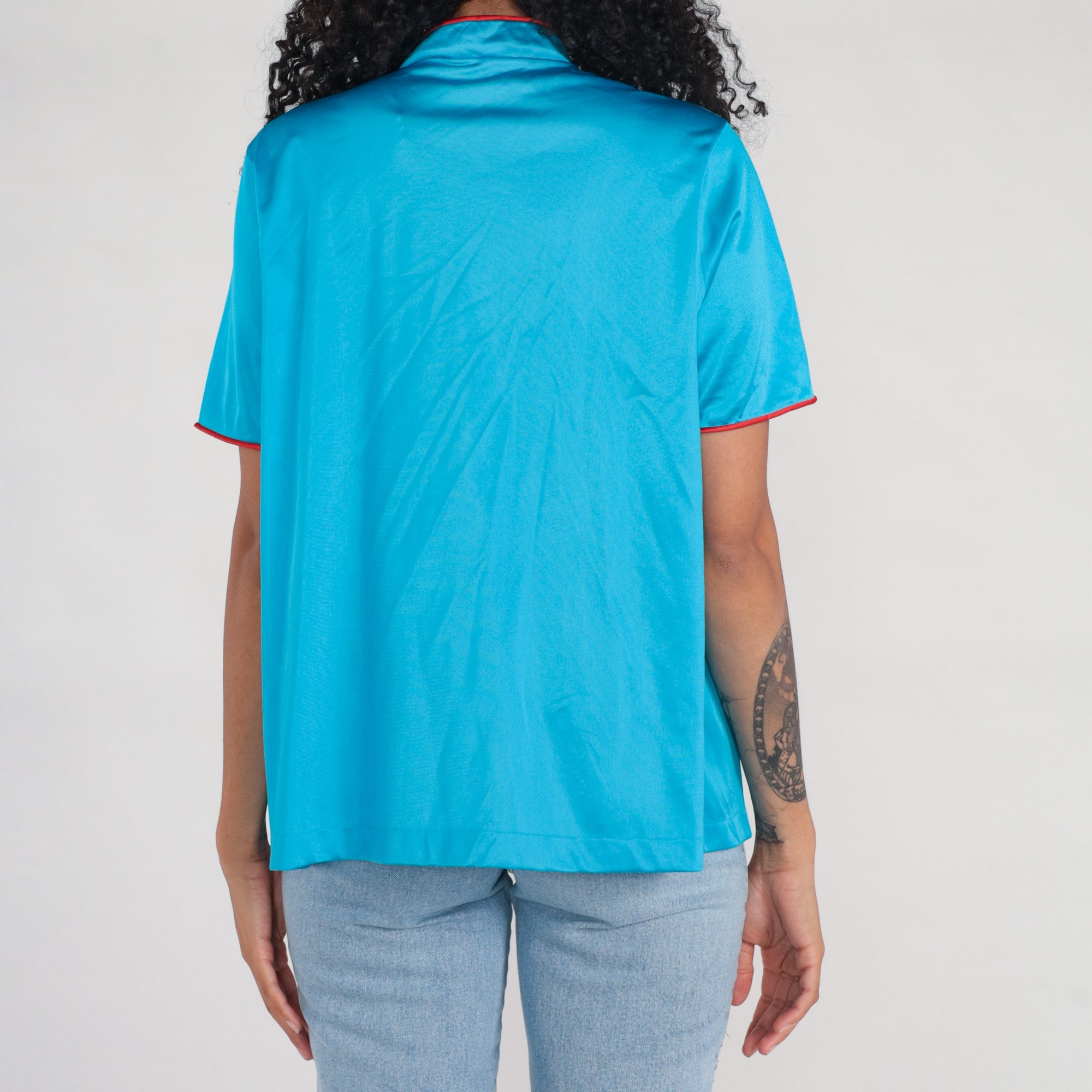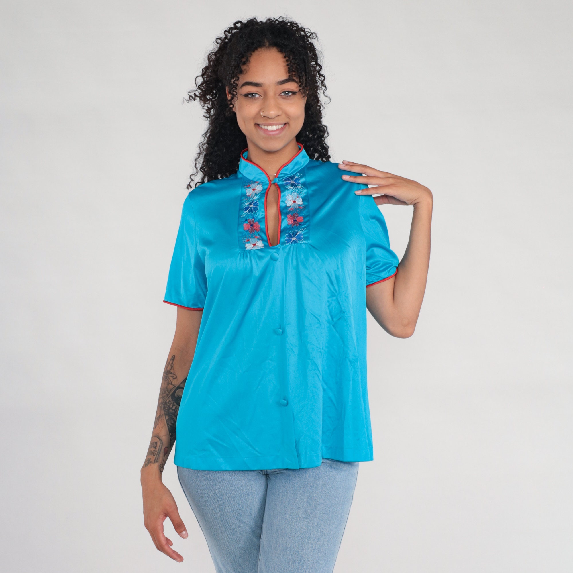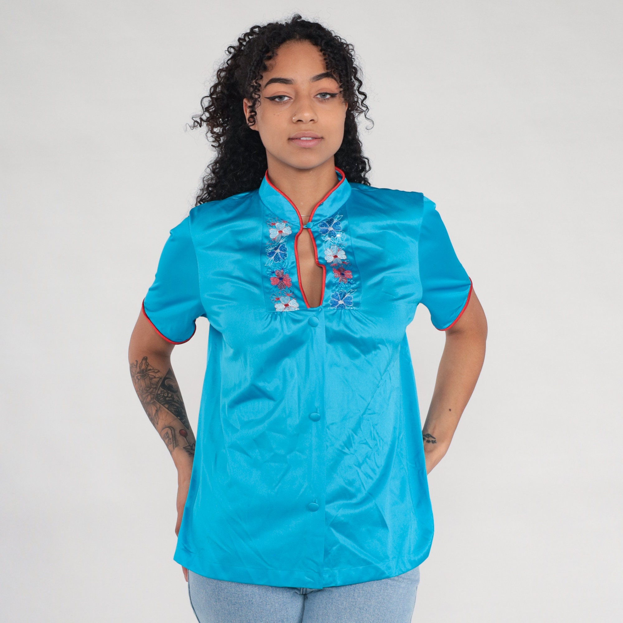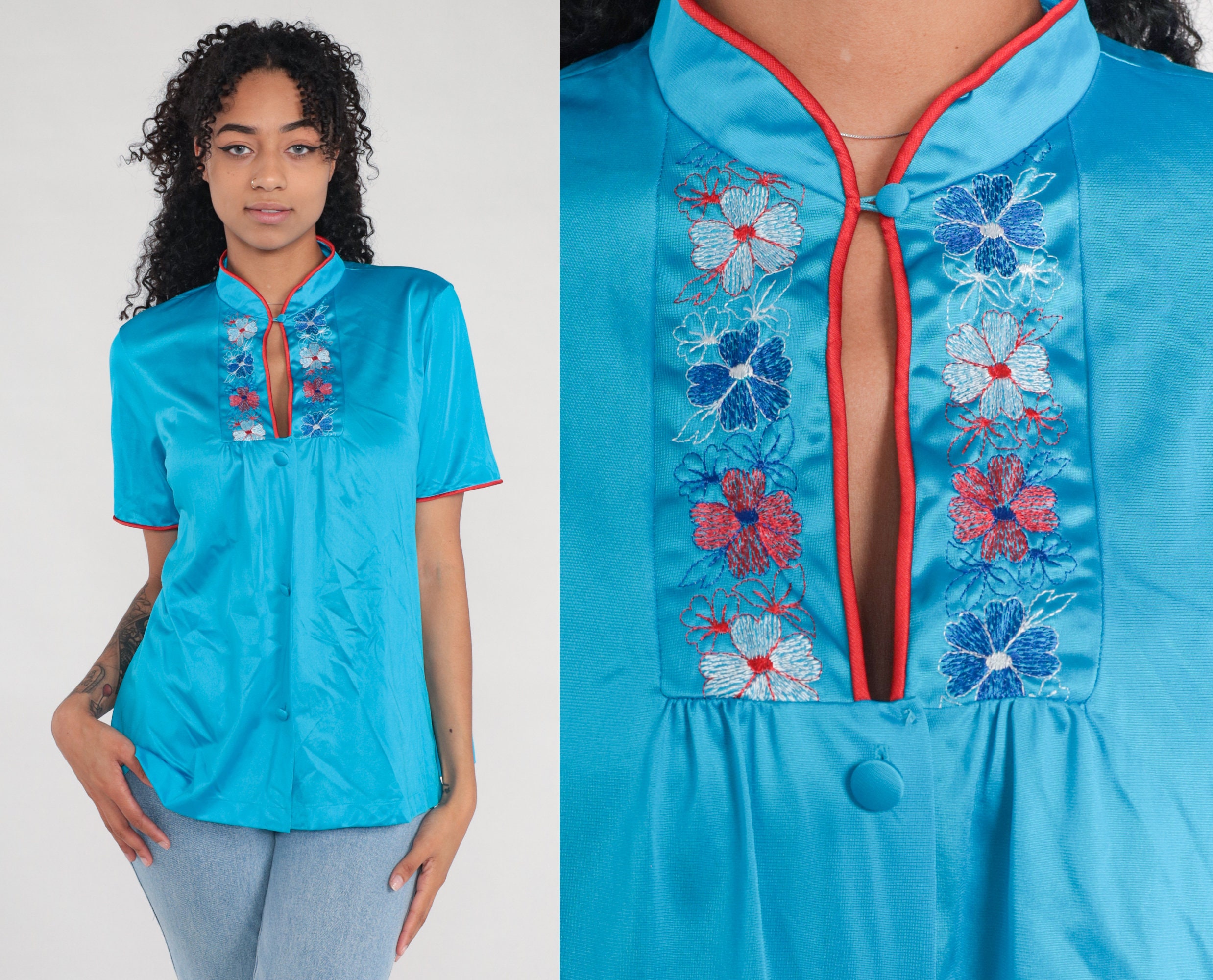 Vintage 80s pajama top in turquoise blue nylon with embroidered flowers and buttons up the front.