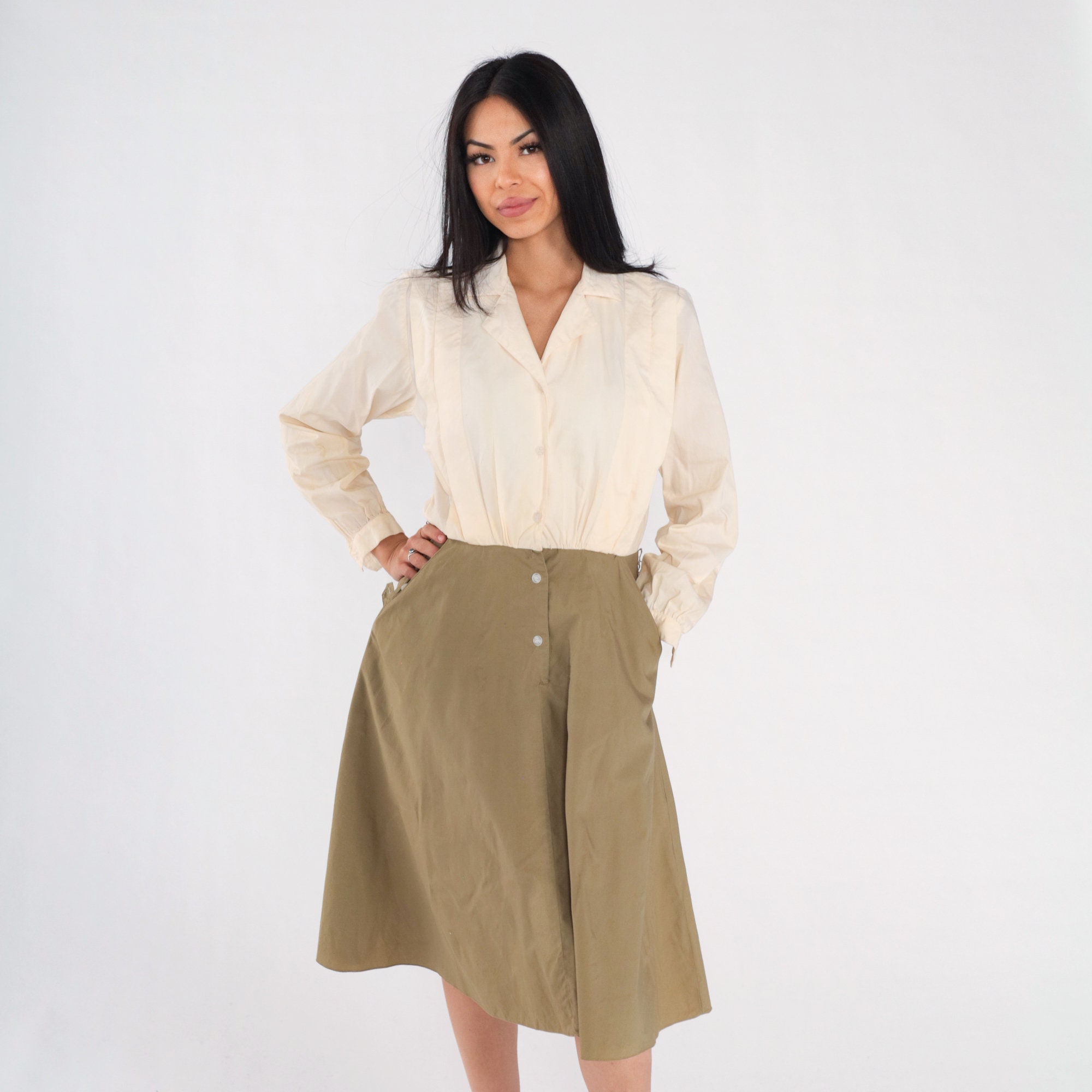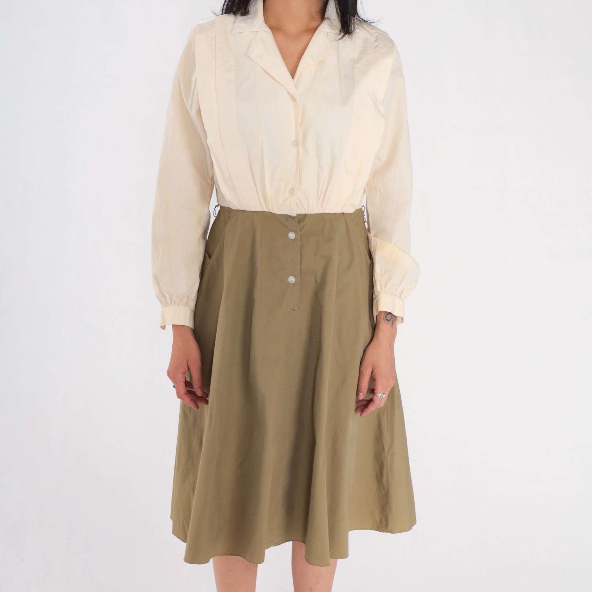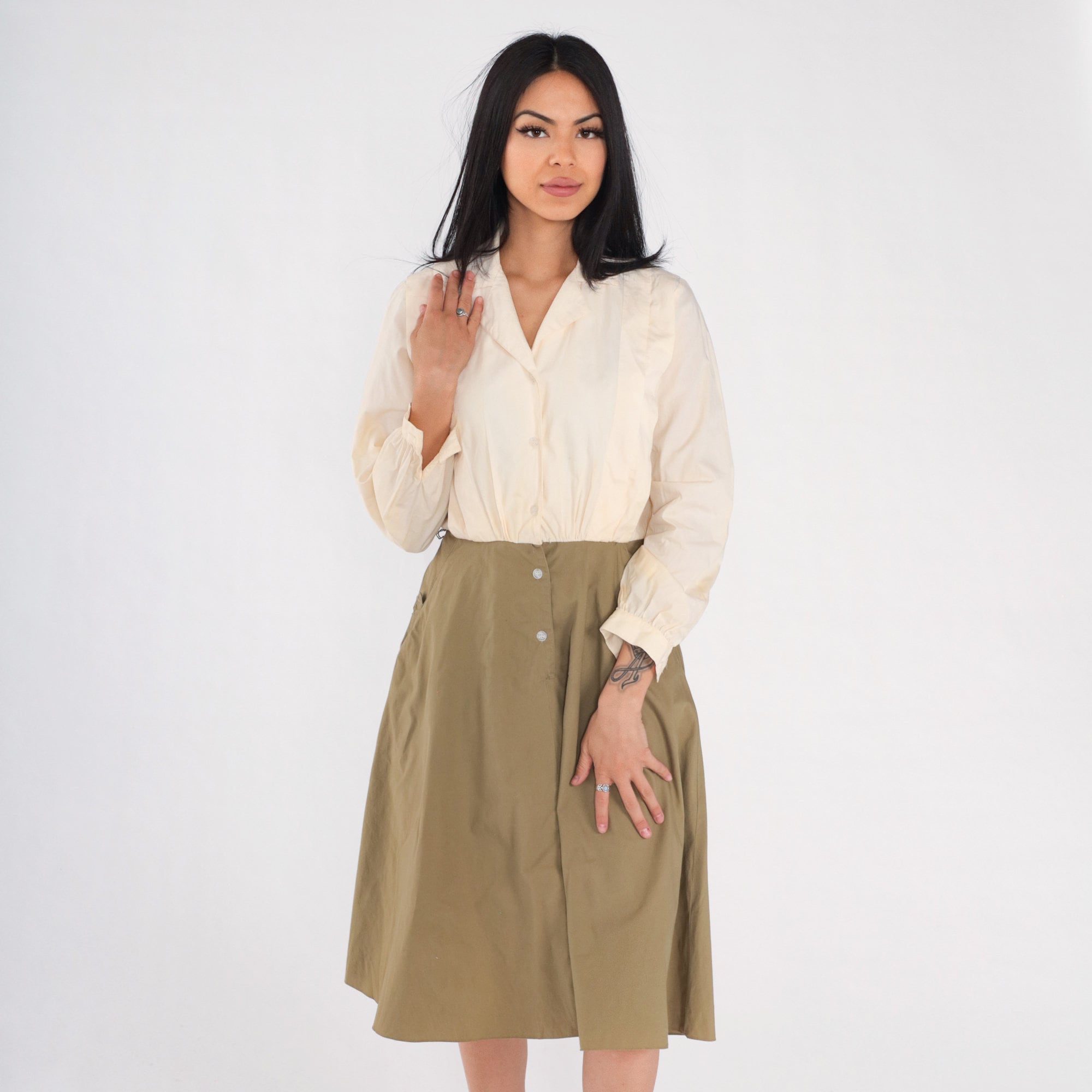 Vintage 80s dress with a cream bodice and an olive brown skirt. High waisted with long sleeves, a collar, and buttons up the chest. Midi length.