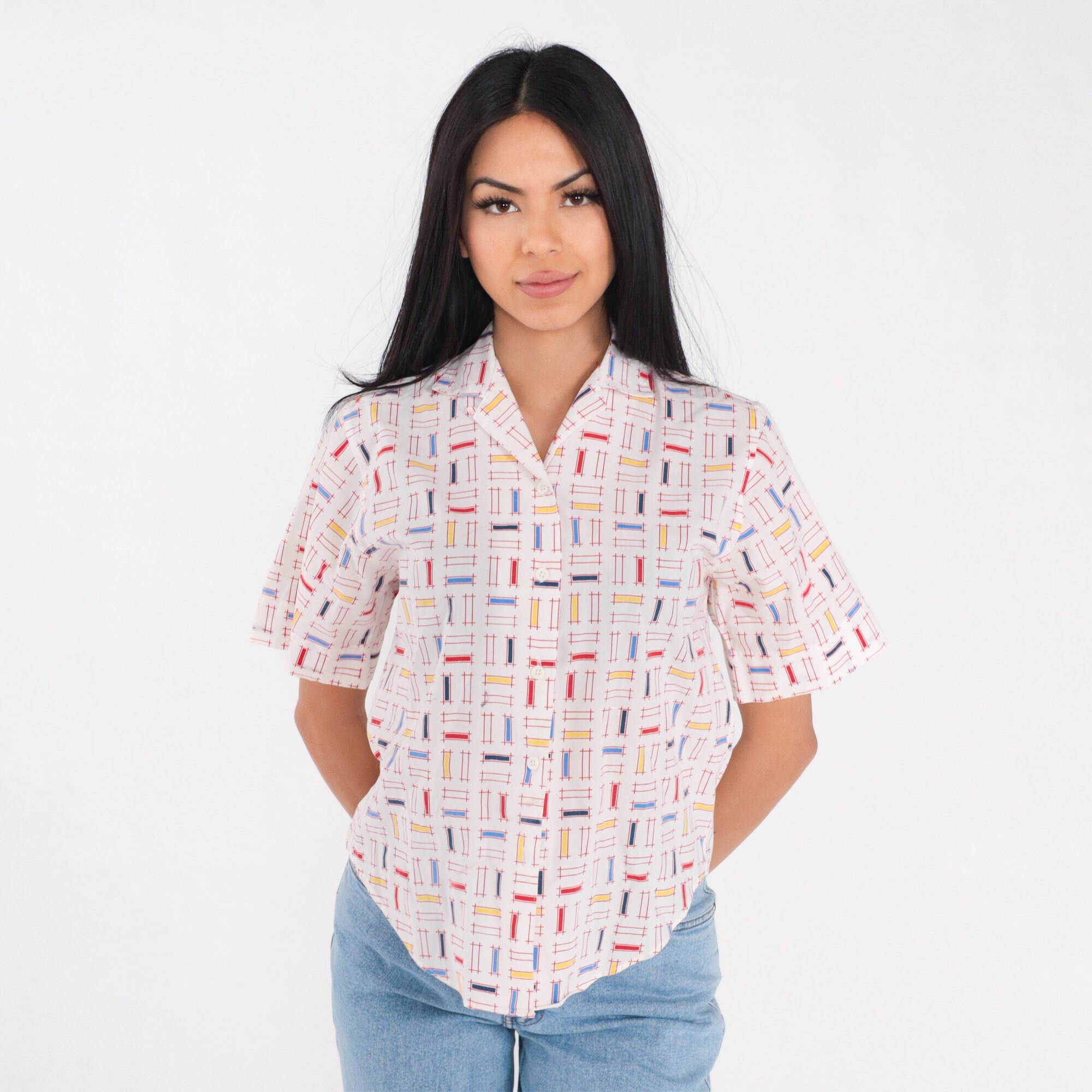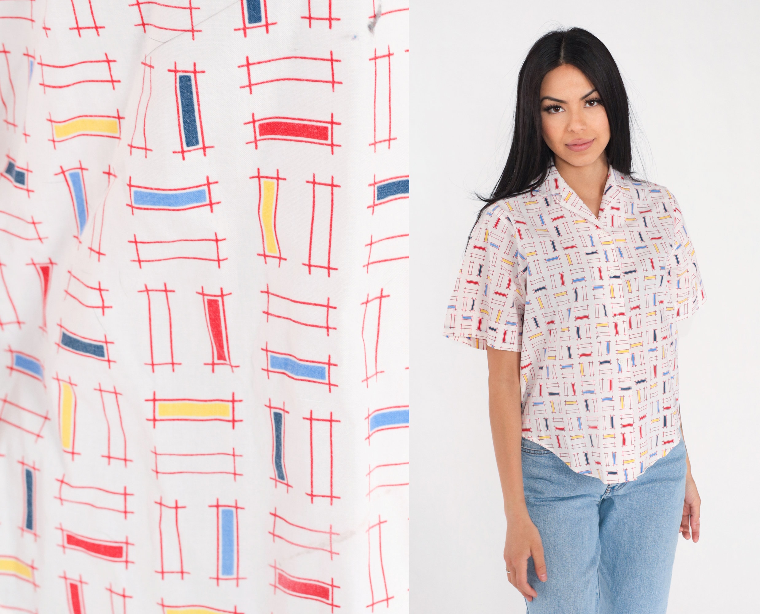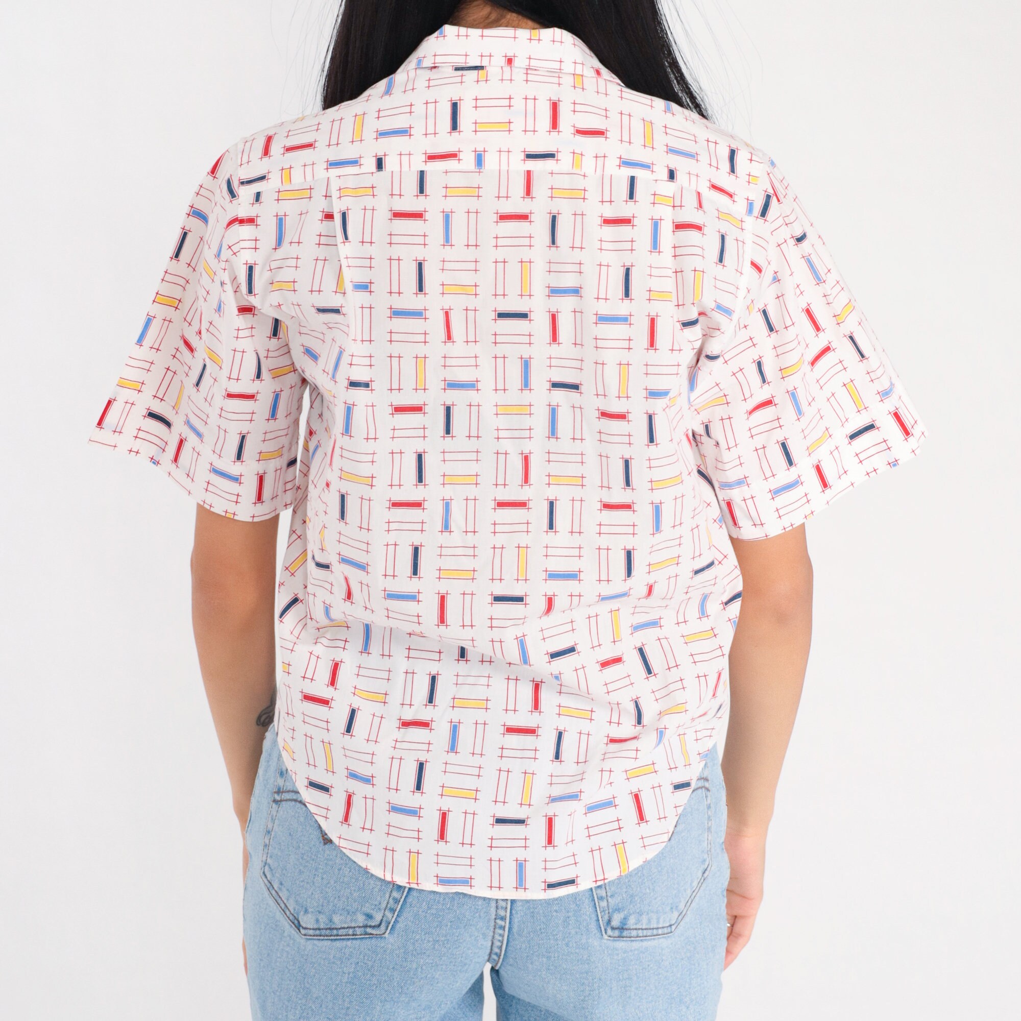 Vintage 90s shirt in white with a multicolor rectangular lattice print. It has short sleeves and buttons up the front.