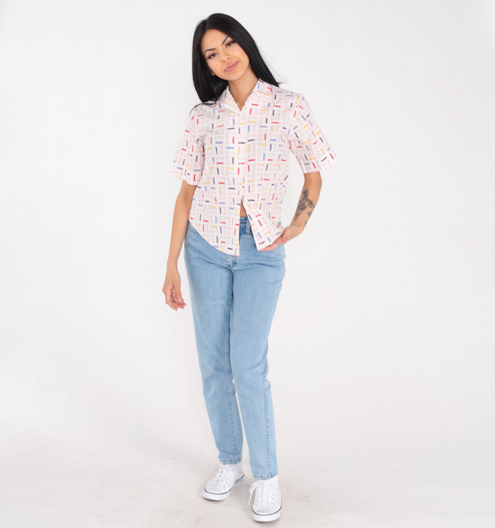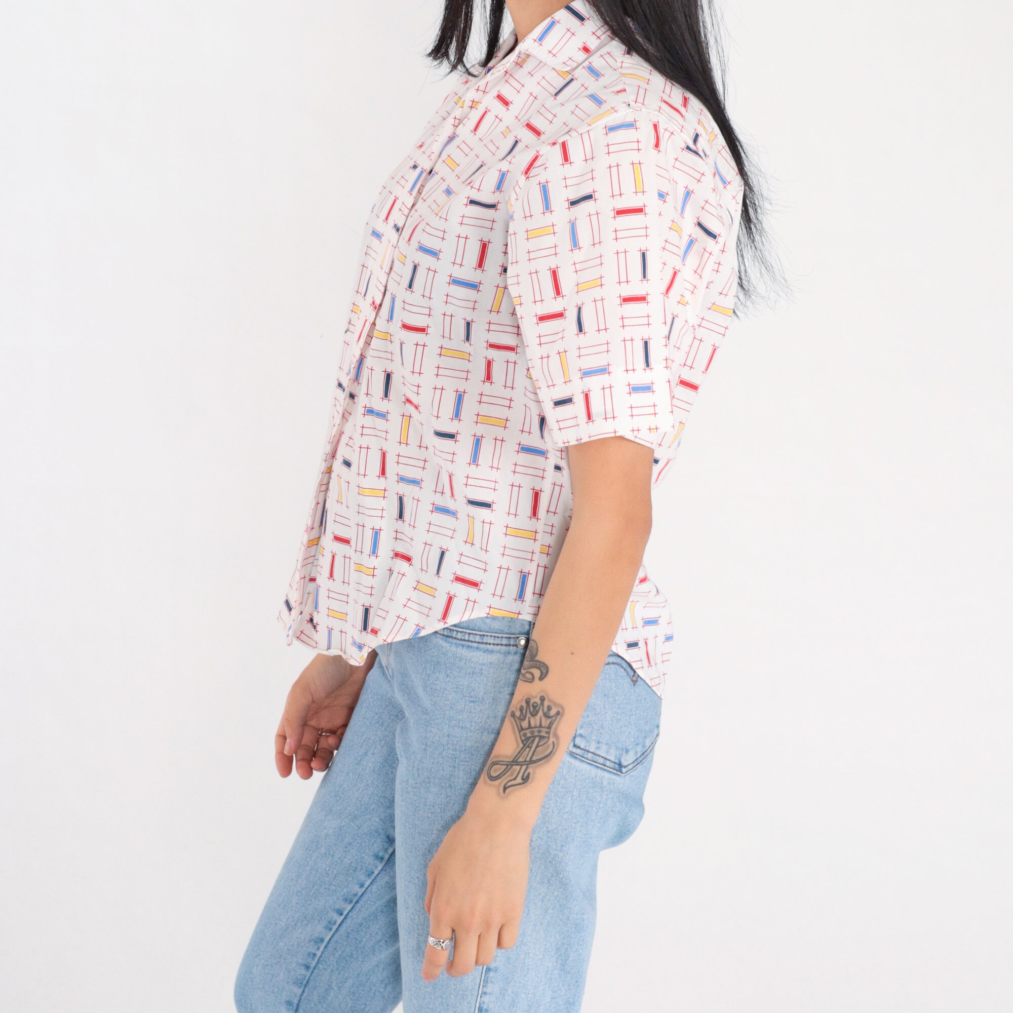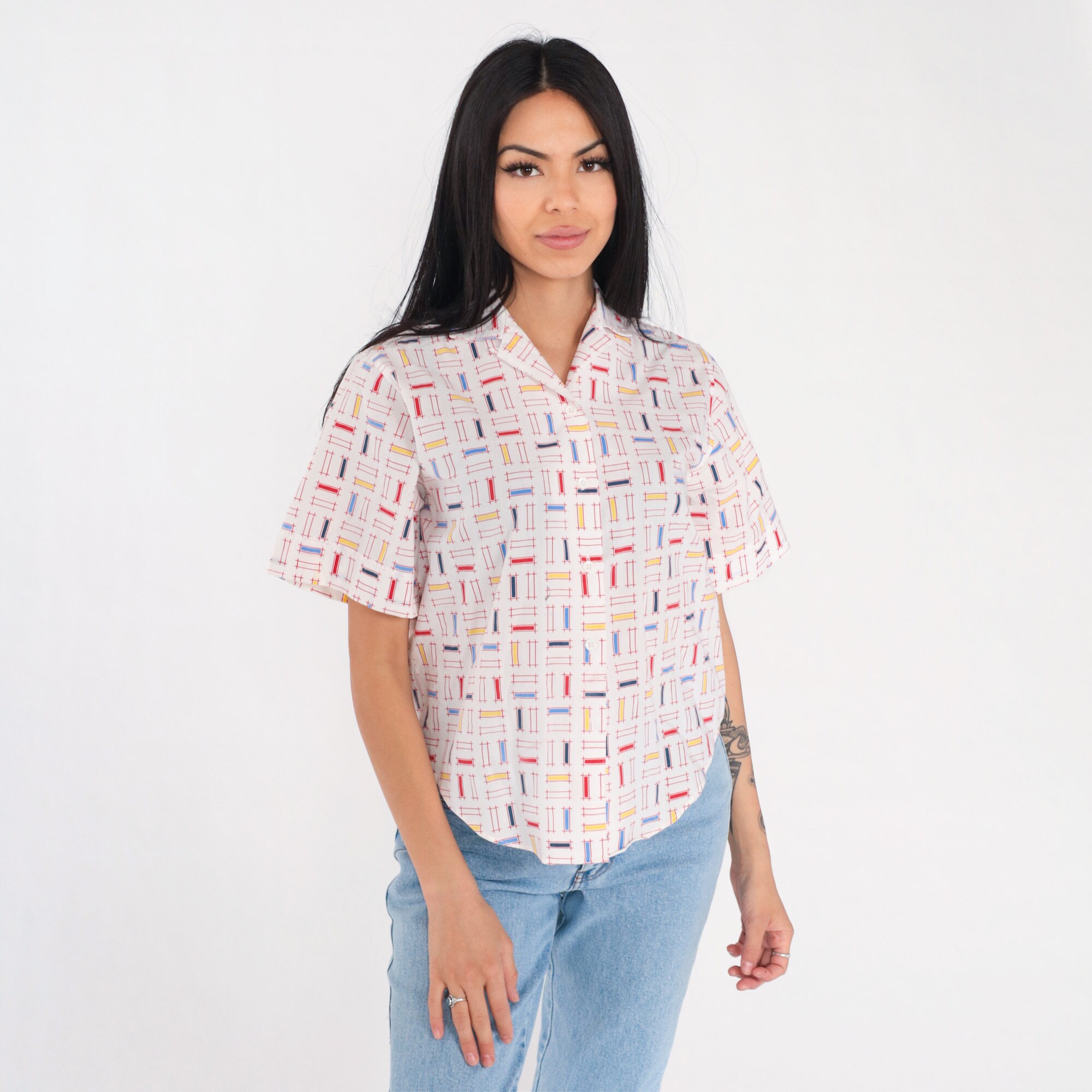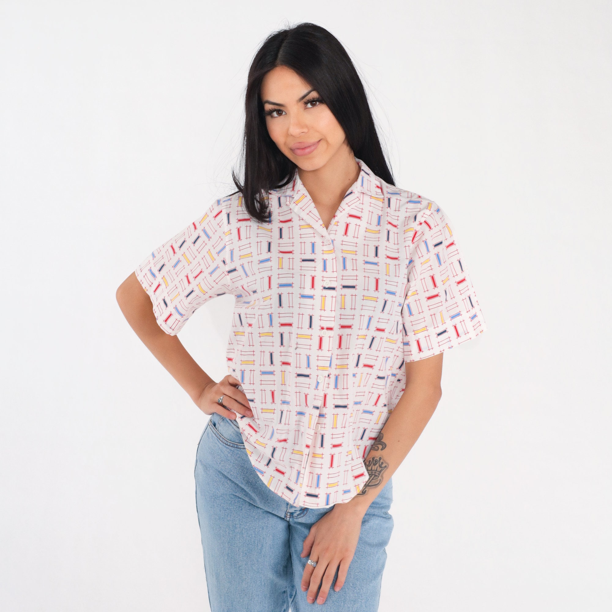 Vintage 90s shirt in white with a multicolor rectangular lattice print. It has short sleeves and buttons up the front.