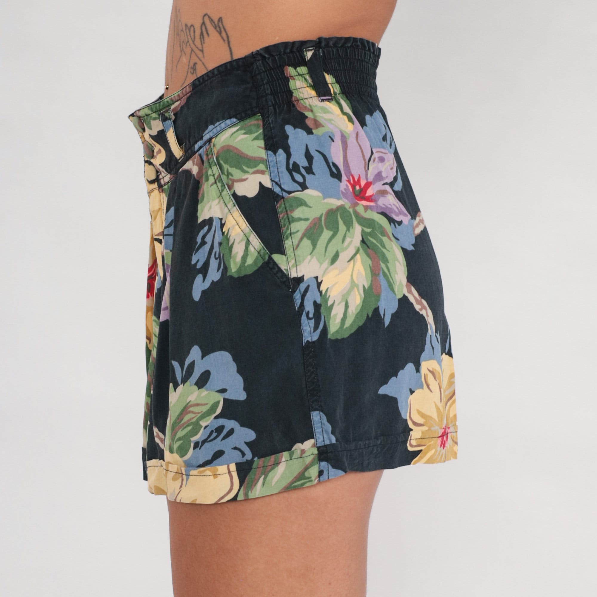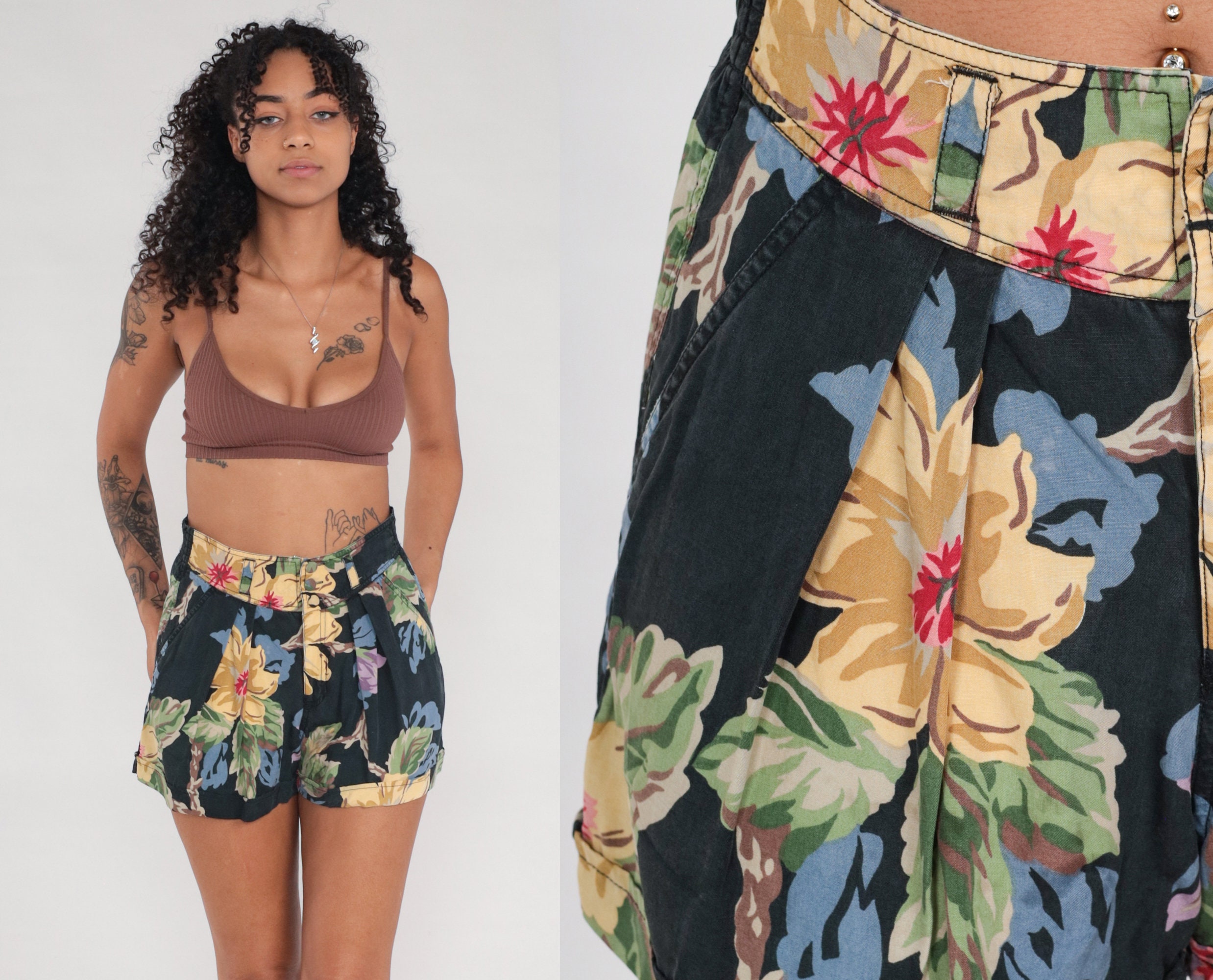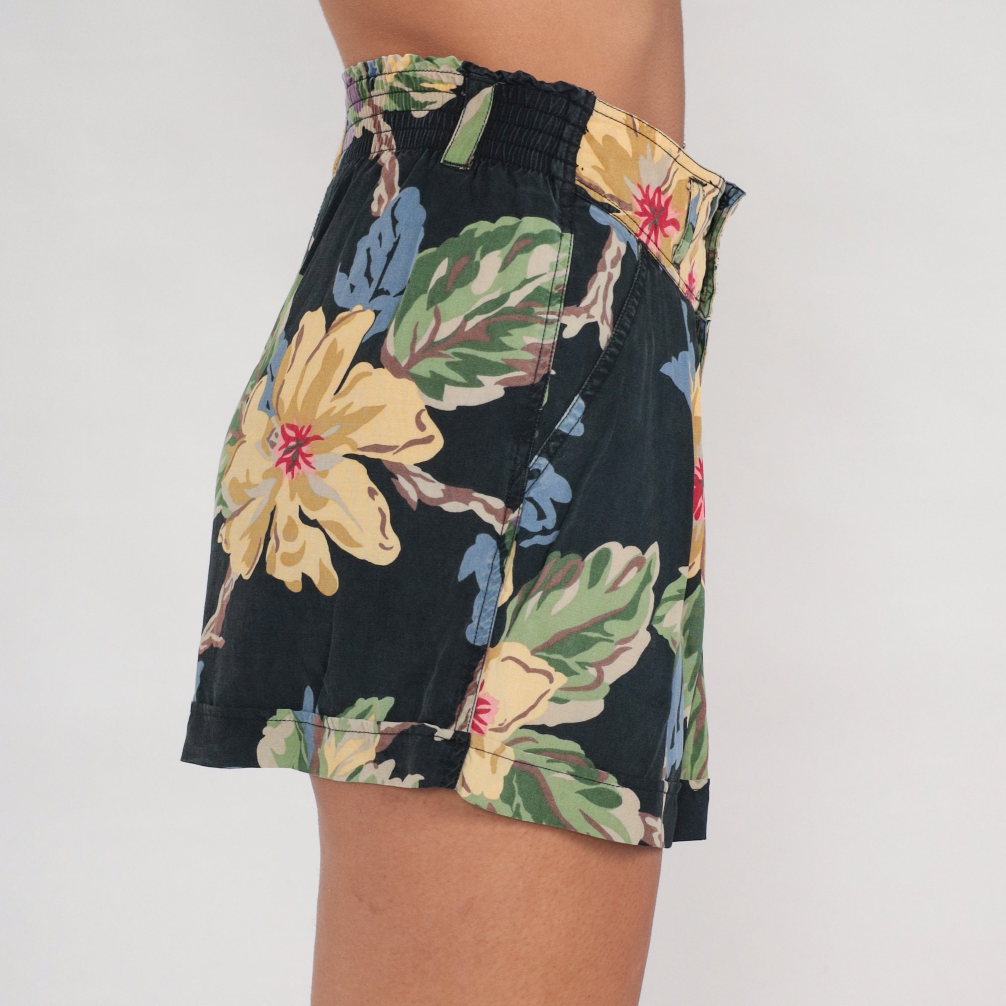 Vintage 90s shorts in a floral print with pleats and a high elastic waist.