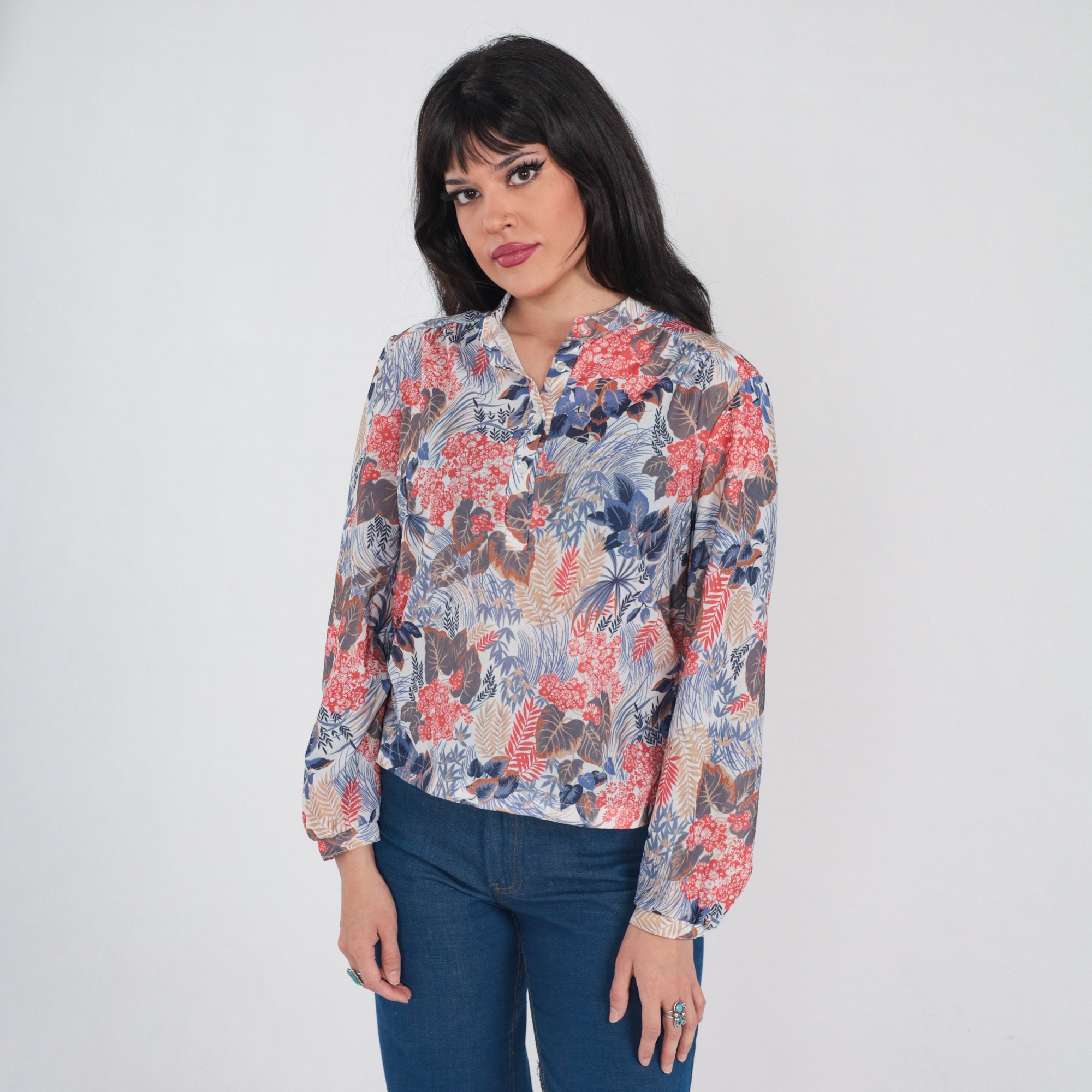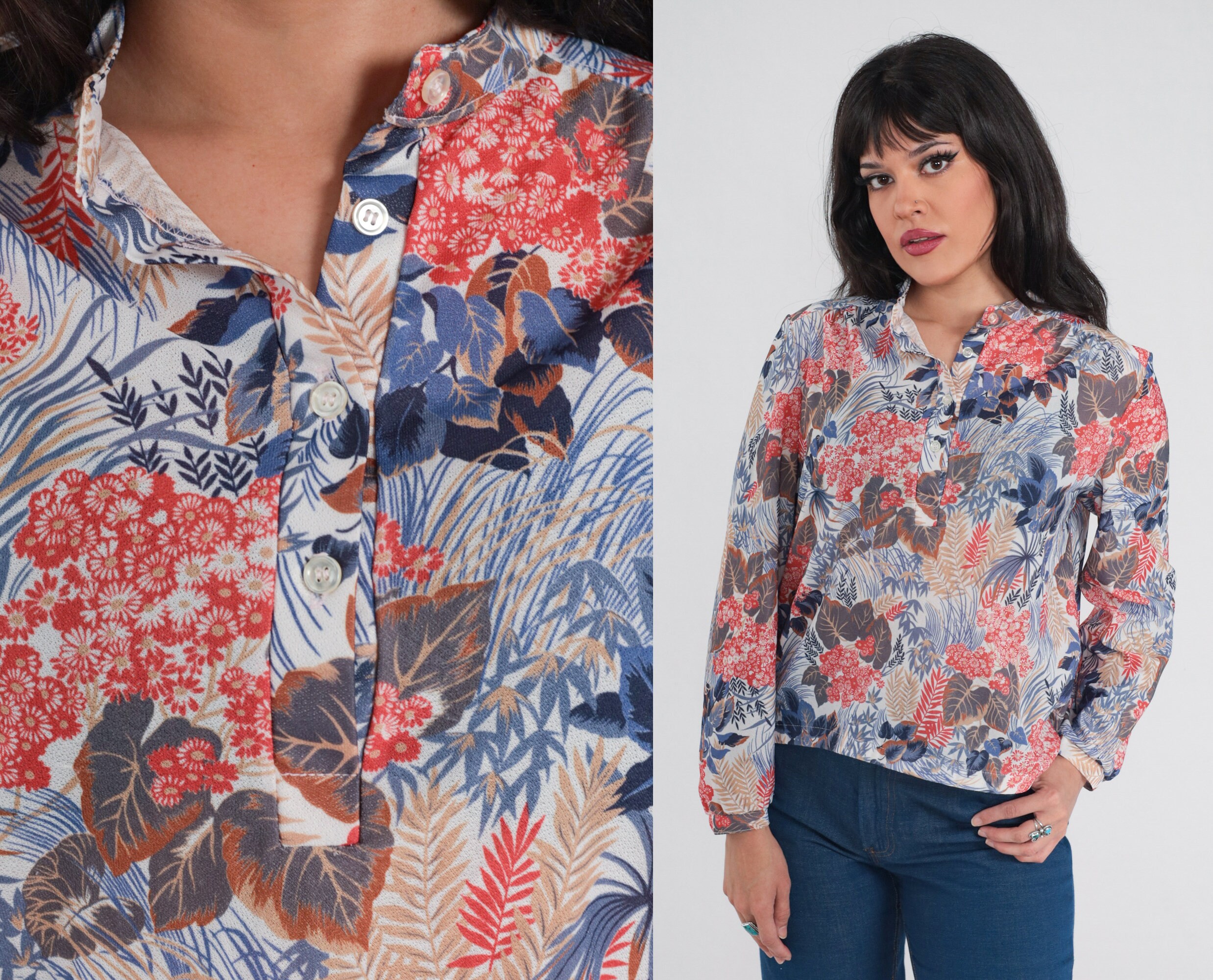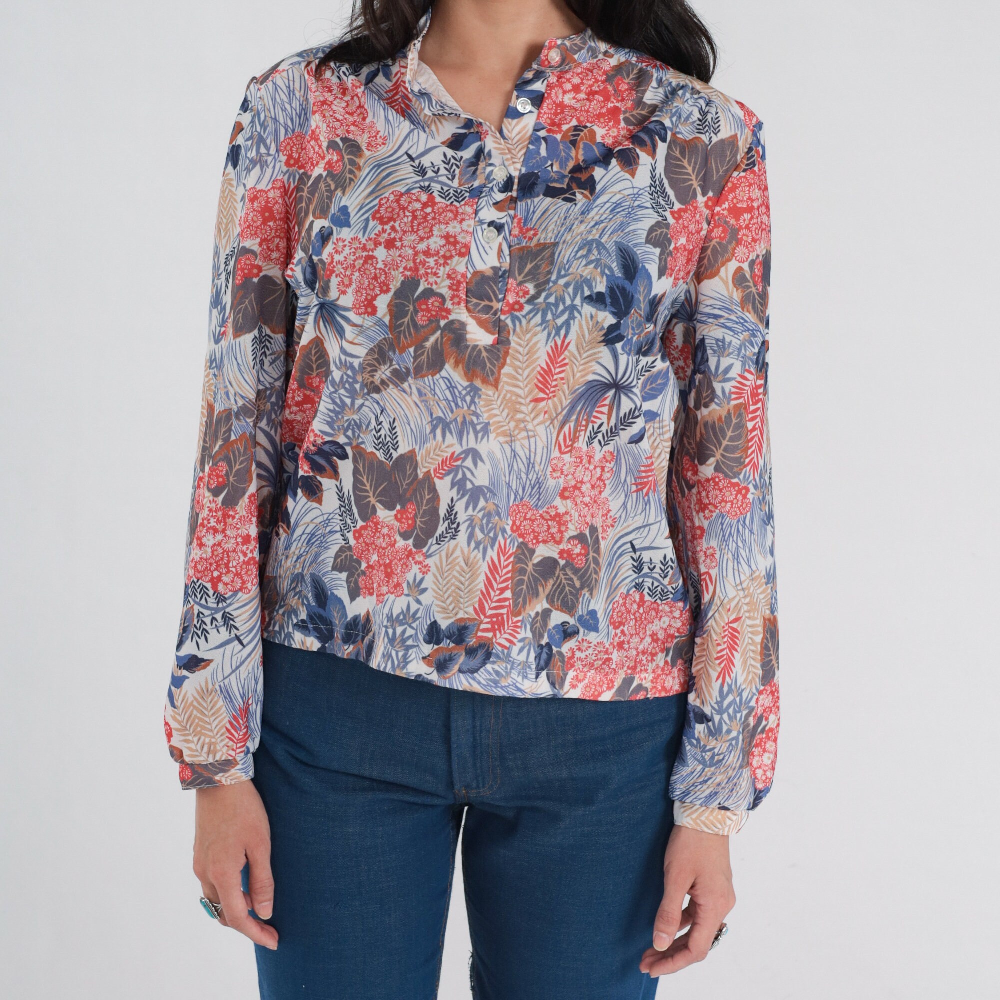Vintage 70s shirt in a floral and leaf print. It has long sleeves and half buttons up the front.