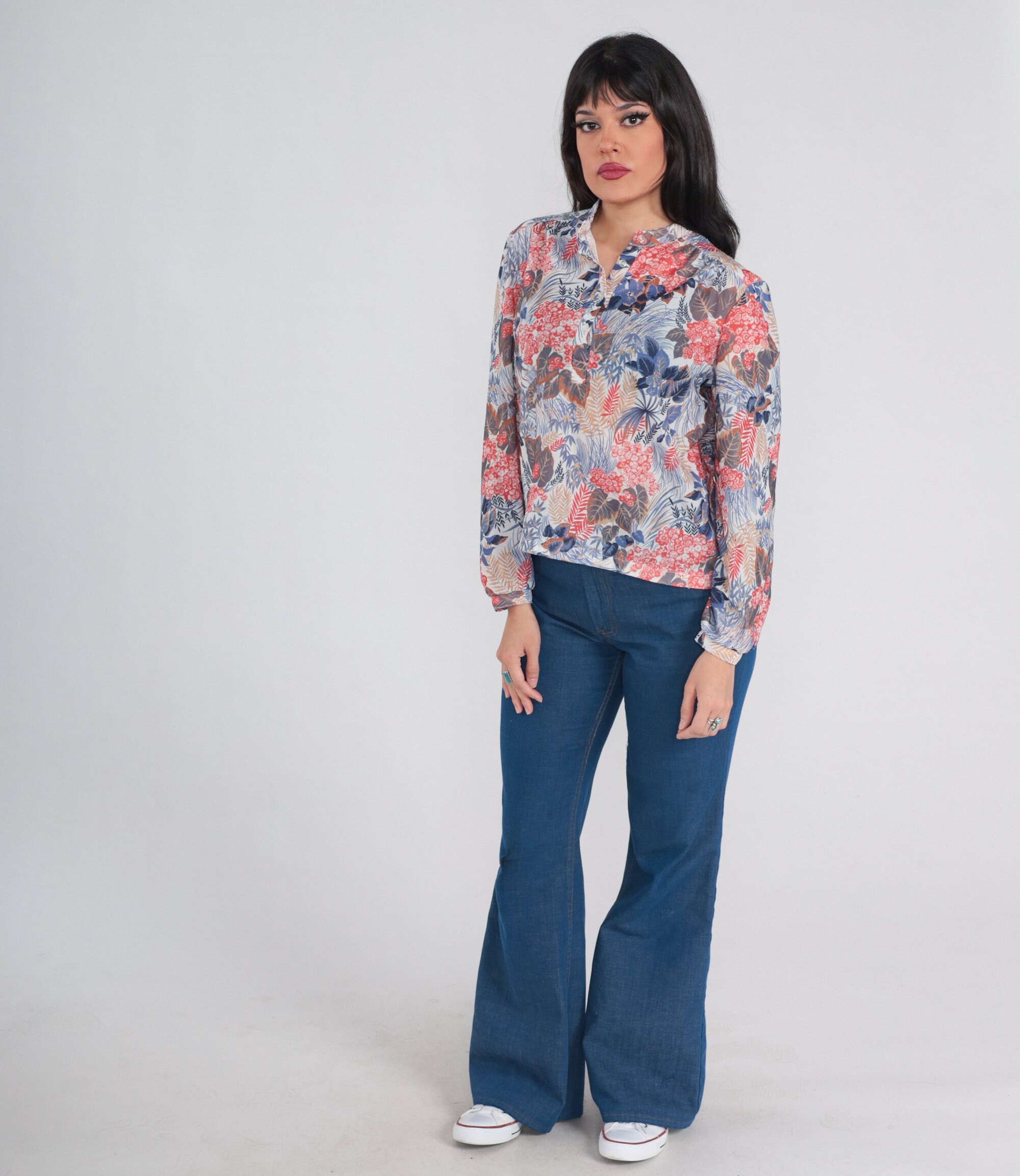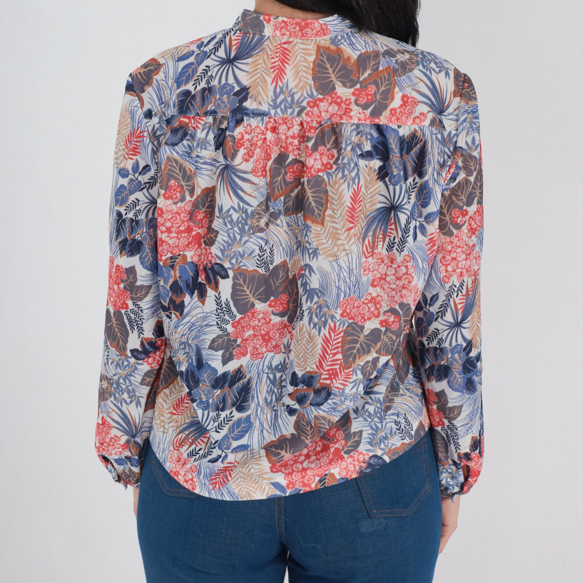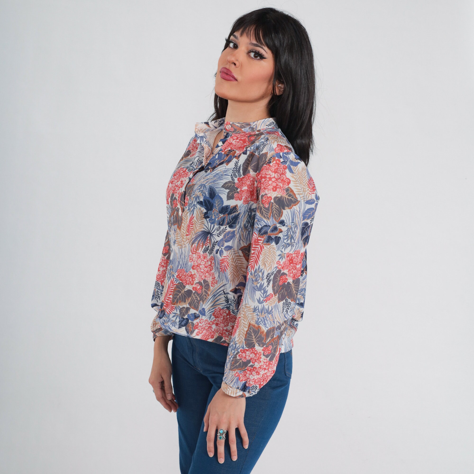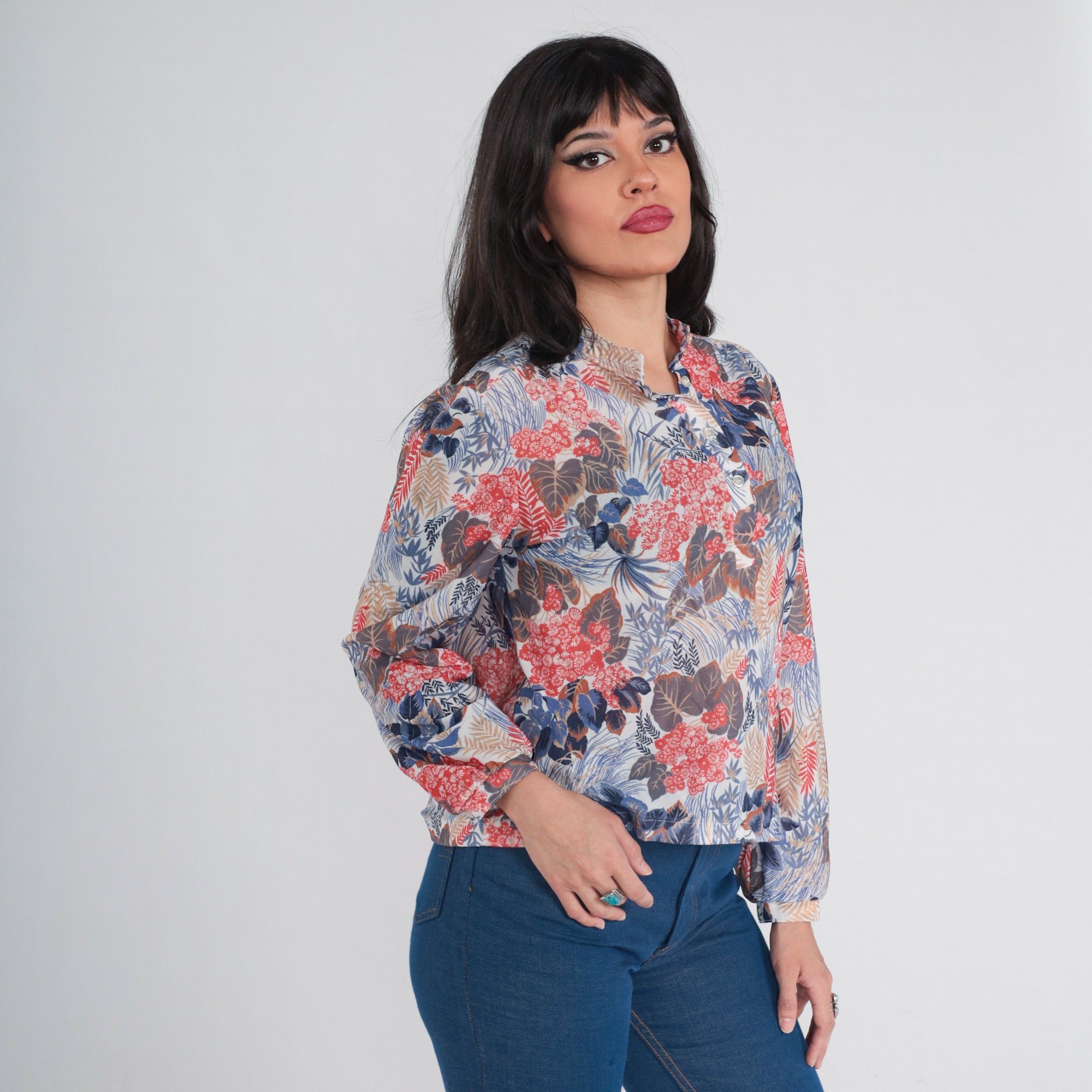 Vintage 70s shirt in a floral and leaf print. It has long sleeves and half buttons up the front.