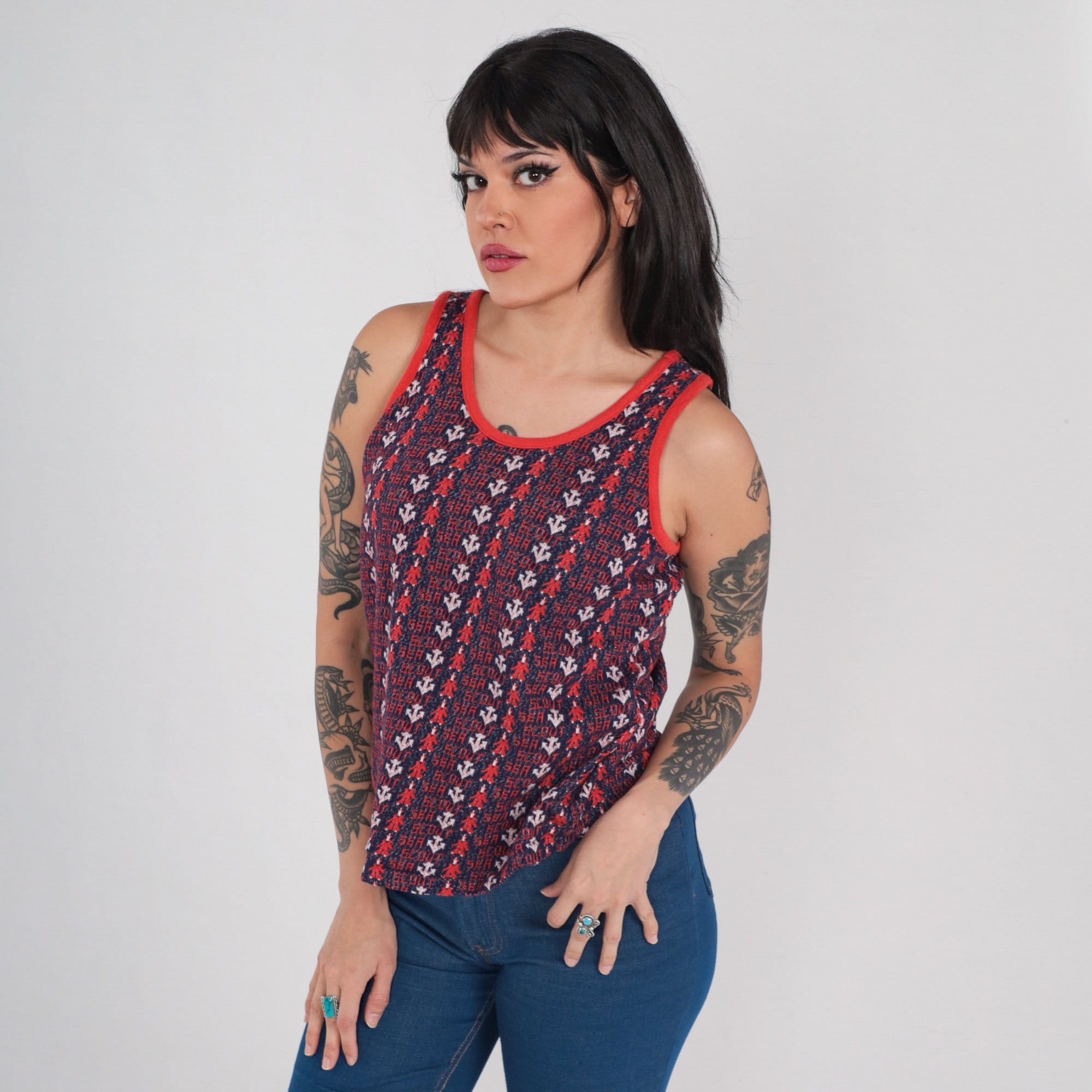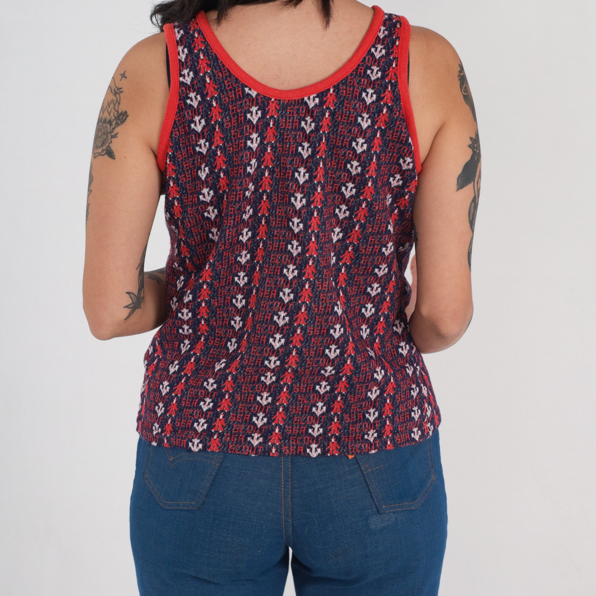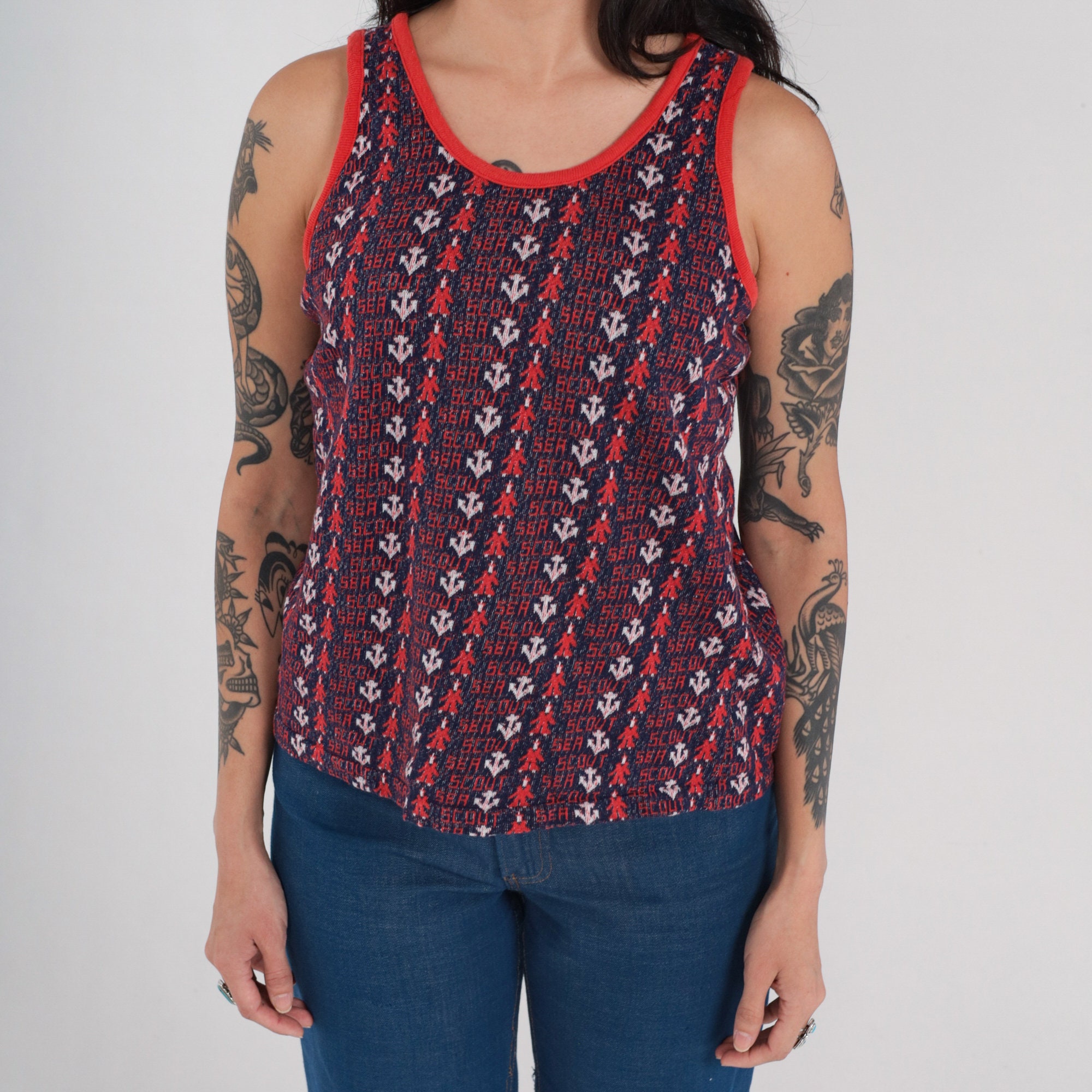 Vintage 70s tank top with an anchor print and "Sea Scout" throughout.